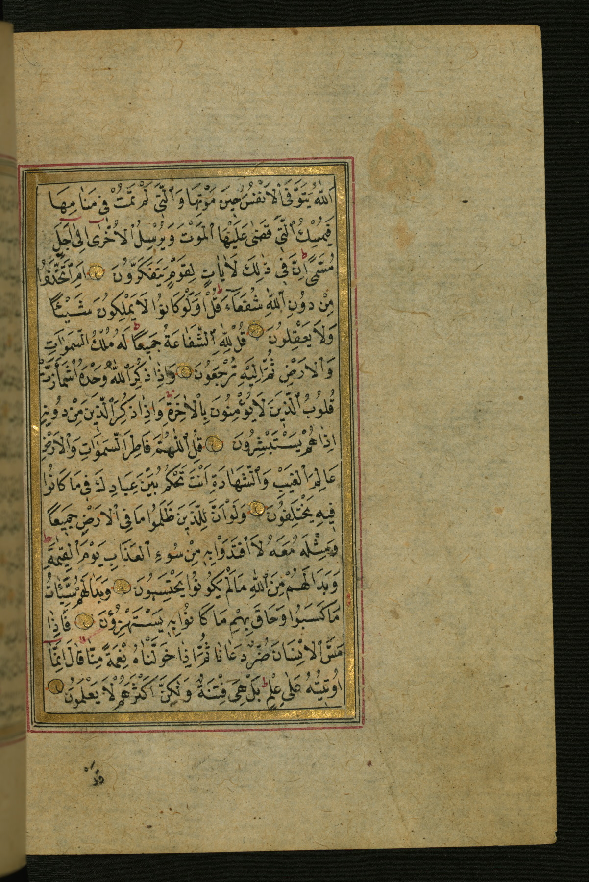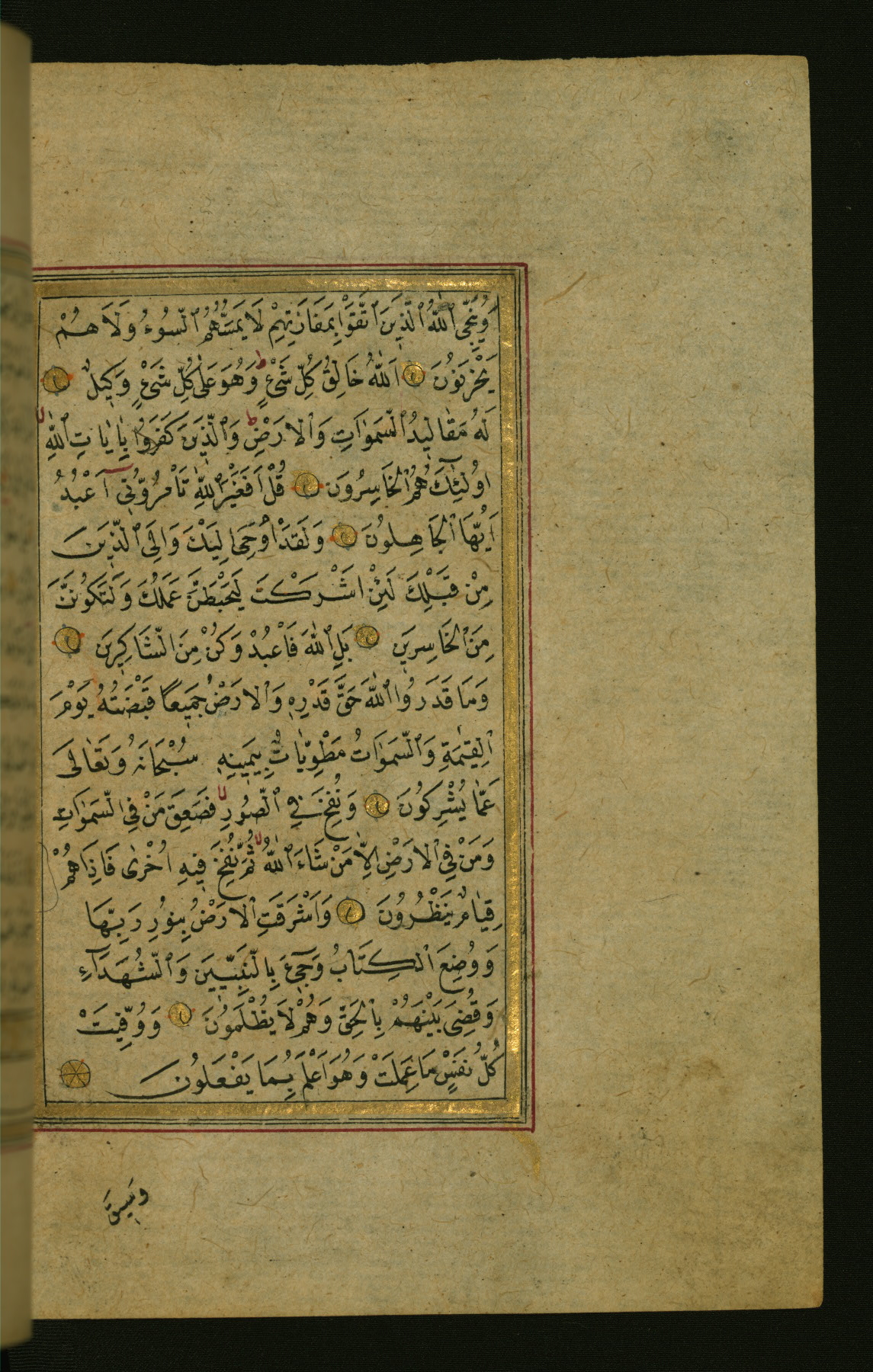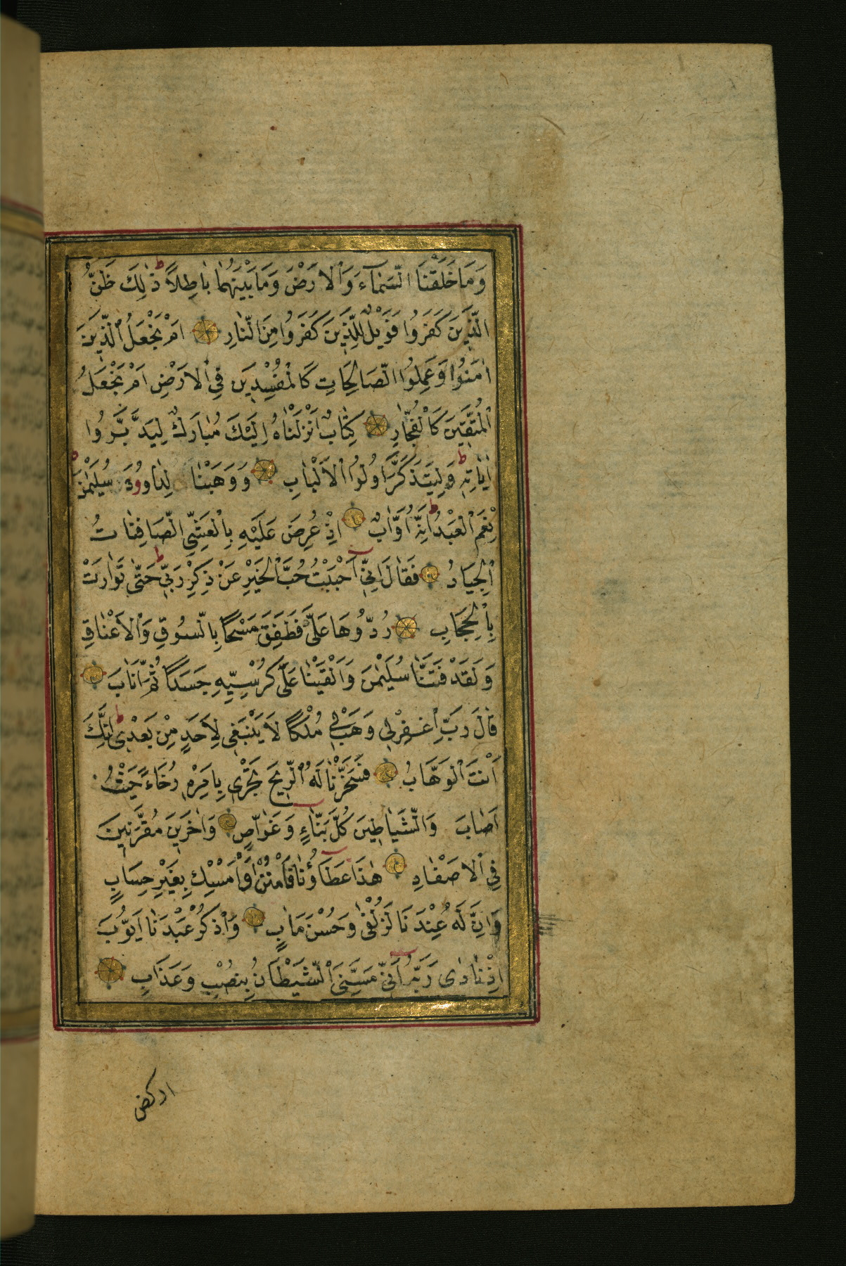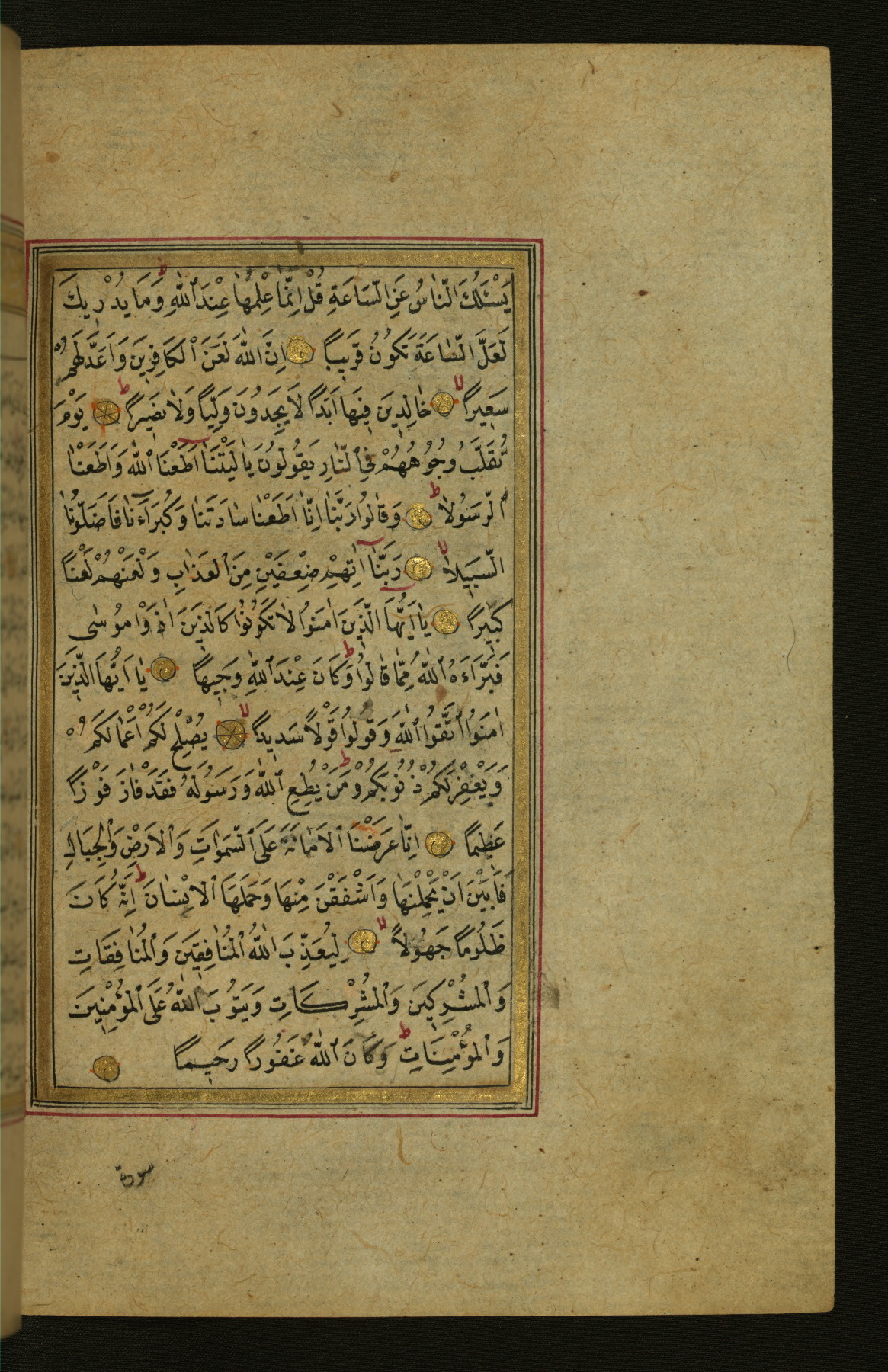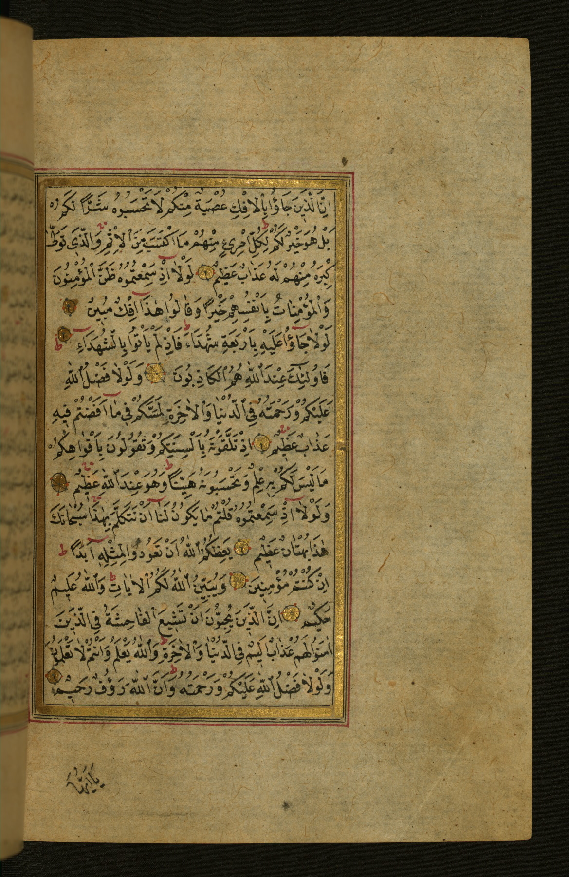 This small, illuminated single-volume copy of the Qurʾan was produced in Ottoman Turkey in 1282 AH / 1865-6 CE by Muḥammad ibn Muṣṭafá Izmīrī, a pupil of al-Rudūsī. The colophon in ijāzah script indicates that the present codex is the twenty-first copy executed by him (fol. 304b). The manuscript opens with an illuminated double-page incipit with the verses of chapters 1 (Sūrat al-fātiḥah) and 2 (Sūrat al-baqarah) (fols. 1b-2a). The text is written in naskh script in black ink with reading marks in red. Verses are separated by illuminated discs with colored dots and chapter headings are in riqāʿ script in white ink. Polychrome medallions in the margins indicate textual divisions and prostration. The binding of black leather is contemporary with the manuscript and decorated with a tooled and gold-painted geometric design enclosed by gold frames on the upper and lower boards.