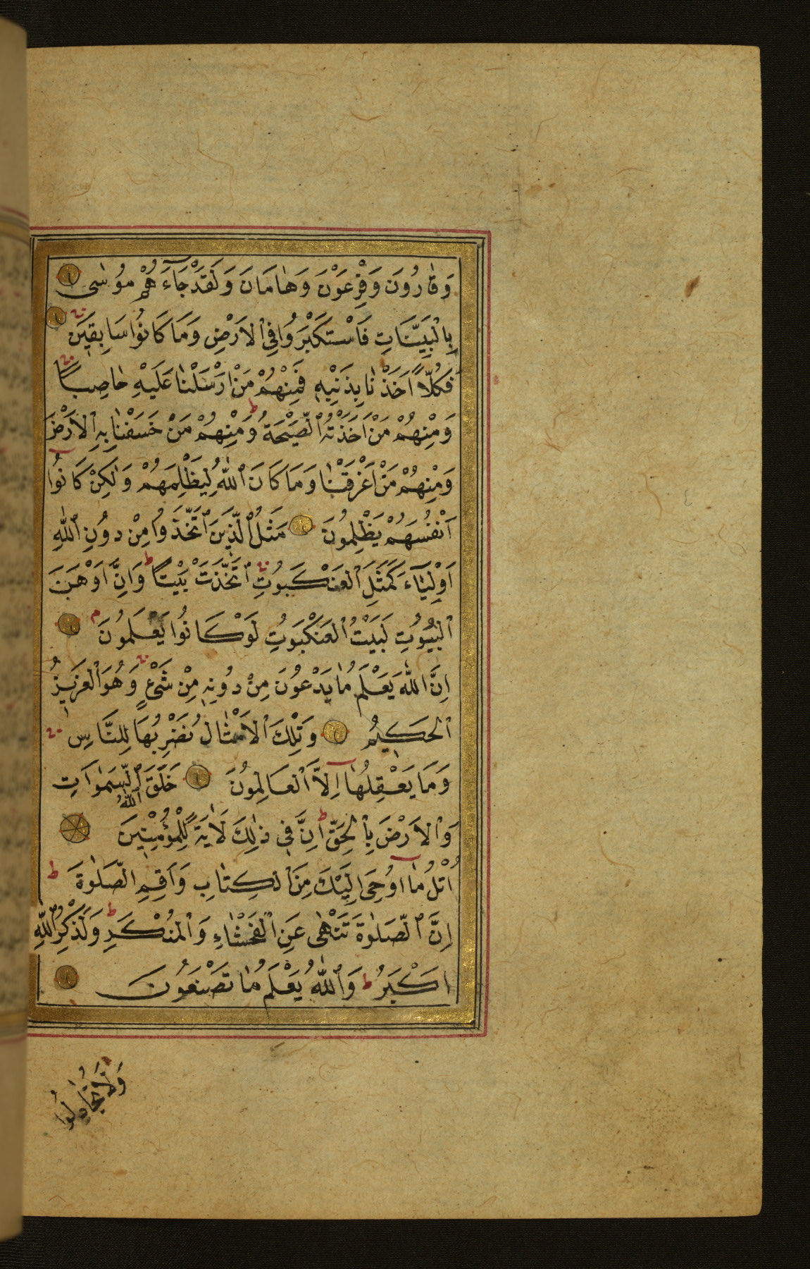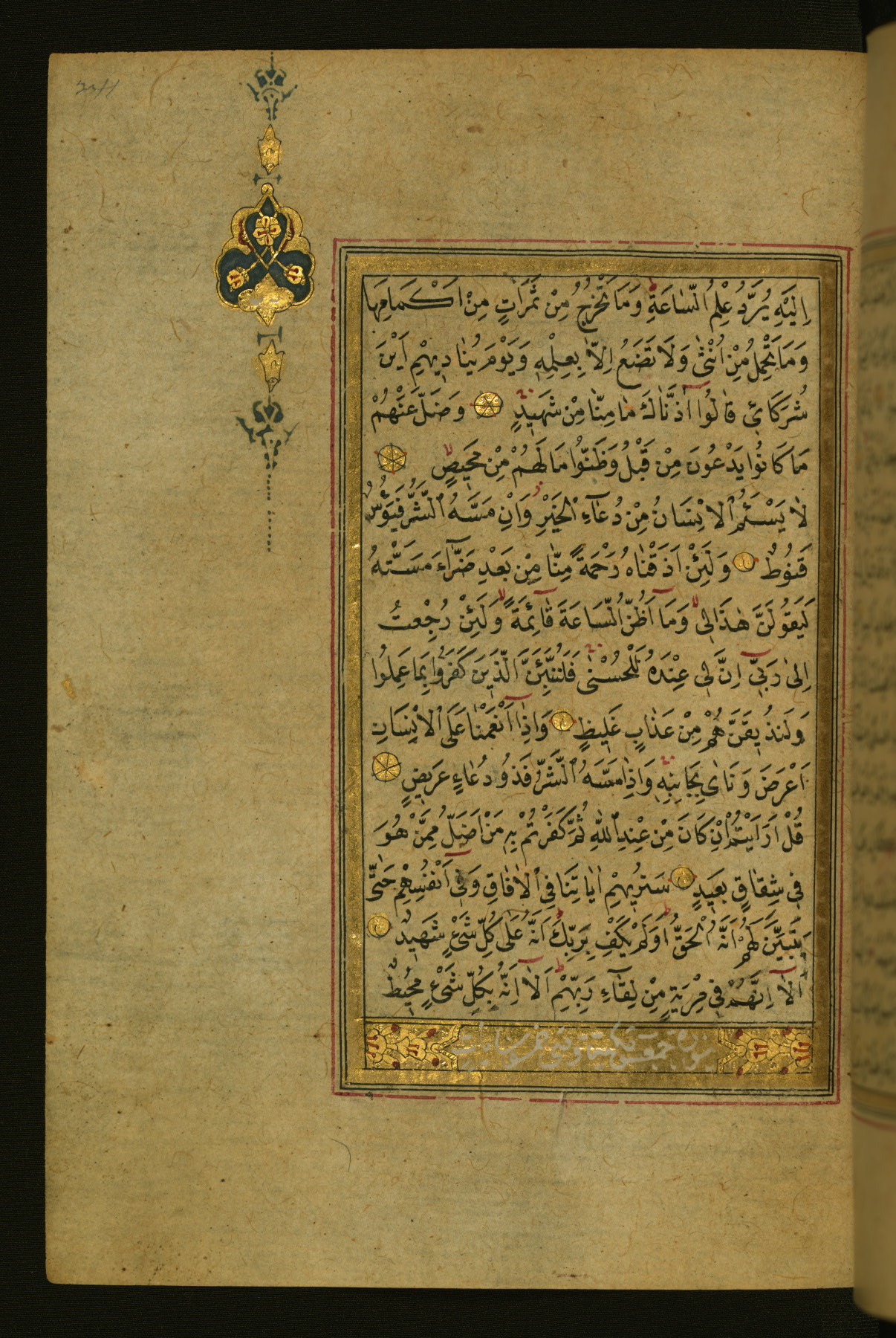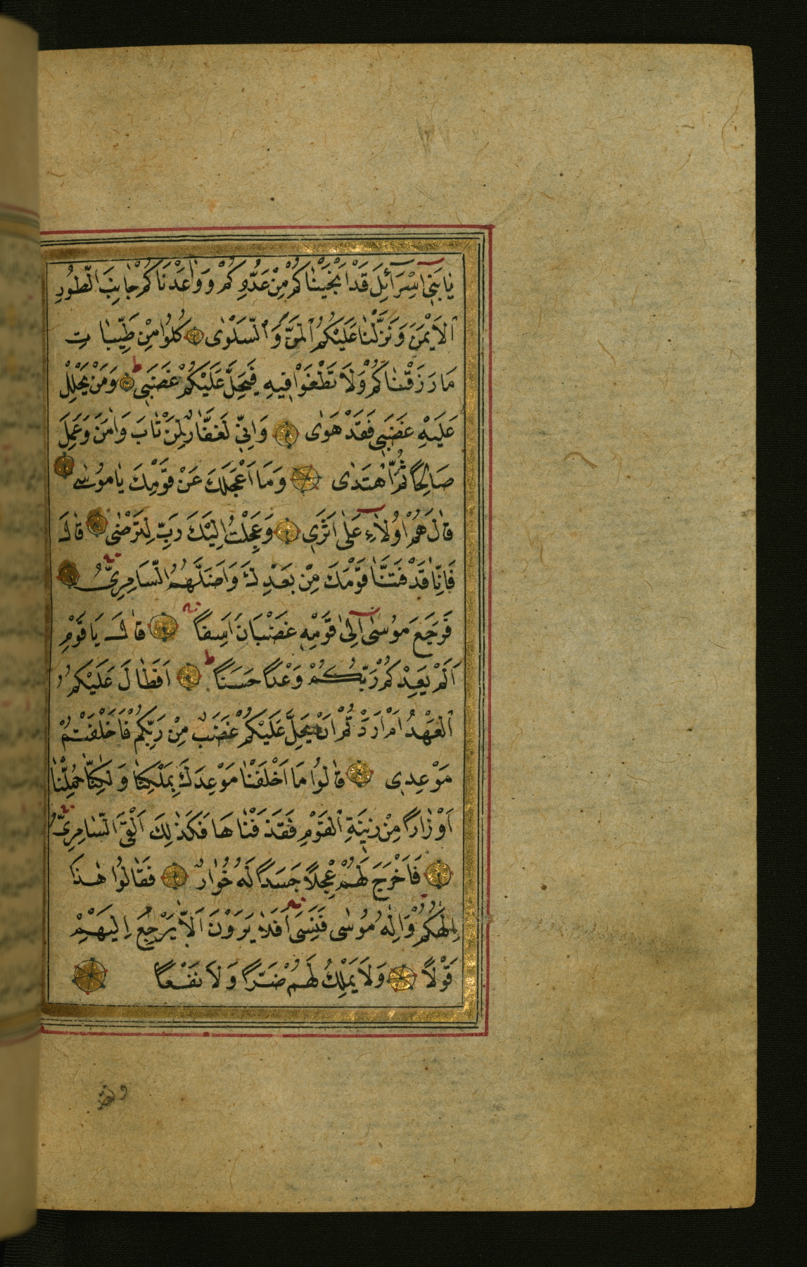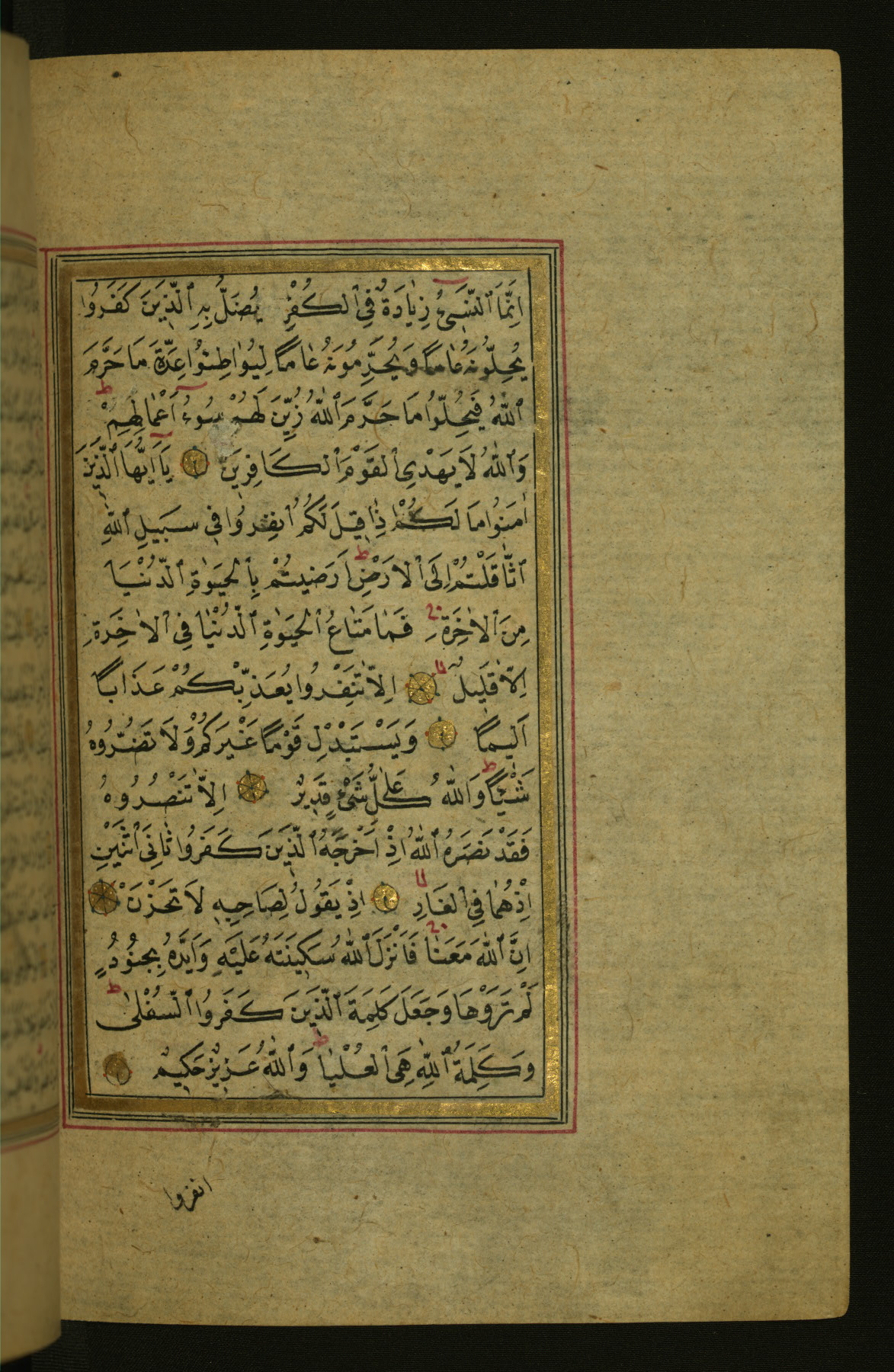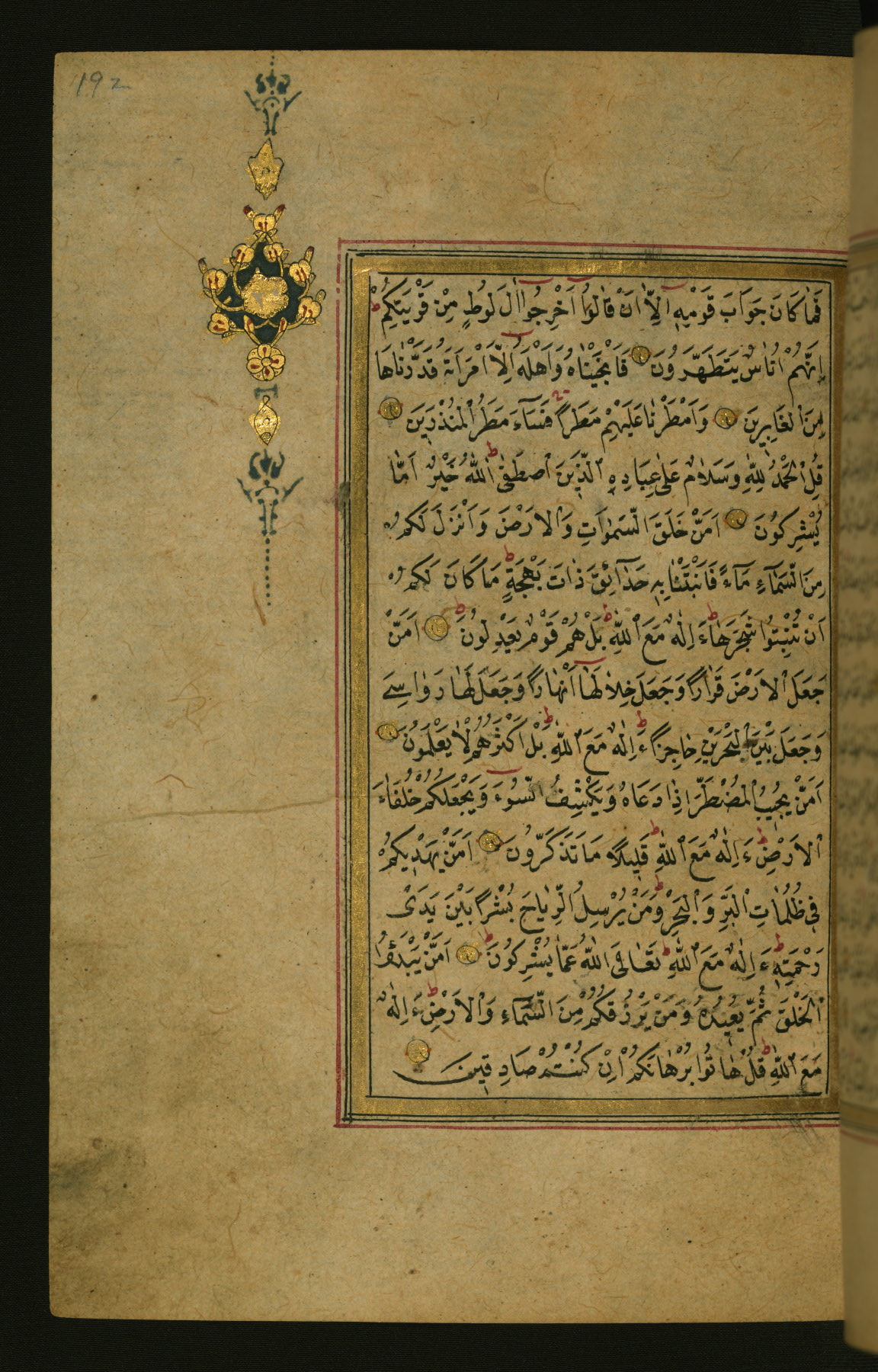 This small, illuminated single-volume copy of the Qurʾan was produced in Ottoman Turkey in 1282 AH / 1865-6 CE by Muḥammad ibn Muṣṭafá Izmīrī, a pupil of al-Rudūsī. The colophon in ijāzah script indicates that the present codex is the twenty-first copy executed by him (fol. 304b). The manuscript opens with an illuminated double-page incipit with the verses of chapters 1 (Sūrat al-fātiḥah) and 2 (Sūrat al-baqarah) (fols. 1b-2a). The text is written in naskh script in black ink with reading marks in red. Verses are separated by illuminated discs with colored dots and chapter headings are in riqāʿ script in white ink. Polychrome medallions in the margins indicate textual divisions and prostration. The binding of black leather is contemporary with the manuscript and decorated with a tooled and gold-painted geometric design enclosed by gold frames on the upper and lower boards.