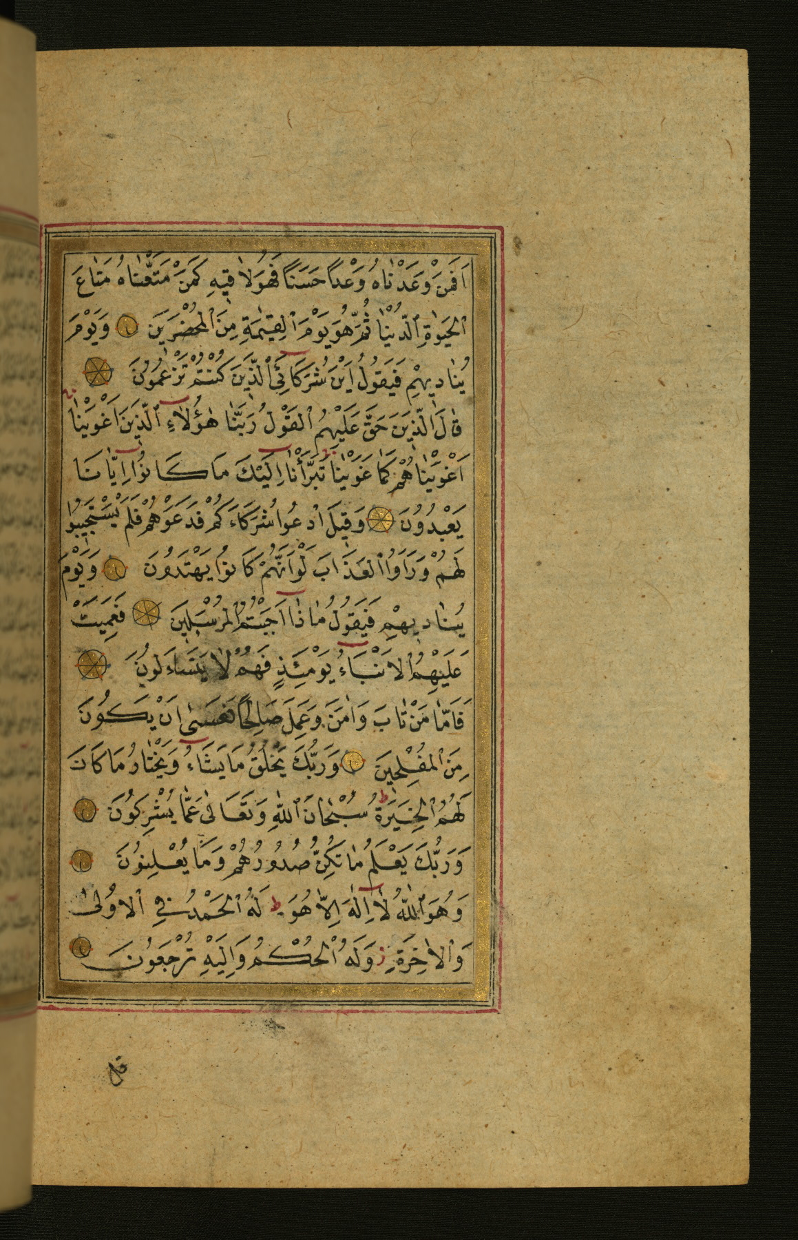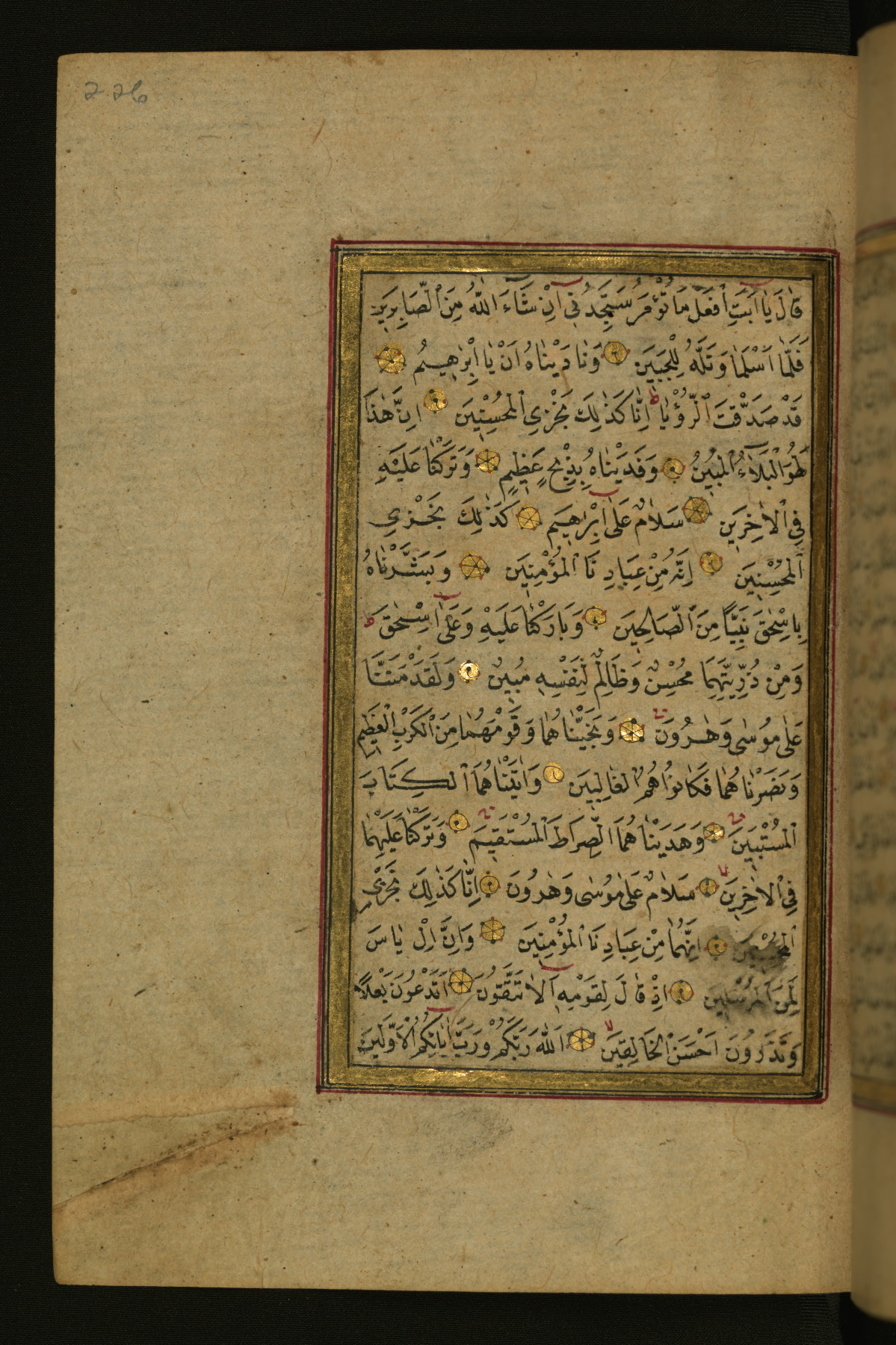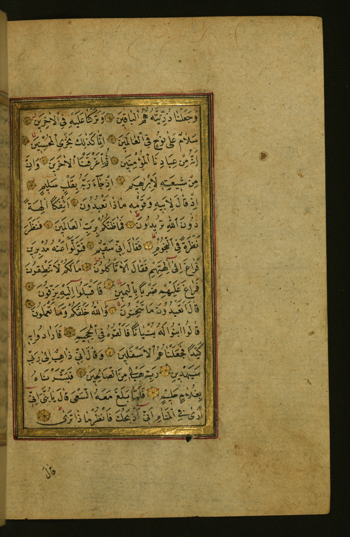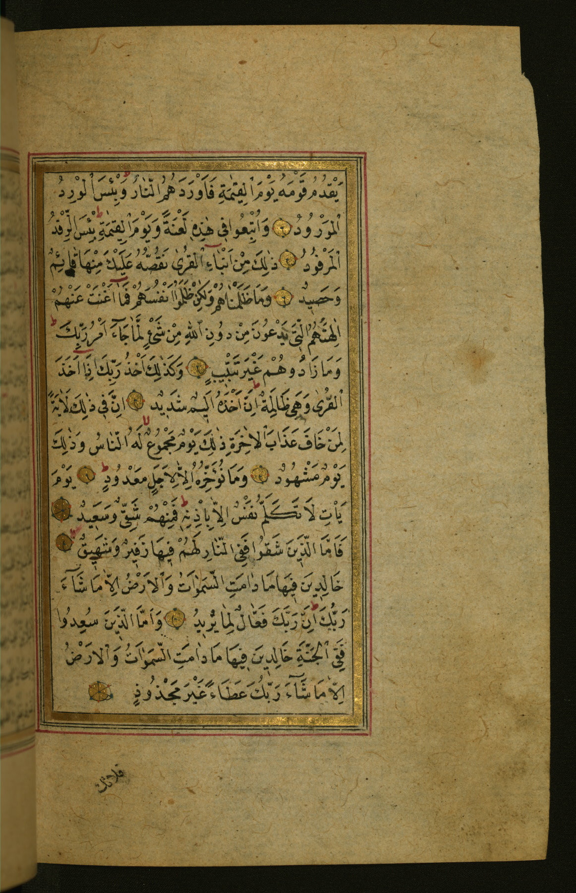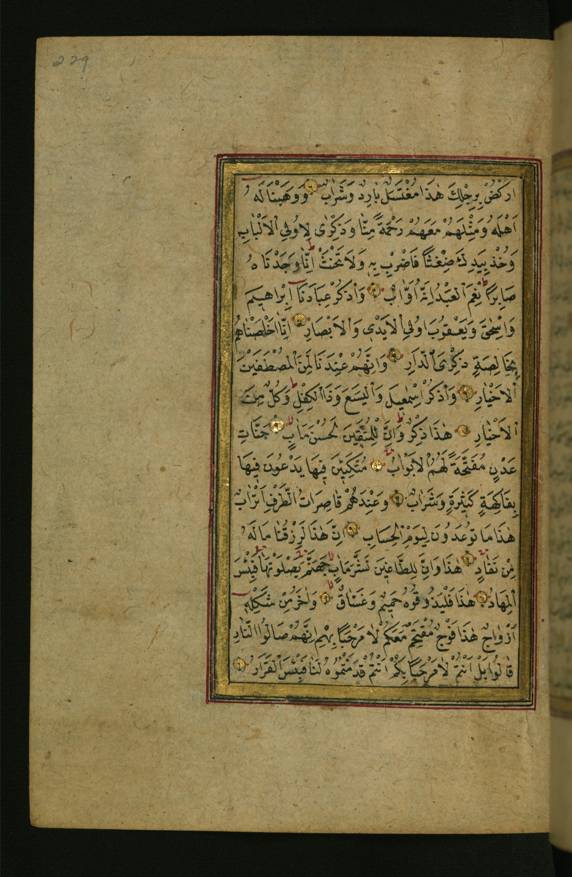 This small, illuminated single-volume copy of the Qurʾan was produced in Ottoman Turkey in 1282 AH / 1865-6 CE by Muḥammad ibn Muṣṭafá Izmīrī, a pupil of al-Rudūsī. The colophon in ijāzah script indicates that the present codex is the twenty-first copy executed by him (fol. 304b). The manuscript opens with an illuminated double-page incipit with the verses of chapters 1 (Sūrat al-fātiḥah) and 2 (Sūrat al-baqarah) (fols. 1b-2a). The text is written in naskh script in black ink with reading marks in red. Verses are separated by illuminated discs with colored dots and chapter headings are in riqāʿ script in white ink. Polychrome medallions in the margins indicate textual divisions and prostration. The binding of black leather is contemporary with the manuscript and decorated with a tooled and gold-painted geometric design enclosed by gold frames on the upper and lower boards.