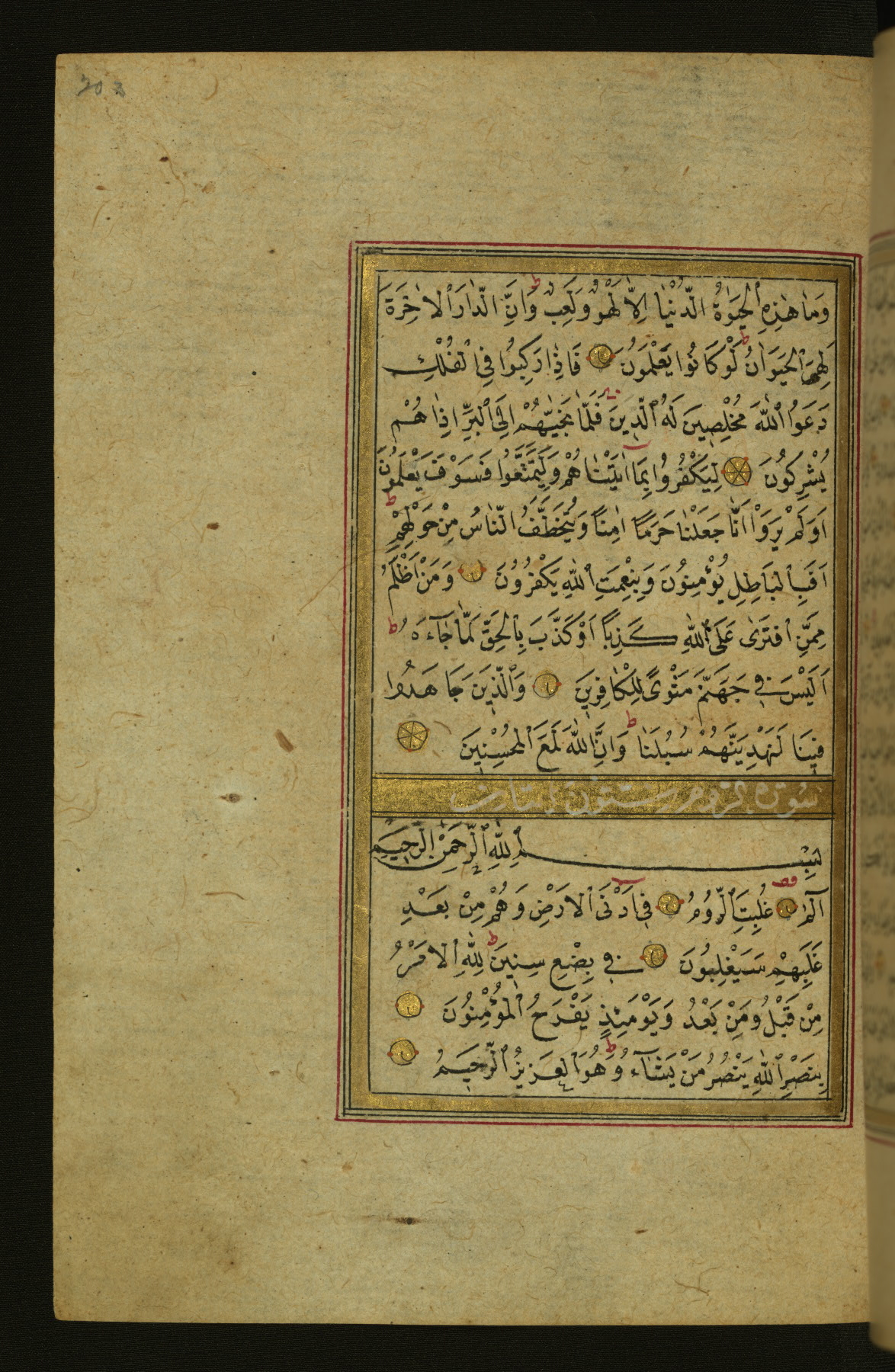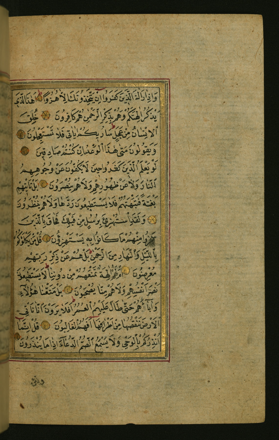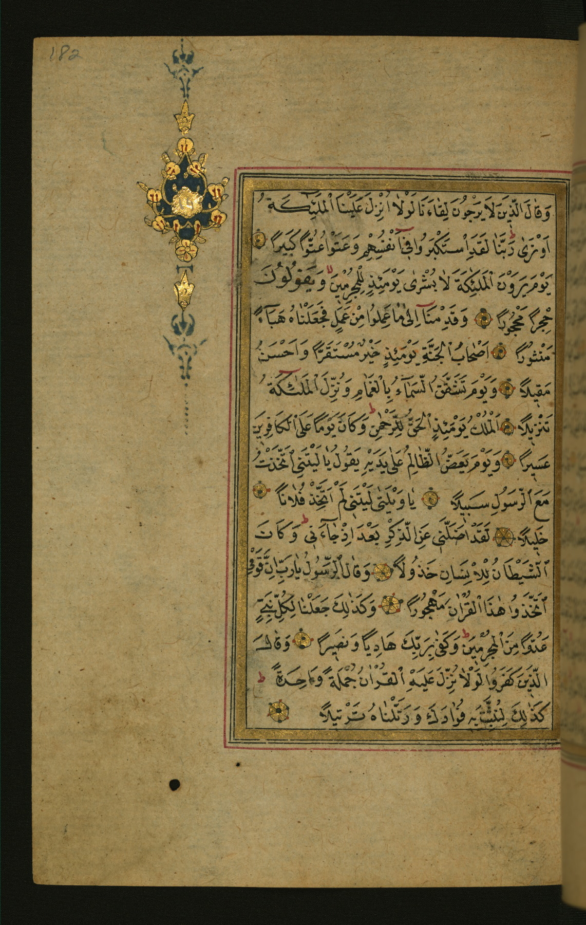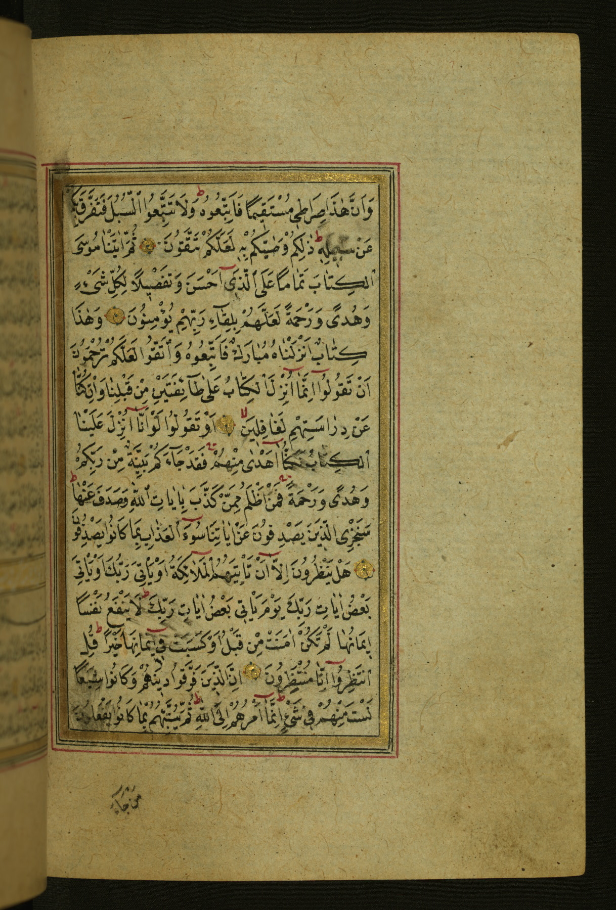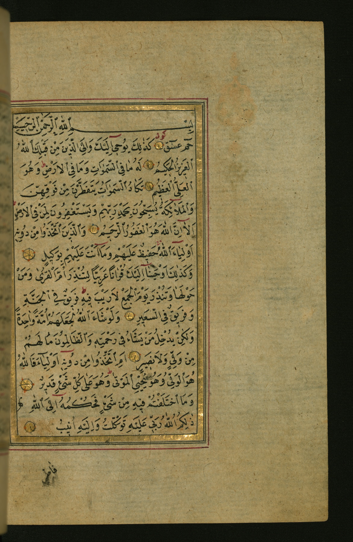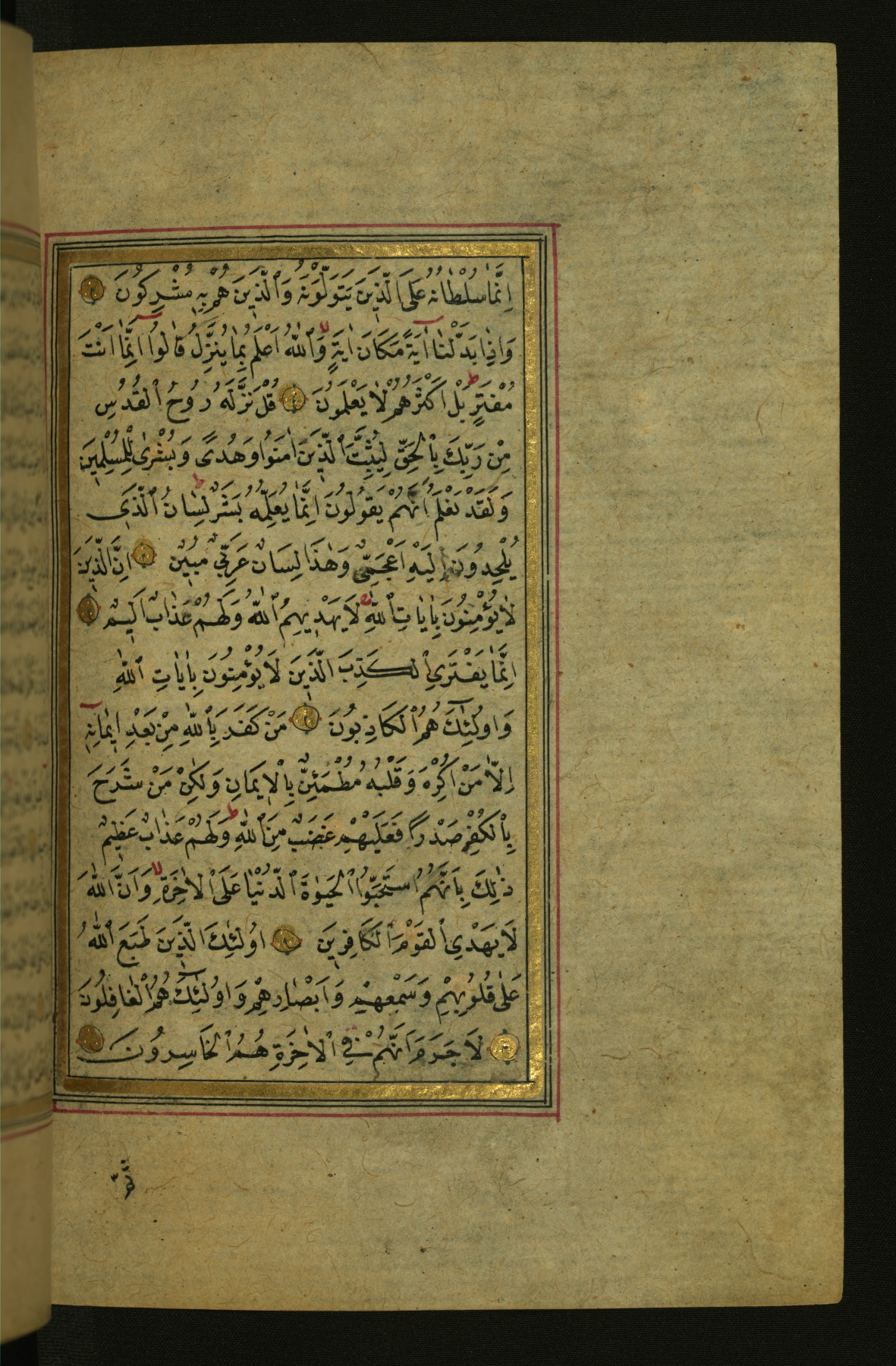 This small, illuminated single-volume copy of the Qurʾan was produced in Ottoman Turkey in 1282 AH / 1865-6 CE by Muḥammad ibn Muṣṭafá Izmīrī, a pupil of al-Rudūsī. The colophon in ijāzah script indicates that the present codex is the twenty-first copy executed by him (fol. 304b). The manuscript opens with an illuminated double-page incipit with the verses of chapters 1 (Sūrat al-fātiḥah) and 2 (Sūrat al-baqarah) (fols. 1b-2a). The text is written in naskh script in black ink with reading marks in red. Verses are separated by illuminated discs with colored dots and chapter headings are in riqāʿ script in white ink. Polychrome medallions in the margins indicate textual divisions and prostration. The binding of black leather is contemporary with the manuscript and decorated with a tooled and gold-painted geometric design enclosed by gold frames on the upper and lower boards.