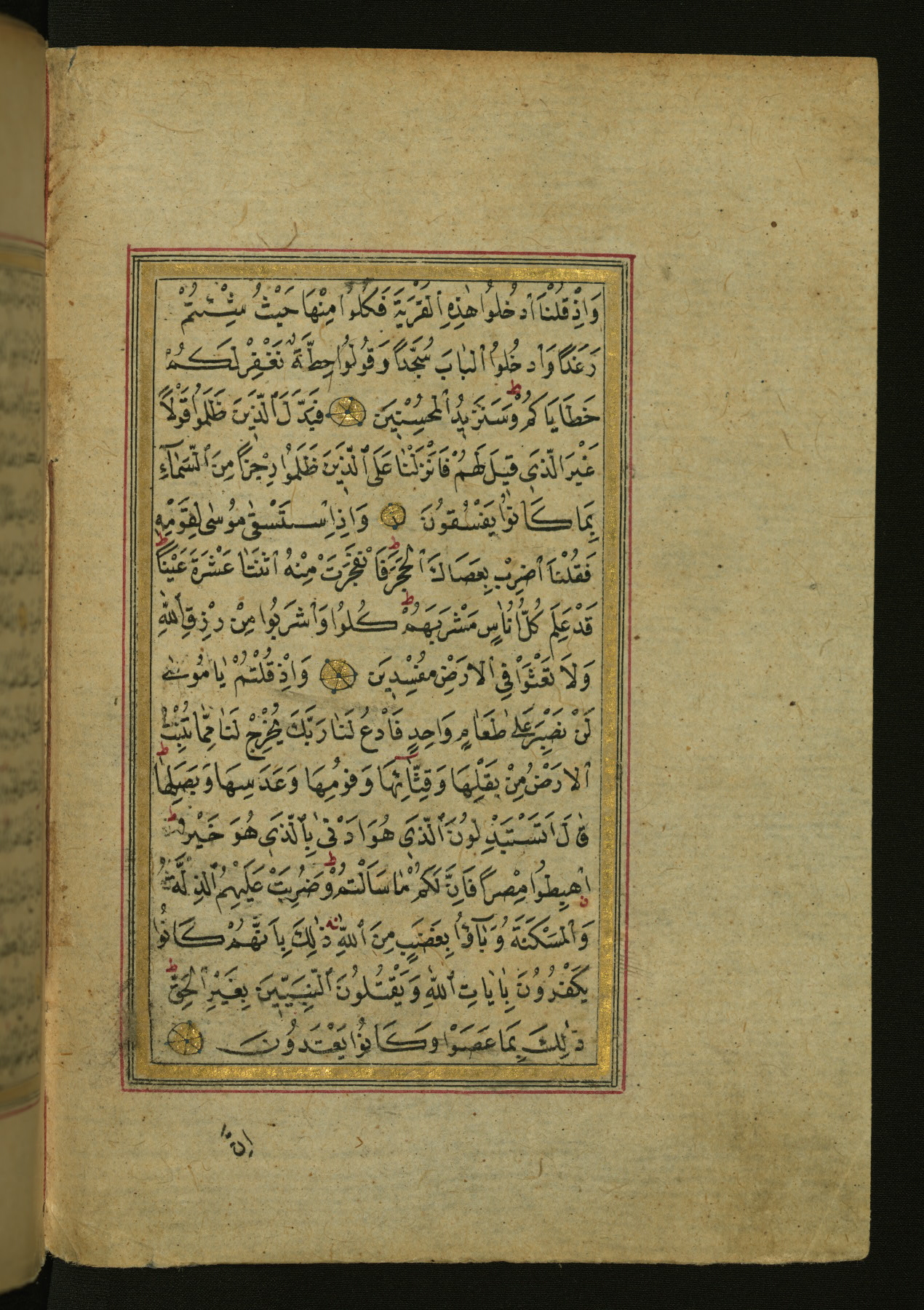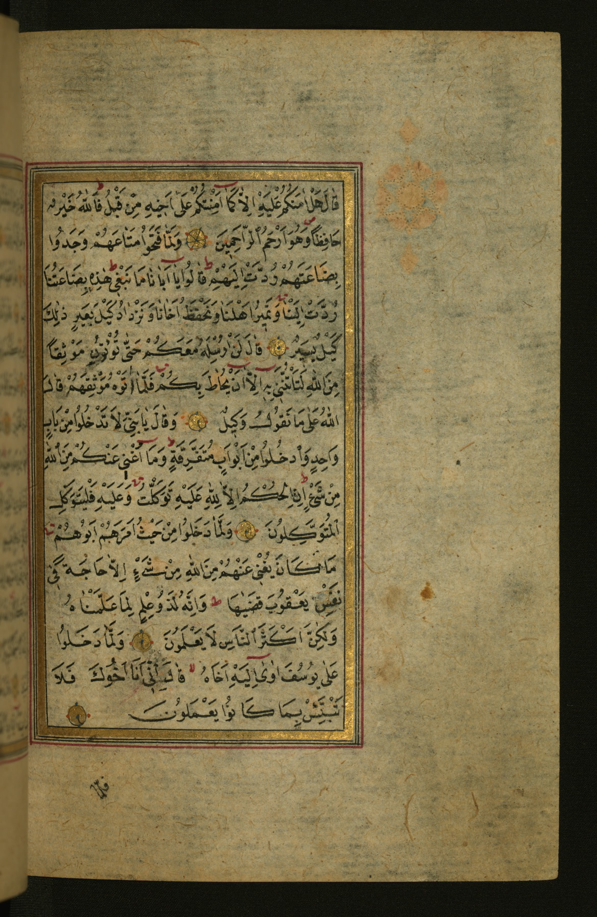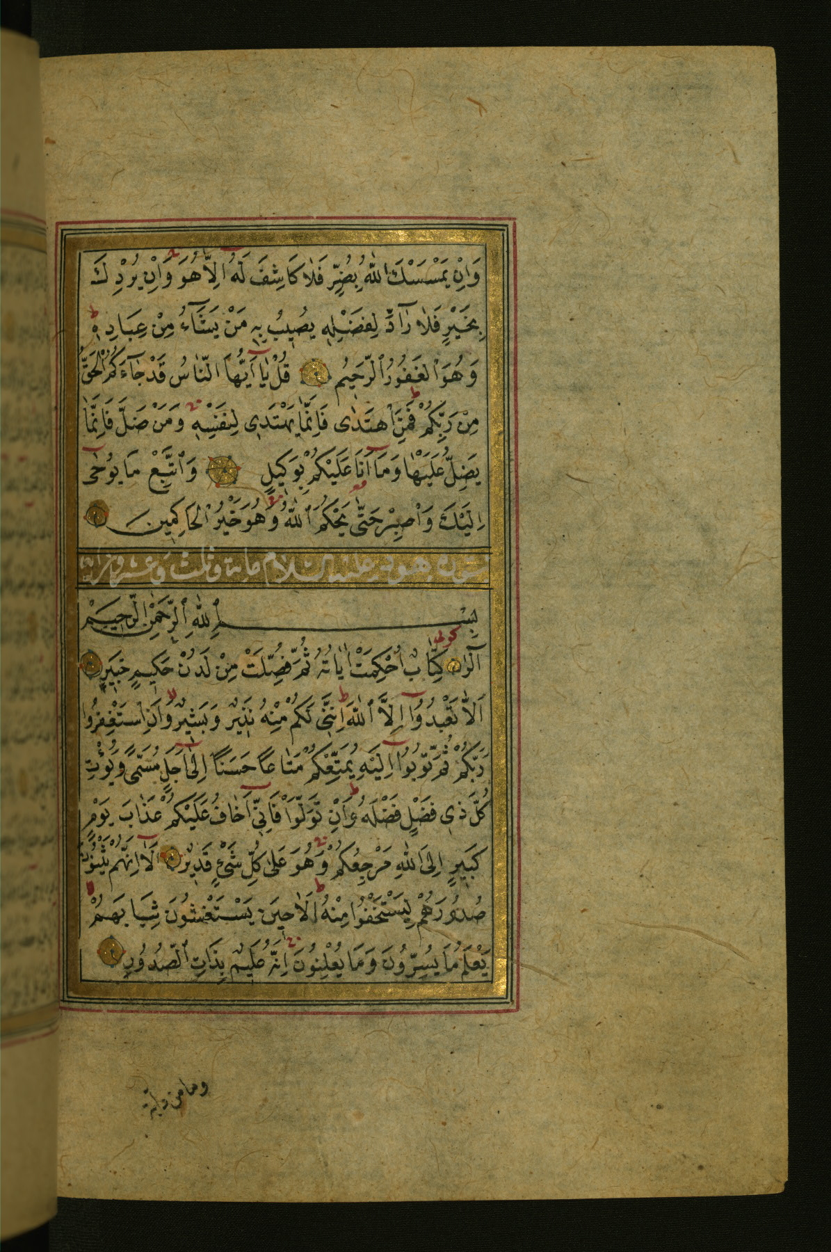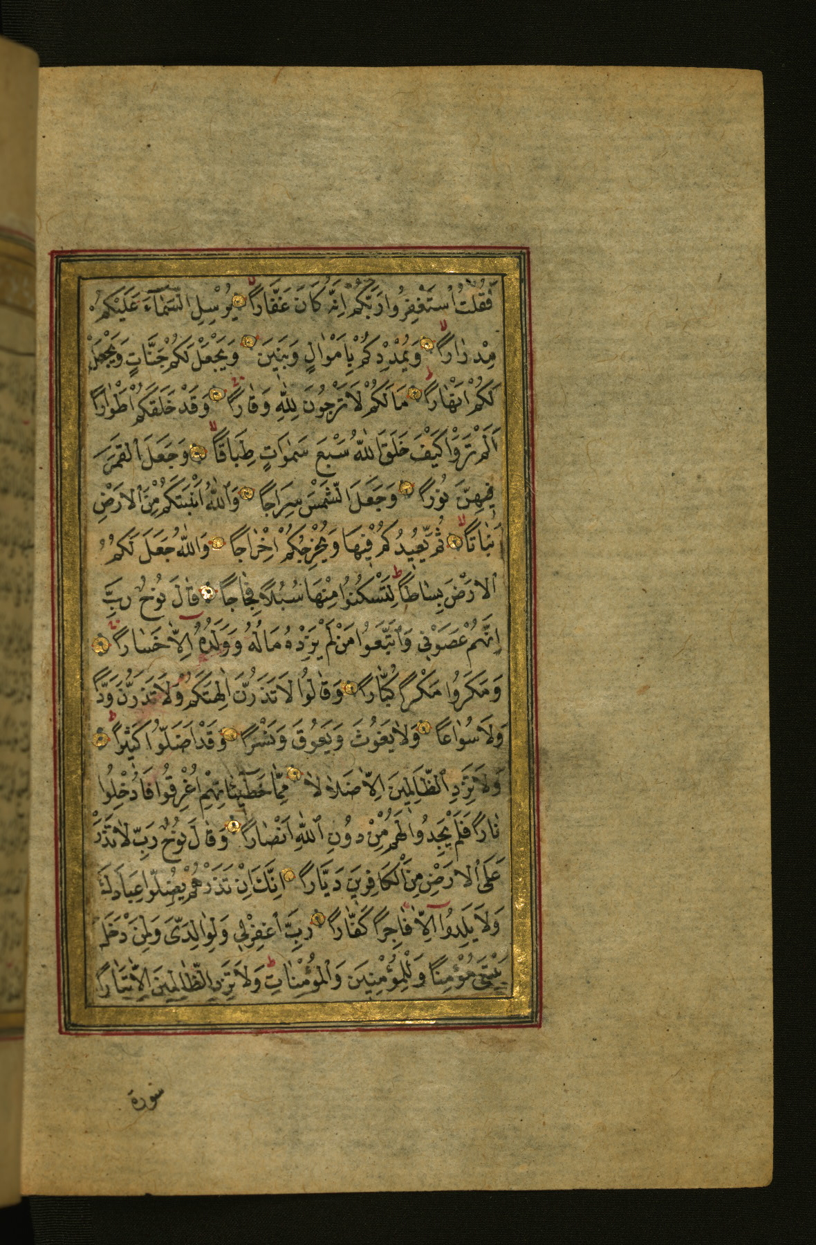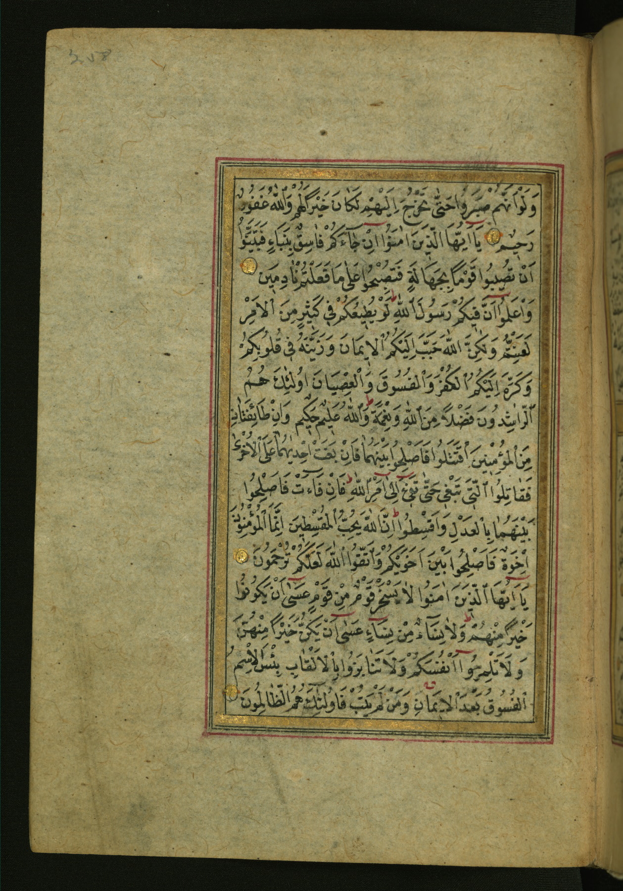 This small, illuminated single-volume copy of the Qurʾan was produced in Ottoman Turkey in 1282 AH / 1865-6 CE by Muḥammad ibn Muṣṭafá Izmīrī, a pupil of al-Rudūsī. The colophon in ijāzah script indicates that the present codex is the twenty-first copy executed by him (fol. 304b). The manuscript opens with an illuminated double-page incipit with the verses of chapters 1 (Sūrat al-fātiḥah) and 2 (Sūrat al-baqarah) (fols. 1b-2a). The text is written in naskh script in black ink with reading marks in red. Verses are separated by illuminated discs with colored dots and chapter headings are in riqāʿ script in white ink. Polychrome medallions in the margins indicate textual divisions and prostration. The binding of black leather is contemporary with the manuscript and decorated with a tooled and gold-painted geometric design enclosed by gold frames on the upper and lower boards.
