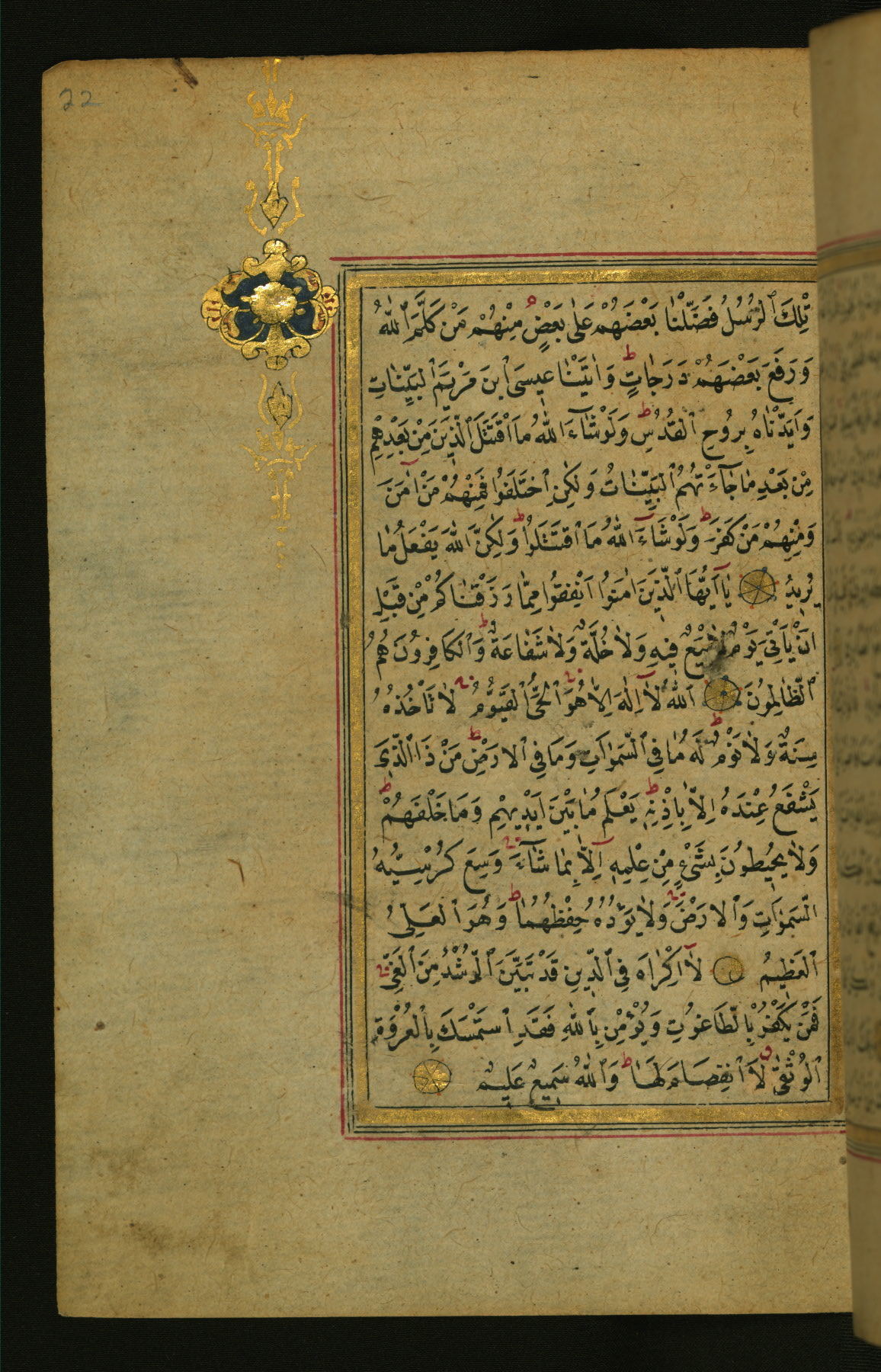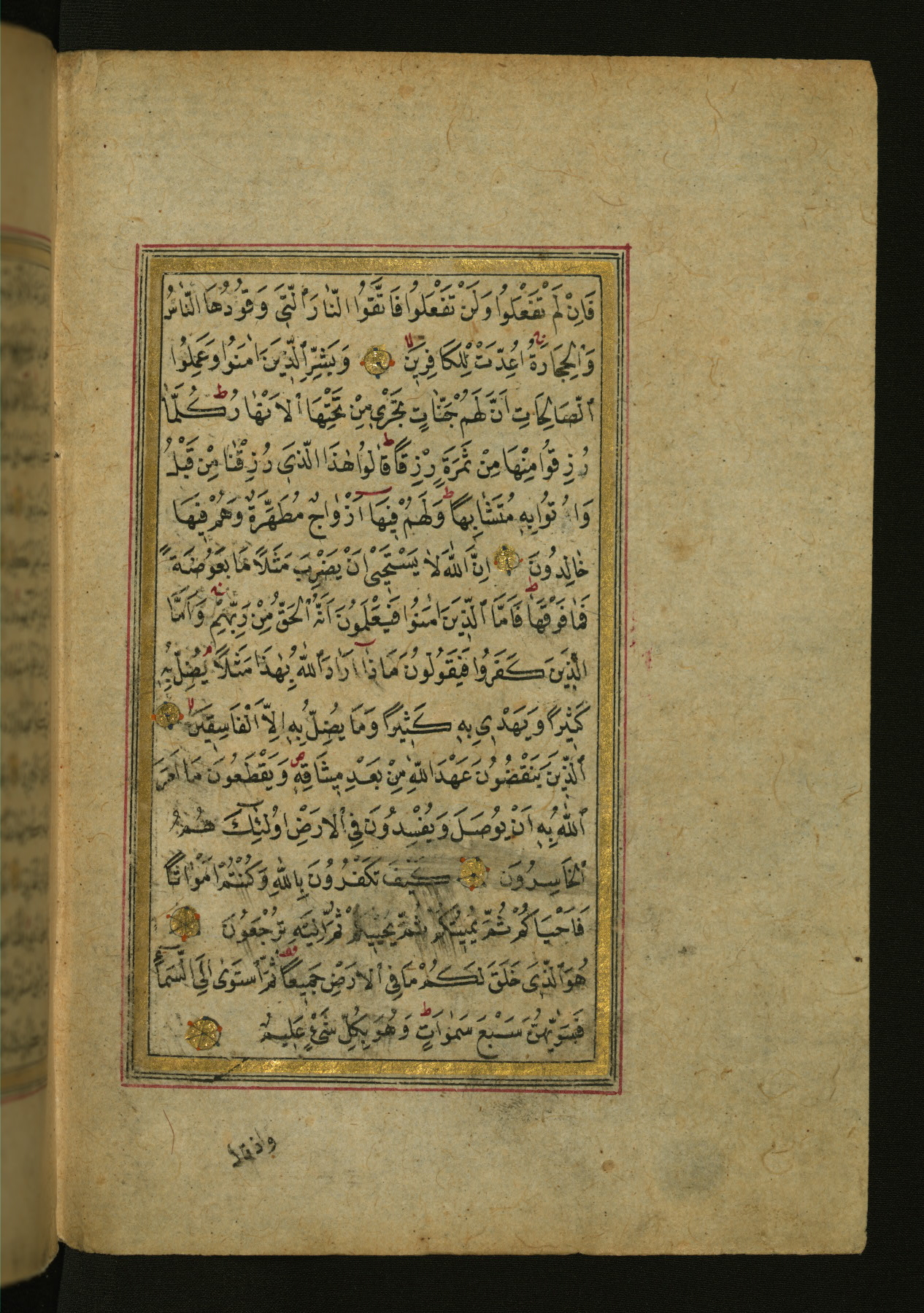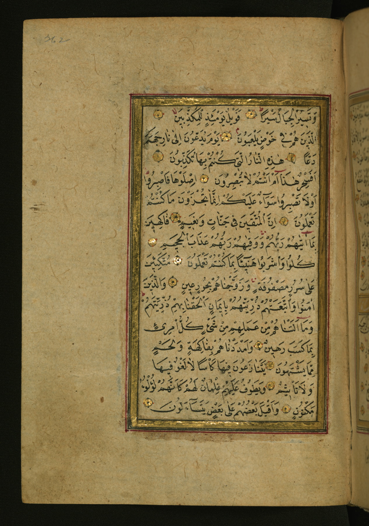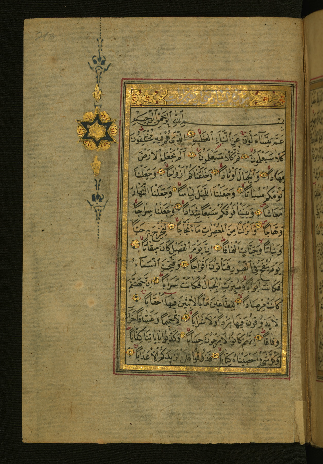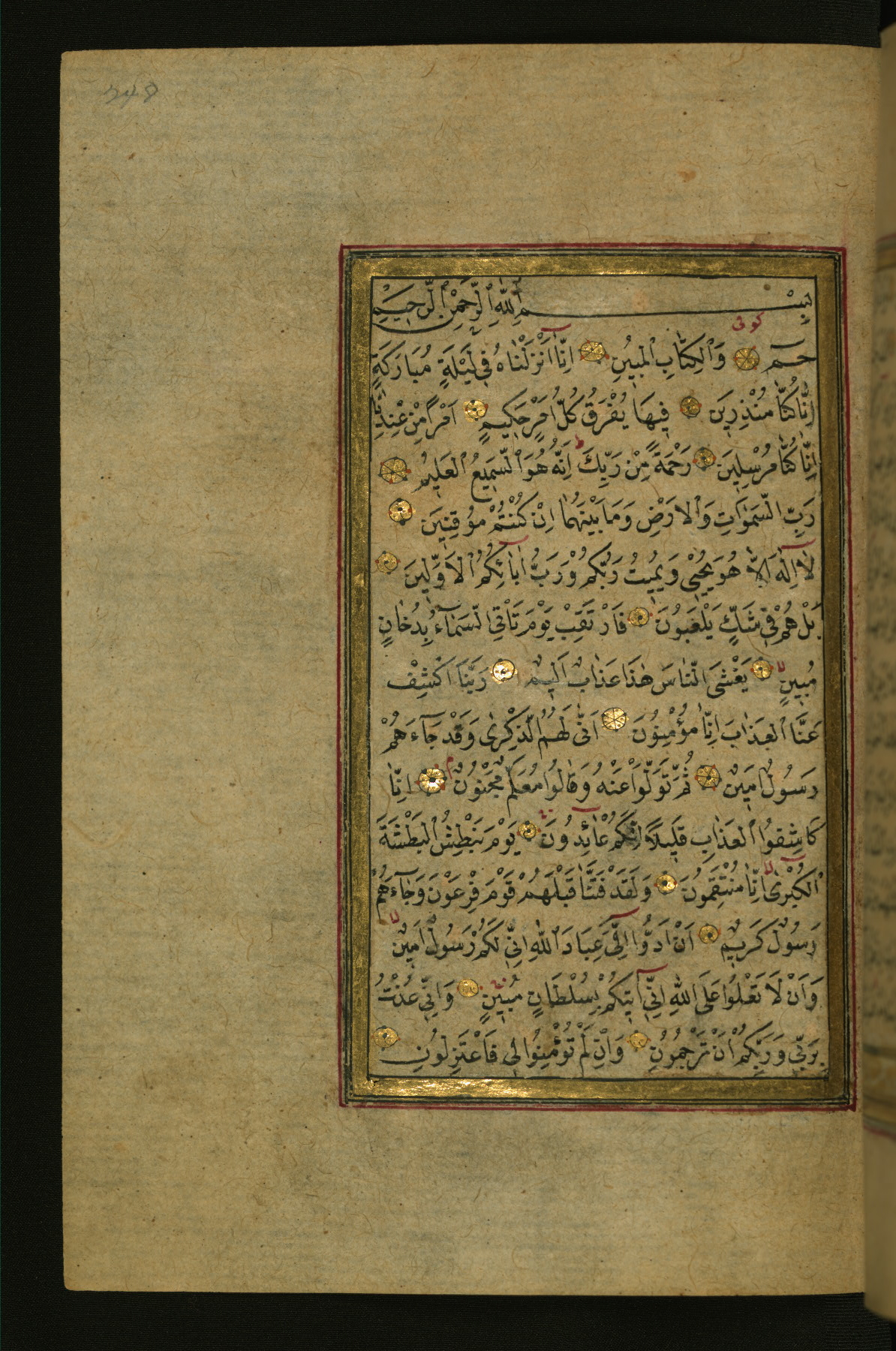 This small, illuminated single-volume copy of the Qurʾan was produced in Ottoman Turkey in 1282 AH / 1865-6 CE by Muḥammad ibn Muṣṭafá Izmīrī, a pupil of al-Rudūsī. The colophon in ijāzah script indicates that the present codex is the twenty-first copy executed by him (fol. 304b). The manuscript opens with an illuminated double-page incipit with the verses of chapters 1 (Sūrat al-fātiḥah) and 2 (Sūrat al-baqarah) (fols. 1b-2a). The text is written in naskh script in black ink with reading marks in red. Verses are separated by illuminated discs with colored dots and chapter headings are in riqāʿ script in white ink. Polychrome medallions in the margins indicate textual divisions and prostration. The binding of black leather is contemporary with the manuscript and decorated with a tooled and gold-painted geometric design enclosed by gold frames on the upper and lower boards.