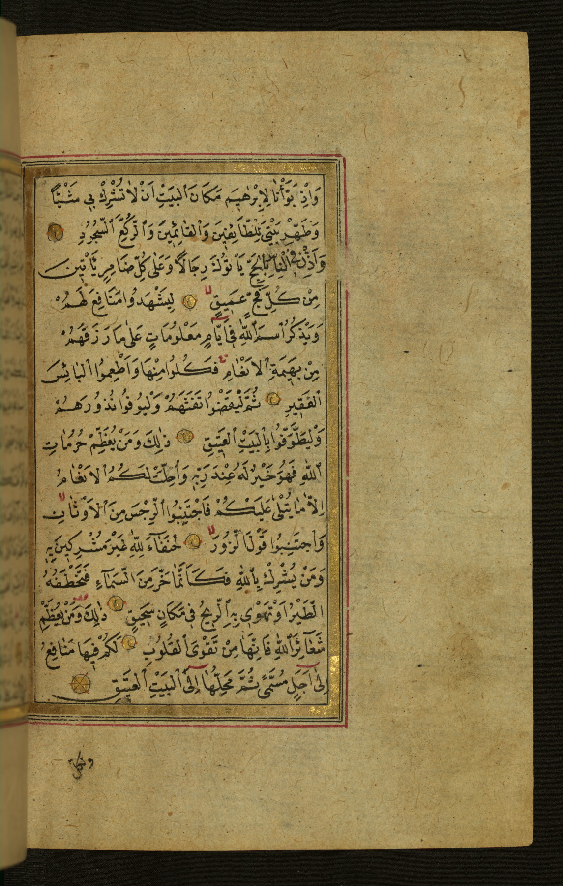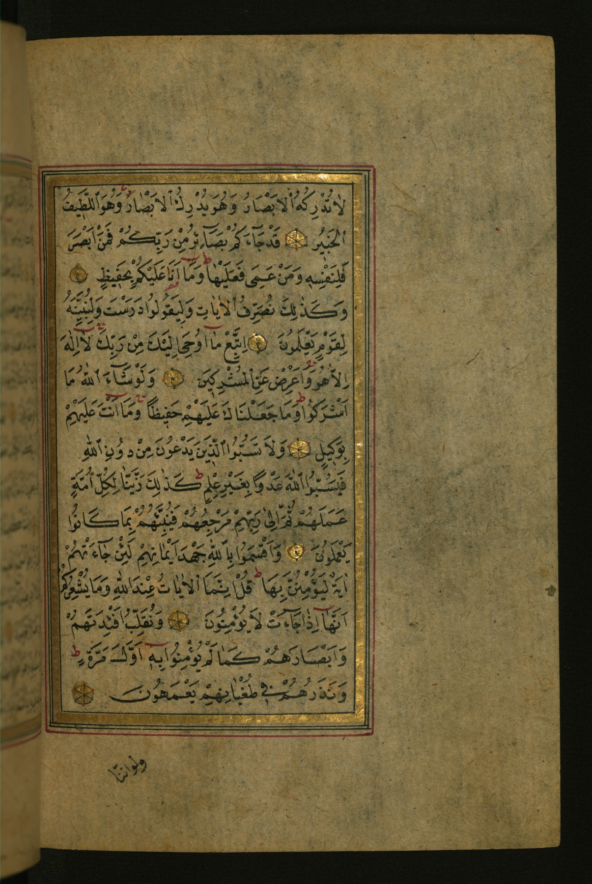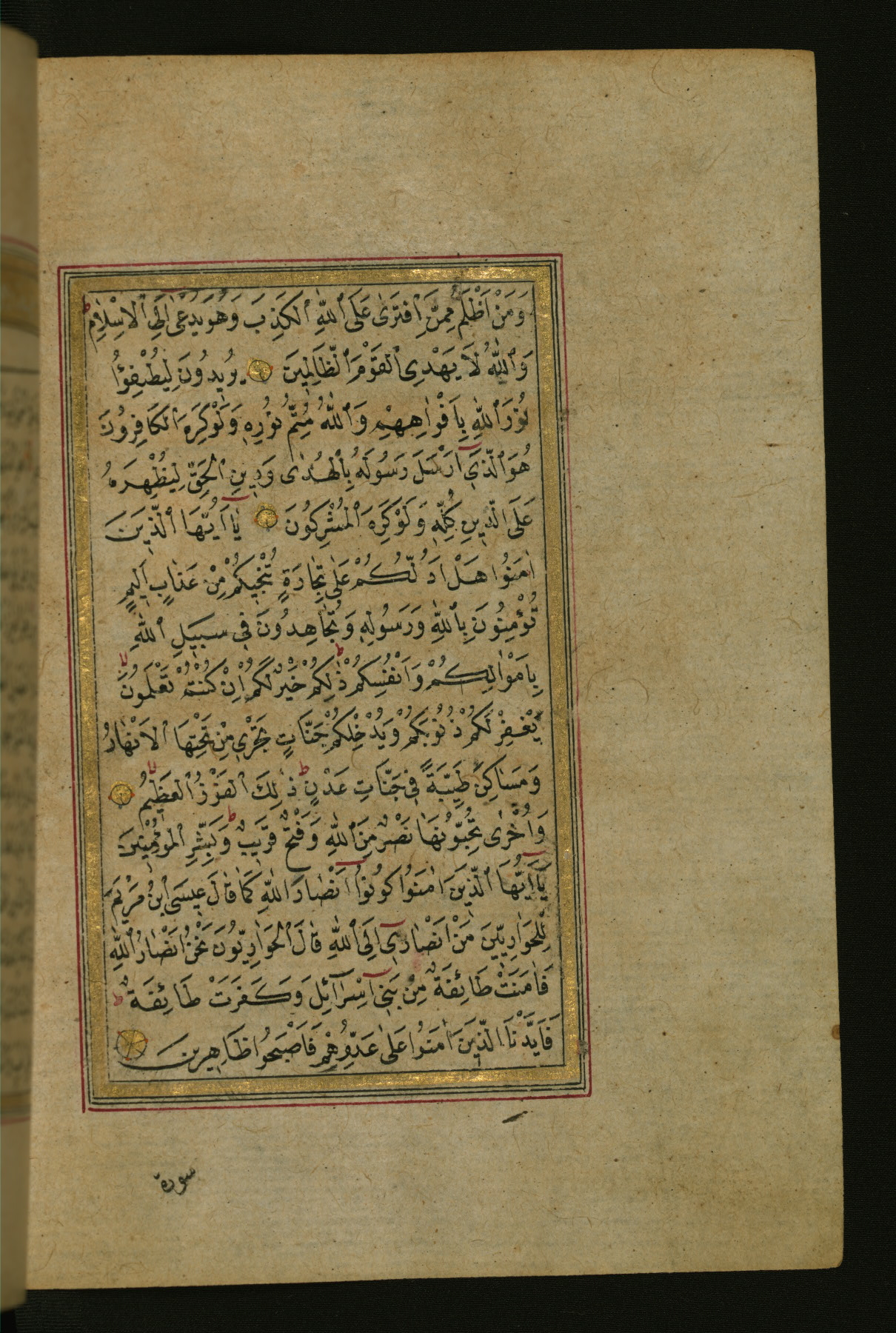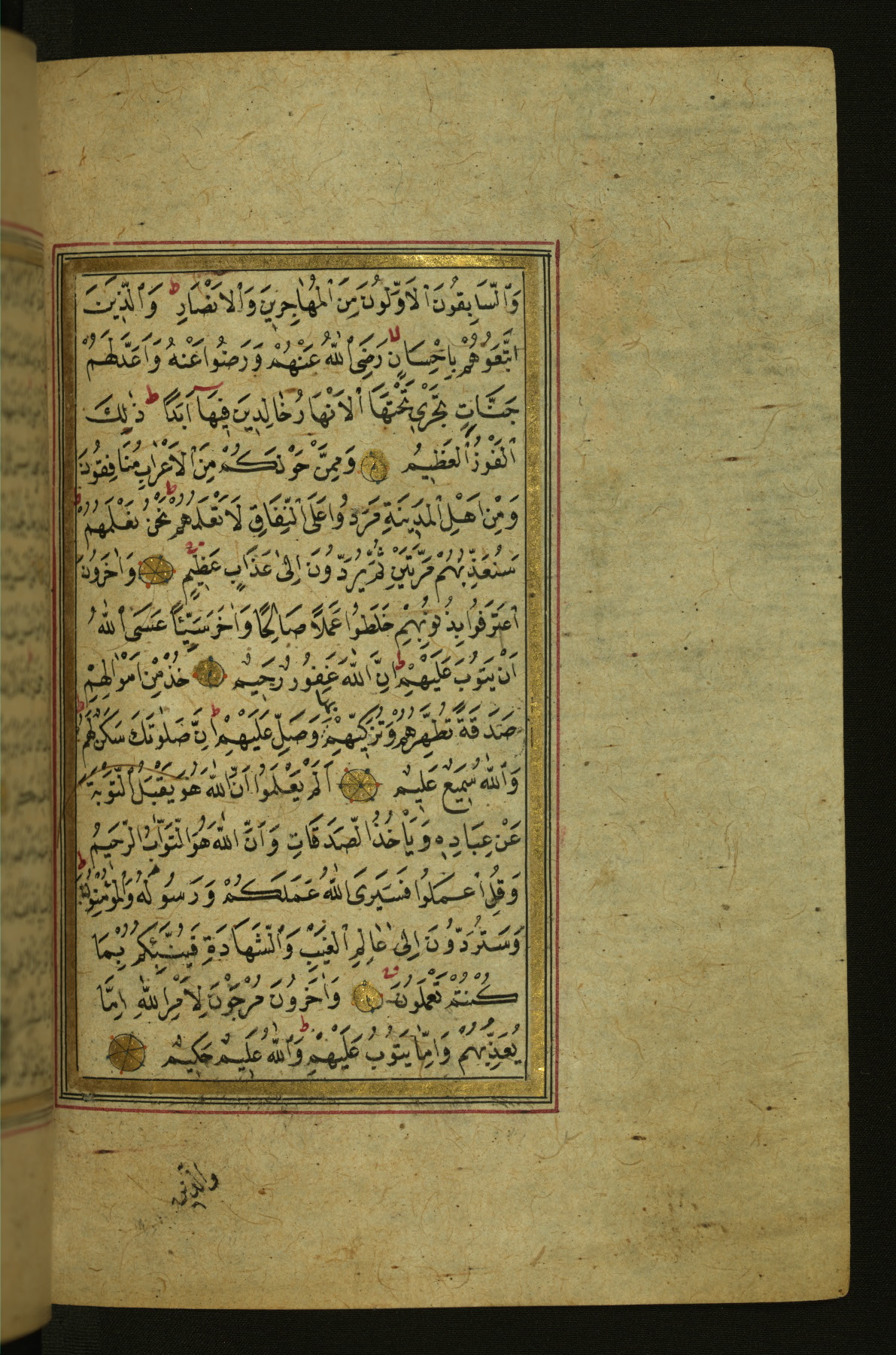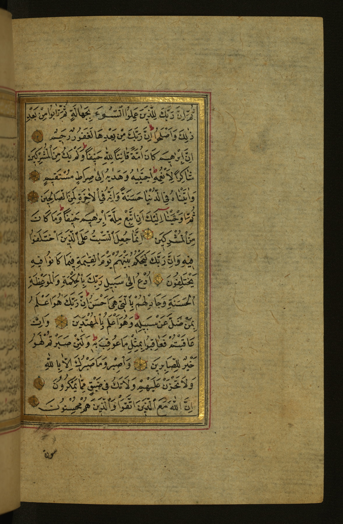 This small, illuminated single-volume copy of the Qurʾan was produced in Ottoman Turkey in 1282 AH / 1865-6 CE by Muḥammad ibn Muṣṭafá Izmīrī, a pupil of al-Rudūsī. The colophon in ijāzah script indicates that the present codex is the twenty-first copy executed by him (fol. 304b). The manuscript opens with an illuminated double-page incipit with the verses of chapters 1 (Sūrat al-fātiḥah) and 2 (Sūrat al-baqarah) (fols. 1b-2a). The text is written in naskh script in black ink with reading marks in red. Verses are separated by illuminated discs with colored dots and chapter headings are in riqāʿ script in white ink. Polychrome medallions in the margins indicate textual divisions and prostration. The binding of black leather is contemporary with the manuscript and decorated with a tooled and gold-painted geometric design enclosed by gold frames on the upper and lower boards.
