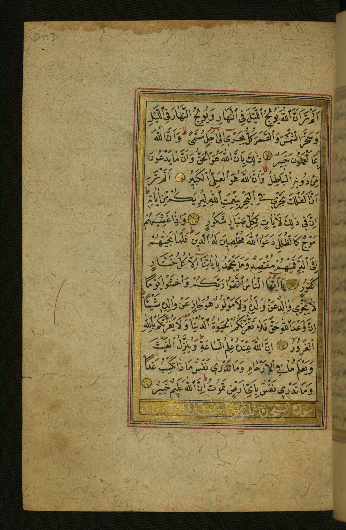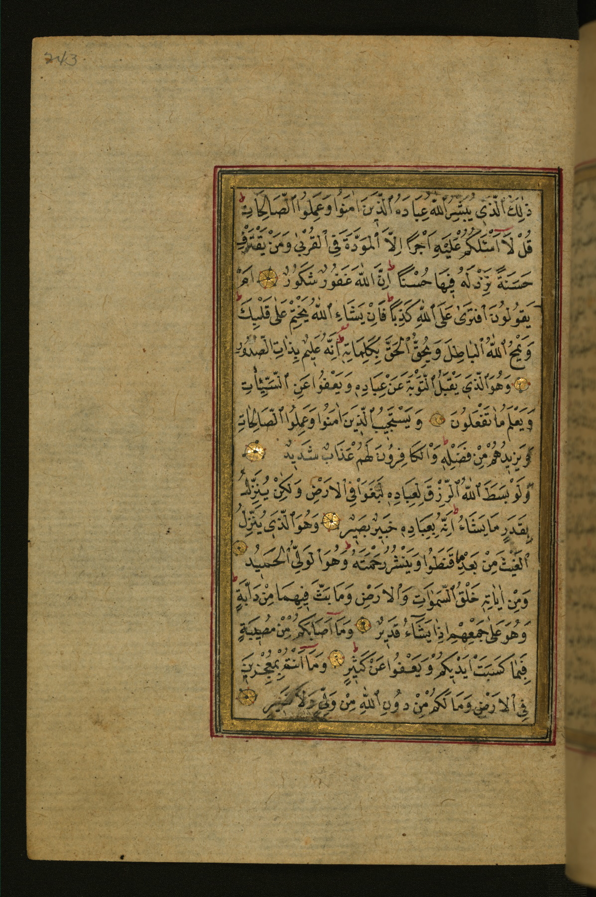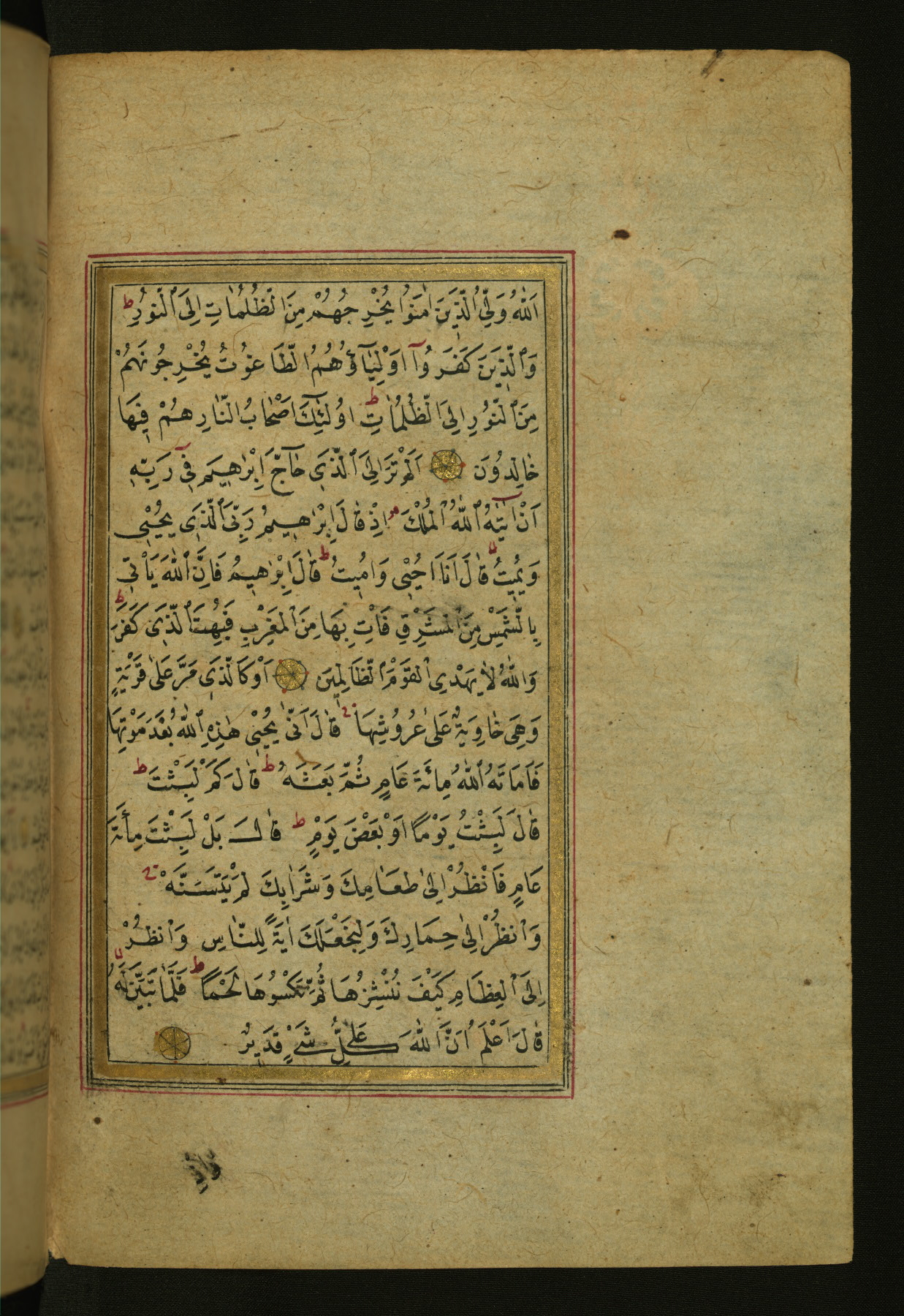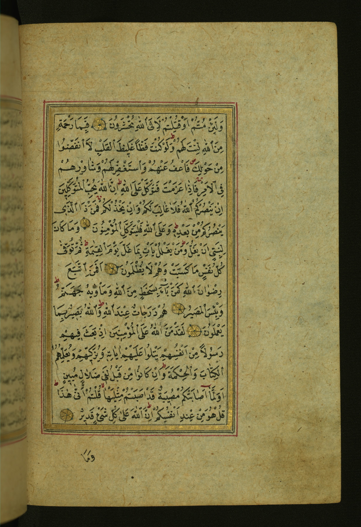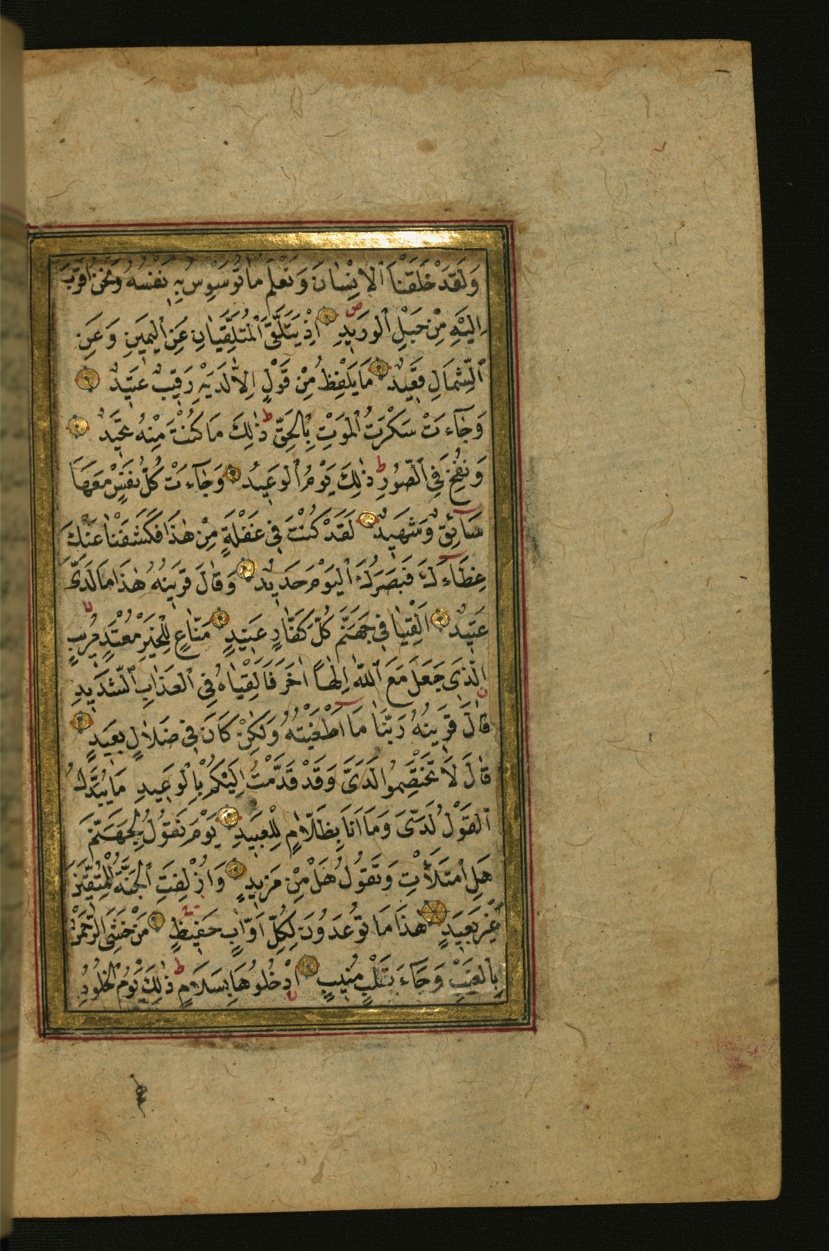 This small, illuminated single-volume copy of the Qurʾan was produced in Ottoman Turkey in 1282 AH / 1865-6 CE by Muḥammad ibn Muṣṭafá Izmīrī, a pupil of al-Rudūsī. The colophon in ijāzah script indicates that the present codex is the twenty-first copy executed by him (fol. 304b). The manuscript opens with an illuminated double-page incipit with the verses of chapters 1 (Sūrat al-fātiḥah) and 2 (Sūrat al-baqarah) (fols. 1b-2a). The text is written in naskh script in black ink with reading marks in red. Verses are separated by illuminated discs with colored dots and chapter headings are in riqāʿ script in white ink. Polychrome medallions in the margins indicate textual divisions and prostration. The binding of black leather is contemporary with the manuscript and decorated with a tooled and gold-painted geometric design enclosed by gold frames on the upper and lower boards.