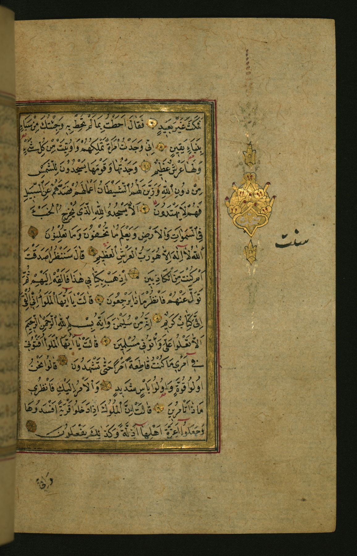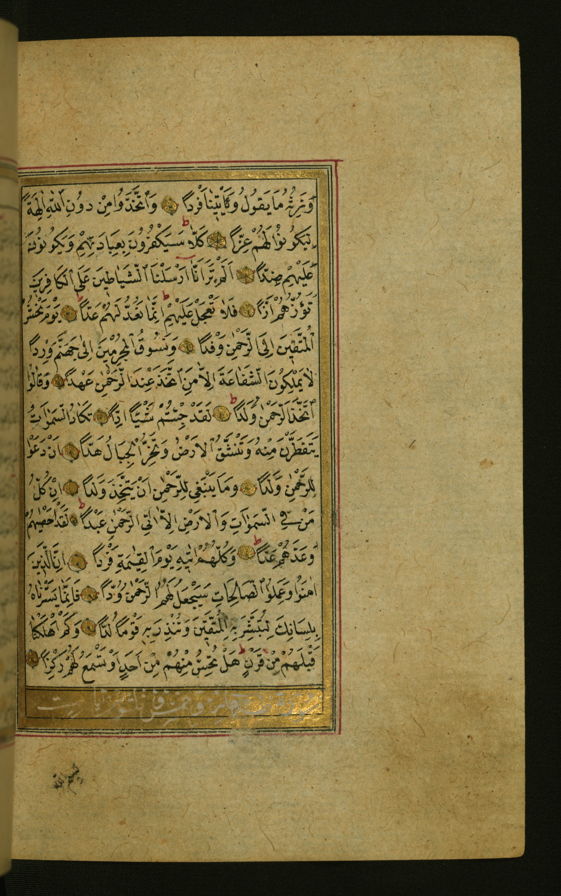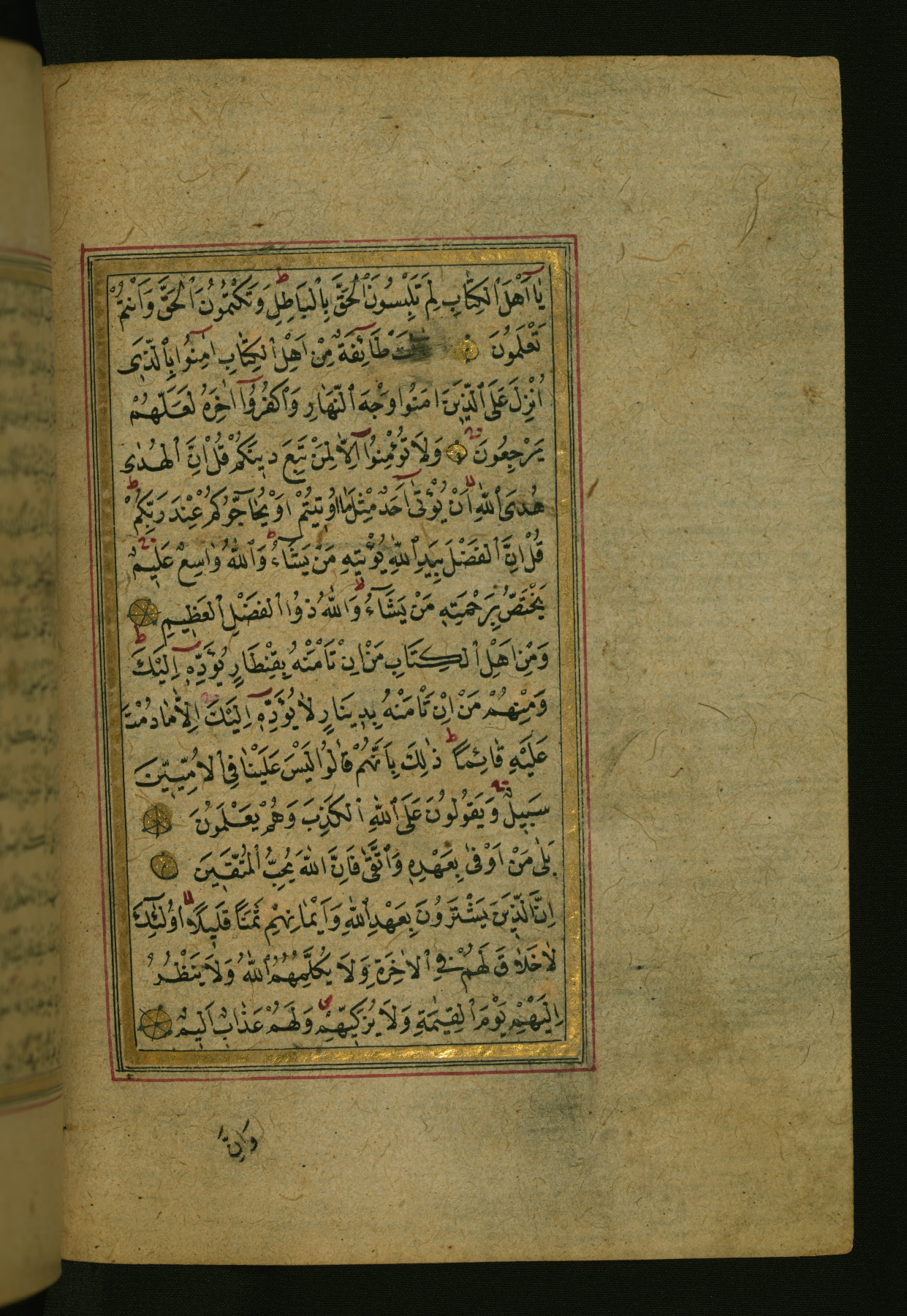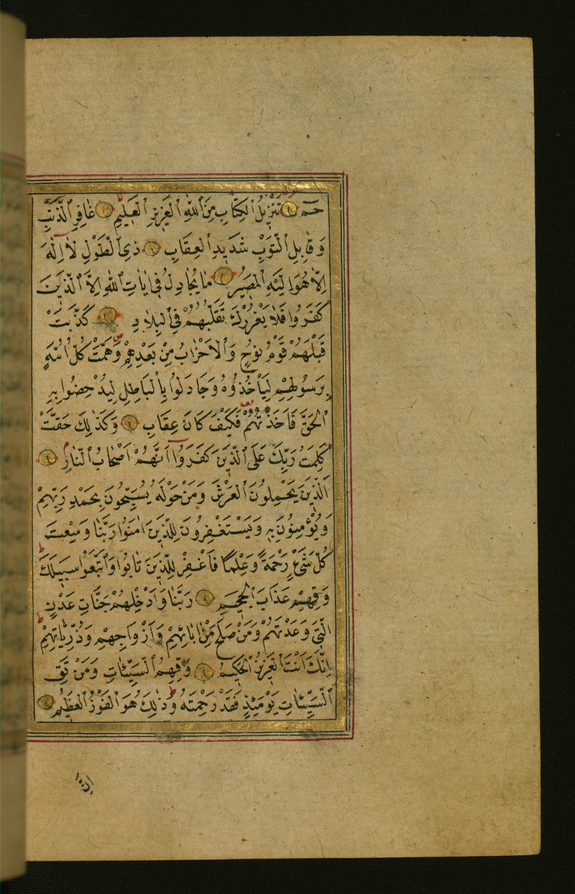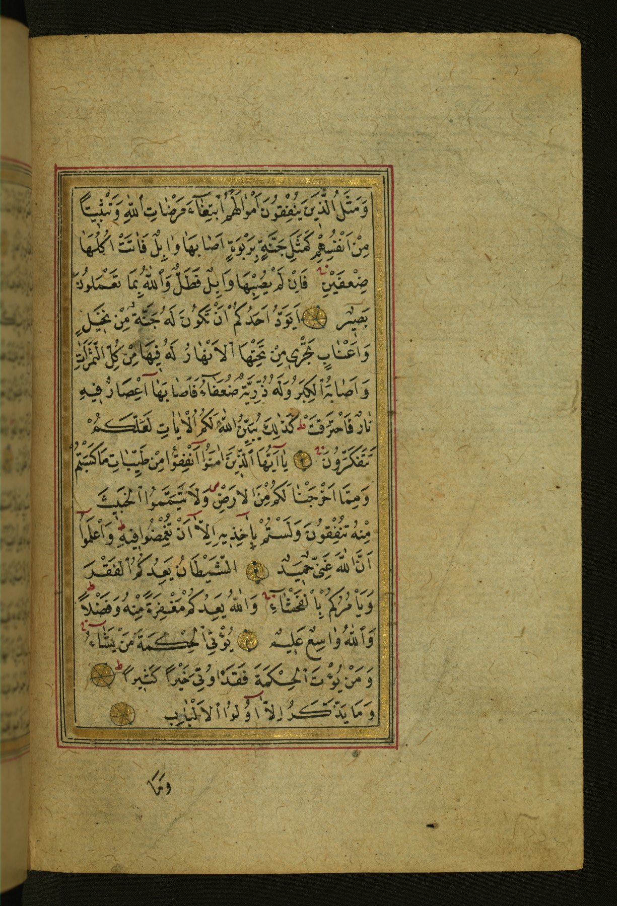 This small, illuminated single-volume copy of the Qurʾan was produced in Ottoman Turkey in 1282 AH / 1865-6 CE by Muḥammad ibn Muṣṭafá Izmīrī, a pupil of al-Rudūsī. The colophon in ijāzah script indicates that the present codex is the twenty-first copy executed by him (fol. 304b). The manuscript opens with an illuminated double-page incipit with the verses of chapters 1 (Sūrat al-fātiḥah) and 2 (Sūrat al-baqarah) (fols. 1b-2a). The text is written in naskh script in black ink with reading marks in red. Verses are separated by illuminated discs with colored dots and chapter headings are in riqāʿ script in white ink. Polychrome medallions in the margins indicate textual divisions and prostration. The binding of black leather is contemporary with the manuscript and decorated with a tooled and gold-painted geometric design enclosed by gold frames on the upper and lower boards.