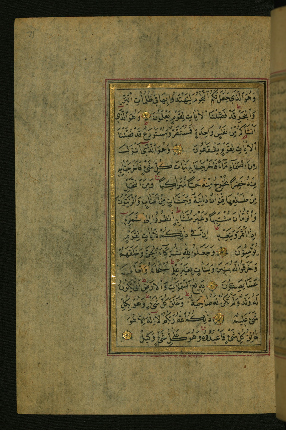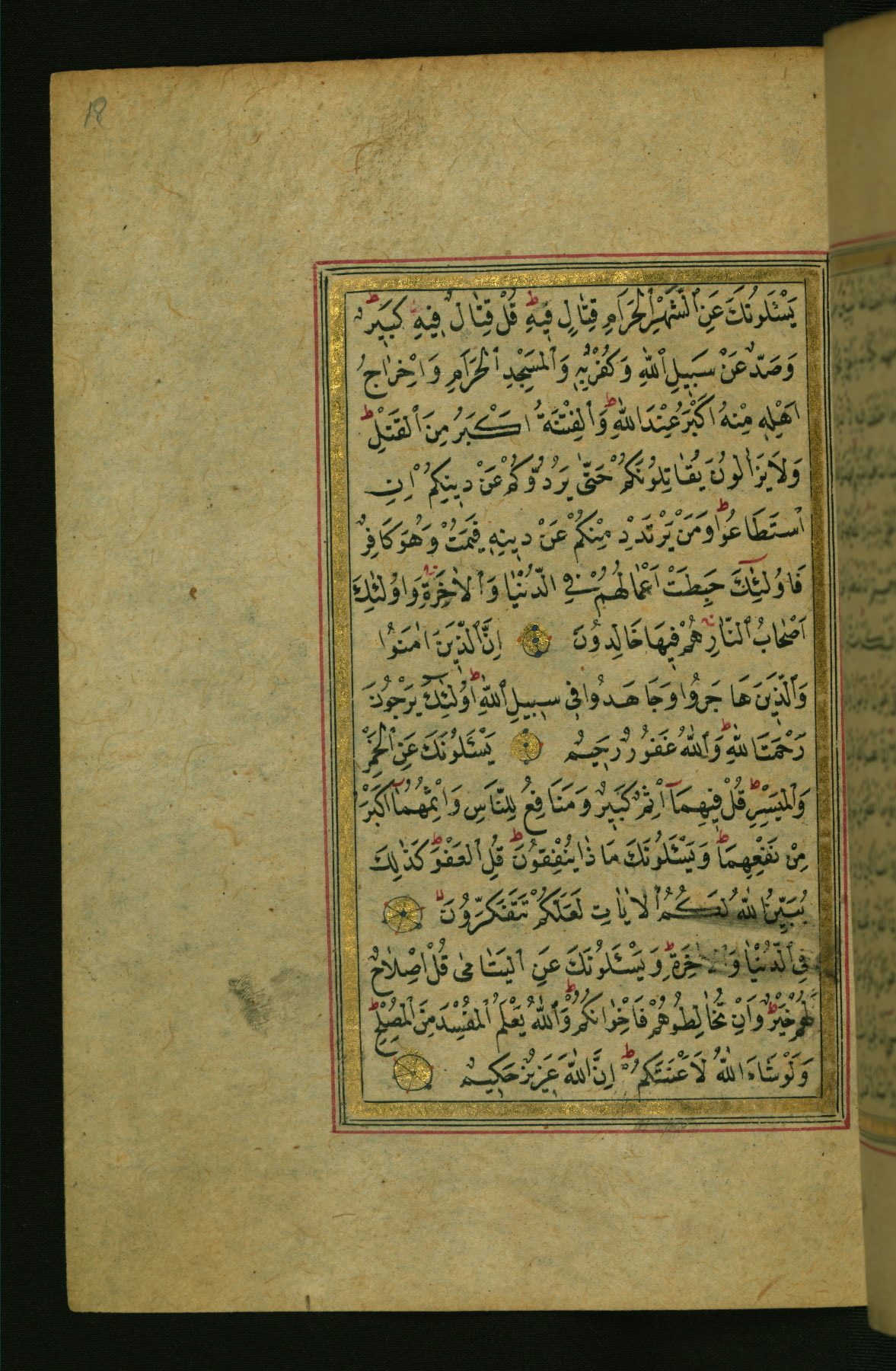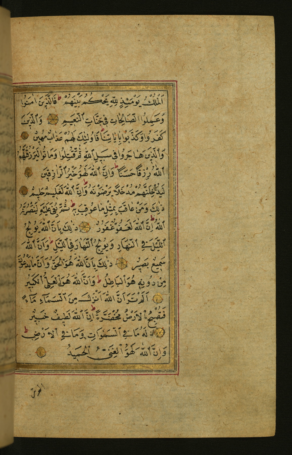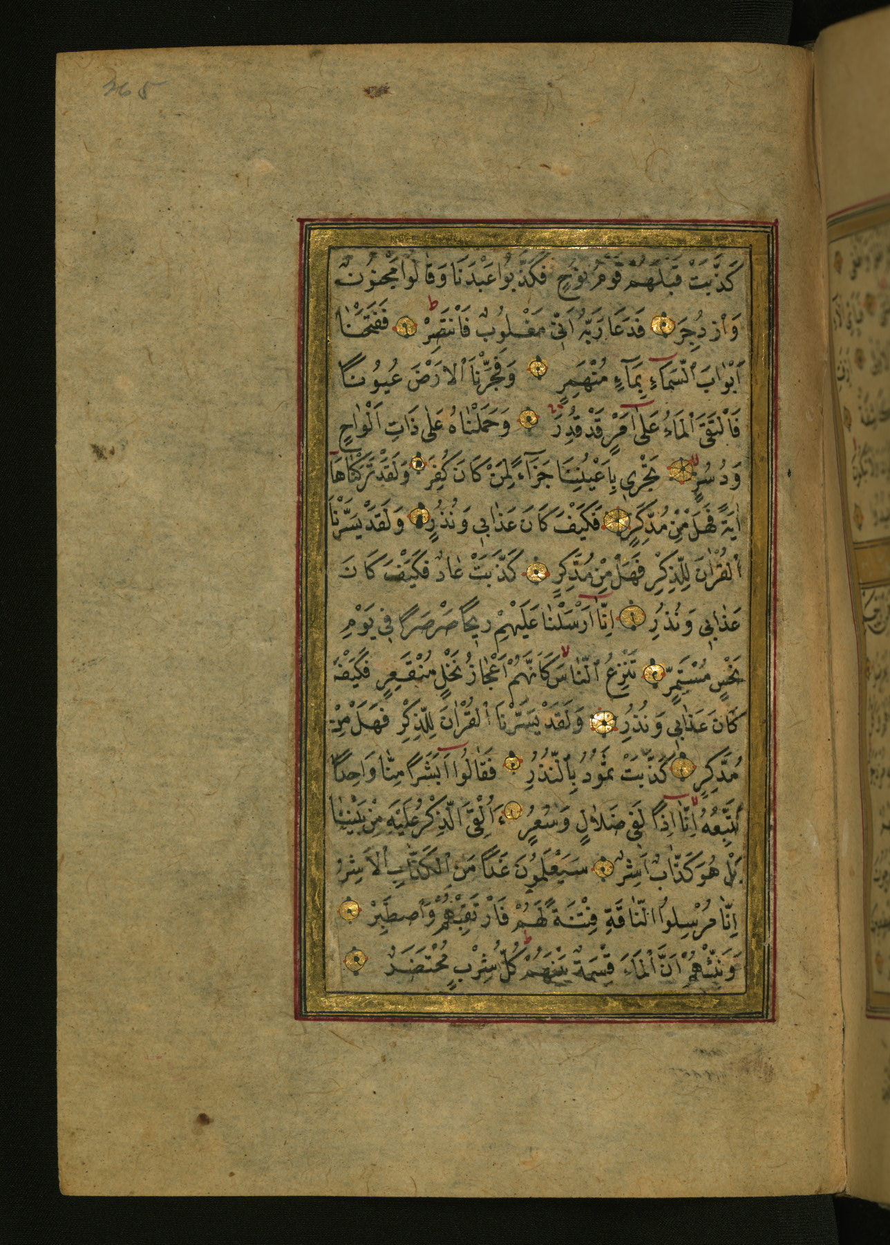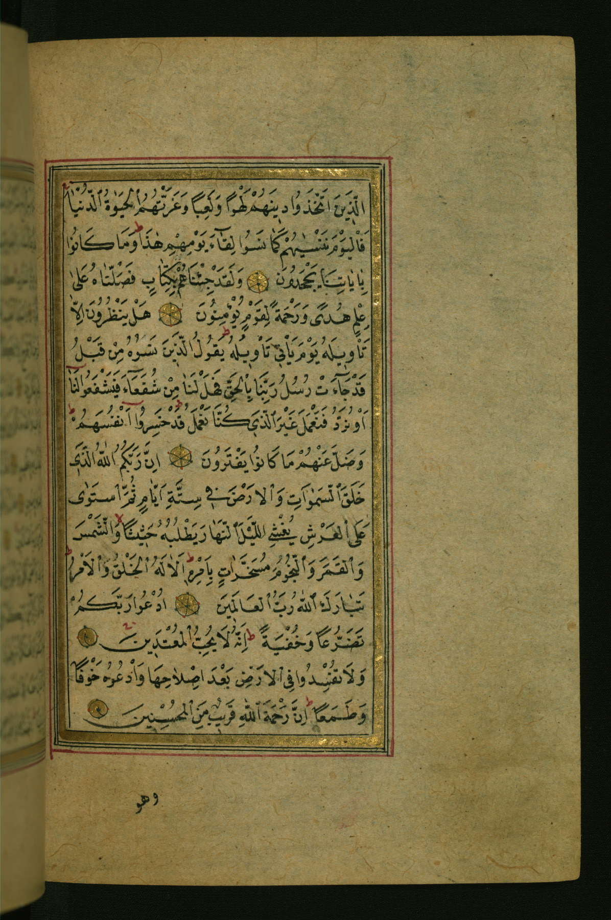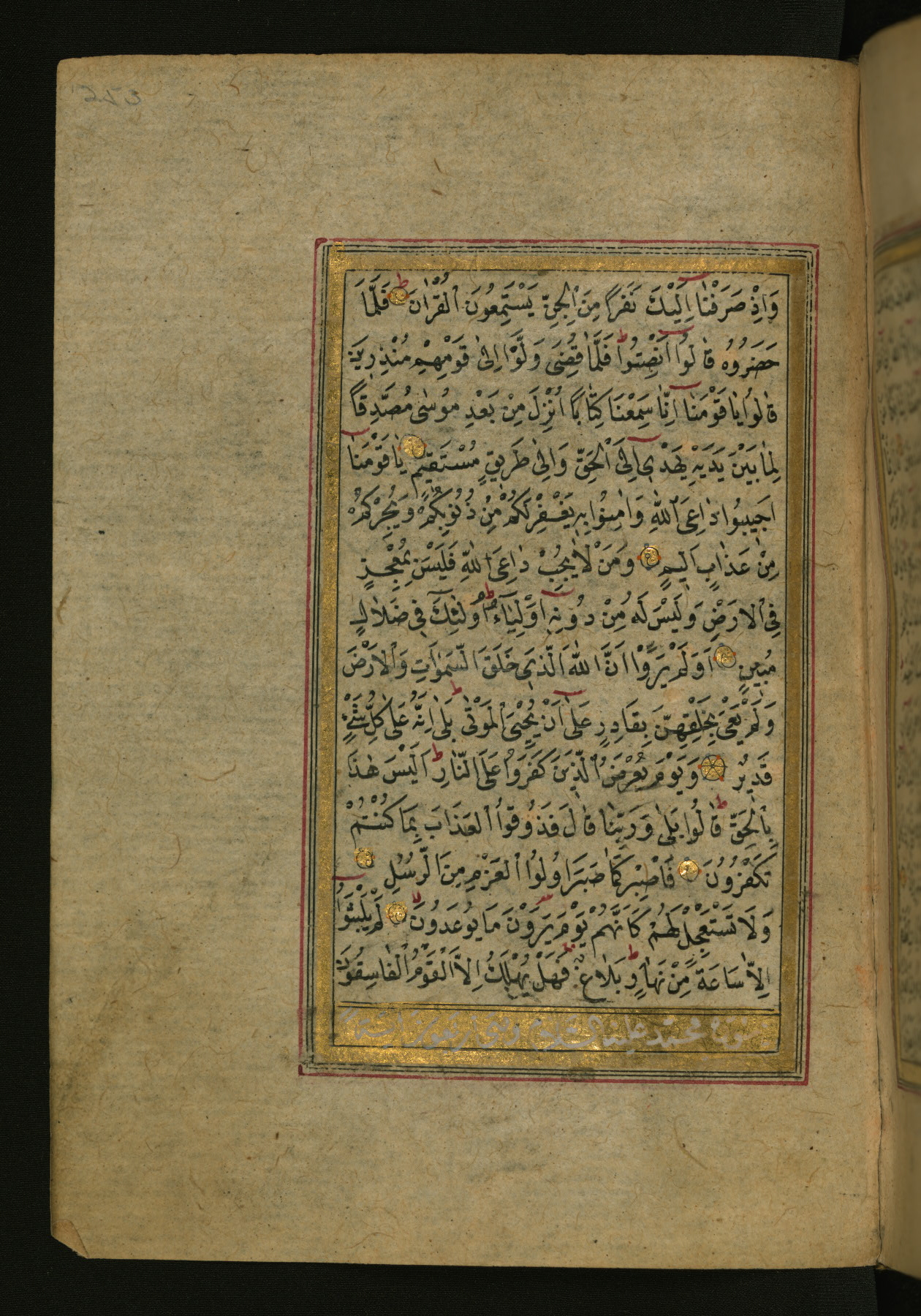 This small, illuminated single-volume copy of the Qurʾan was produced in Ottoman Turkey in 1282 AH / 1865-6 CE by Muḥammad ibn Muṣṭafá Izmīrī, a pupil of al-Rudūsī. The colophon in ijāzah script indicates that the present codex is the twenty-first copy executed by him (fol. 304b). The manuscript opens with an illuminated double-page incipit with the verses of chapters 1 (Sūrat al-fātiḥah) and 2 (Sūrat al-baqarah) (fols. 1b-2a). The text is written in naskh script in black ink with reading marks in red. Verses are separated by illuminated discs with colored dots and chapter headings are in riqāʿ script in white ink. Polychrome medallions in the margins indicate textual divisions and prostration. The binding of black leather is contemporary with the manuscript and decorated with a tooled and gold-painted geometric design enclosed by gold frames on the upper and lower boards.