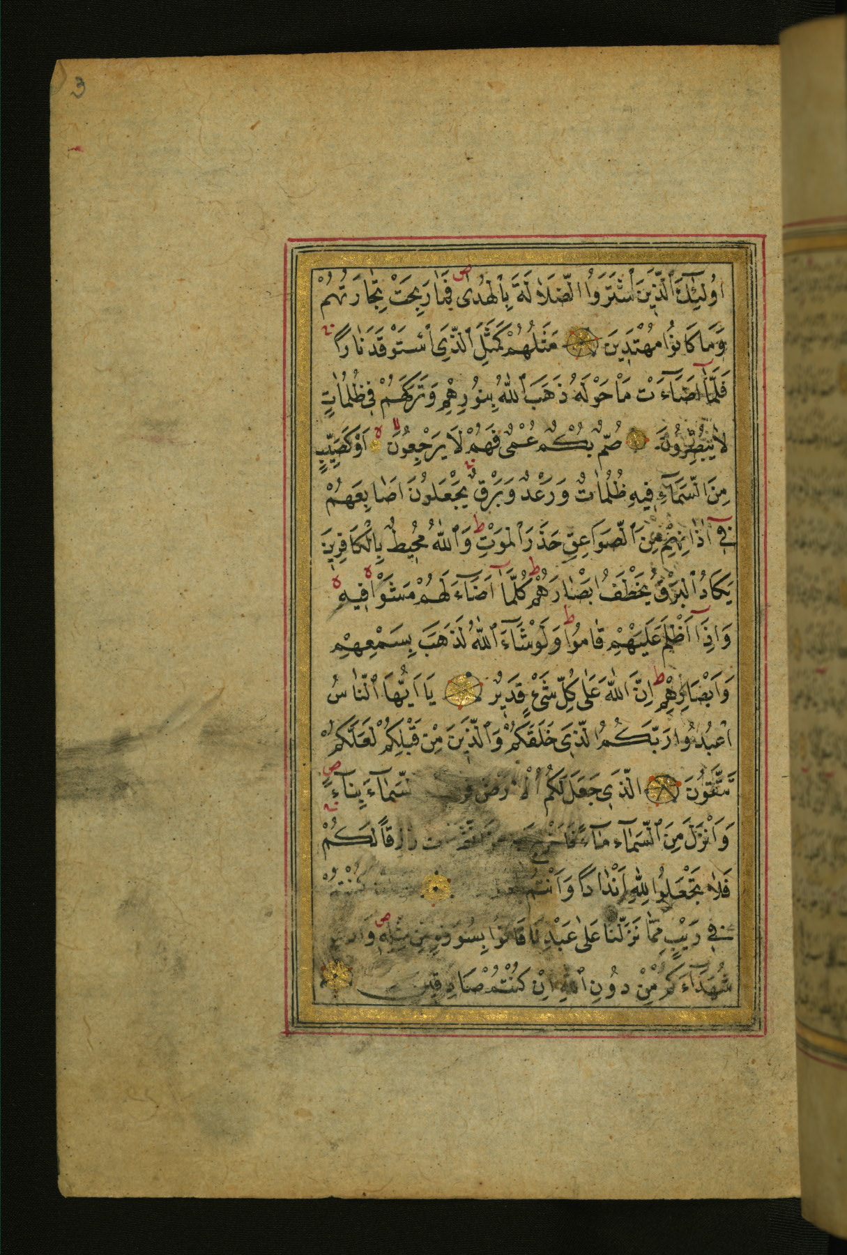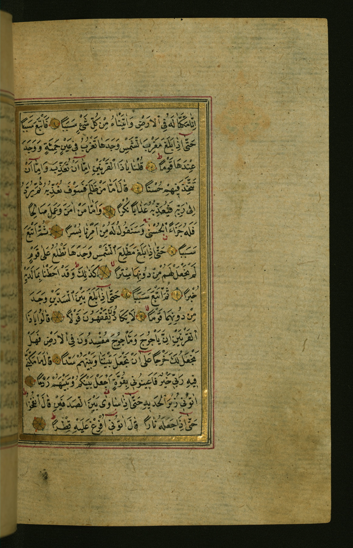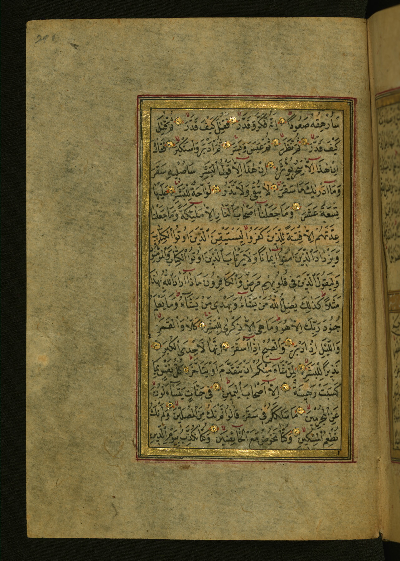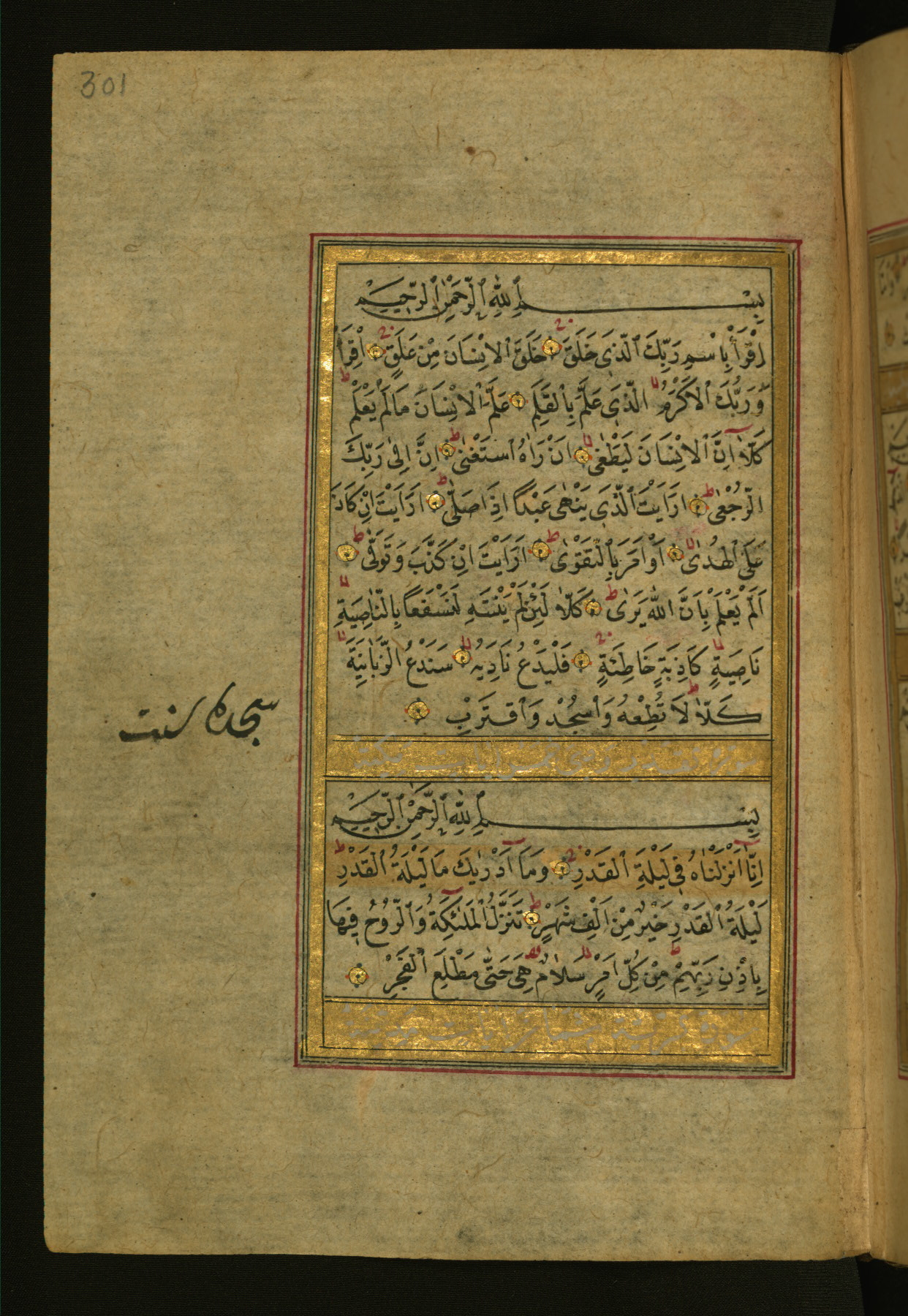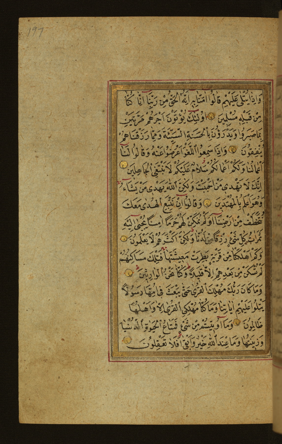 This small, illuminated single-volume copy of the Qurʾan was produced in Ottoman Turkey in 1282 AH / 1865-6 CE by Muḥammad ibn Muṣṭafá Izmīrī, a pupil of al-Rudūsī. The colophon in ijāzah script indicates that the present codex is the twenty-first copy executed by him (fol. 304b). The manuscript opens with an illuminated double-page incipit with the verses of chapters 1 (Sūrat al-fātiḥah) and 2 (Sūrat al-baqarah) (fols. 1b-2a). The text is written in naskh script in black ink with reading marks in red. Verses are separated by illuminated discs with colored dots and chapter headings are in riqāʿ script in white ink. Polychrome medallions in the margins indicate textual divisions and prostration. The binding of black leather is contemporary with the manuscript and decorated with a tooled and gold-painted geometric design enclosed by gold frames on the upper and lower boards.