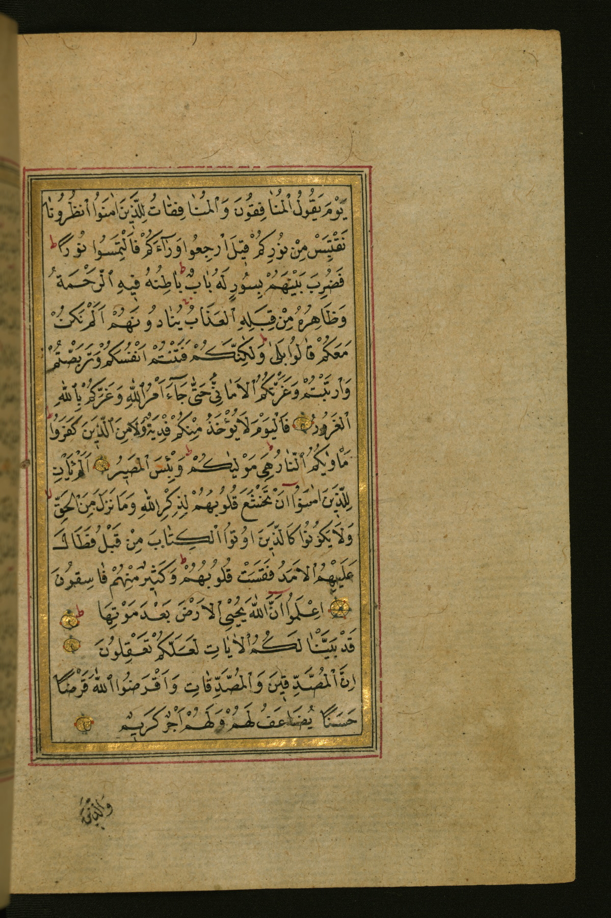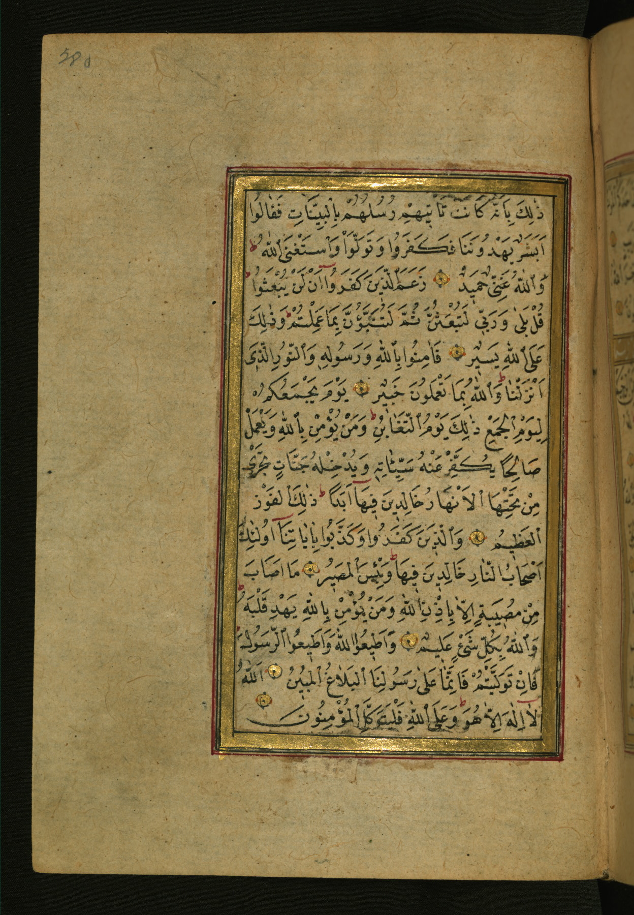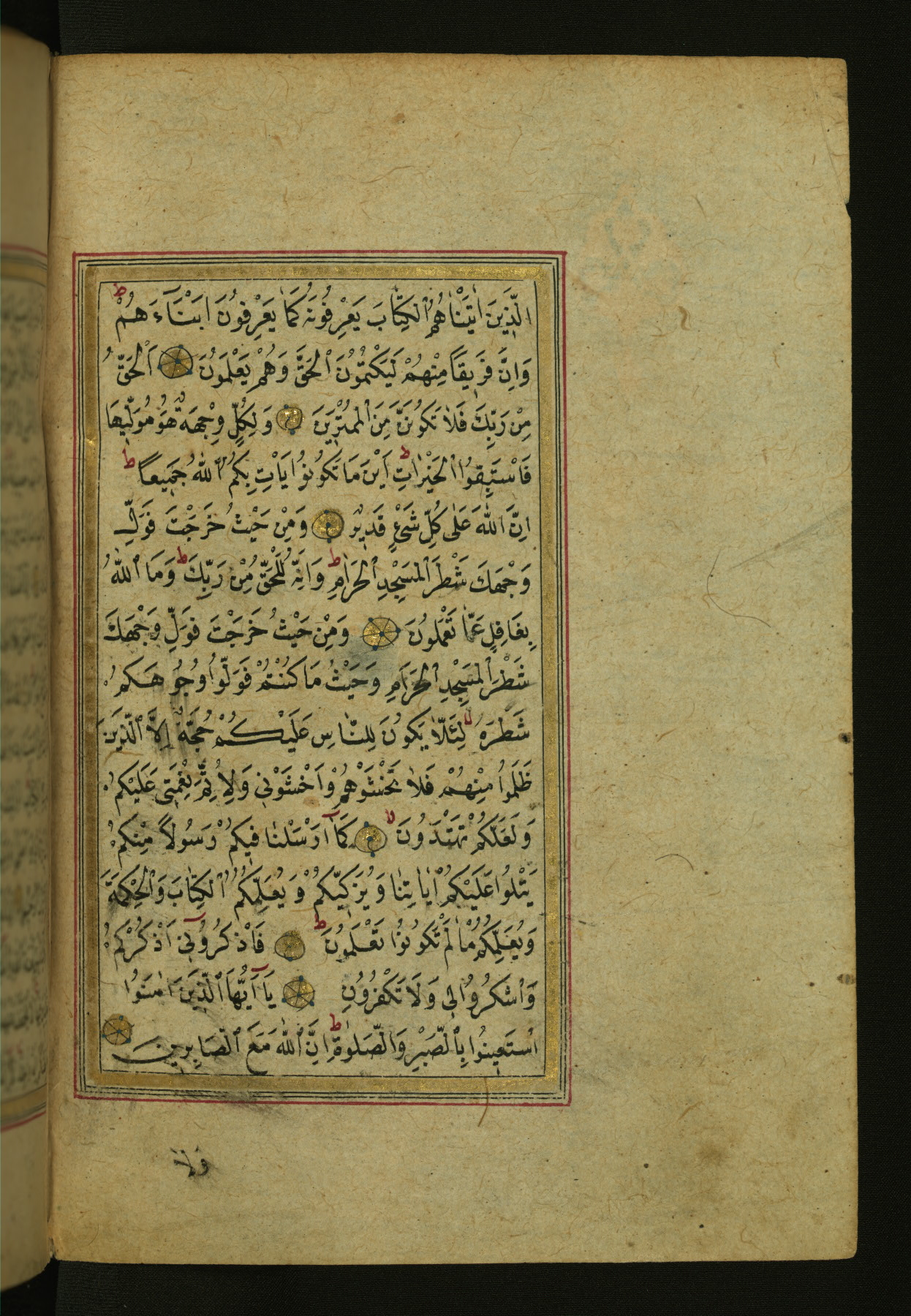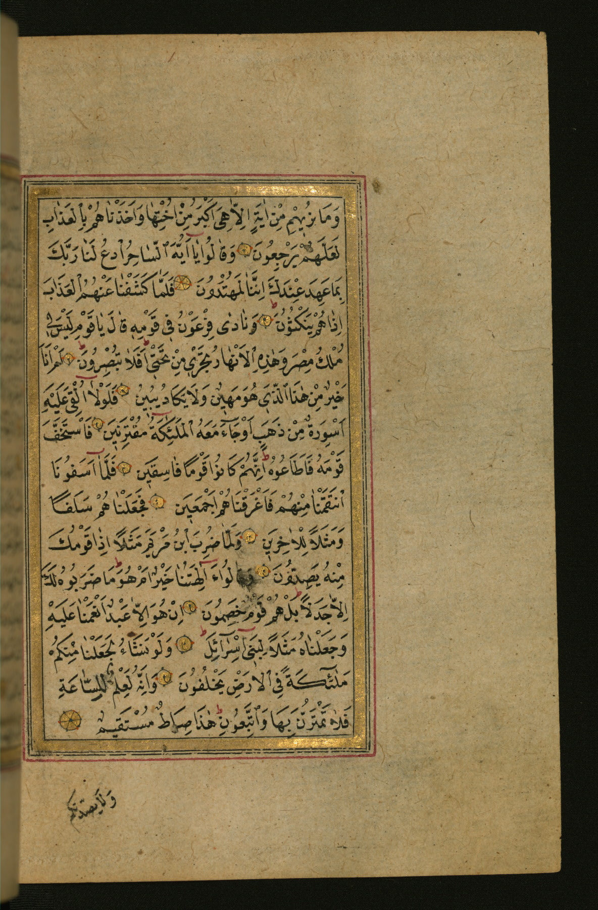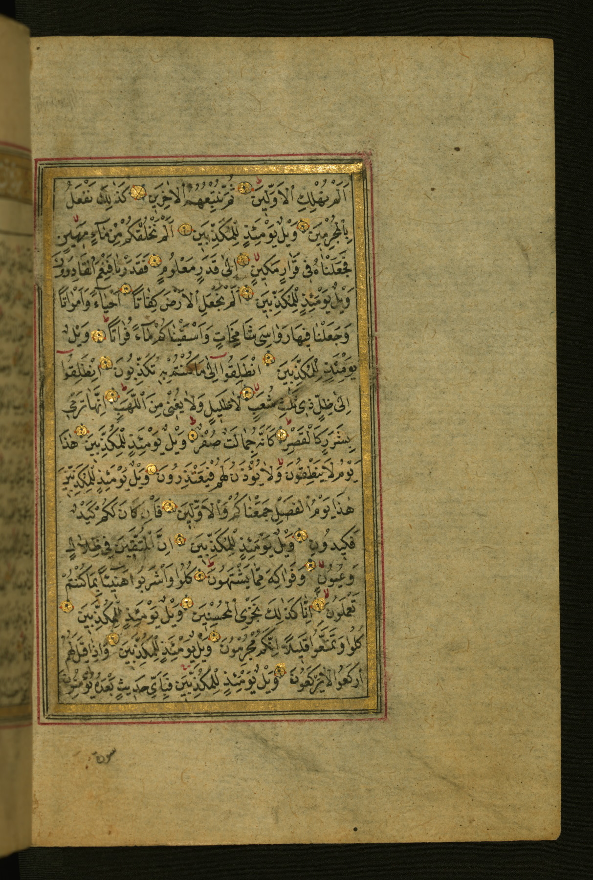 This small, illuminated single-volume copy of the Qurʾan was produced in Ottoman Turkey in 1282 AH / 1865-6 CE by Muḥammad ibn Muṣṭafá Izmīrī, a pupil of al-Rudūsī. The colophon in ijāzah script indicates that the present codex is the twenty-first copy executed by him (fol. 304b). The manuscript opens with an illuminated double-page incipit with the verses of chapters 1 (Sūrat al-fātiḥah) and 2 (Sūrat al-baqarah) (fols. 1b-2a). The text is written in naskh script in black ink with reading marks in red. Verses are separated by illuminated discs with colored dots and chapter headings are in riqāʿ script in white ink. Polychrome medallions in the margins indicate textual divisions and prostration. The binding of black leather is contemporary with the manuscript and decorated with a tooled and gold-painted geometric design enclosed by gold frames on the upper and lower boards.
