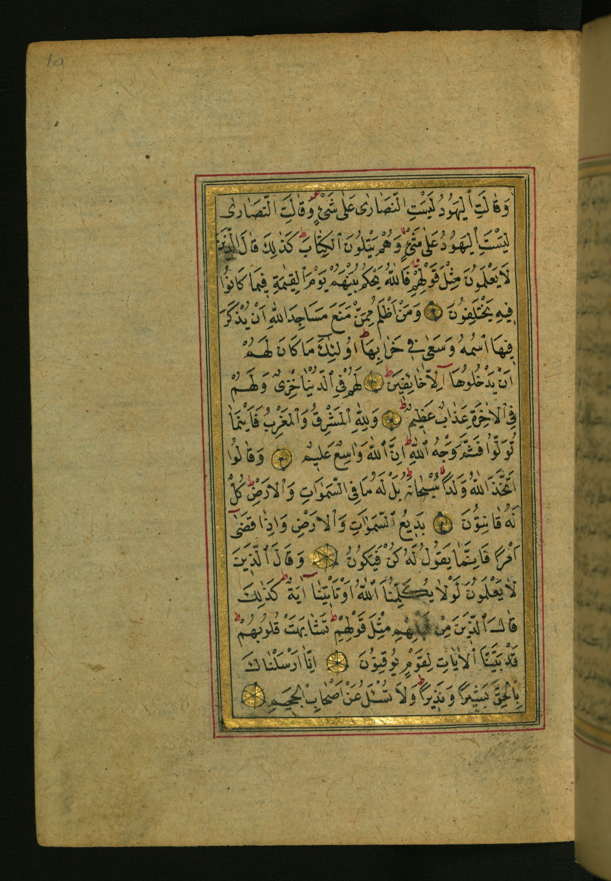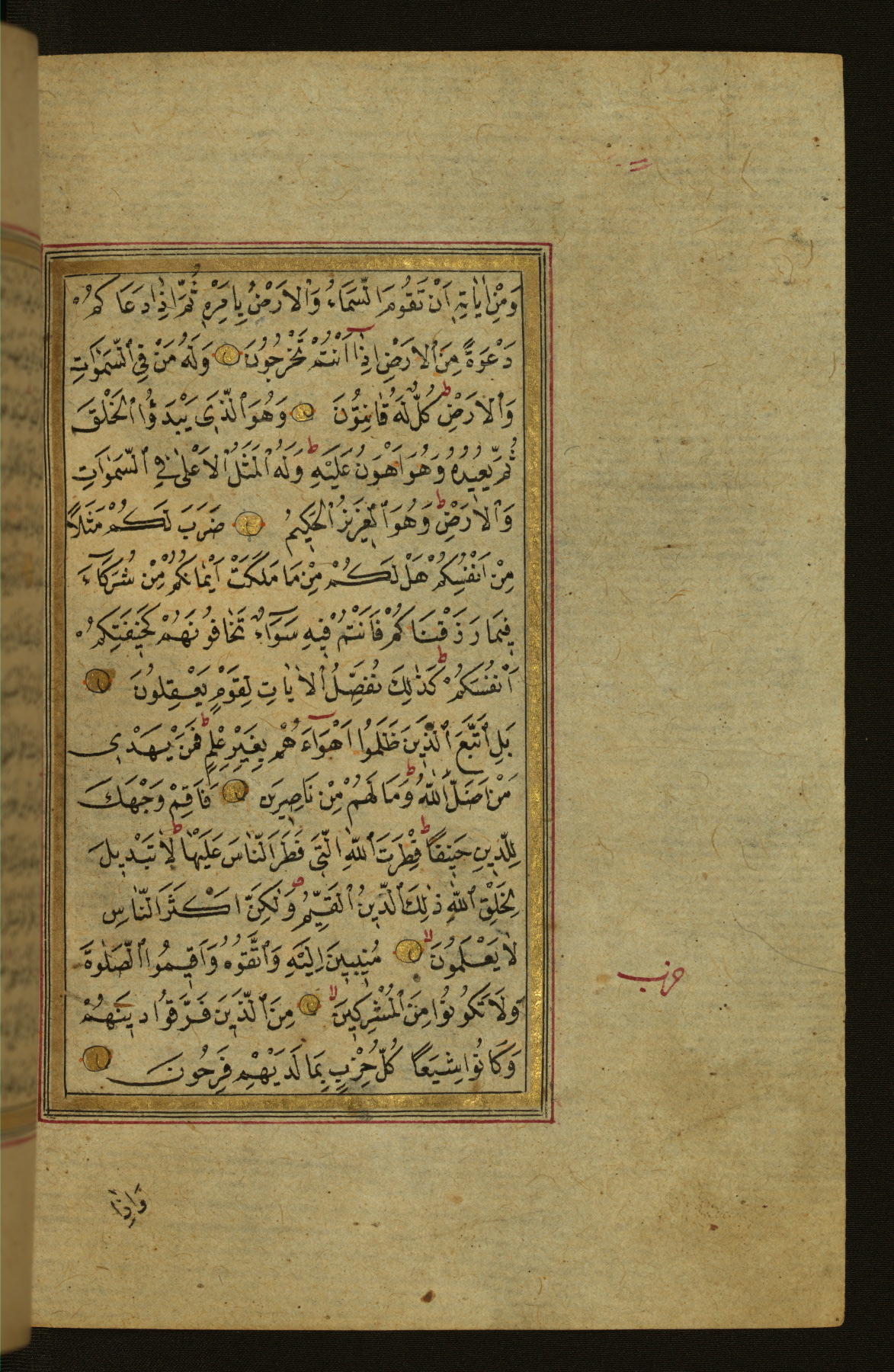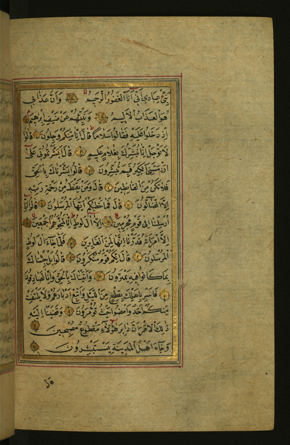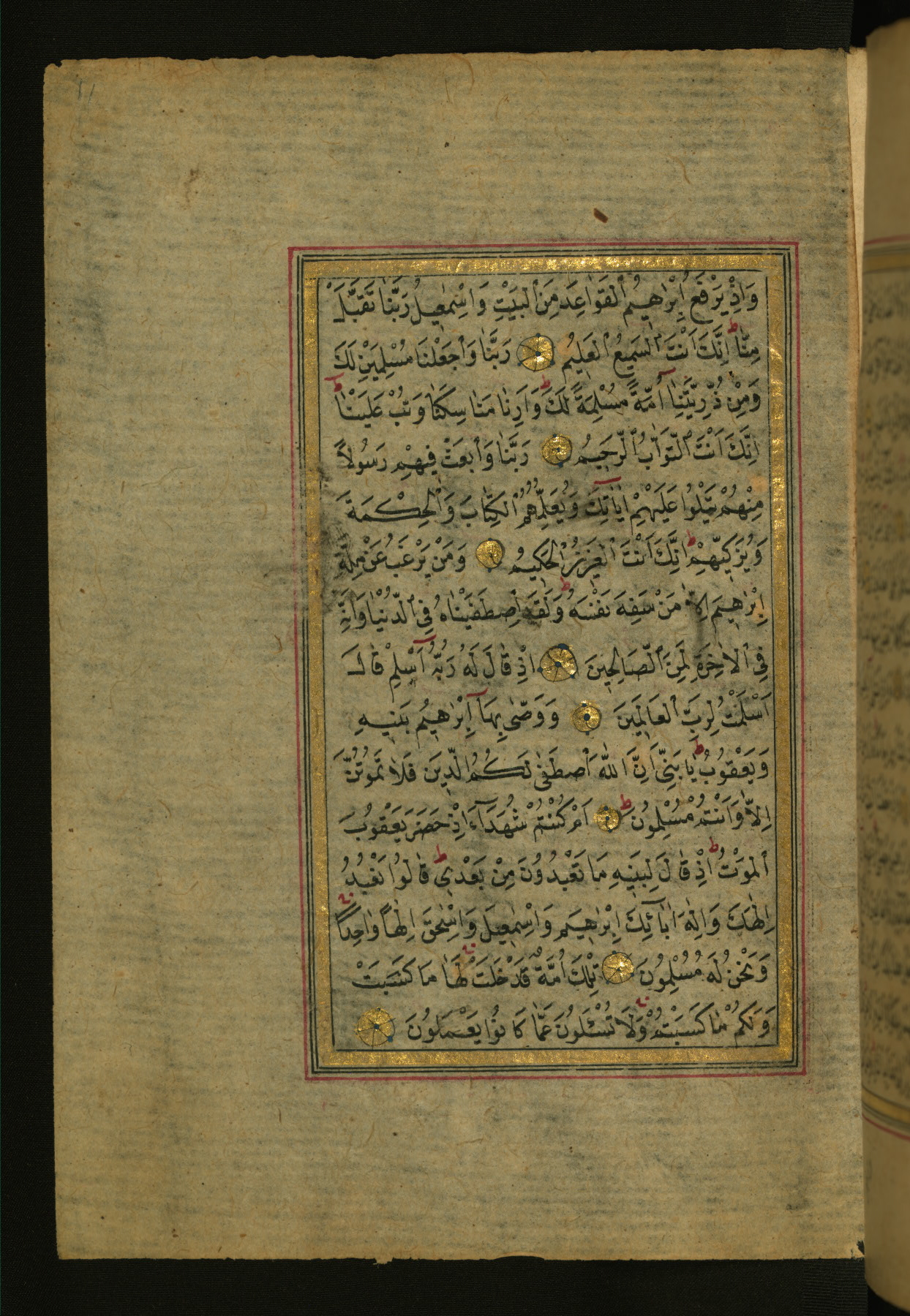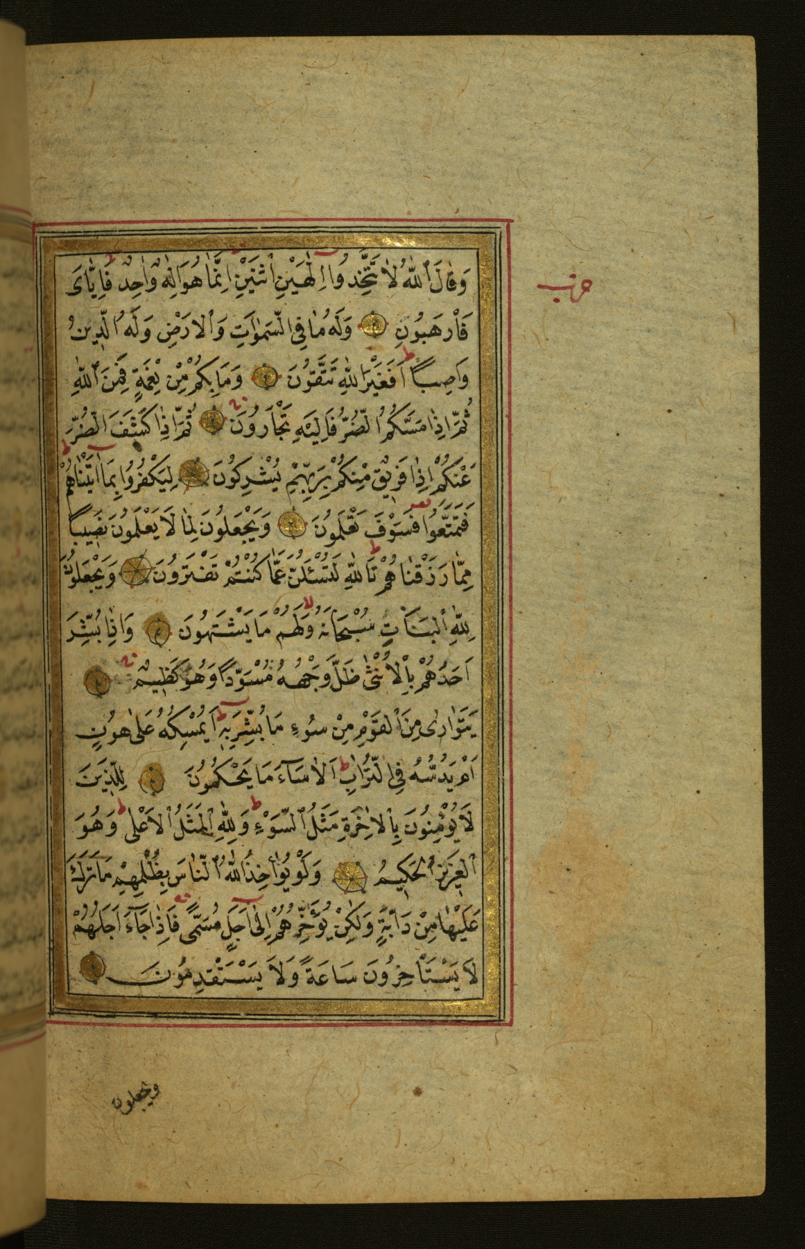 This small, illuminated single-volume copy of the Qurʾan was produced in Ottoman Turkey in 1282 AH / 1865-6 CE by Muḥammad ibn Muṣṭafá Izmīrī, a pupil of al-Rudūsī. The colophon in ijāzah script indicates that the present codex is the twenty-first copy executed by him (fol. 304b). The manuscript opens with an illuminated double-page incipit with the verses of chapters 1 (Sūrat al-fātiḥah) and 2 (Sūrat al-baqarah) (fols. 1b-2a). The text is written in naskh script in black ink with reading marks in red. Verses are separated by illuminated discs with colored dots and chapter headings are in riqāʿ script in white ink. Polychrome medallions in the margins indicate textual divisions and prostration. The binding of black leather is contemporary with the manuscript and decorated with a tooled and gold-painted geometric design enclosed by gold frames on the upper and lower boards.