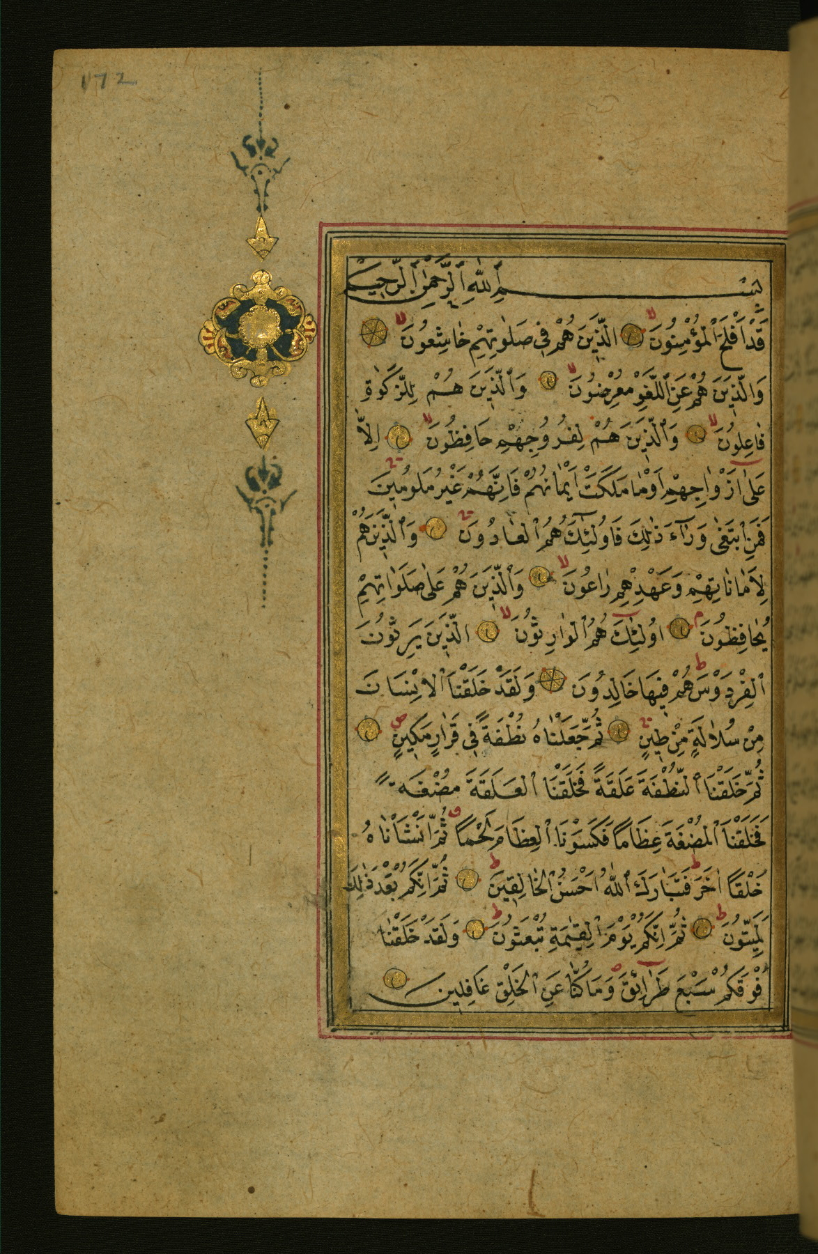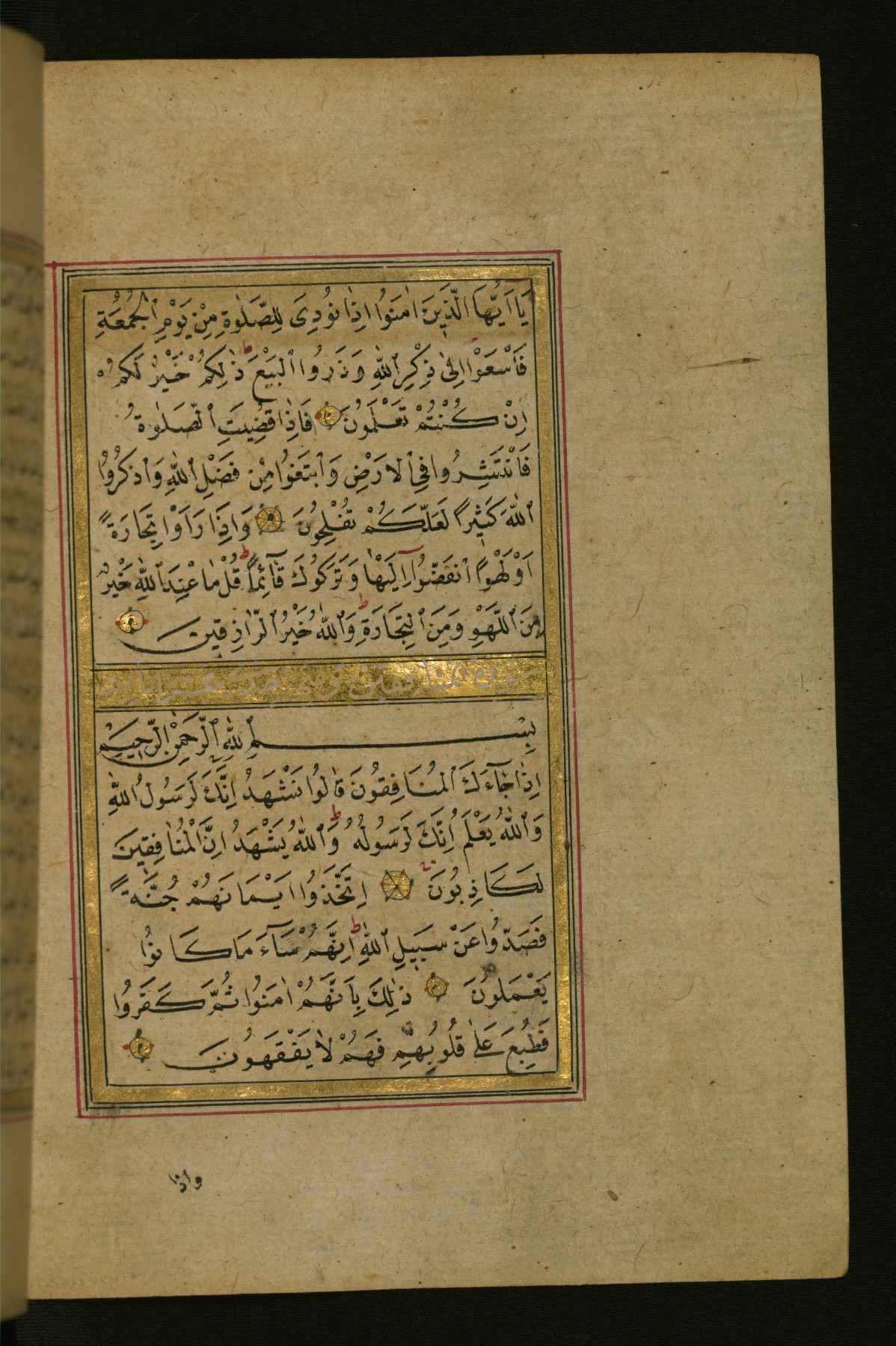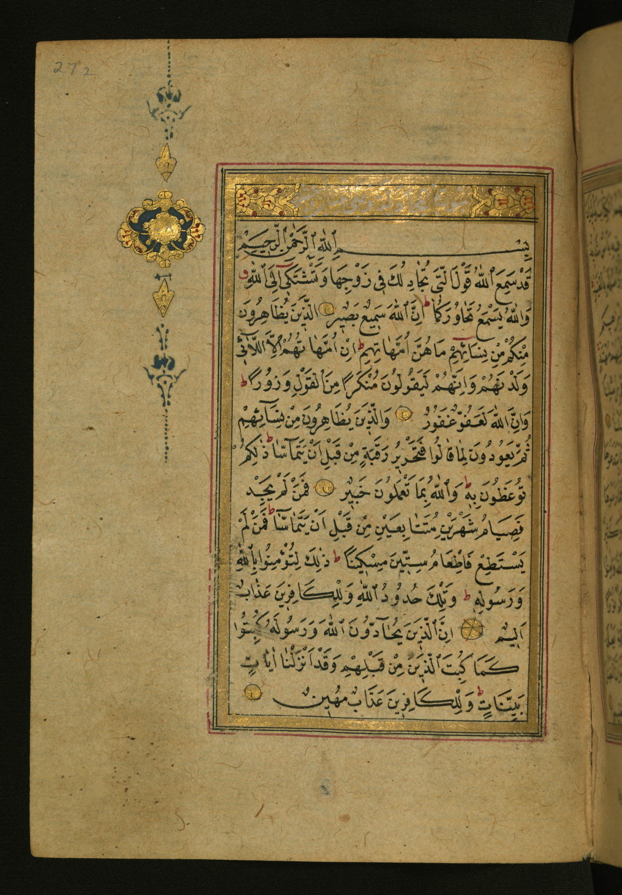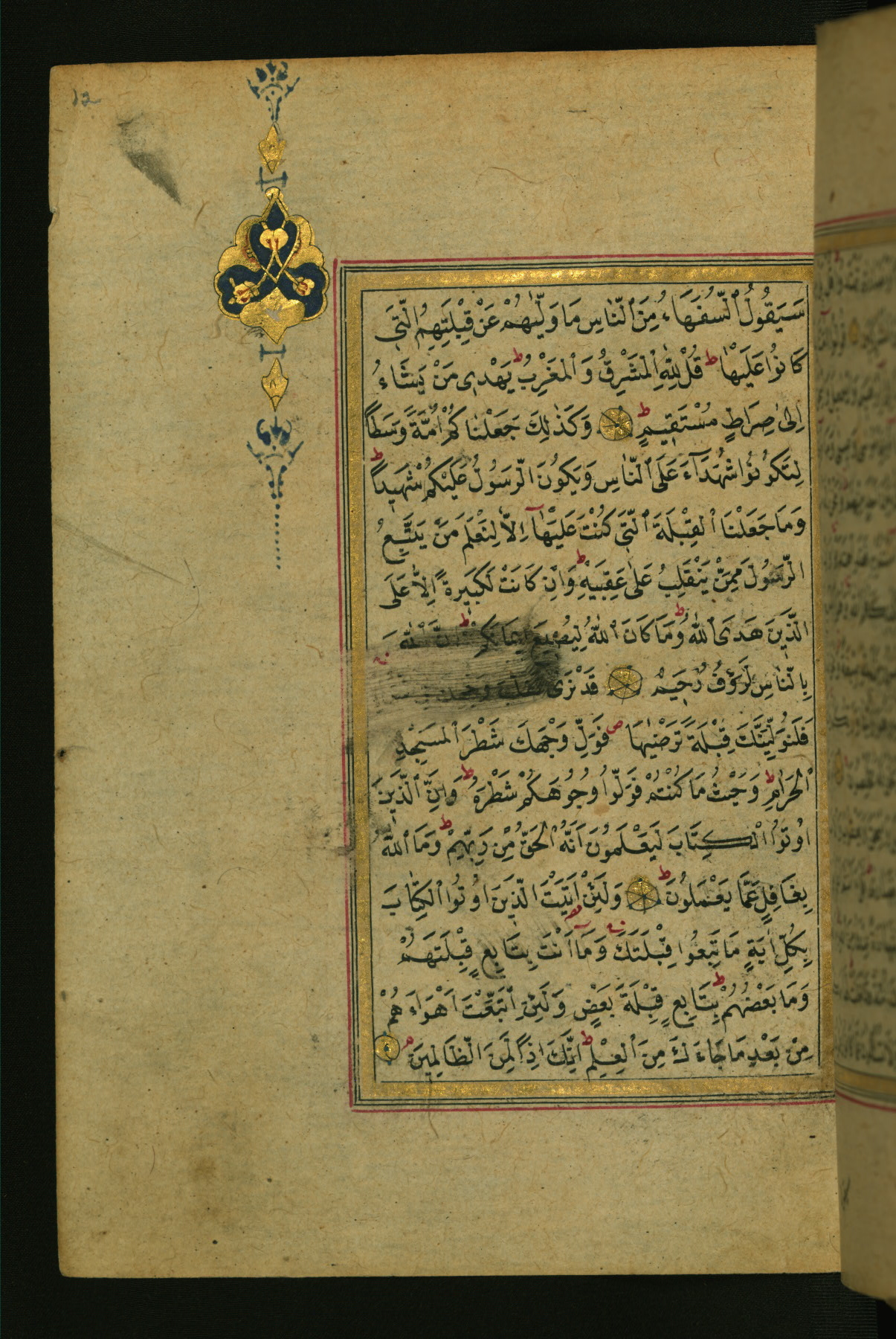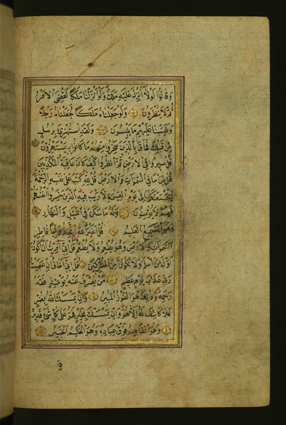 This small, illuminated single-volume copy of the Qurʾan was produced in Ottoman Turkey in 1282 AH / 1865-6 CE by Muḥammad ibn Muṣṭafá Izmīrī, a pupil of al-Rudūsī. The colophon in ijāzah script indicates that the present codex is the twenty-first copy executed by him (fol. 304b). The manuscript opens with an illuminated double-page incipit with the verses of chapters 1 (Sūrat al-fātiḥah) and 2 (Sūrat al-baqarah) (fols. 1b-2a). The text is written in naskh script in black ink with reading marks in red. Verses are separated by illuminated discs with colored dots and chapter headings are in riqāʿ script in white ink. Polychrome medallions in the margins indicate textual divisions and prostration. The binding of black leather is contemporary with the manuscript and decorated with a tooled and gold-painted geometric design enclosed by gold frames on the upper and lower boards.