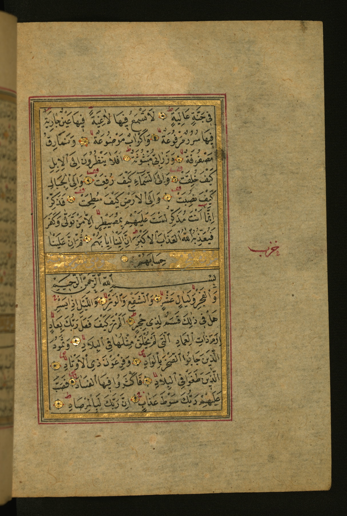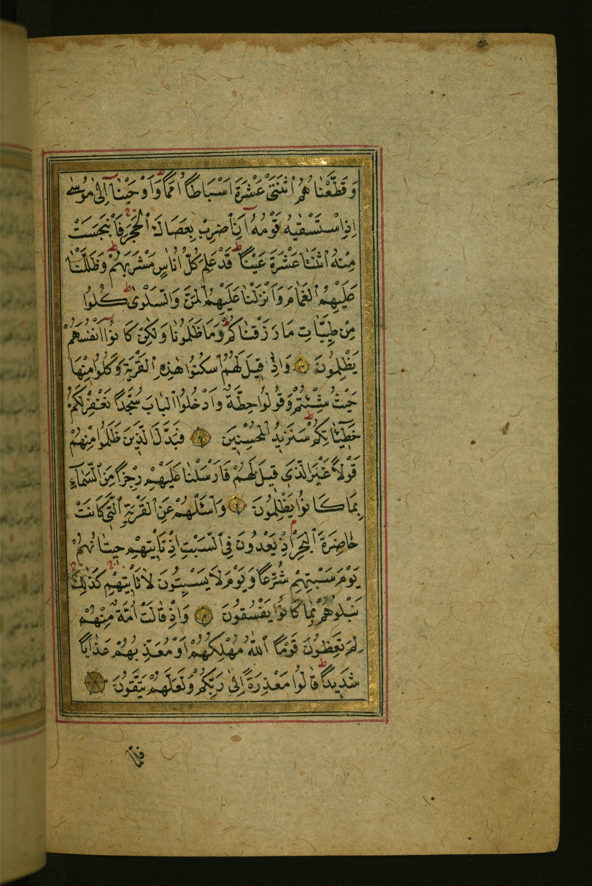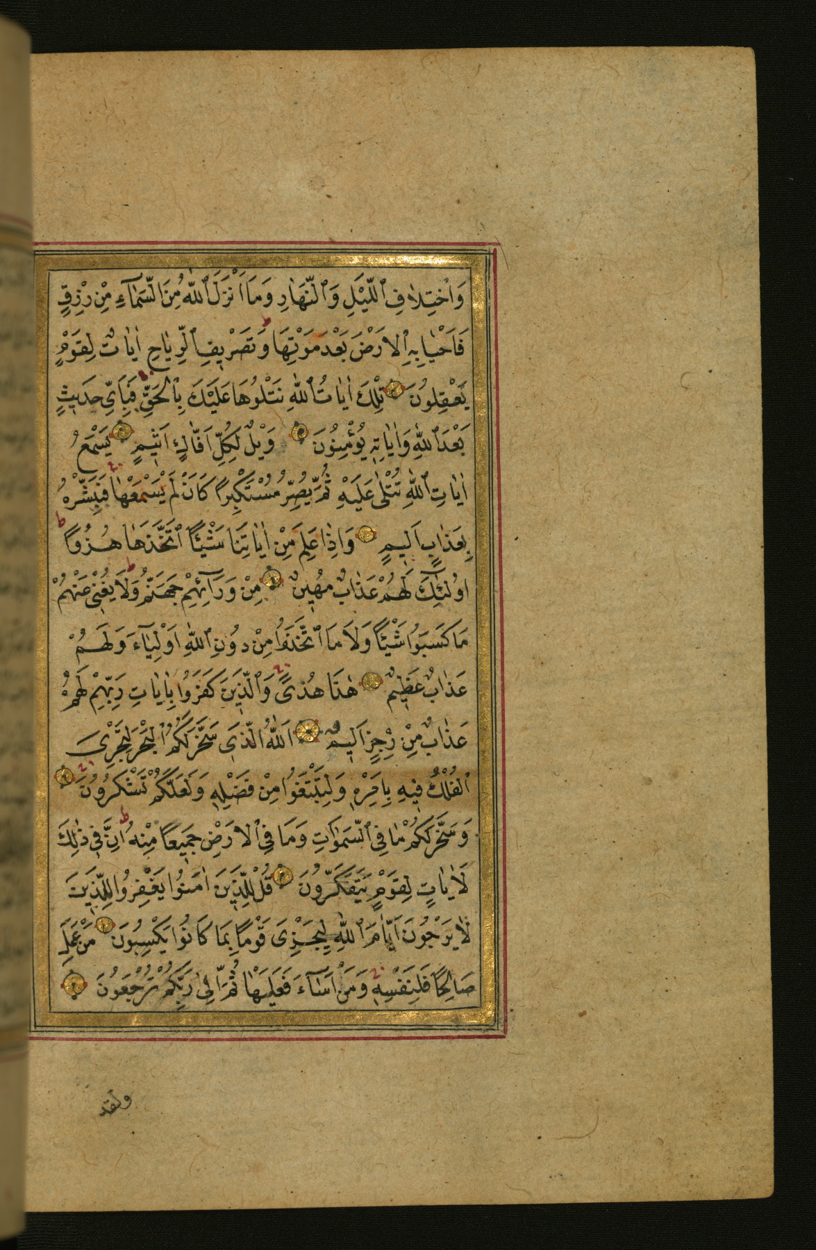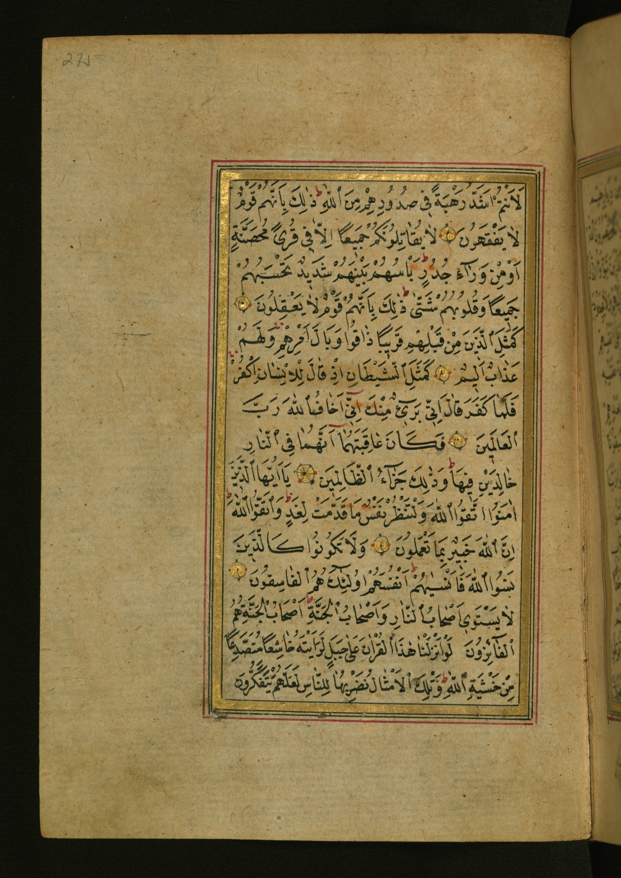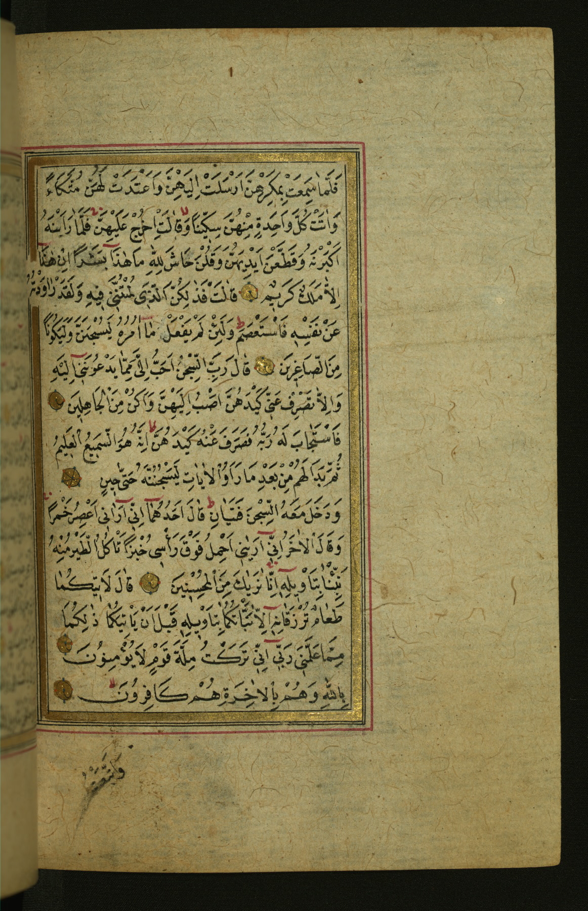 This small, illuminated single-volume copy of the Qurʾan was produced in Ottoman Turkey in 1282 AH / 1865-6 CE by Muḥammad ibn Muṣṭafá Izmīrī, a pupil of al-Rudūsī. The colophon in ijāzah script indicates that the present codex is the twenty-first copy executed by him (fol. 304b). The manuscript opens with an illuminated double-page incipit with the verses of chapters 1 (Sūrat al-fātiḥah) and 2 (Sūrat al-baqarah) (fols. 1b-2a). The text is written in naskh script in black ink with reading marks in red. Verses are separated by illuminated discs with colored dots and chapter headings are in riqāʿ script in white ink. Polychrome medallions in the margins indicate textual divisions and prostration. The binding of black leather is contemporary with the manuscript and decorated with a tooled and gold-painted geometric design enclosed by gold frames on the upper and lower boards.