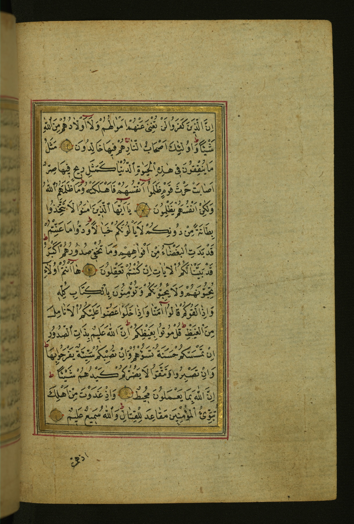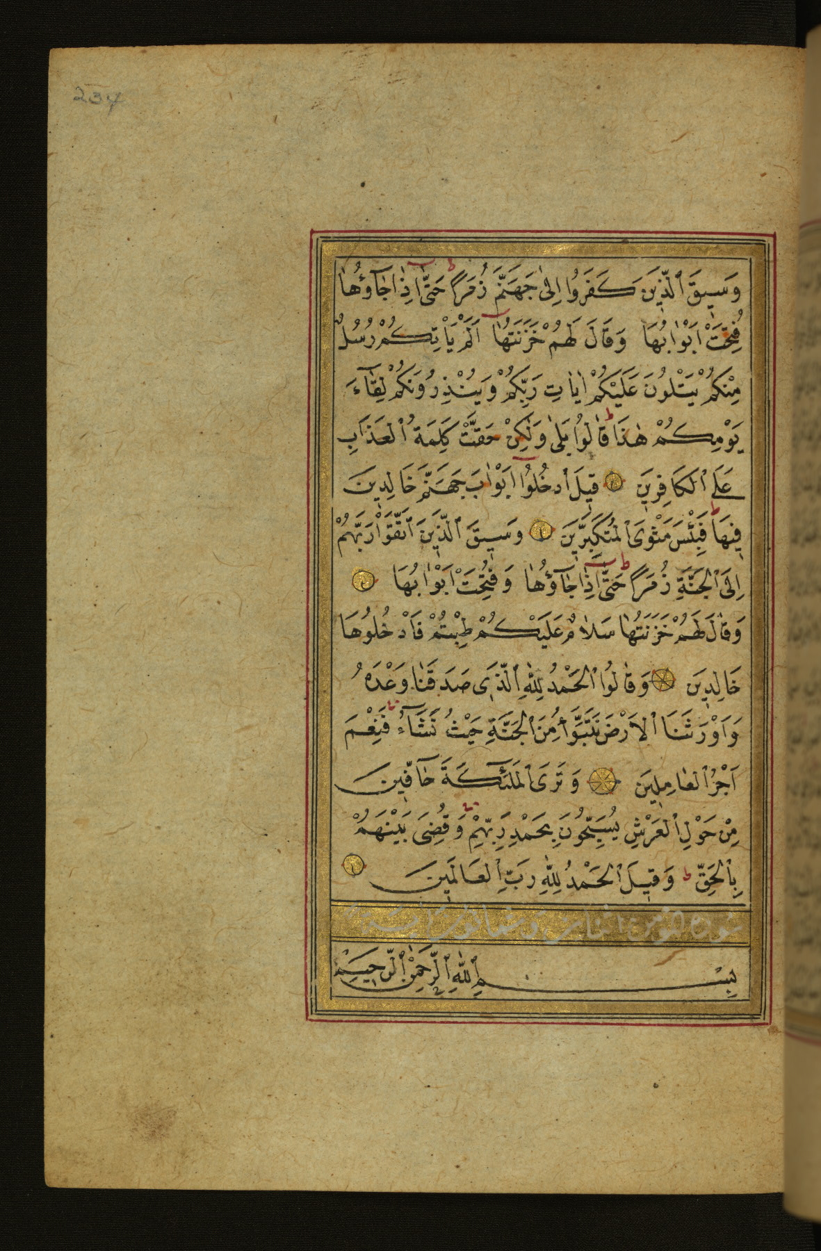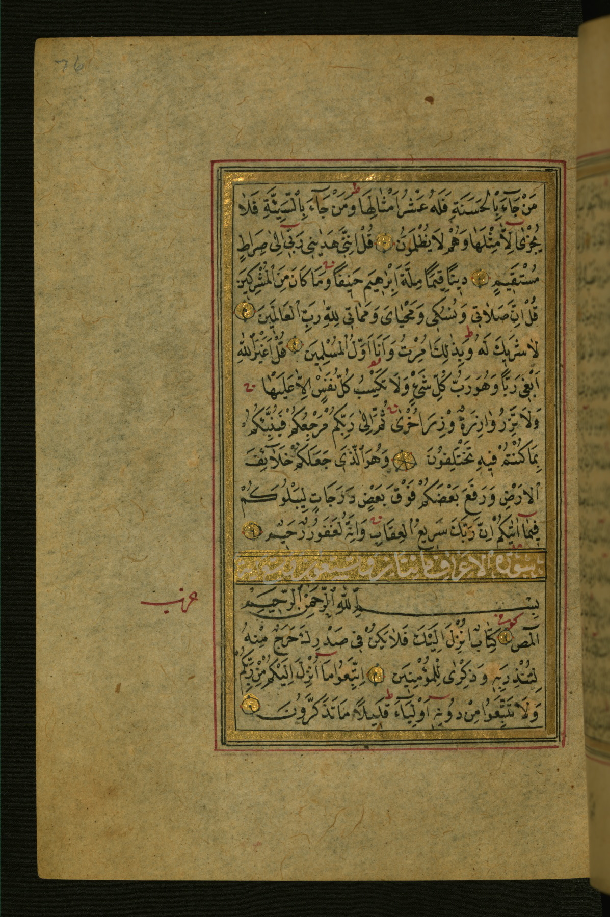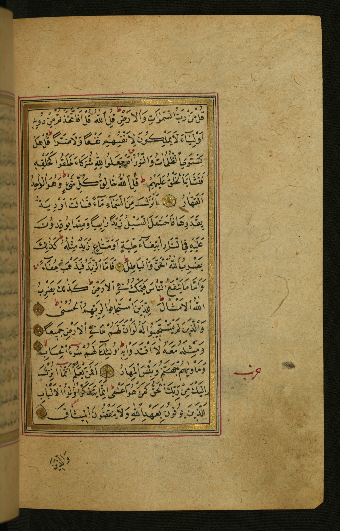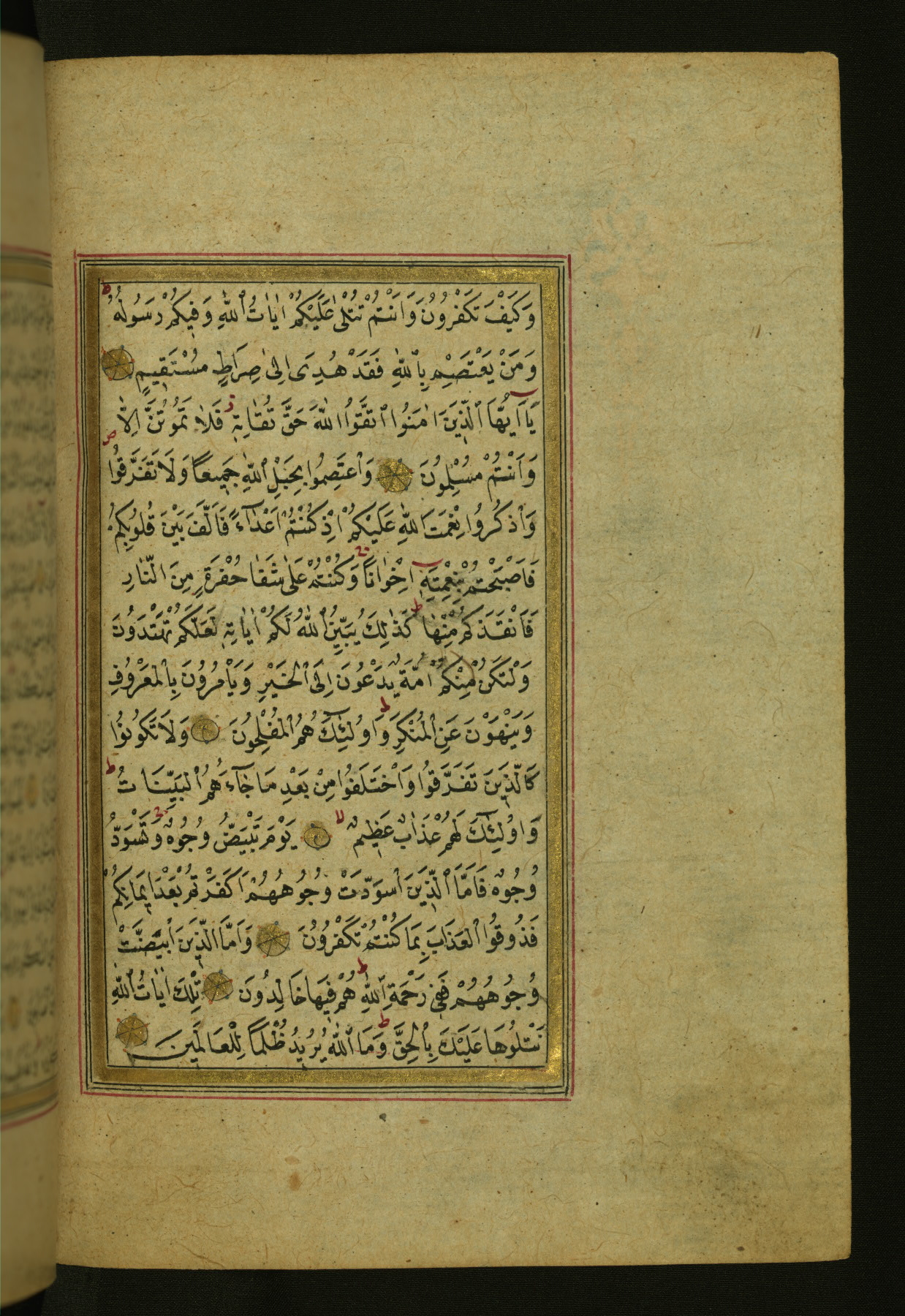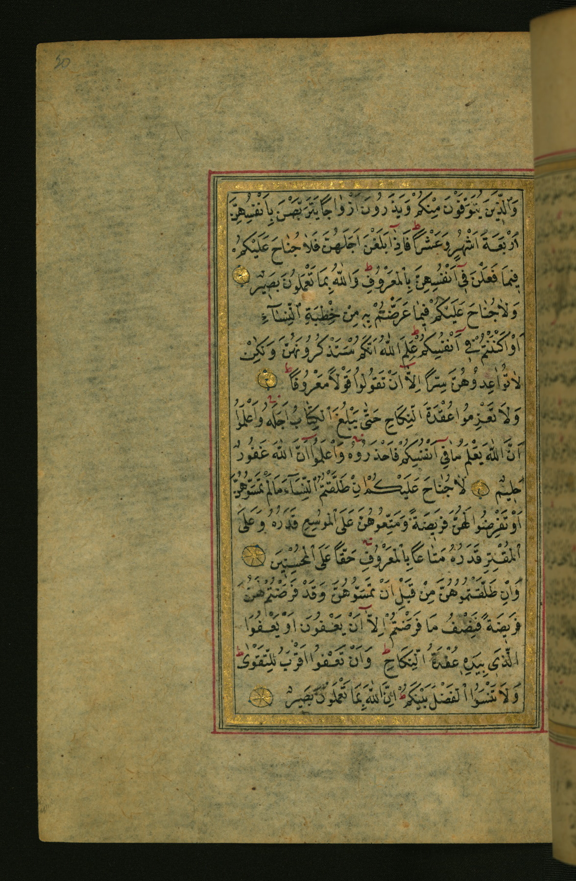 This small, illuminated single-volume copy of the Qurʾan was produced in Ottoman Turkey in 1282 AH / 1865-6 CE by Muḥammad ibn Muṣṭafá Izmīrī, a pupil of al-Rudūsī. The colophon in ijāzah script indicates that the present codex is the twenty-first copy executed by him (fol. 304b). The manuscript opens with an illuminated double-page incipit with the verses of chapters 1 (Sūrat al-fātiḥah) and 2 (Sūrat al-baqarah) (fols. 1b-2a). The text is written in naskh script in black ink with reading marks in red. Verses are separated by illuminated discs with colored dots and chapter headings are in riqāʿ script in white ink. Polychrome medallions in the margins indicate textual divisions and prostration. The binding of black leather is contemporary with the manuscript and decorated with a tooled and gold-painted geometric design enclosed by gold frames on the upper and lower boards.
