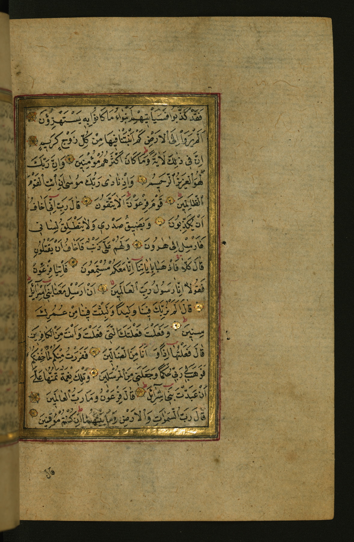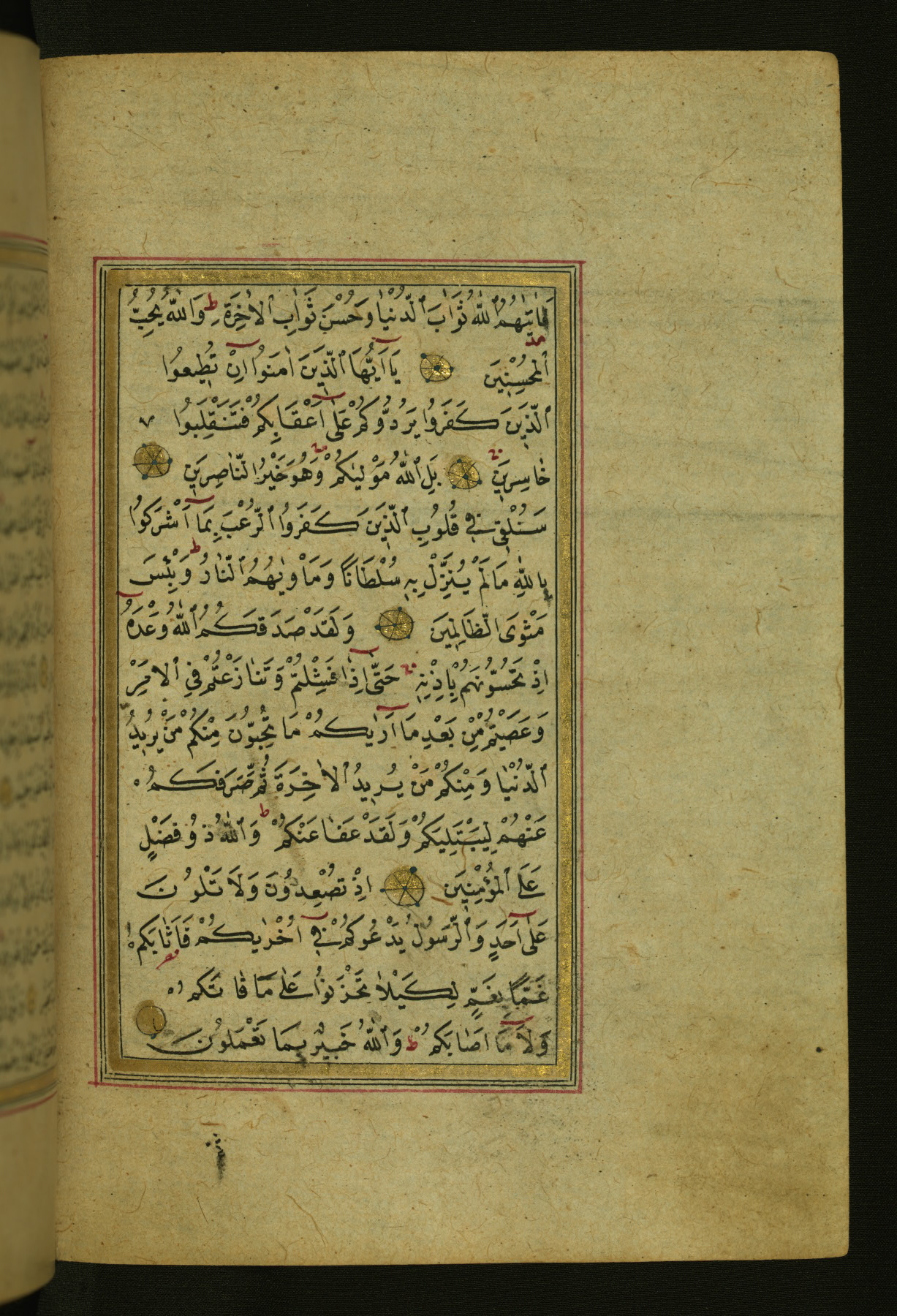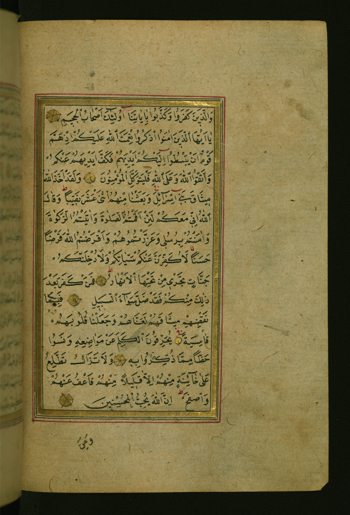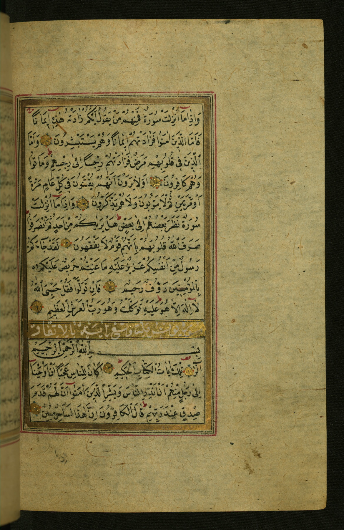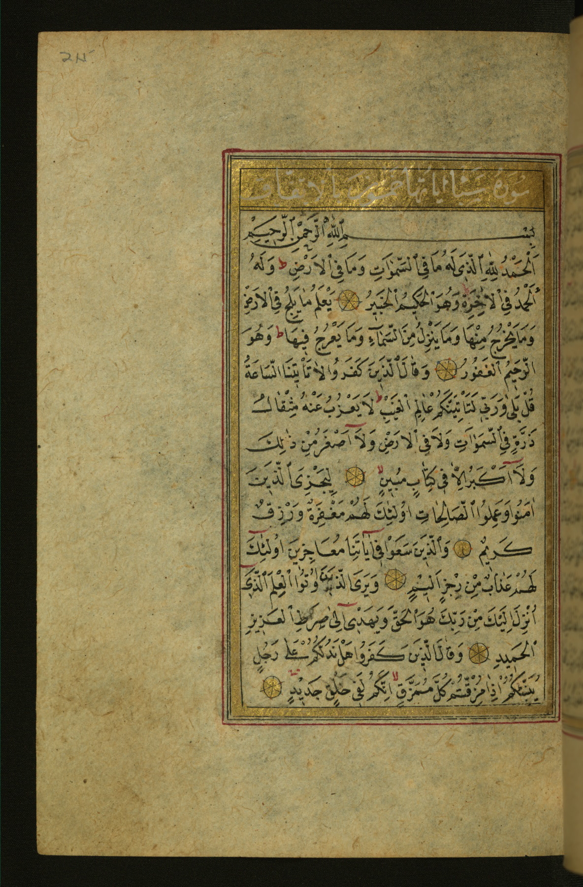 This small, illuminated single-volume copy of the Qurʾan was produced in Ottoman Turkey in 1282 AH / 1865-6 CE by Muḥammad ibn Muṣṭafá Izmīrī, a pupil of al-Rudūsī. The colophon in ijāzah script indicates that the present codex is the twenty-first copy executed by him (fol. 304b). The manuscript opens with an illuminated double-page incipit with the verses of chapters 1 (Sūrat al-fātiḥah) and 2 (Sūrat al-baqarah) (fols. 1b-2a). The text is written in naskh script in black ink with reading marks in red. Verses are separated by illuminated discs with colored dots and chapter headings are in riqāʿ script in white ink. Polychrome medallions in the margins indicate textual divisions and prostration. The binding of black leather is contemporary with the manuscript and decorated with a tooled and gold-painted geometric design enclosed by gold frames on the upper and lower boards.