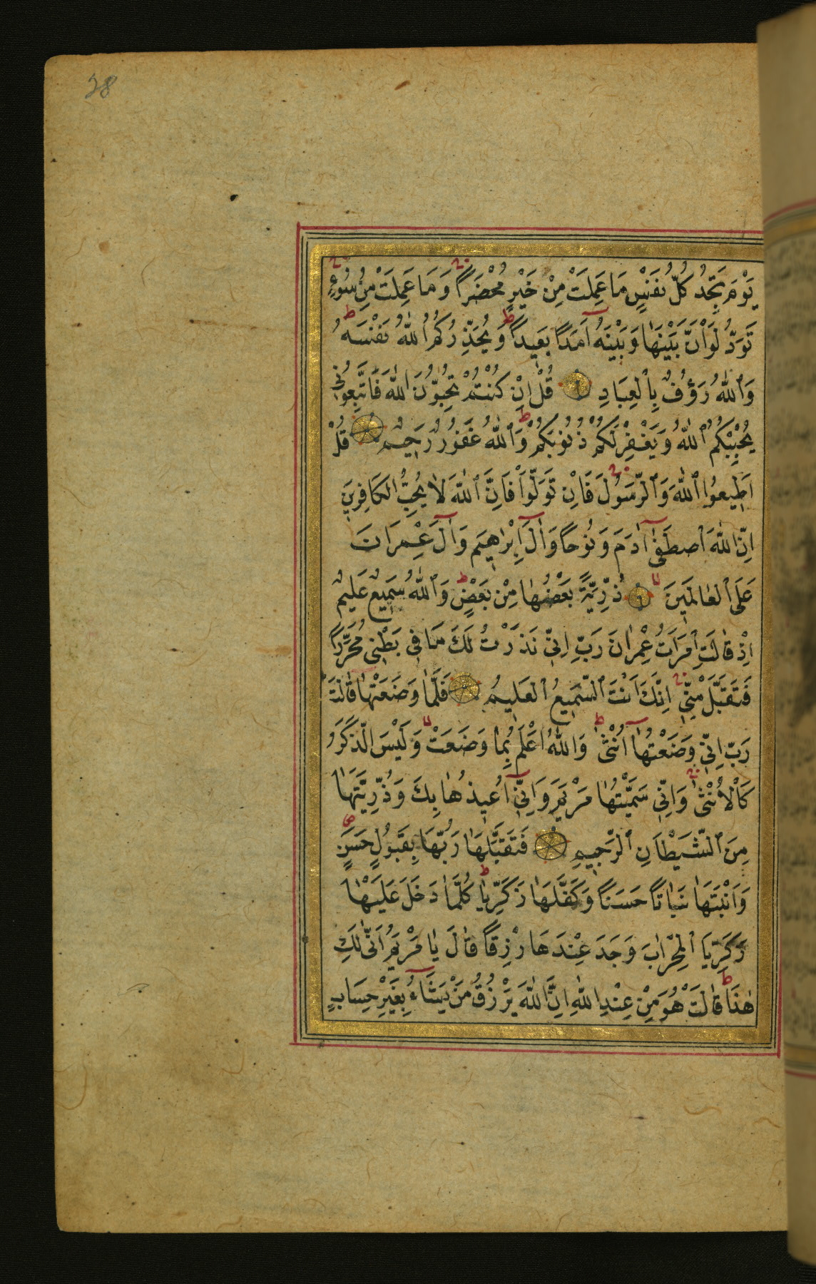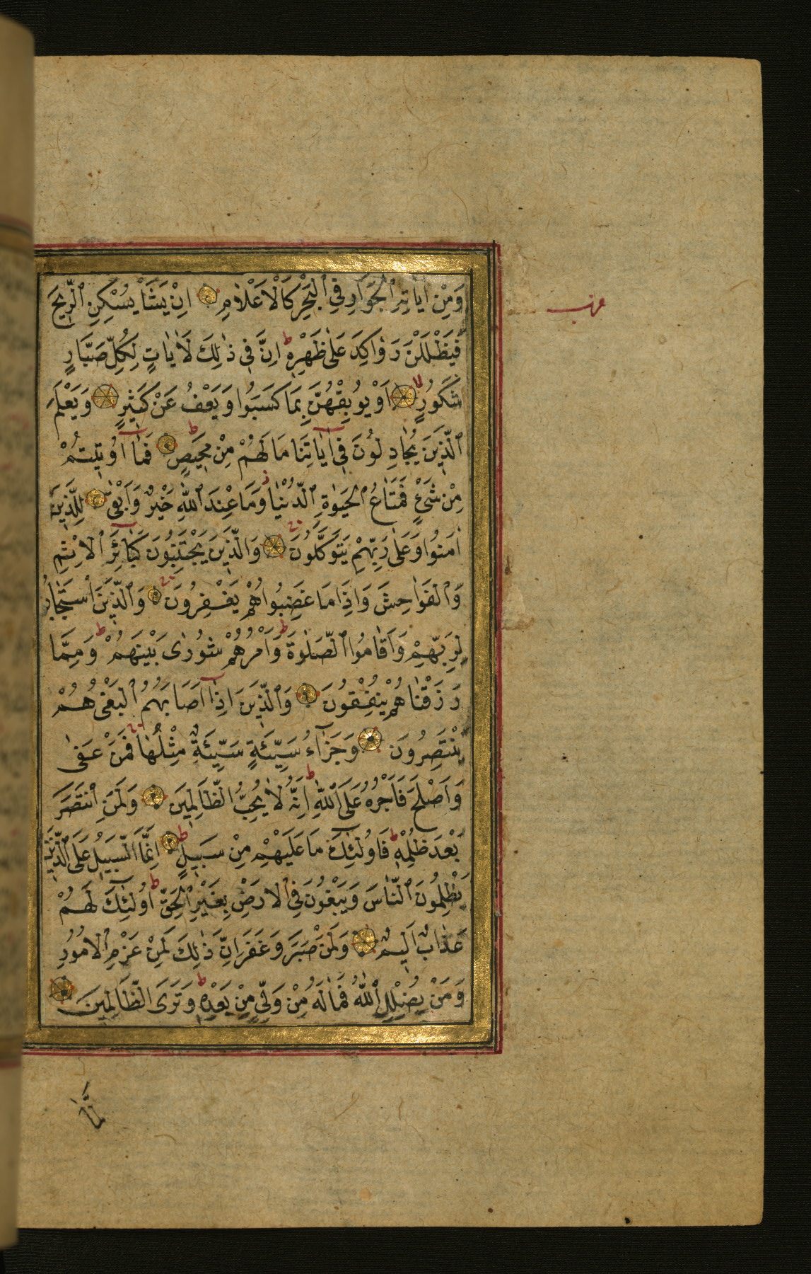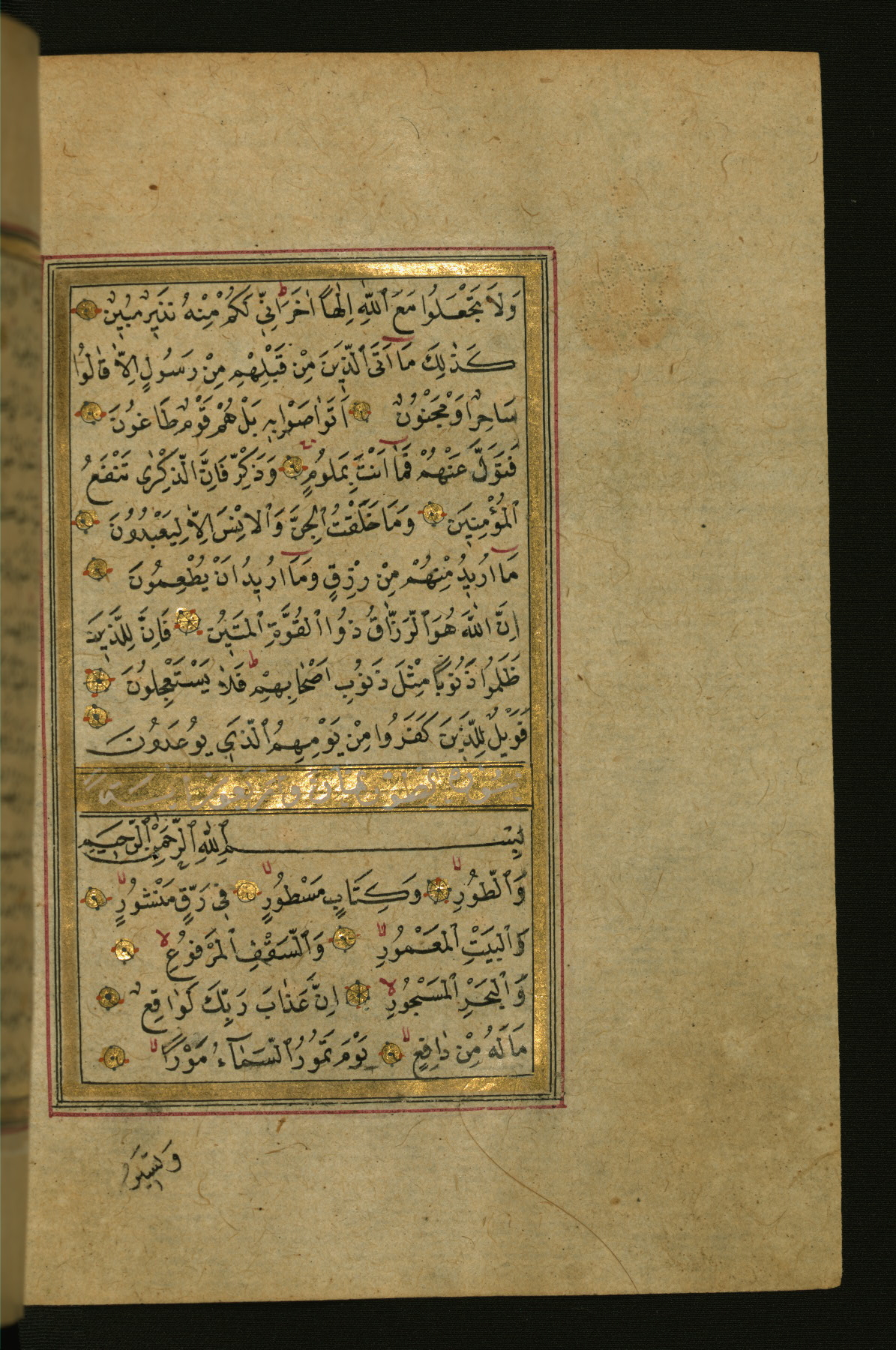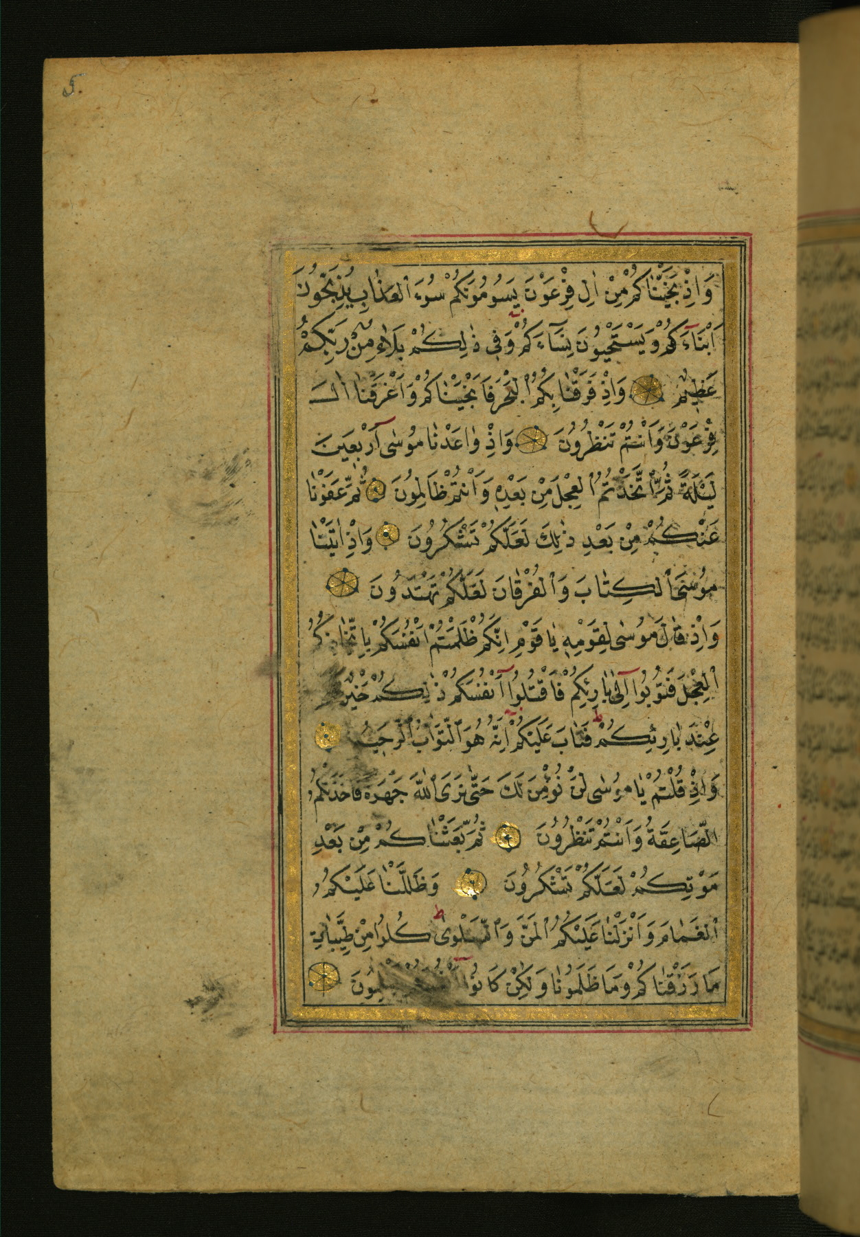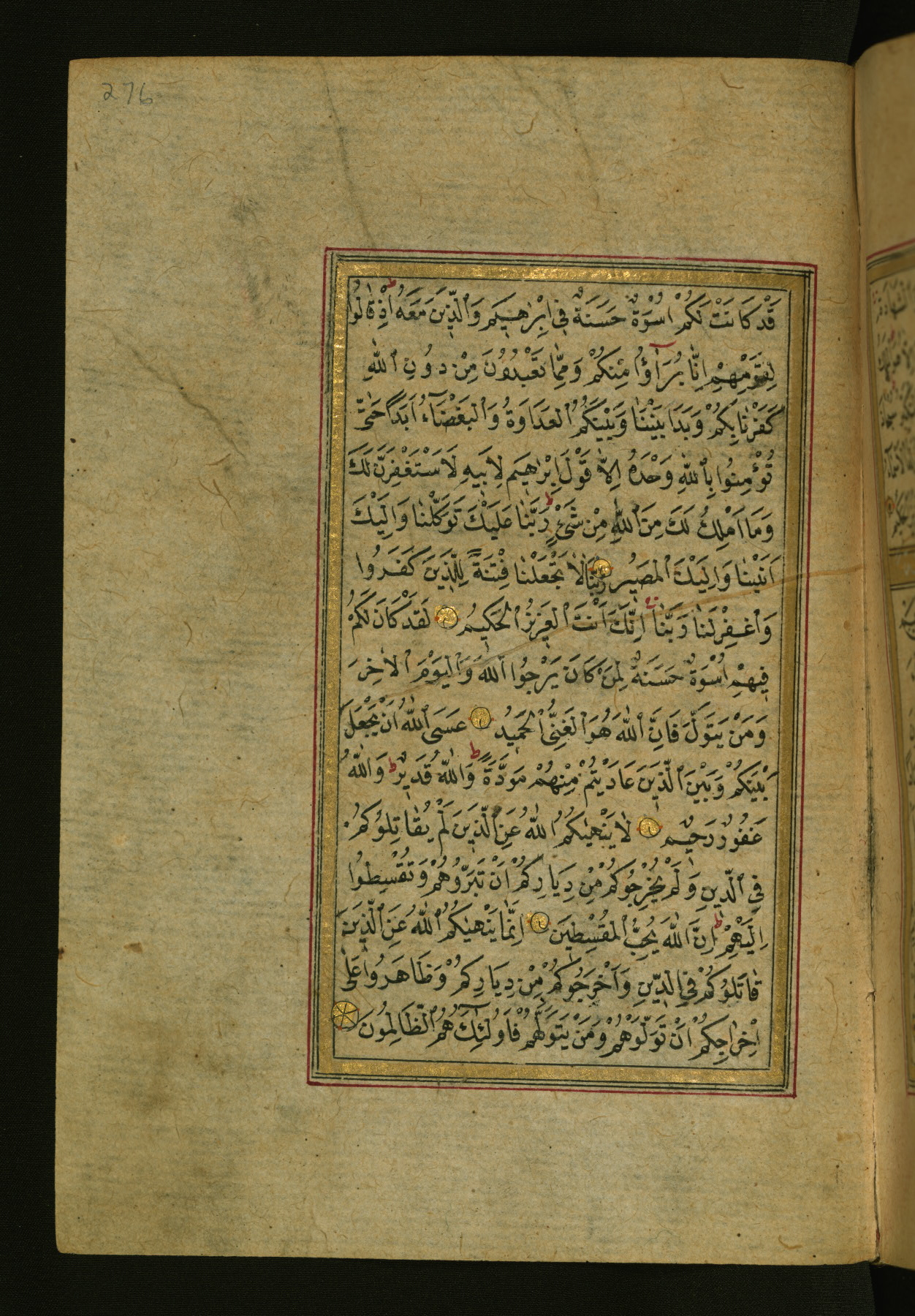This small, illuminated single-volume copy of the Qurʾan was produced in Ottoman Turkey in 1282 AH / 1865-6 CE by Muḥammad ibn Muṣṭafá Izmīrī, a pupil of al-Rudūsī. The colophon in ijāzah script indicates that the present codex is the twenty-first copy executed by him (fol. 304b). The manuscript opens with an illuminated double-page incipit with the verses of chapters 1 (Sūrat al-fātiḥah) and 2 (Sūrat al-baqarah) (fols. 1b-2a). The text is written in naskh script in black ink with reading marks in red. Verses are separated by illuminated discs with colored dots and chapter headings are in riqāʿ script in white ink. Polychrome medallions in the margins indicate textual divisions and prostration. The binding of black leather is contemporary with the manuscript and decorated with a tooled and gold-painted geometric design enclosed by gold frames on the upper and lower boards.