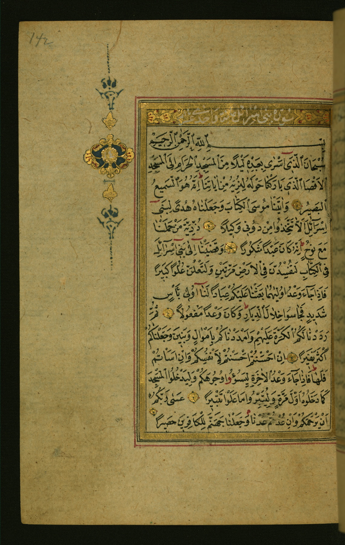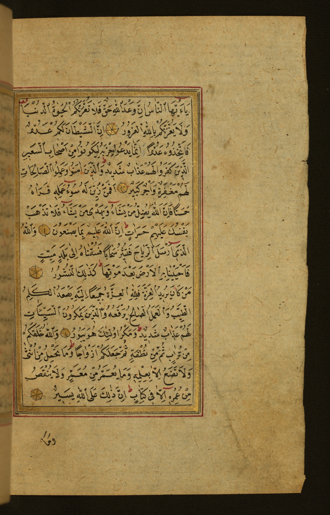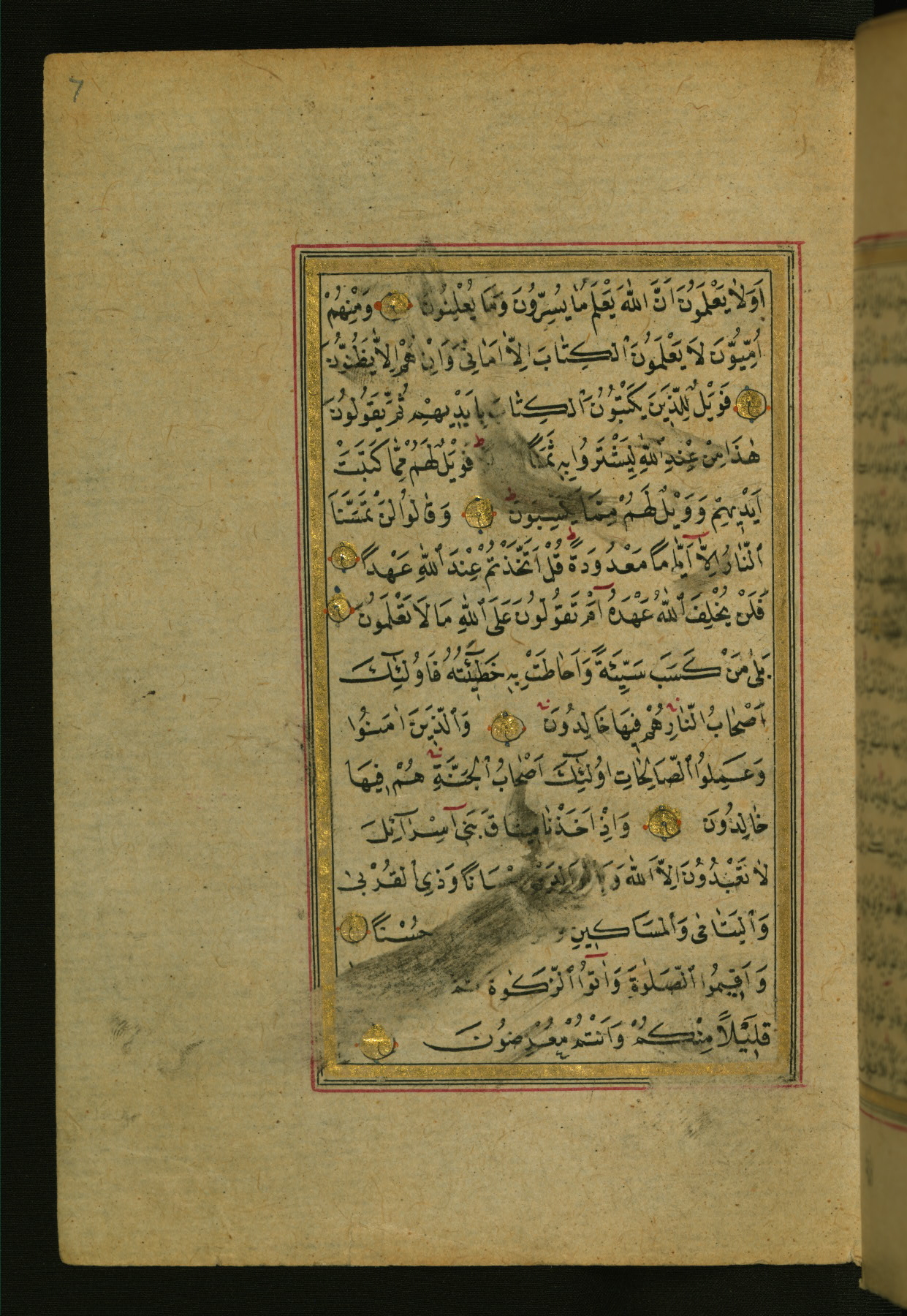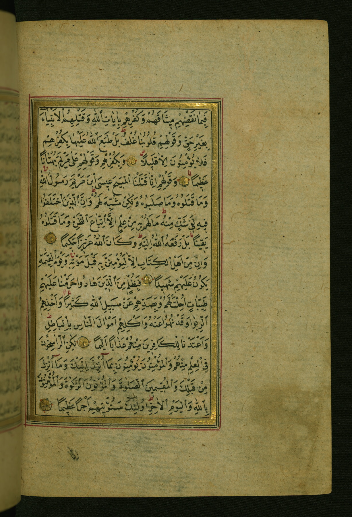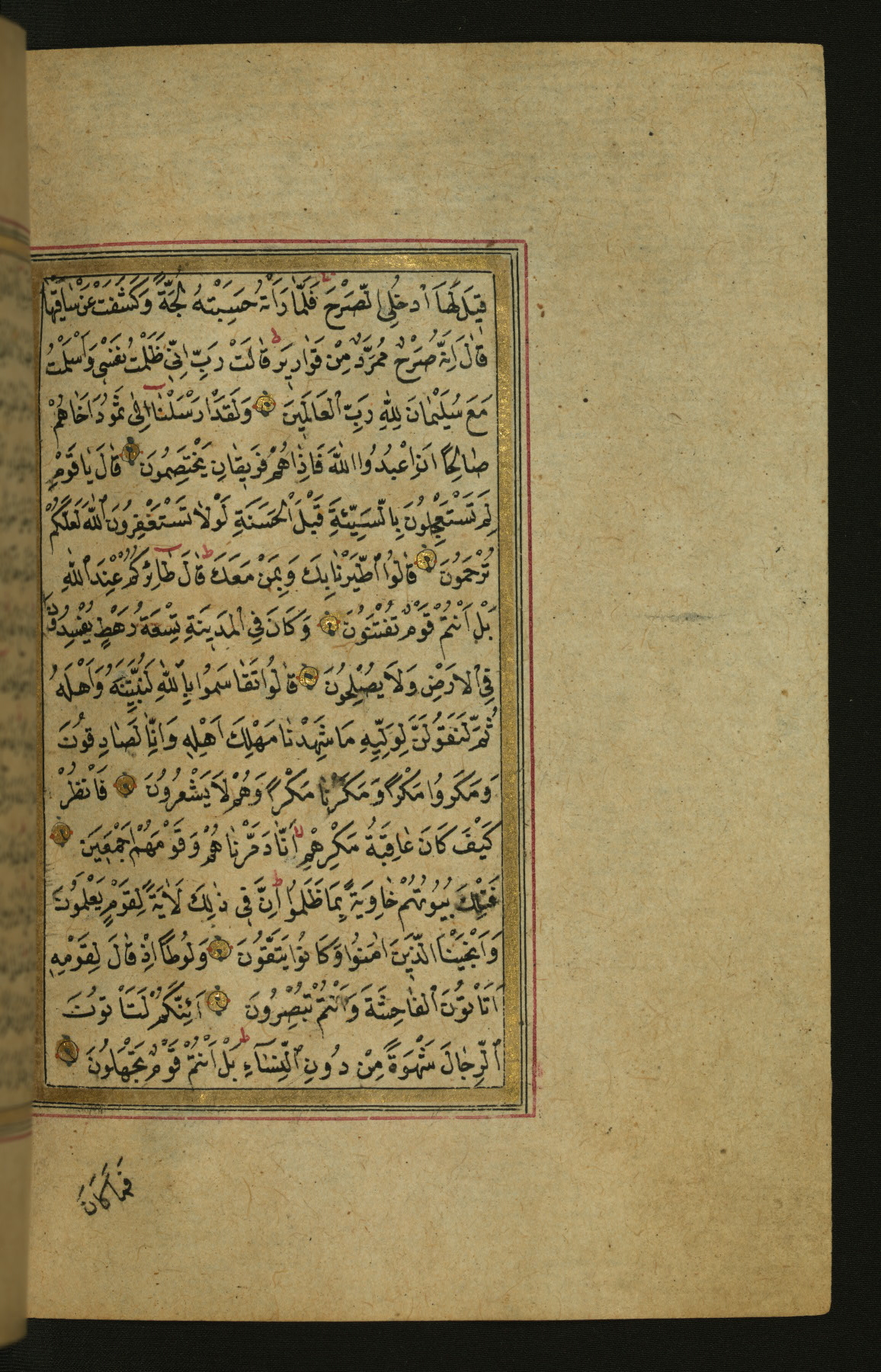 This small, illuminated single-volume copy of the Qurʾan was produced in Ottoman Turkey in 1282 AH / 1865-6 CE by Muḥammad ibn Muṣṭafá Izmīrī, a pupil of al-Rudūsī. The colophon in ijāzah script indicates that the present codex is the twenty-first copy executed by him (fol. 304b). The manuscript opens with an illuminated double-page incipit with the verses of chapters 1 (Sūrat al-fātiḥah) and 2 (Sūrat al-baqarah) (fols. 1b-2a). The text is written in naskh script in black ink with reading marks in red. Verses are separated by illuminated discs with colored dots and chapter headings are in riqāʿ script in white ink. Polychrome medallions in the margins indicate textual divisions and prostration. The binding of black leather is contemporary with the manuscript and decorated with a tooled and gold-painted geometric design enclosed by gold frames on the upper and lower boards.