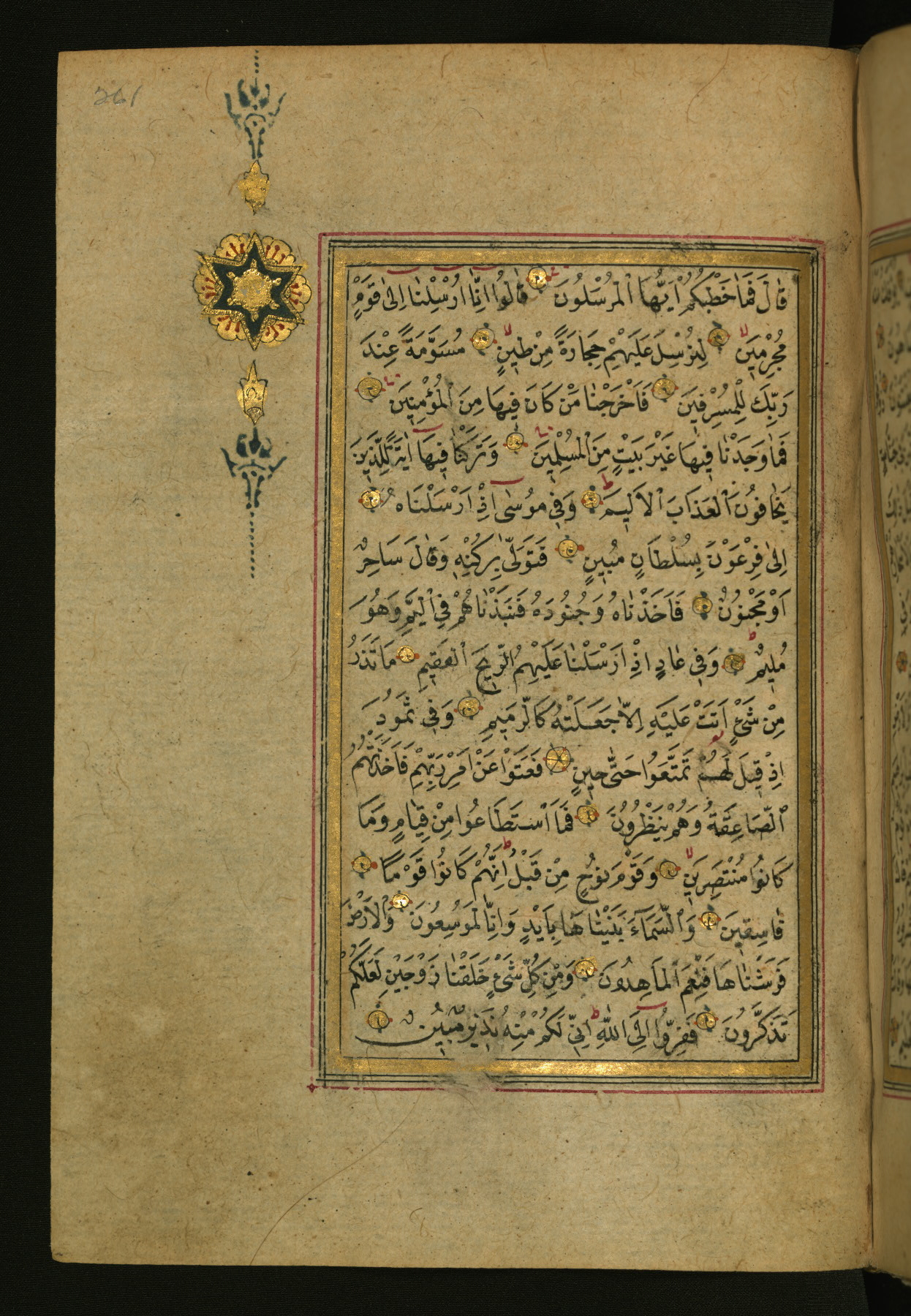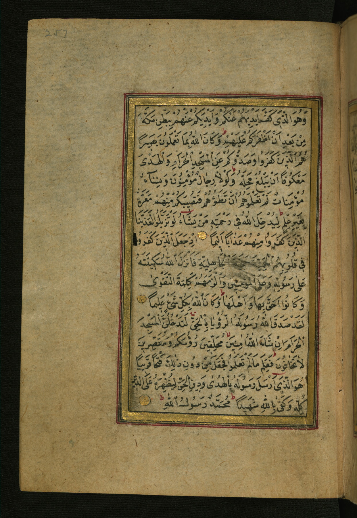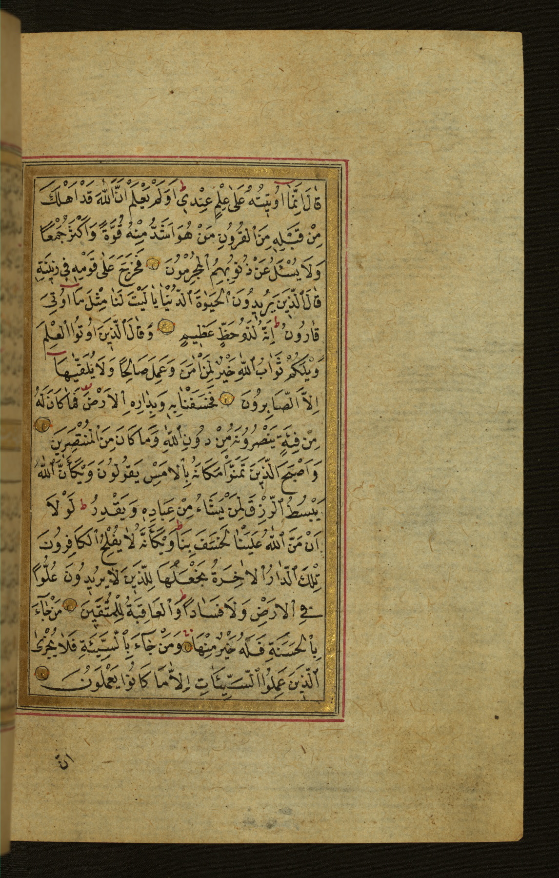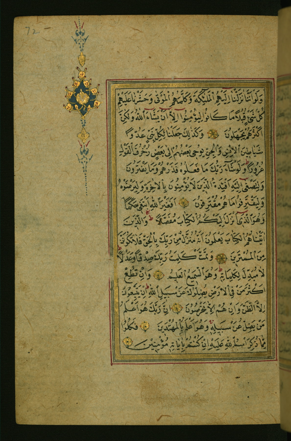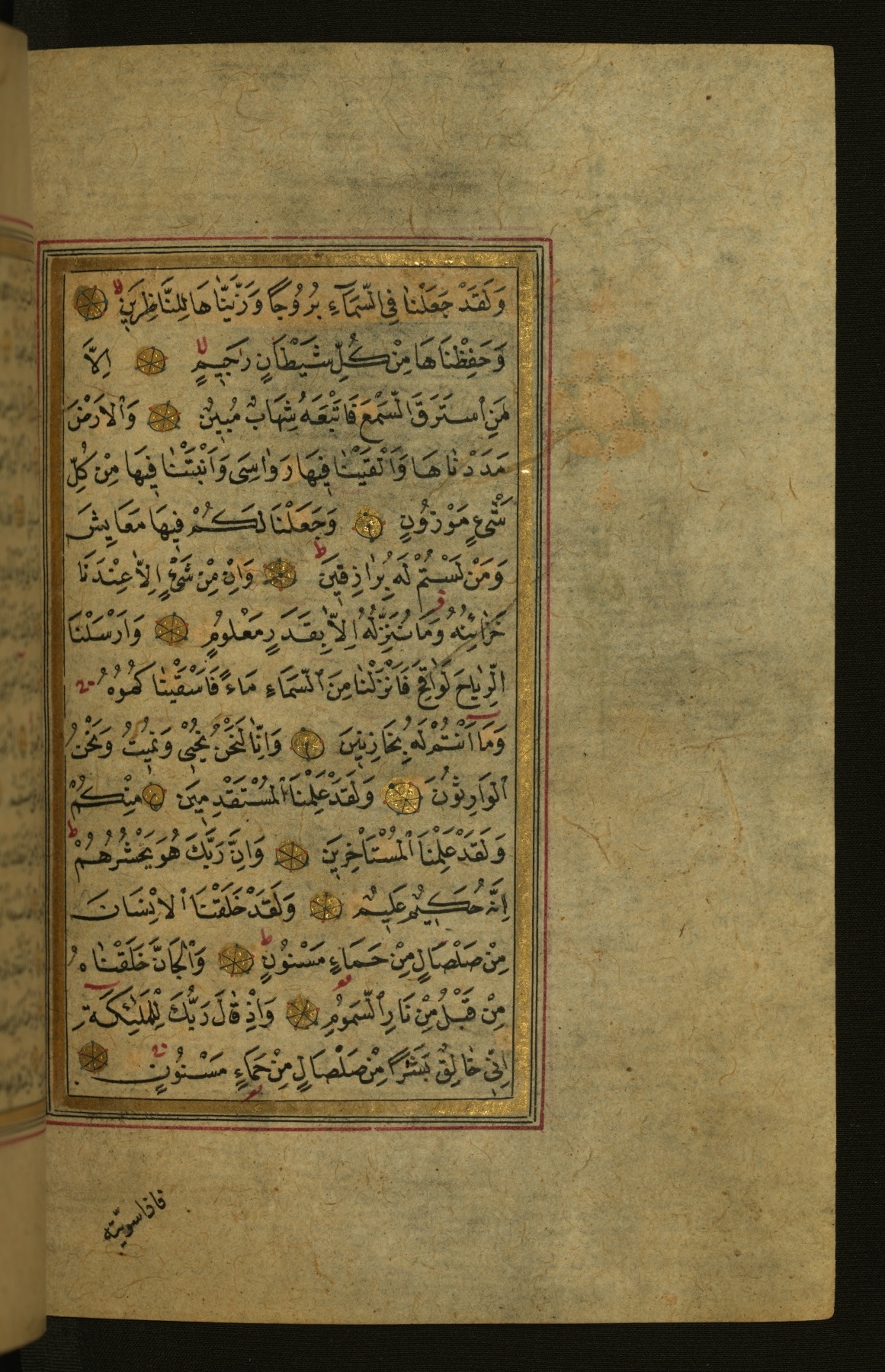 This small, illuminated single-volume copy of the Qurʾan was produced in Ottoman Turkey in 1282 AH / 1865-6 CE by Muḥammad ibn Muṣṭafá Izmīrī, a pupil of al-Rudūsī. The colophon in ijāzah script indicates that the present codex is the twenty-first copy executed by him (fol. 304b). The manuscript opens with an illuminated double-page incipit with the verses of chapters 1 (Sūrat al-fātiḥah) and 2 (Sūrat al-baqarah) (fols. 1b-2a). The text is written in naskh script in black ink with reading marks in red. Verses are separated by illuminated discs with colored dots and chapter headings are in riqāʿ script in white ink. Polychrome medallions in the margins indicate textual divisions and prostration. The binding of black leather is contemporary with the manuscript and decorated with a tooled and gold-painted geometric design enclosed by gold frames on the upper and lower boards.