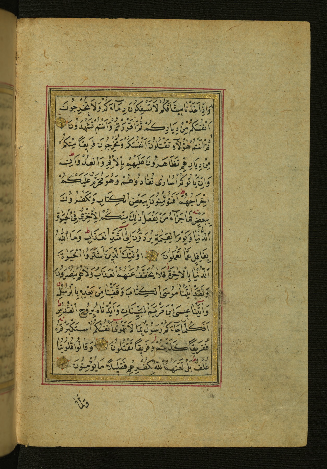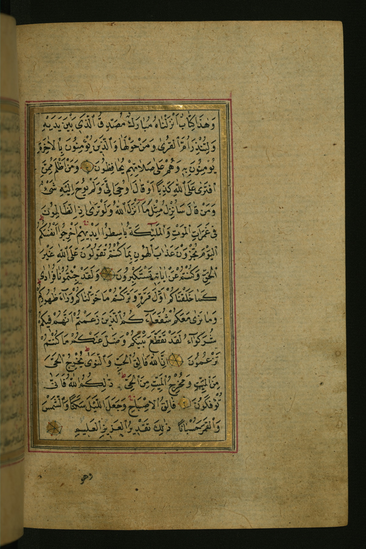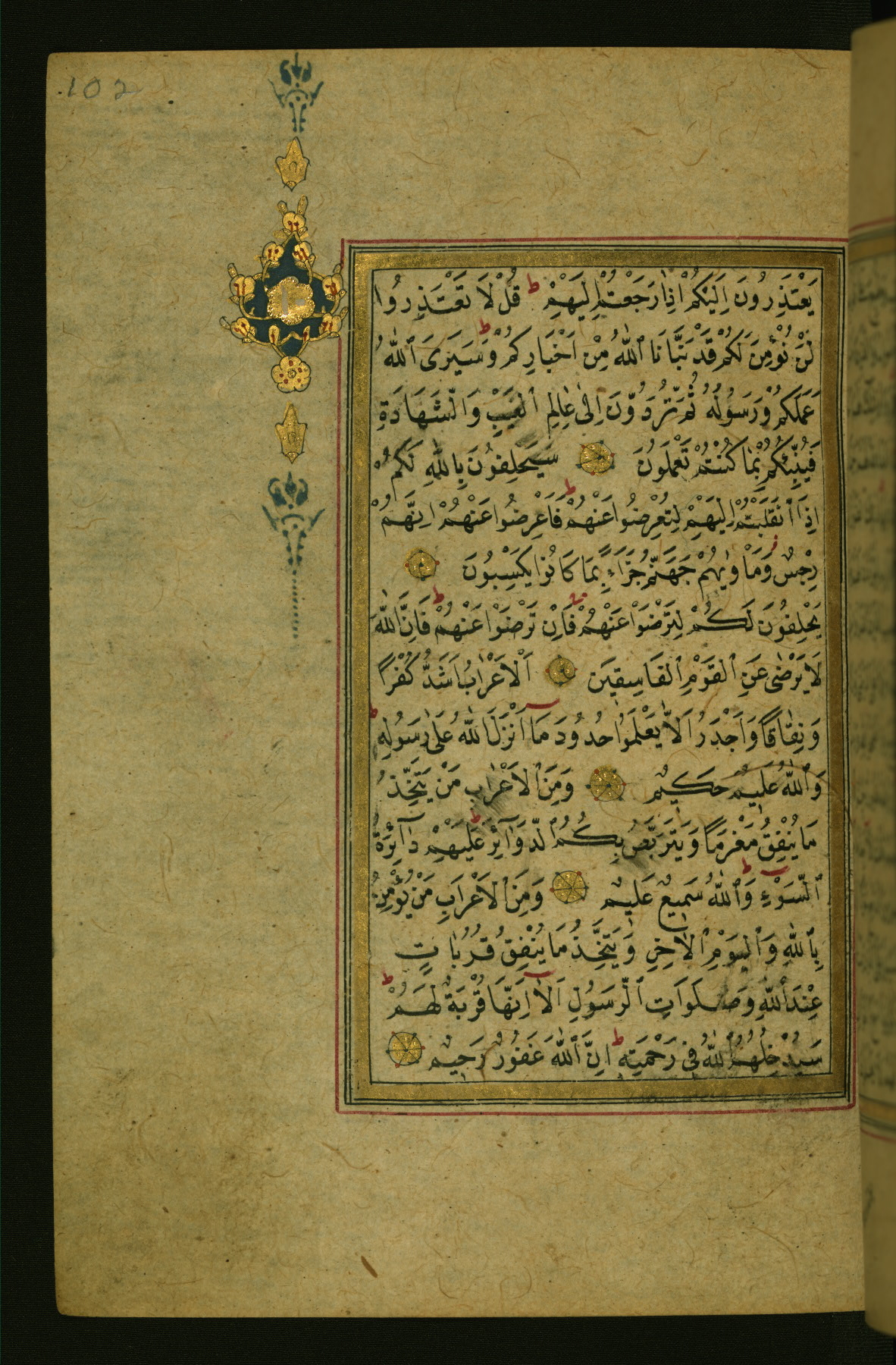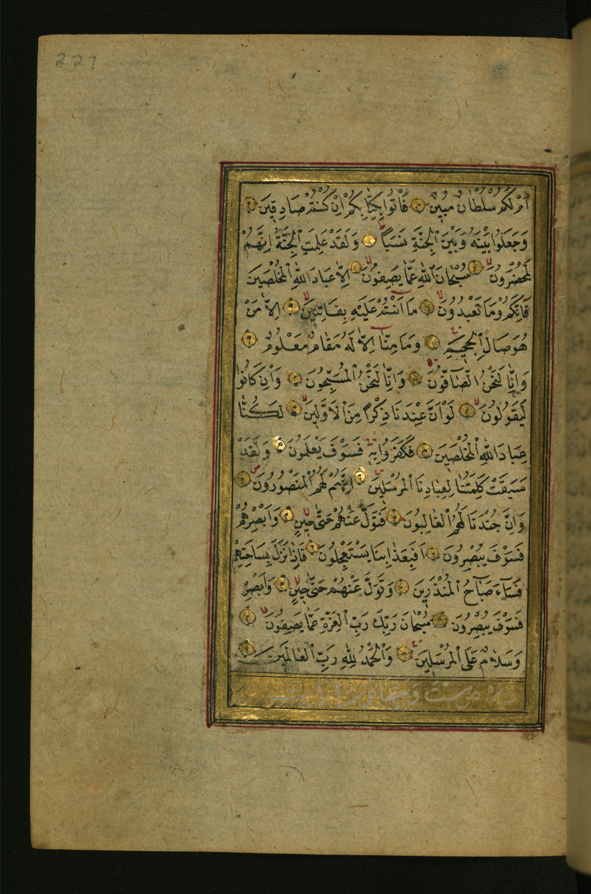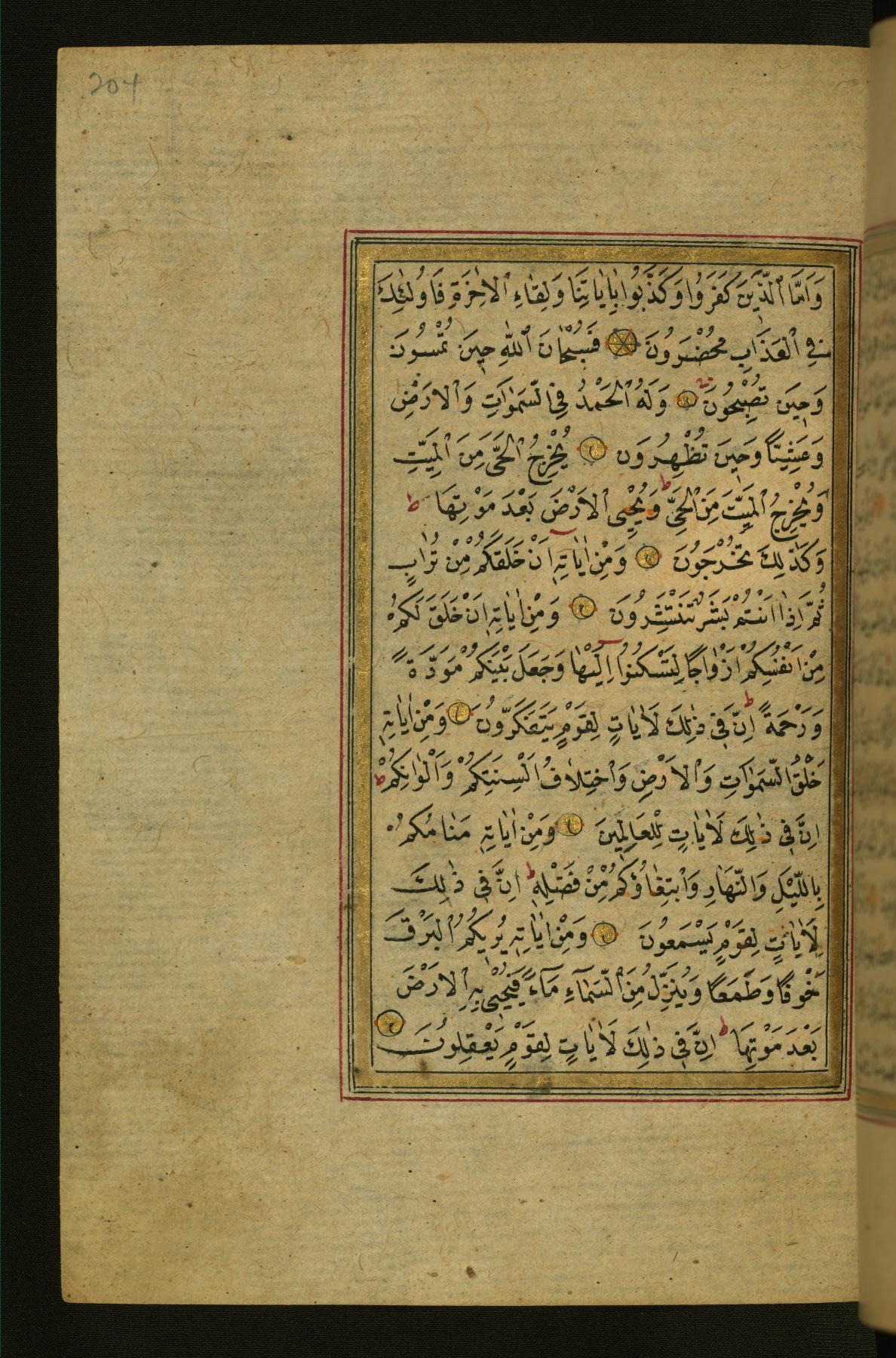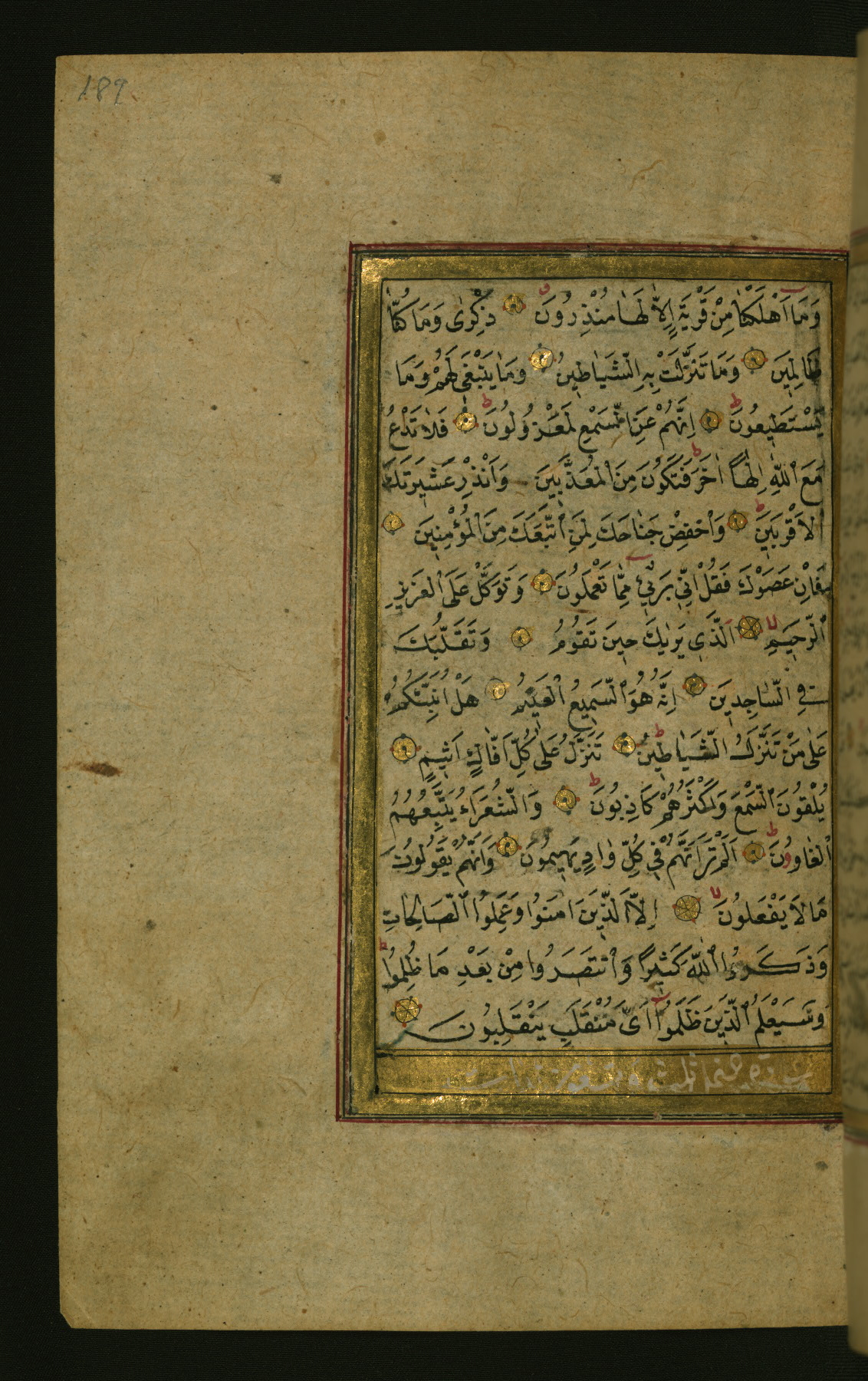 This small, illuminated single-volume copy of the Qurʾan was produced in Ottoman Turkey in 1282 AH / 1865-6 CE by Muḥammad ibn Muṣṭafá Izmīrī, a pupil of al-Rudūsī. The colophon in ijāzah script indicates that the present codex is the twenty-first copy executed by him (fol. 304b). The manuscript opens with an illuminated double-page incipit with the verses of chapters 1 (Sūrat al-fātiḥah) and 2 (Sūrat al-baqarah) (fols. 1b-2a). The text is written in naskh script in black ink with reading marks in red. Verses are separated by illuminated discs with colored dots and chapter headings are in riqāʿ script in white ink. Polychrome medallions in the margins indicate textual divisions and prostration. The binding of black leather is contemporary with the manuscript and decorated with a tooled and gold-painted geometric design enclosed by gold frames on the upper and lower boards.
