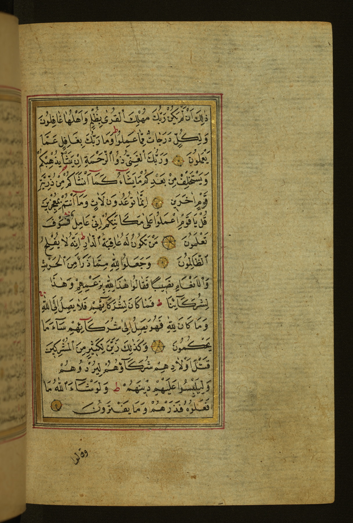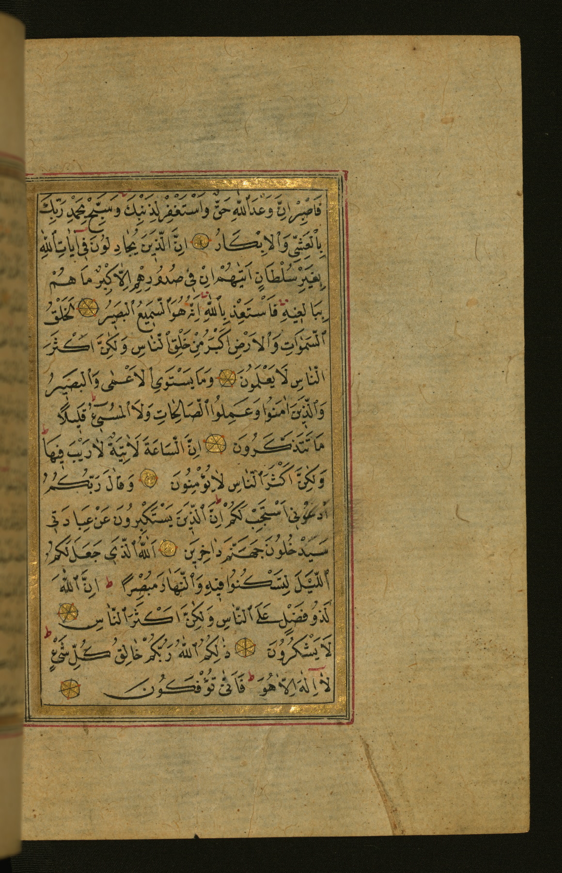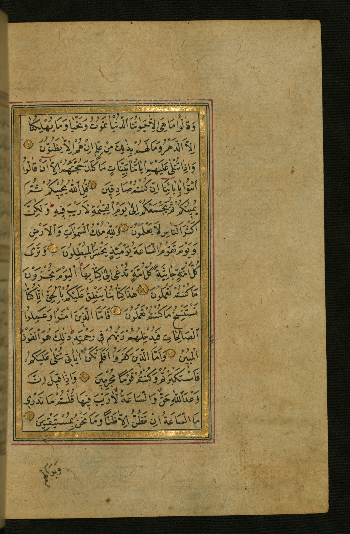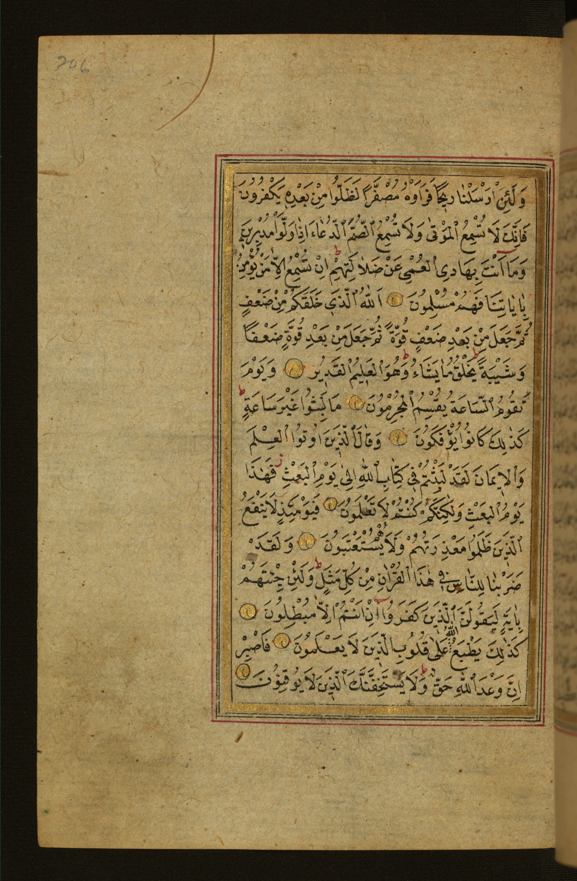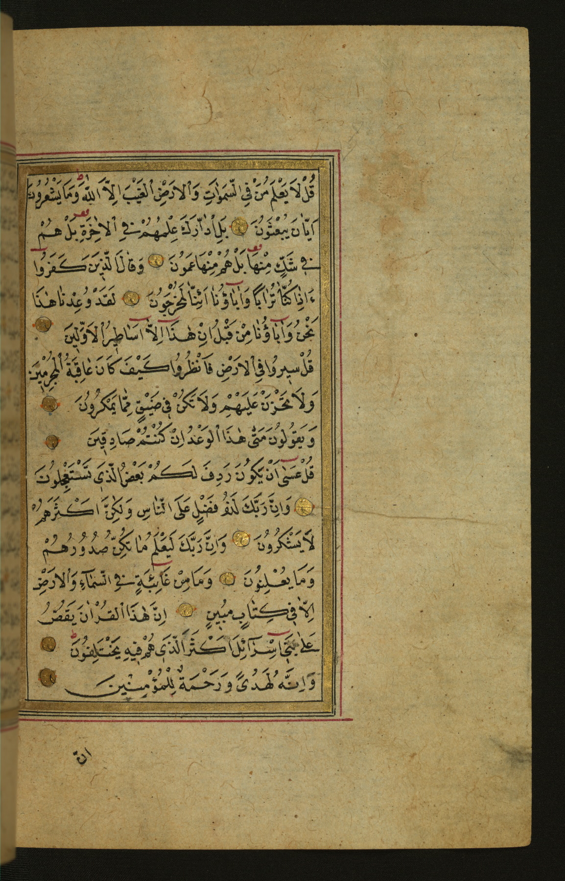 This small, illuminated single-volume copy of the Qurʾan was produced in Ottoman Turkey in 1282 AH / 1865-6 CE by Muḥammad ibn Muṣṭafá Izmīrī, a pupil of al-Rudūsī. The colophon in ijāzah script indicates that the present codex is the twenty-first copy executed by him (fol. 304b). The manuscript opens with an illuminated double-page incipit with the verses of chapters 1 (Sūrat al-fātiḥah) and 2 (Sūrat al-baqarah) (fols. 1b-2a). The text is written in naskh script in black ink with reading marks in red. Verses are separated by illuminated discs with colored dots and chapter headings are in riqāʿ script in white ink. Polychrome medallions in the margins indicate textual divisions and prostration. The binding of black leather is contemporary with the manuscript and decorated with a tooled and gold-painted geometric design enclosed by gold frames on the upper and lower boards.