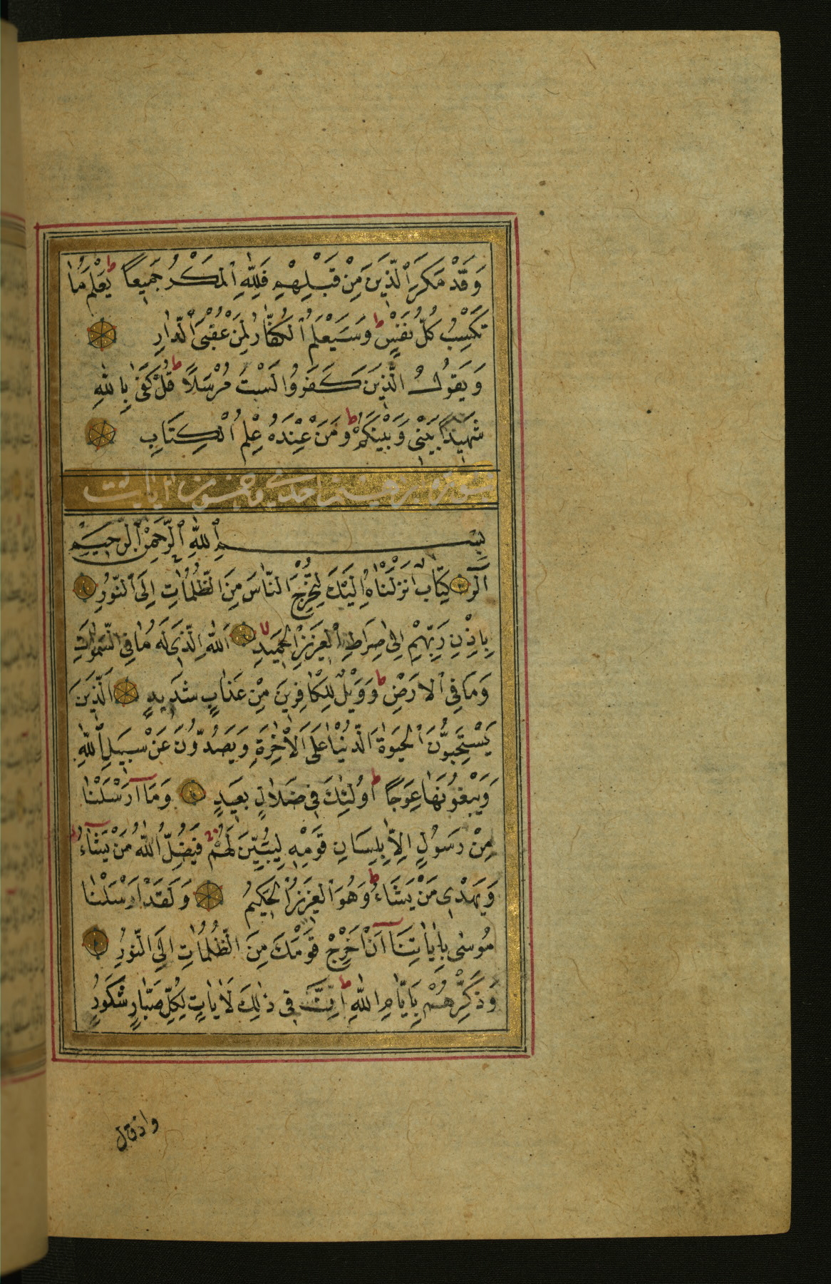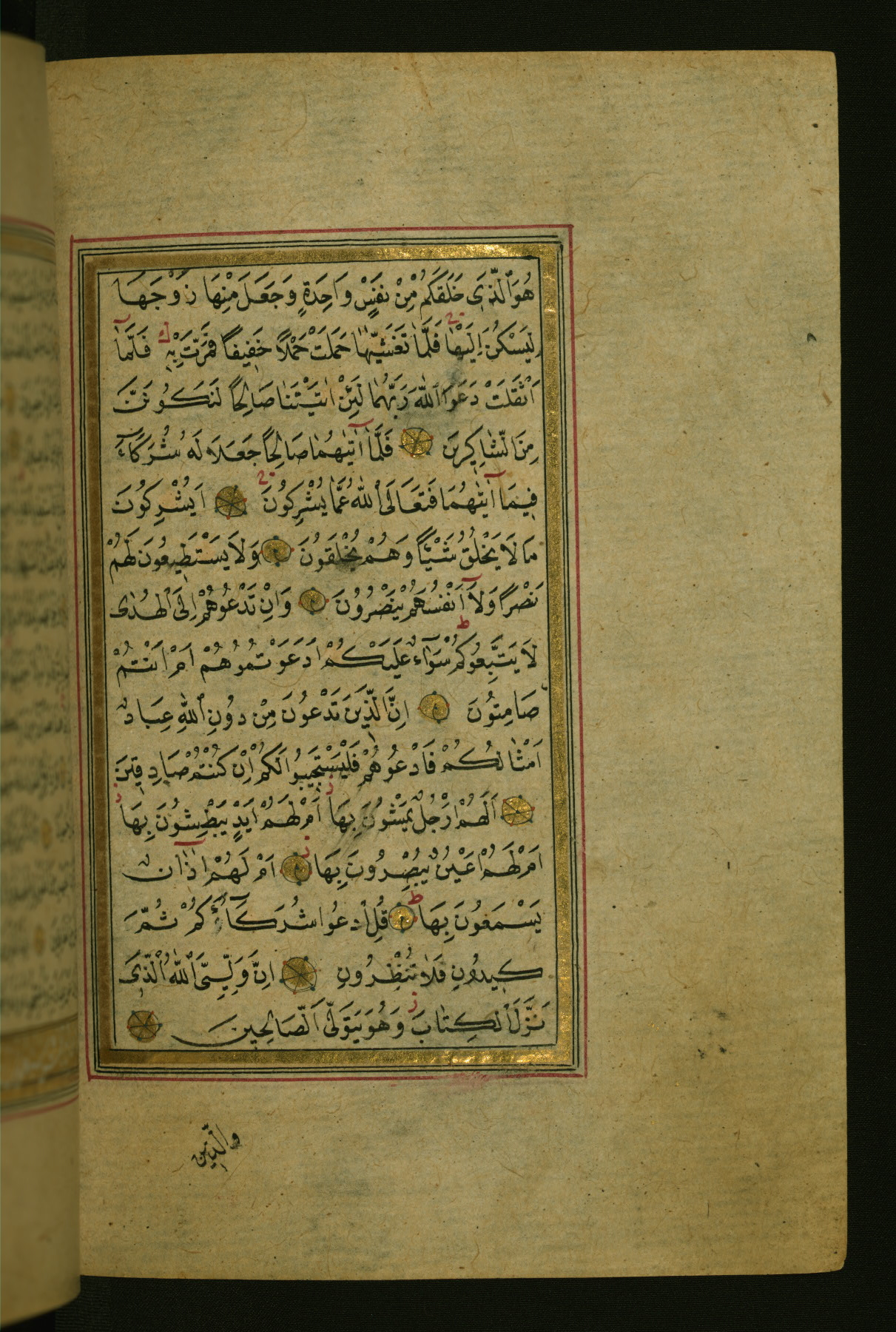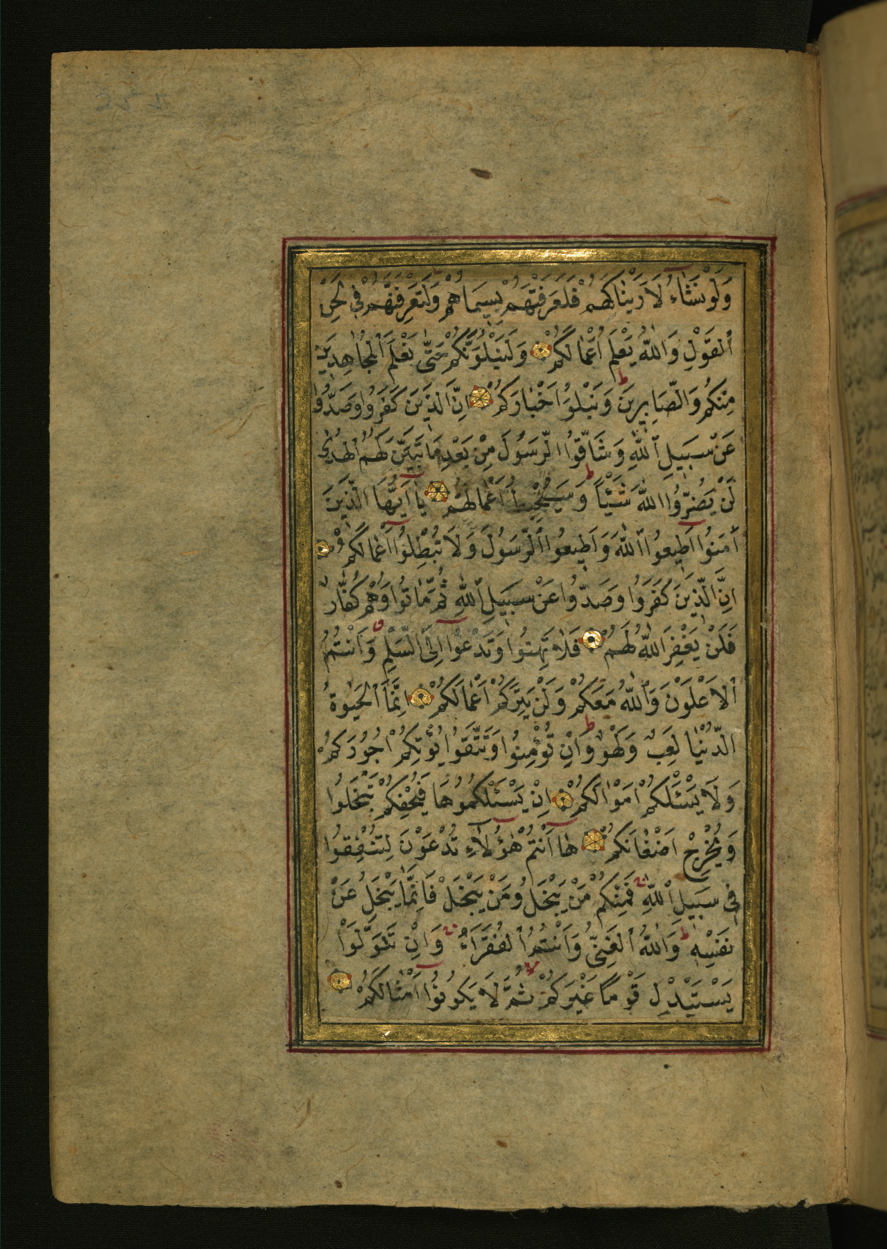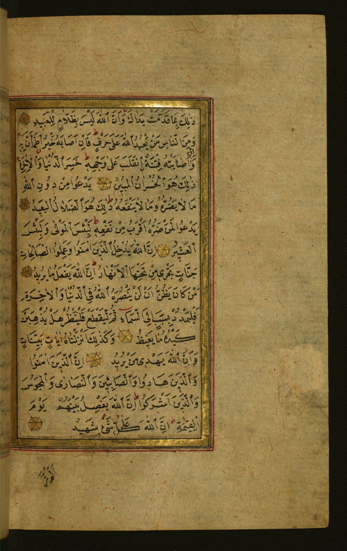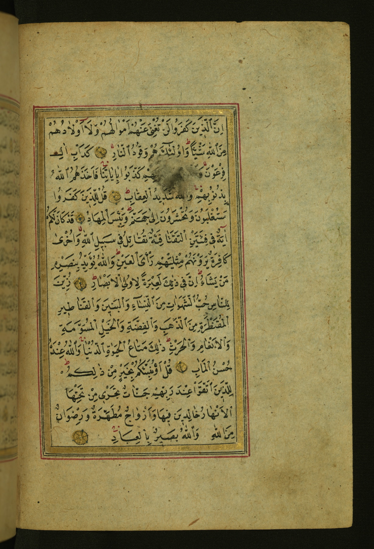 This small, illuminated single-volume copy of the Qurʾan was produced in Ottoman Turkey in 1282 AH / 1865-6 CE by Muḥammad ibn Muṣṭafá Izmīrī, a pupil of al-Rudūsī. The colophon in ijāzah script indicates that the present codex is the twenty-first copy executed by him (fol. 304b). The manuscript opens with an illuminated double-page incipit with the verses of chapters 1 (Sūrat al-fātiḥah) and 2 (Sūrat al-baqarah) (fols. 1b-2a). The text is written in naskh script in black ink with reading marks in red. Verses are separated by illuminated discs with colored dots and chapter headings are in riqāʿ script in white ink. Polychrome medallions in the margins indicate textual divisions and prostration. The binding of black leather is contemporary with the manuscript and decorated with a tooled and gold-painted geometric design enclosed by gold frames on the upper and lower boards.