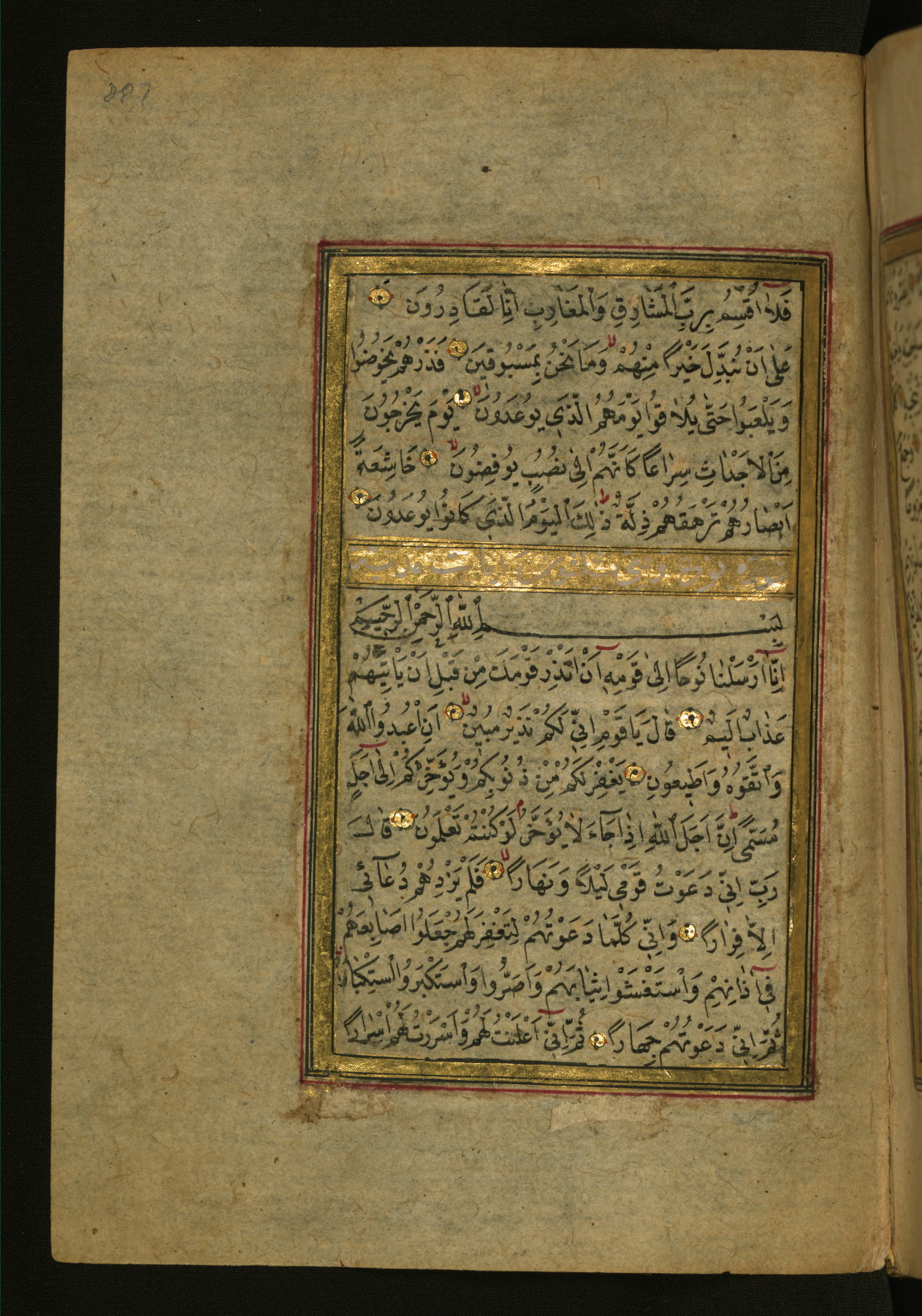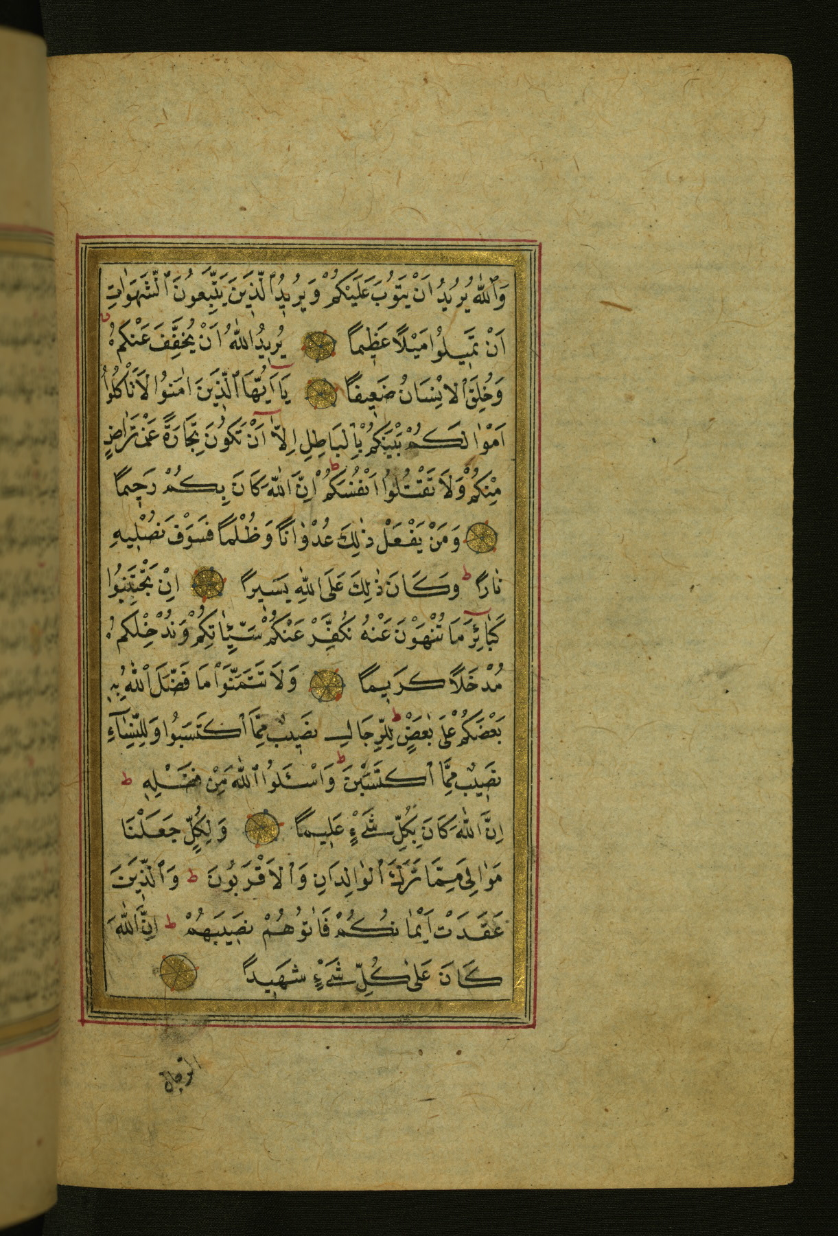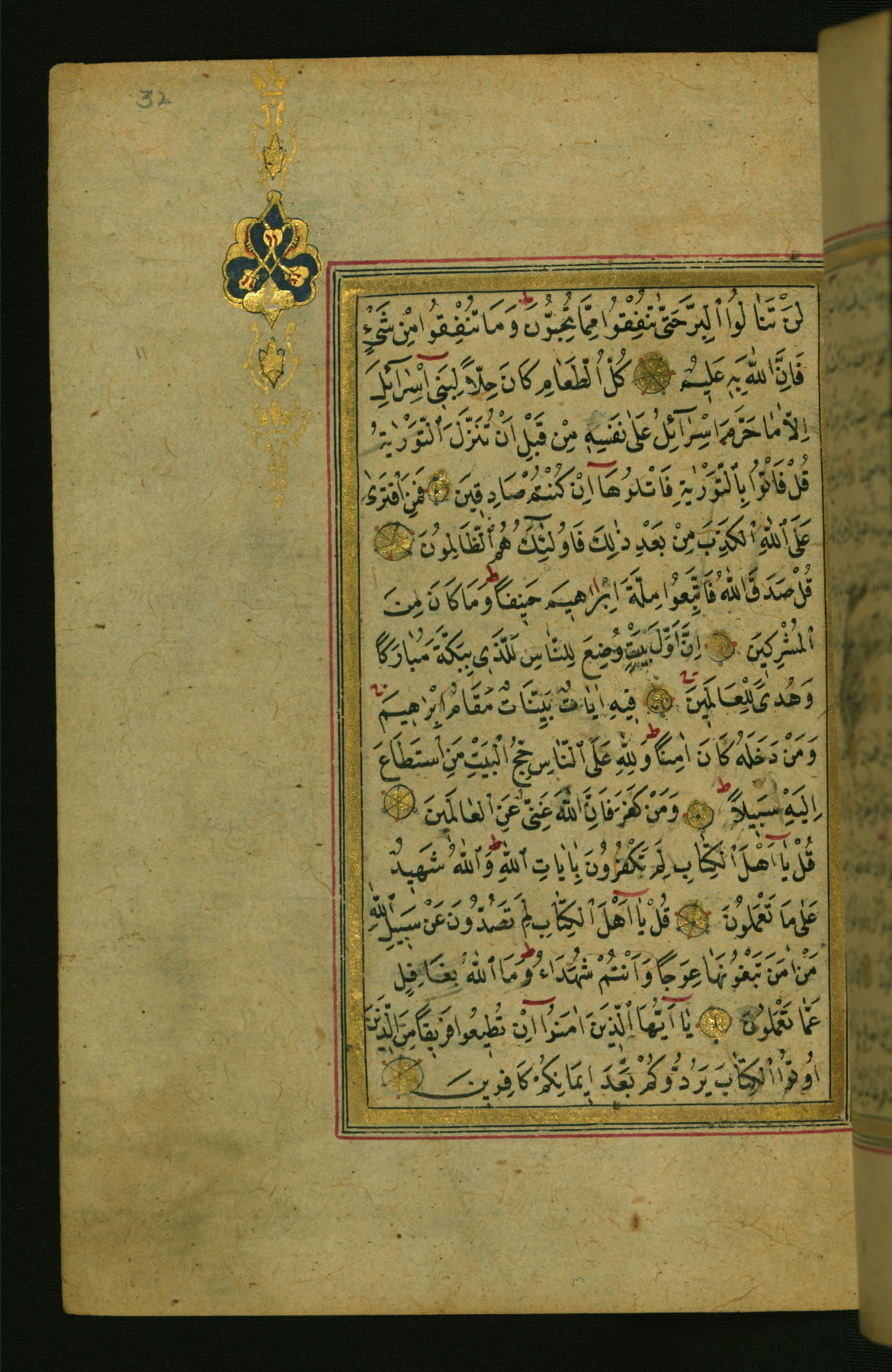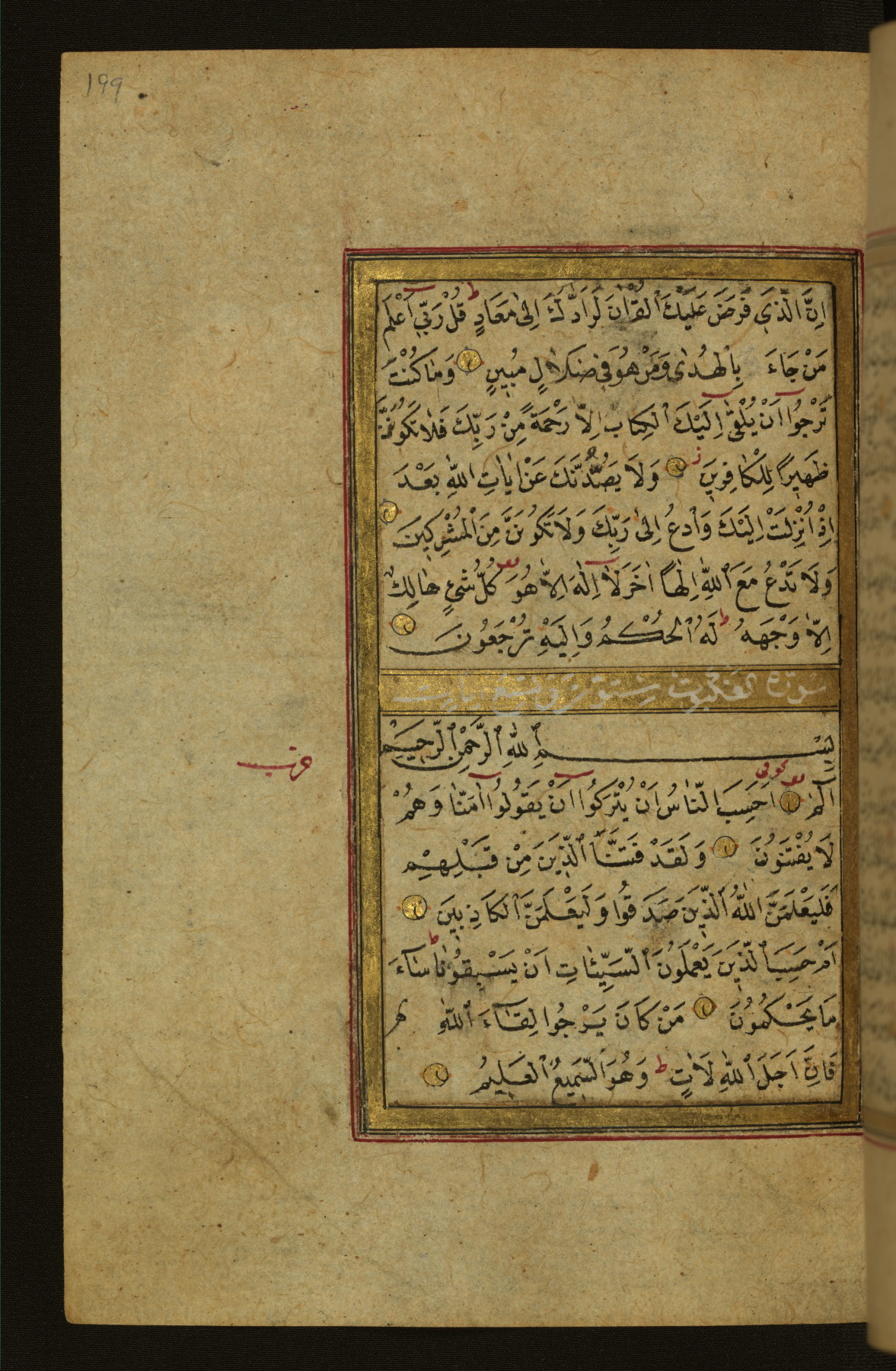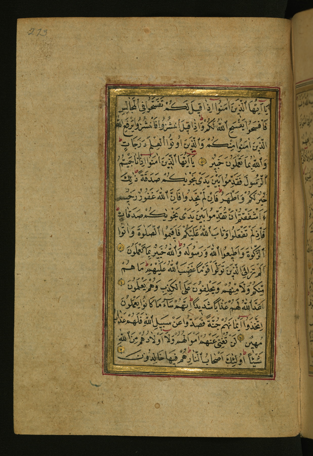 This small, illuminated single-volume copy of the Qurʾan was produced in Ottoman Turkey in 1282 AH / 1865-6 CE by Muḥammad ibn Muṣṭafá Izmīrī, a pupil of al-Rudūsī. The colophon in ijāzah script indicates that the present codex is the twenty-first copy executed by him (fol. 304b). The manuscript opens with an illuminated double-page incipit with the verses of chapters 1 (Sūrat al-fātiḥah) and 2 (Sūrat al-baqarah) (fols. 1b-2a). The text is written in naskh script in black ink with reading marks in red. Verses are separated by illuminated discs with colored dots and chapter headings are in riqāʿ script in white ink. Polychrome medallions in the margins indicate textual divisions and prostration. The binding of black leather is contemporary with the manuscript and decorated with a tooled and gold-painted geometric design enclosed by gold frames on the upper and lower boards.