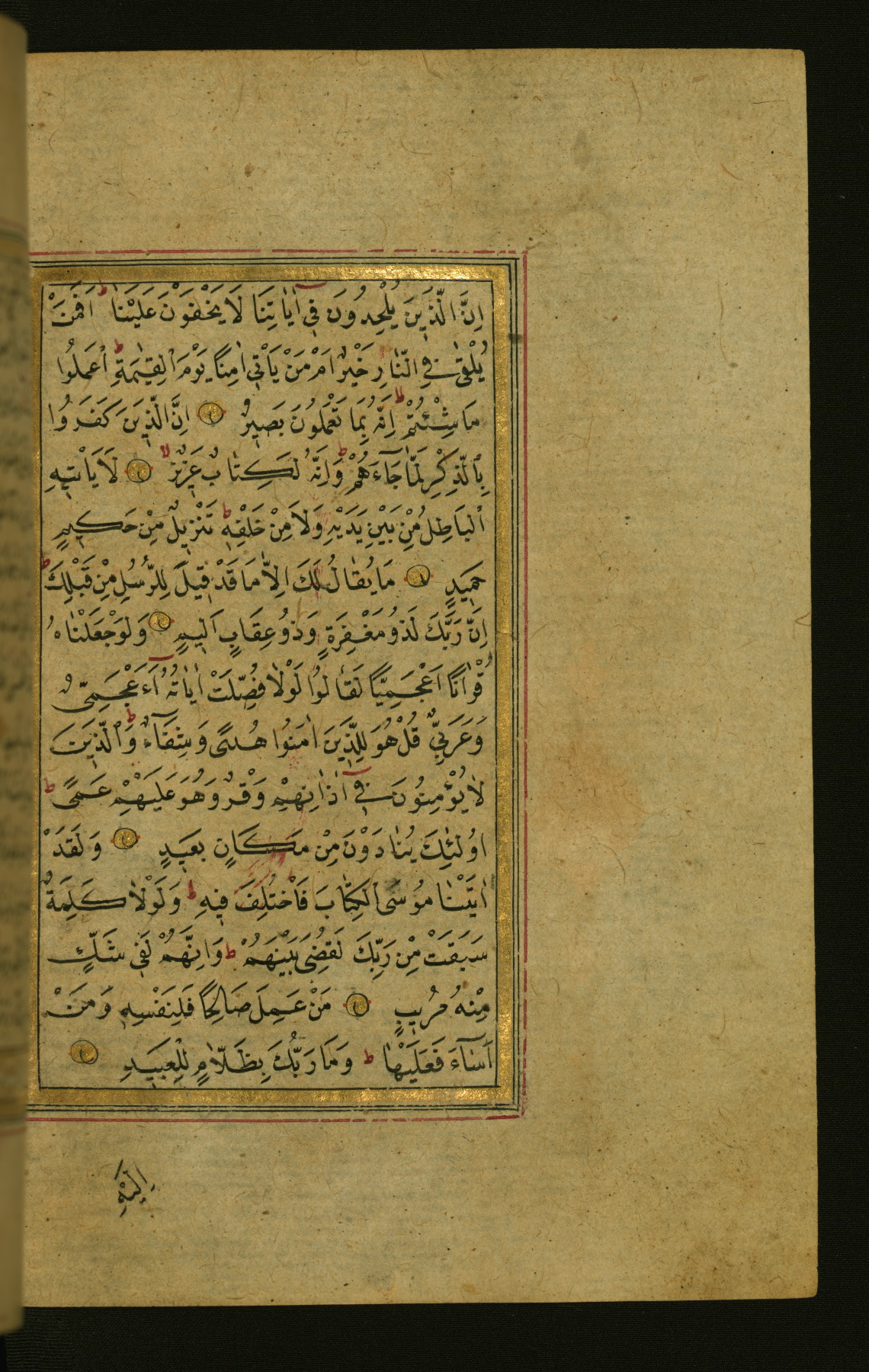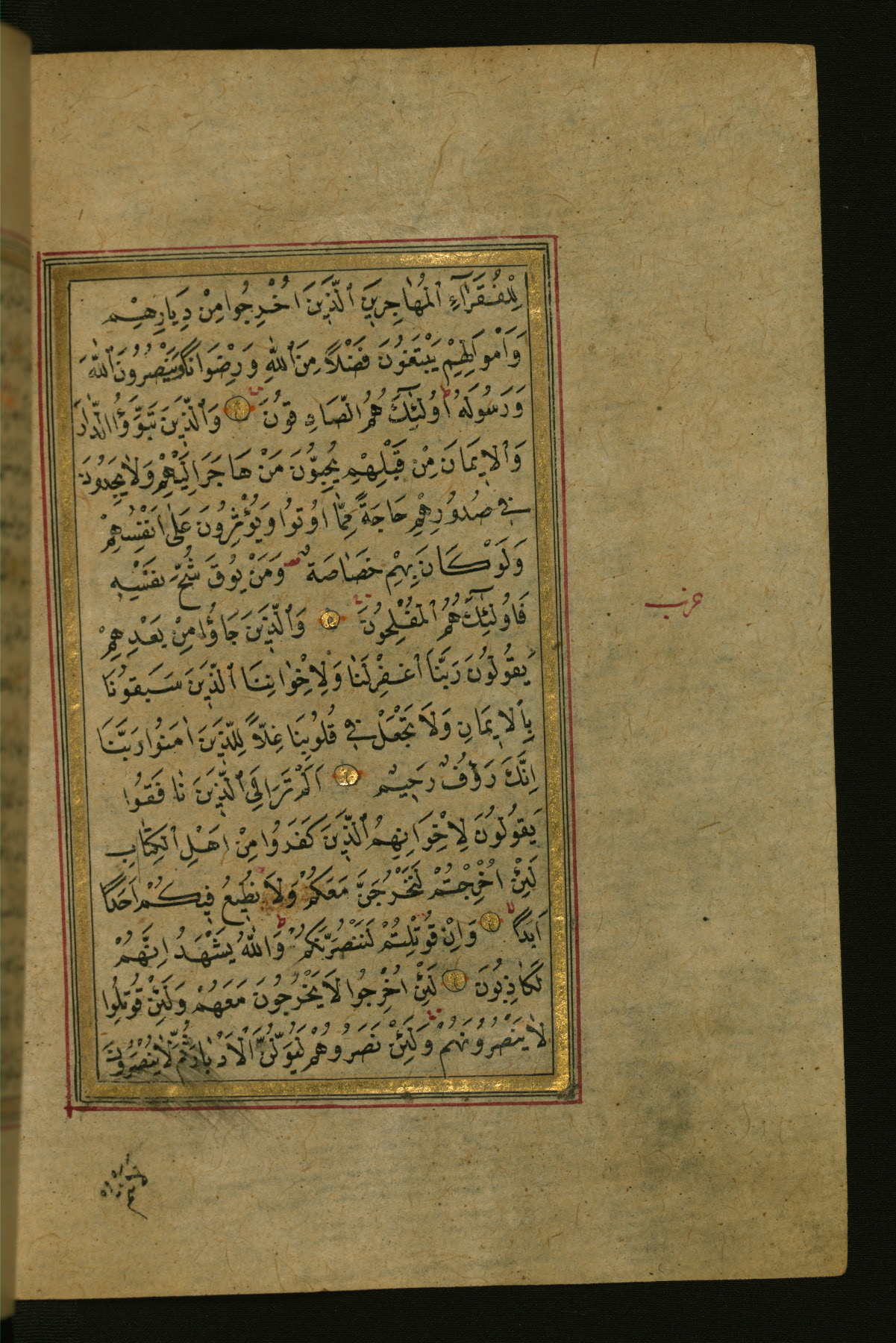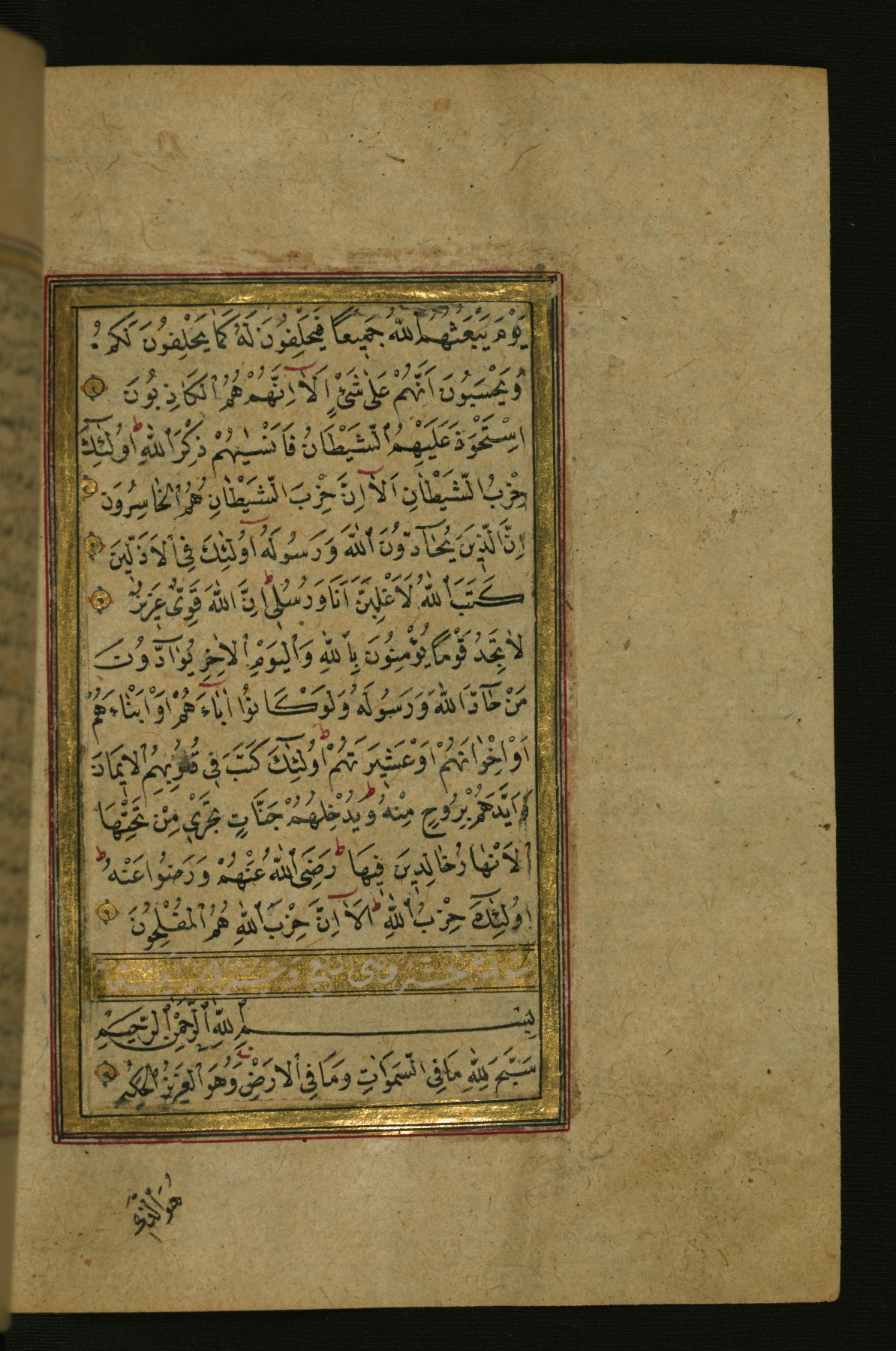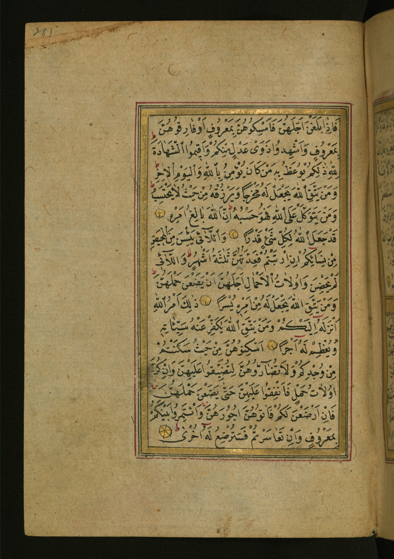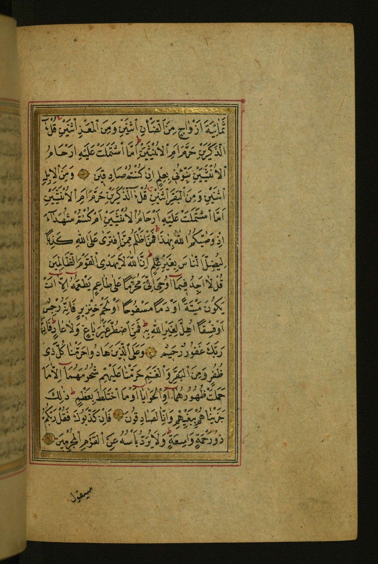 This small, illuminated single-volume copy of the Qurʾan was produced in Ottoman Turkey in 1282 AH / 1865-6 CE by Muḥammad ibn Muṣṭafá Izmīrī, a pupil of al-Rudūsī. The colophon in ijāzah script indicates that the present codex is the twenty-first copy executed by him (fol. 304b). The manuscript opens with an illuminated double-page incipit with the verses of chapters 1 (Sūrat al-fātiḥah) and 2 (Sūrat al-baqarah) (fols. 1b-2a). The text is written in naskh script in black ink with reading marks in red. Verses are separated by illuminated discs with colored dots and chapter headings are in riqāʿ script in white ink. Polychrome medallions in the margins indicate textual divisions and prostration. The binding of black leather is contemporary with the manuscript and decorated with a tooled and gold-painted geometric design enclosed by gold frames on the upper and lower boards.