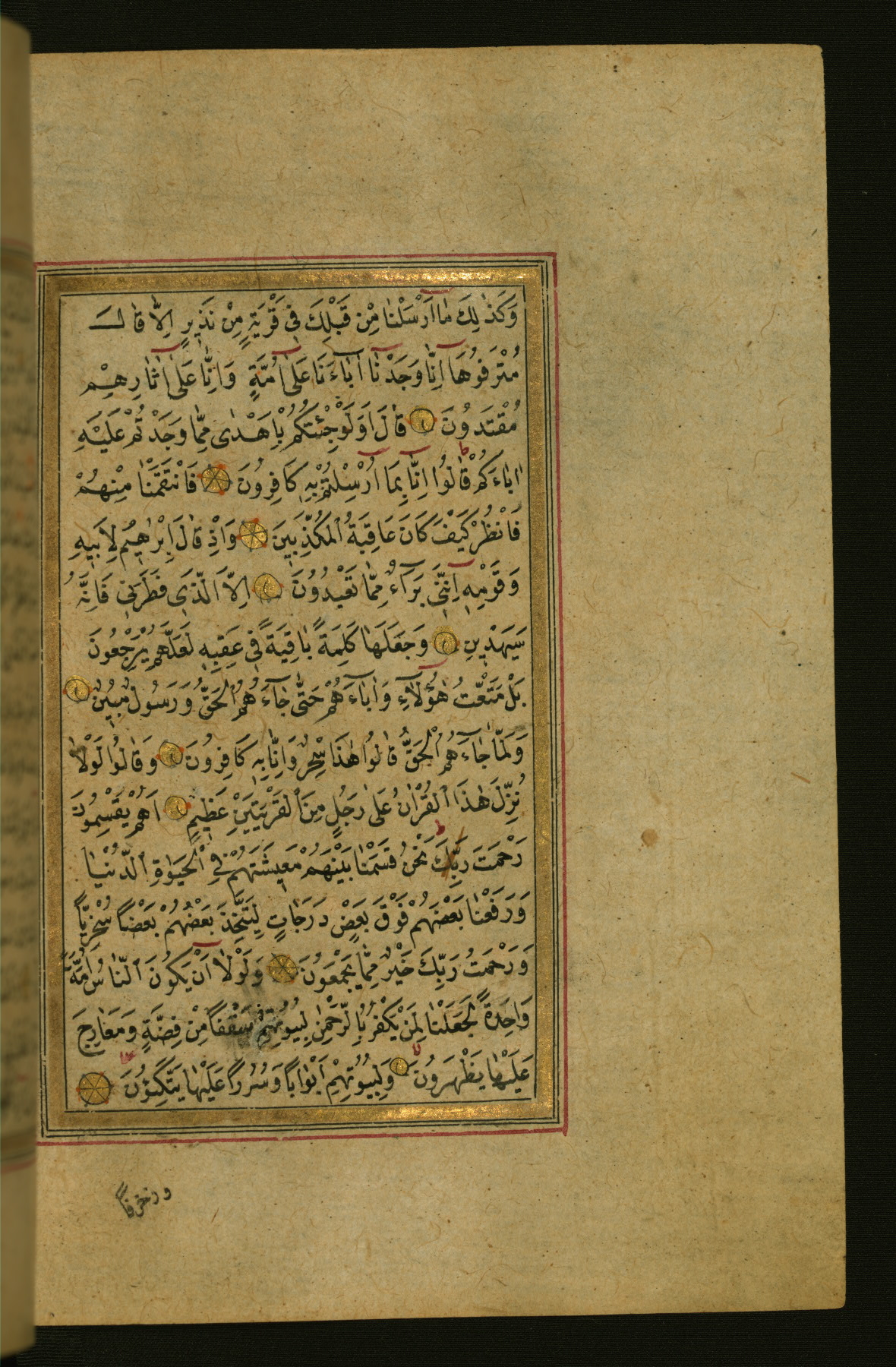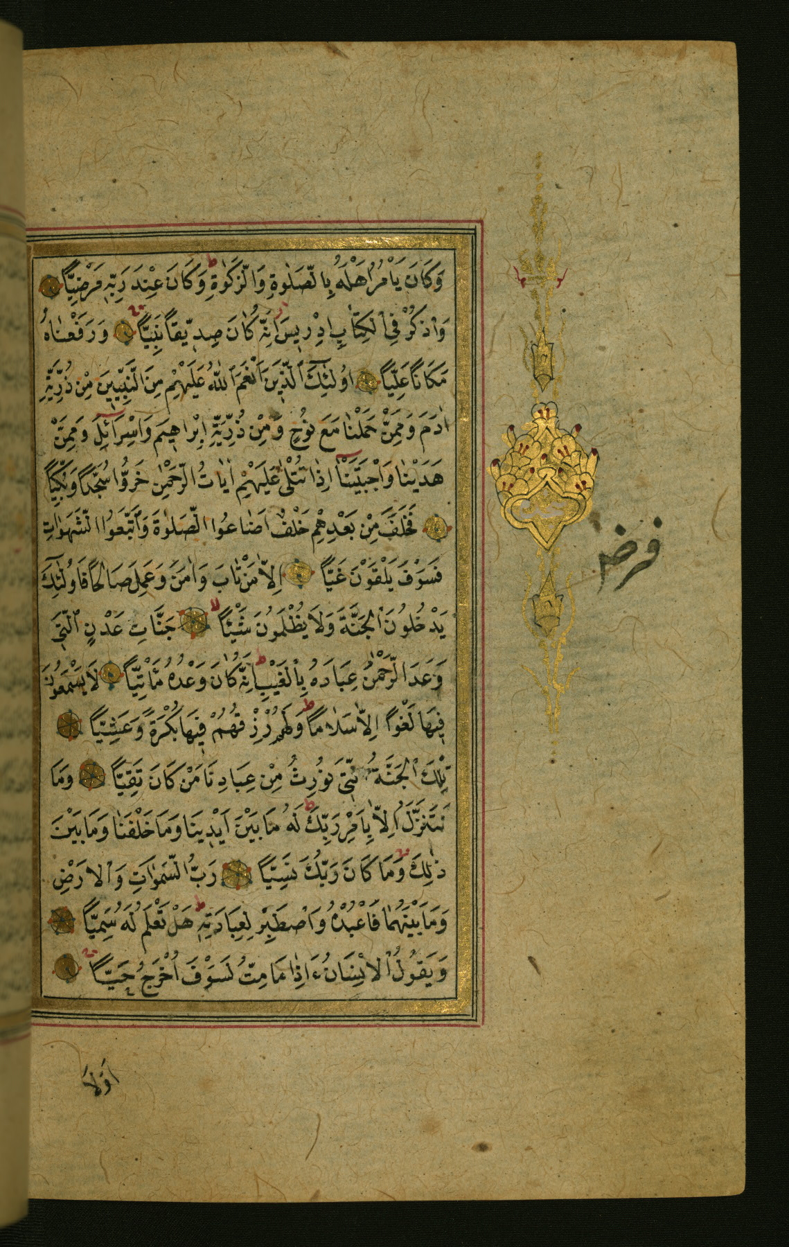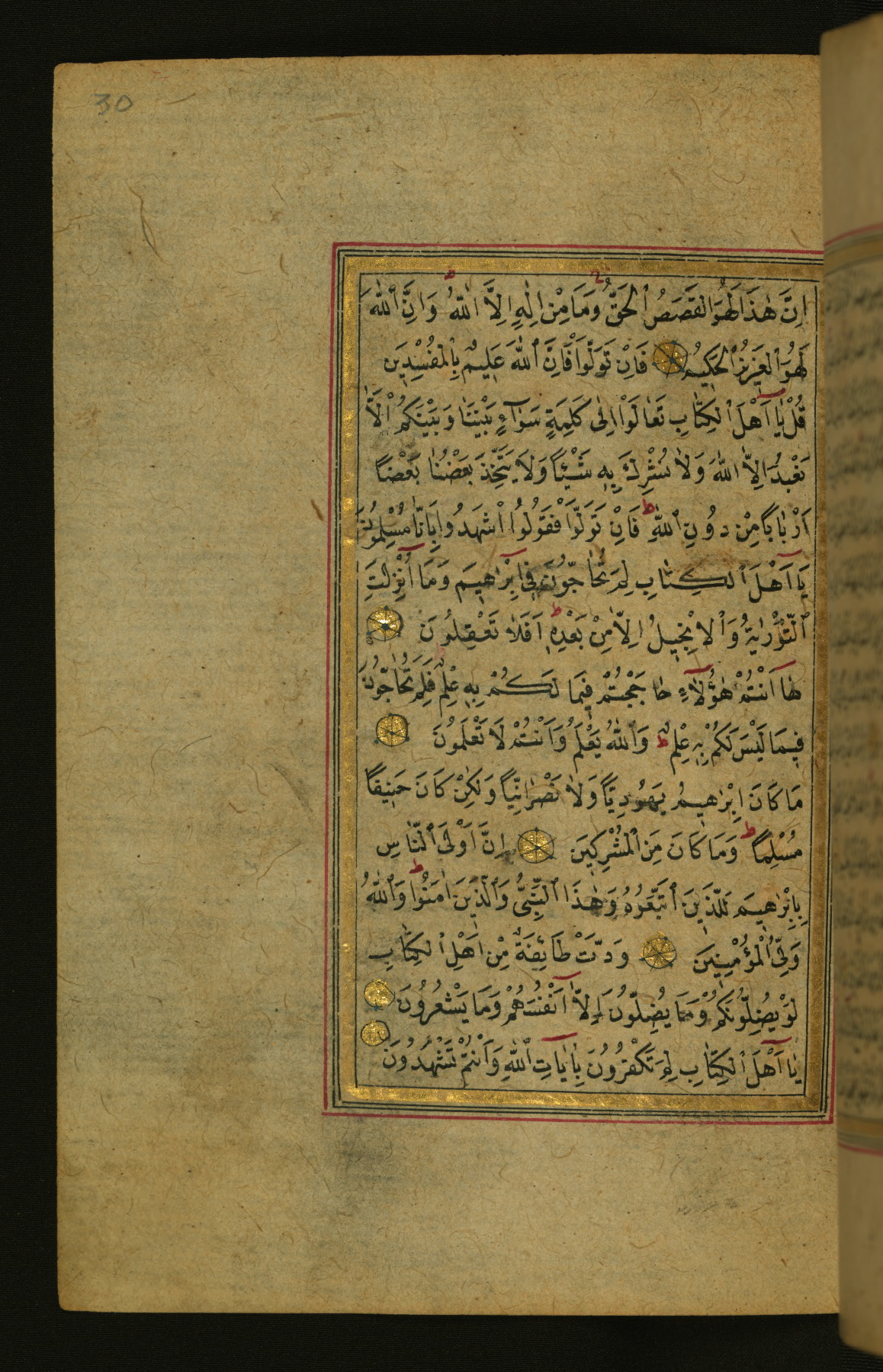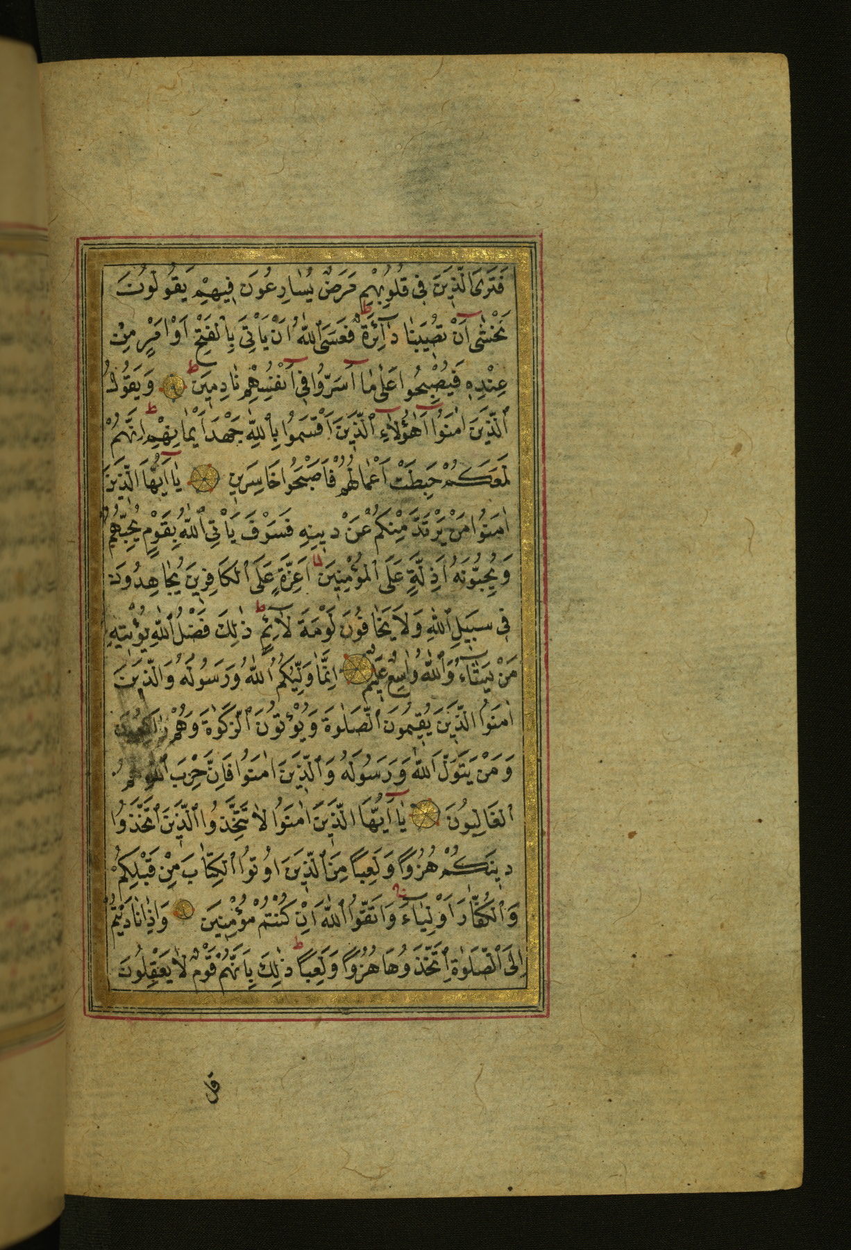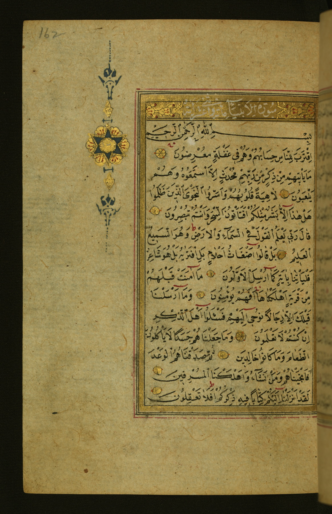 This small, illuminated single-volume copy of the Qurʾan was produced in Ottoman Turkey in 1282 AH / 1865-6 CE by Muḥammad ibn Muṣṭafá Izmīrī, a pupil of al-Rudūsī. The colophon in ijāzah script indicates that the present codex is the twenty-first copy executed by him (fol. 304b). The manuscript opens with an illuminated double-page incipit with the verses of chapters 1 (Sūrat al-fātiḥah) and 2 (Sūrat al-baqarah) (fols. 1b-2a). The text is written in naskh script in black ink with reading marks in red. Verses are separated by illuminated discs with colored dots and chapter headings are in riqāʿ script in white ink. Polychrome medallions in the margins indicate textual divisions and prostration. The binding of black leather is contemporary with the manuscript and decorated with a tooled and gold-painted geometric design enclosed by gold frames on the upper and lower boards.