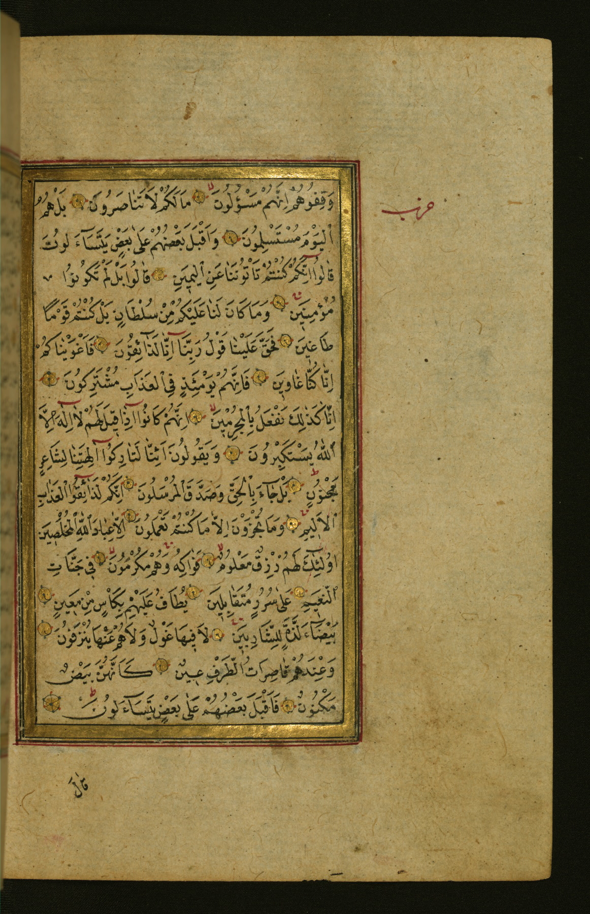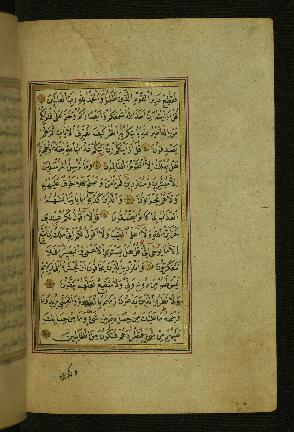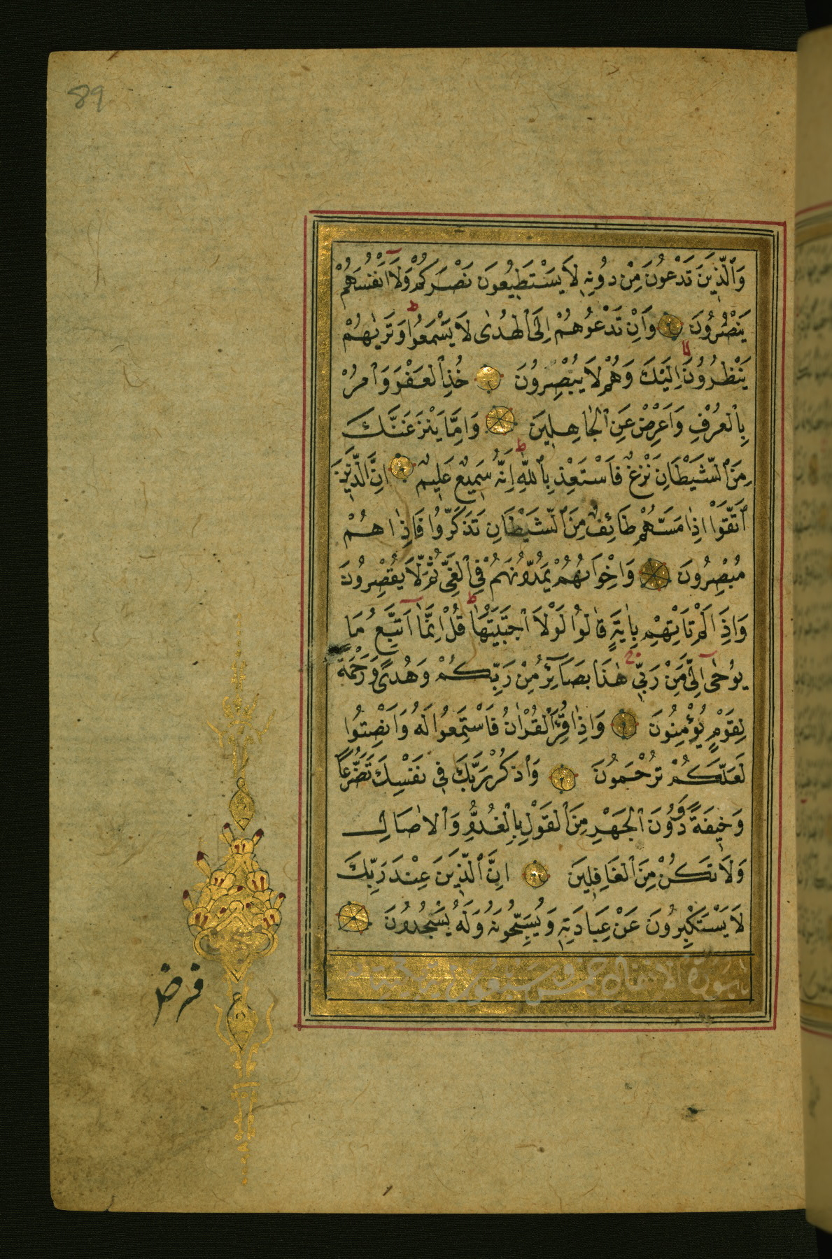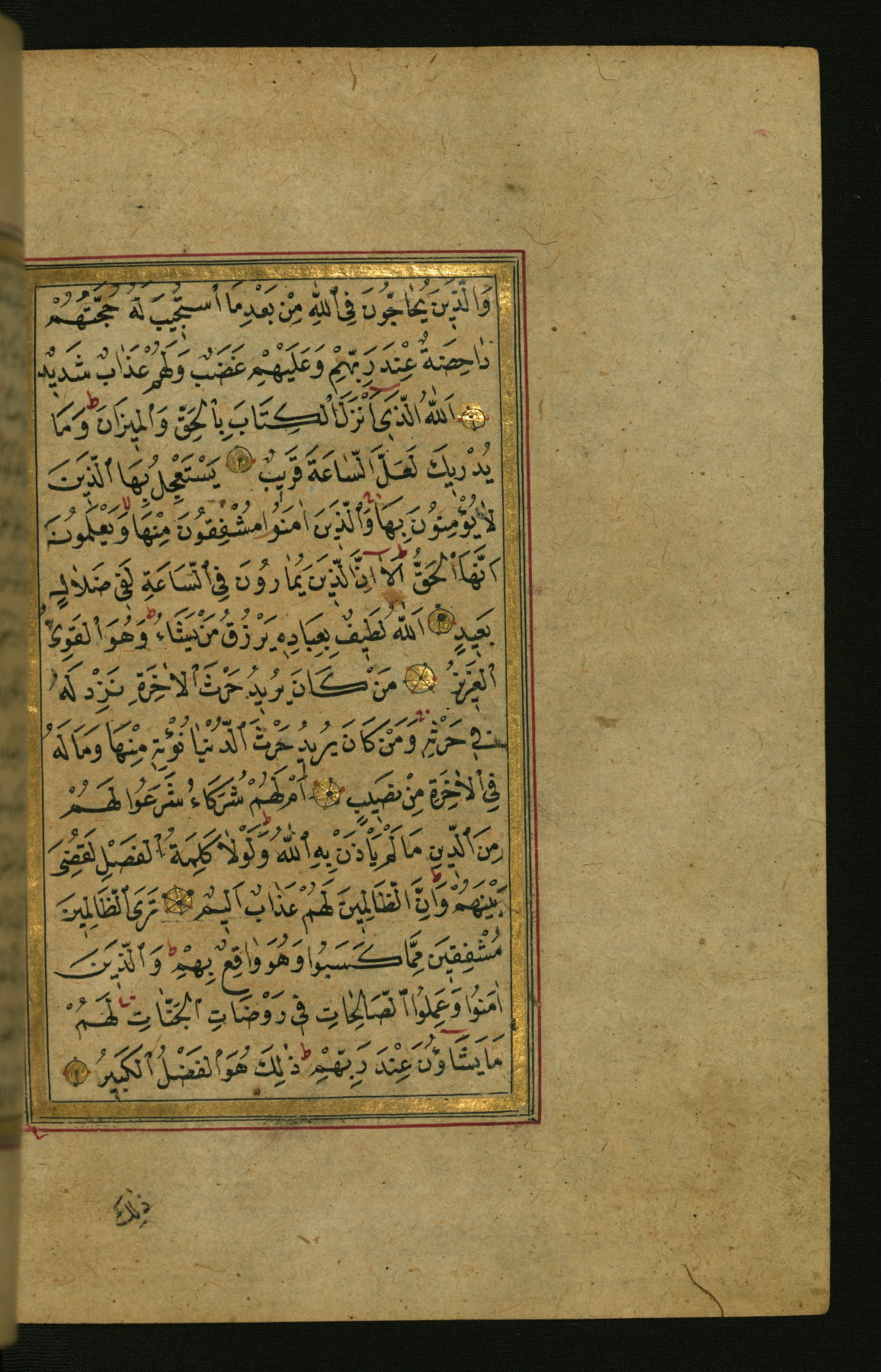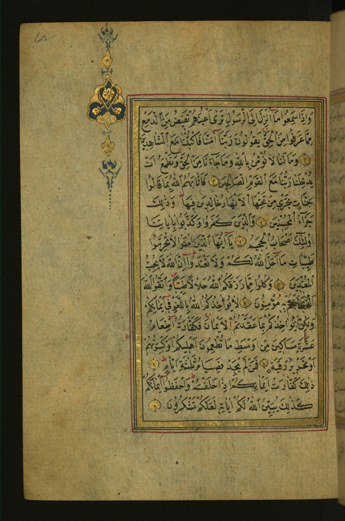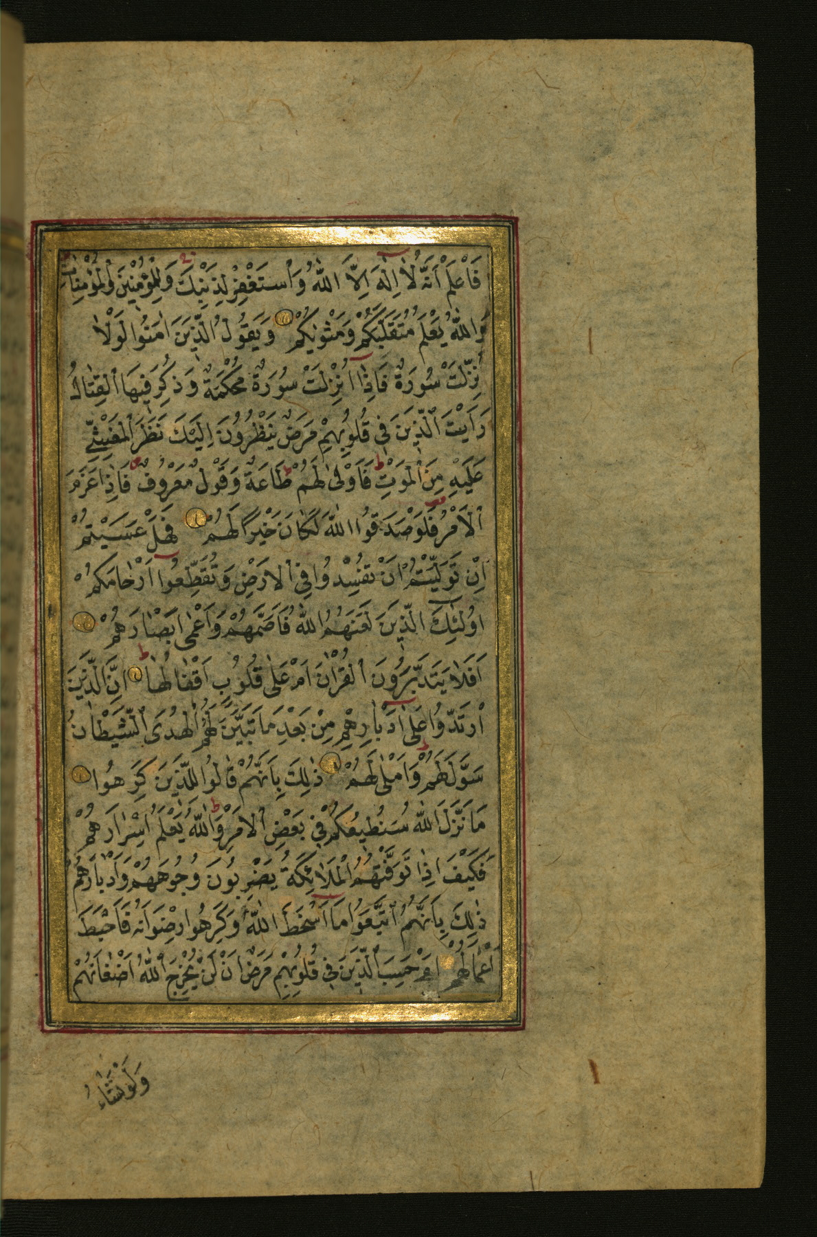 This small, illuminated single-volume copy of the Qurʾan was produced in Ottoman Turkey in 1282 AH / 1865-6 CE by Muḥammad ibn Muṣṭafá Izmīrī, a pupil of al-Rudūsī. The colophon in ijāzah script indicates that the present codex is the twenty-first copy executed by him (fol. 304b). The manuscript opens with an illuminated double-page incipit with the verses of chapters 1 (Sūrat al-fātiḥah) and 2 (Sūrat al-baqarah) (fols. 1b-2a). The text is written in naskh script in black ink with reading marks in red. Verses are separated by illuminated discs with colored dots and chapter headings are in riqāʿ script in white ink. Polychrome medallions in the margins indicate textual divisions and prostration. The binding of black leather is contemporary with the manuscript and decorated with a tooled and gold-painted geometric design enclosed by gold frames on the upper and lower boards.