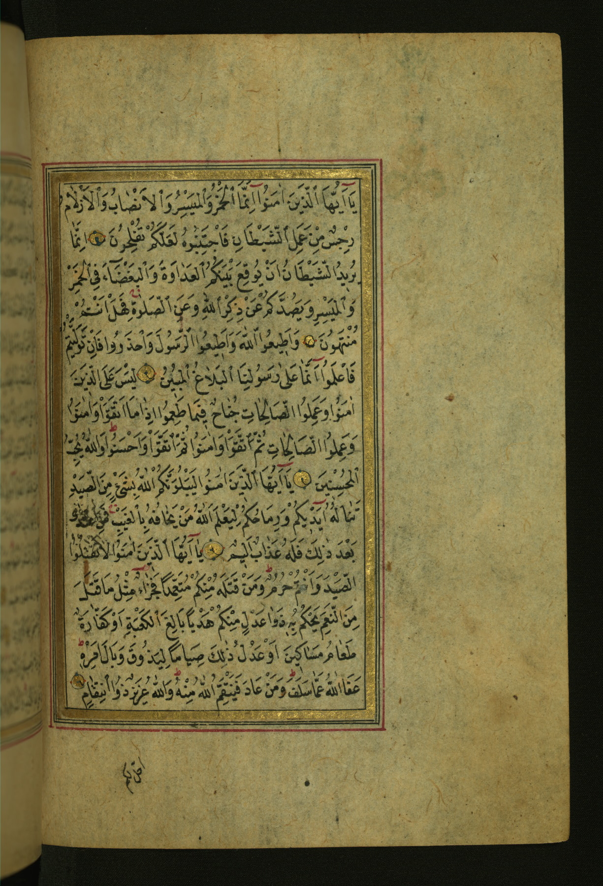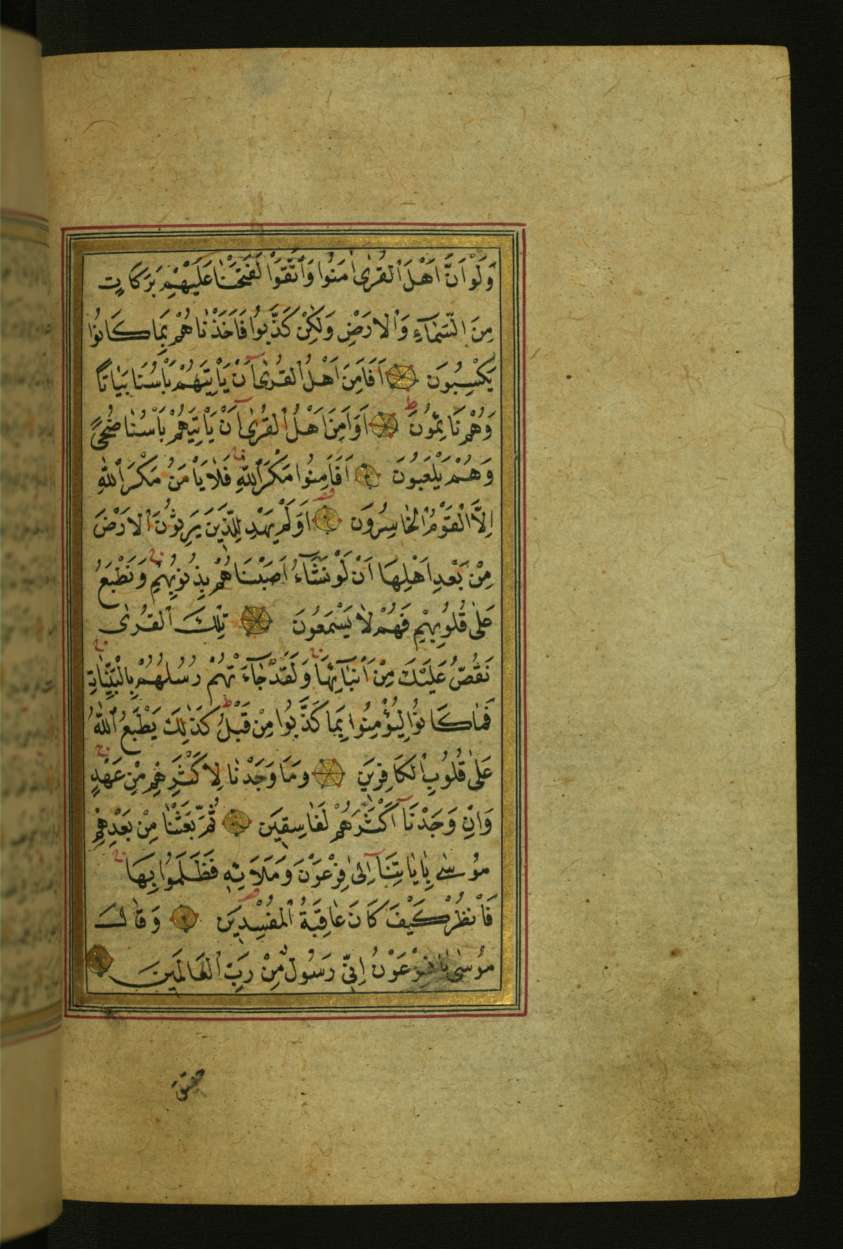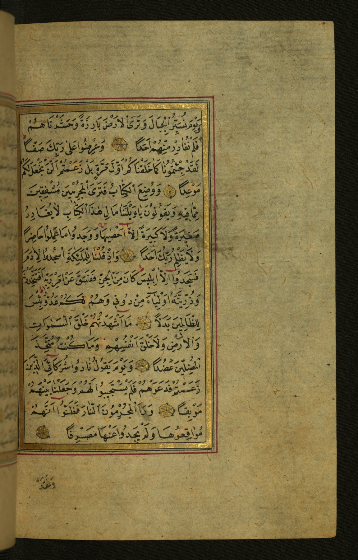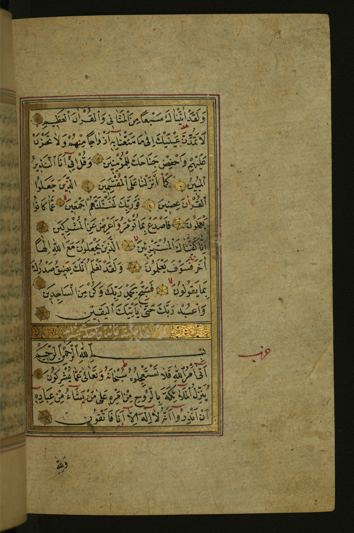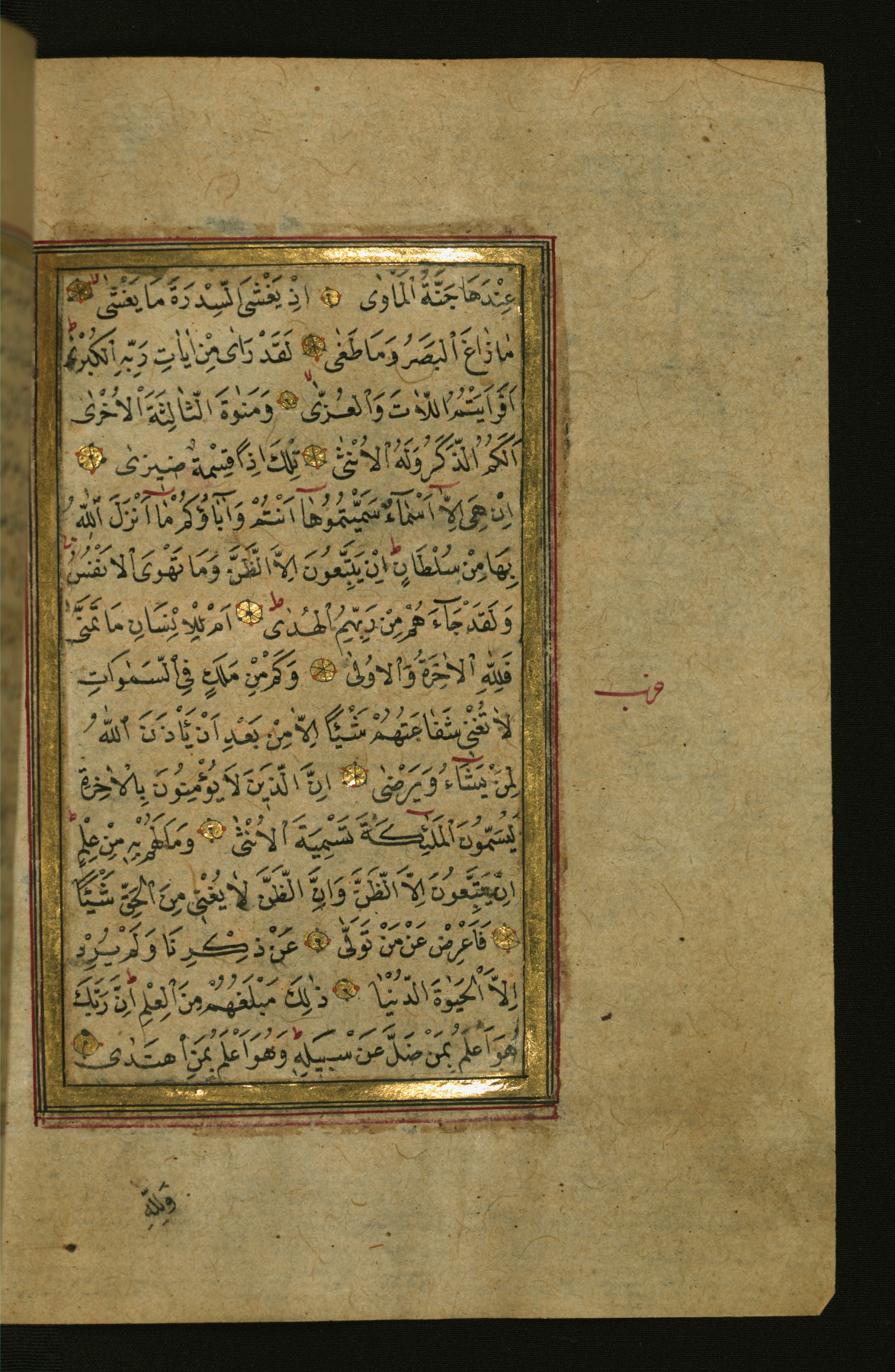 This small, illuminated single-volume copy of the Qurʾan was produced in Ottoman Turkey in 1282 AH / 1865-6 CE by Muḥammad ibn Muṣṭafá Izmīrī, a pupil of al-Rudūsī. The colophon in ijāzah script indicates that the present codex is the twenty-first copy executed by him (fol. 304b). The manuscript opens with an illuminated double-page incipit with the verses of chapters 1 (Sūrat al-fātiḥah) and 2 (Sūrat al-baqarah) (fols. 1b-2a). The text is written in naskh script in black ink with reading marks in red. Verses are separated by illuminated discs with colored dots and chapter headings are in riqāʿ script in white ink. Polychrome medallions in the margins indicate textual divisions and prostration. The binding of black leather is contemporary with the manuscript and decorated with a tooled and gold-painted geometric design enclosed by gold frames on the upper and lower boards.