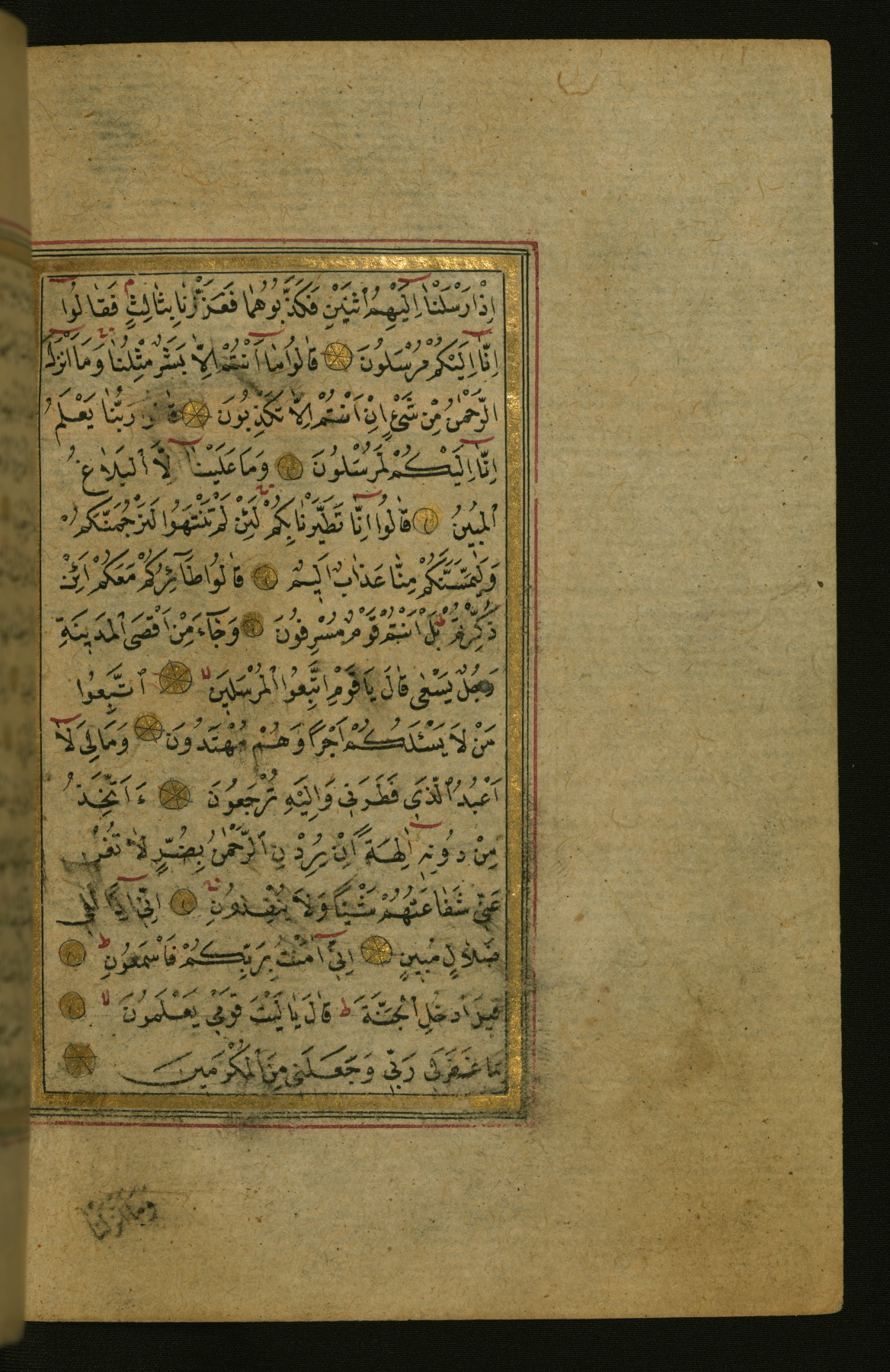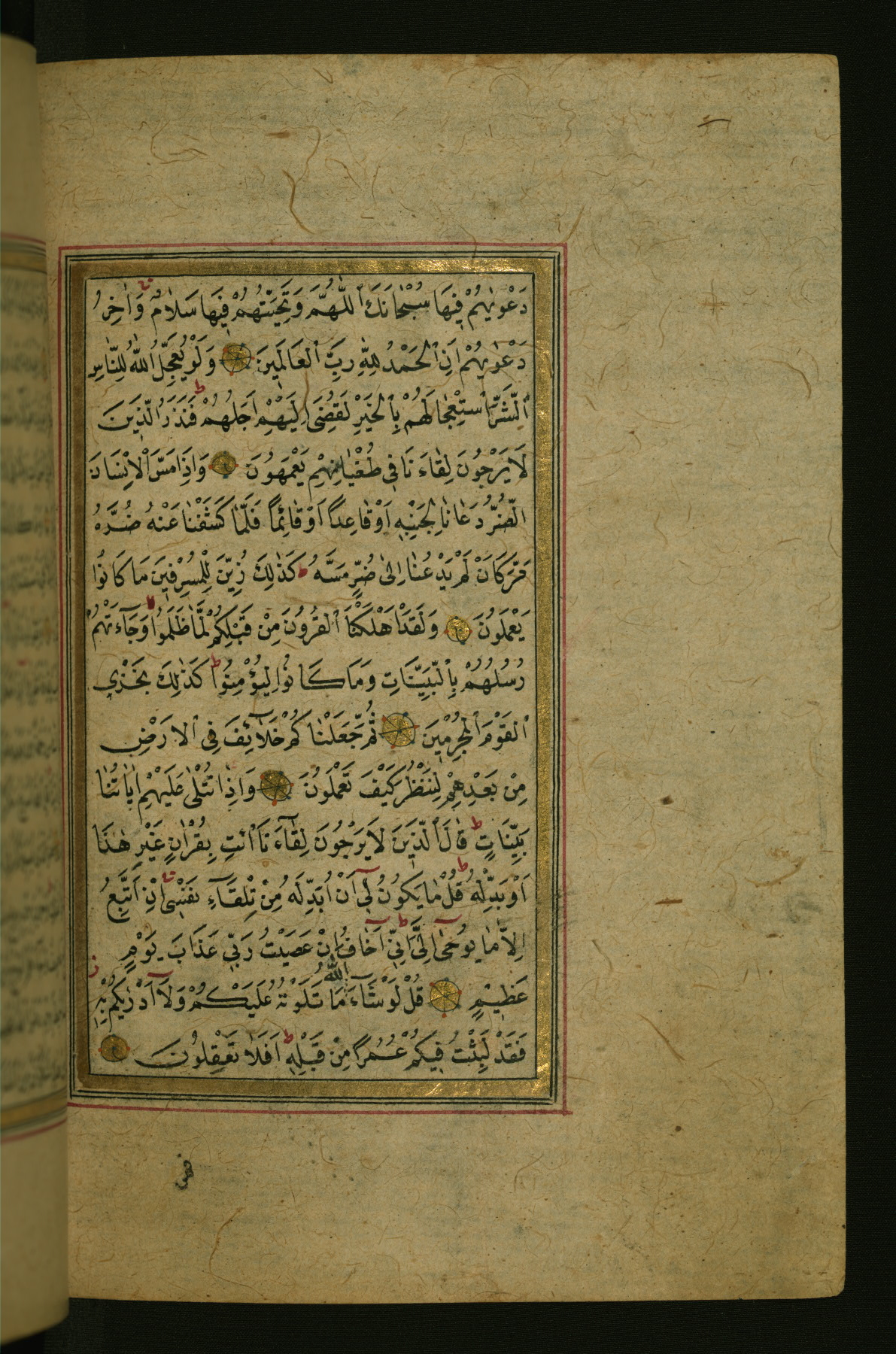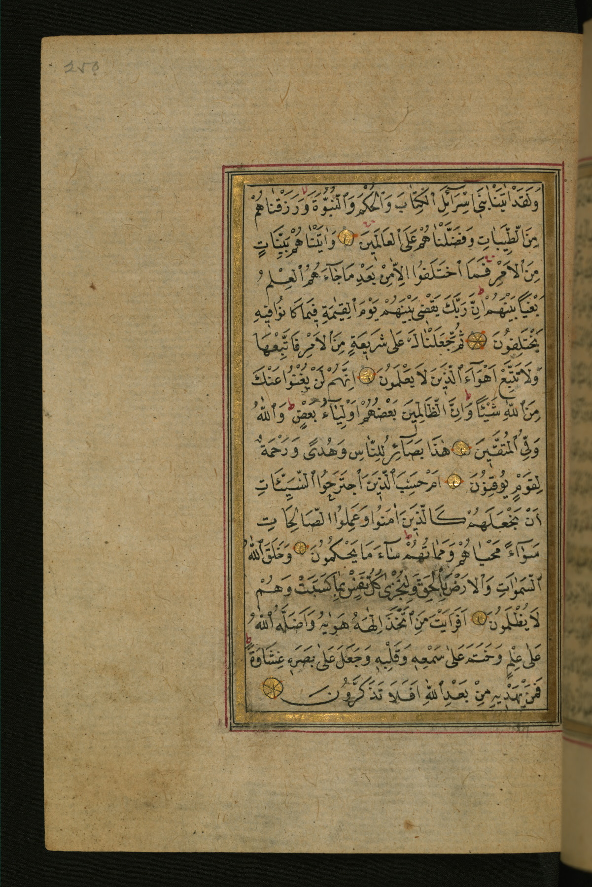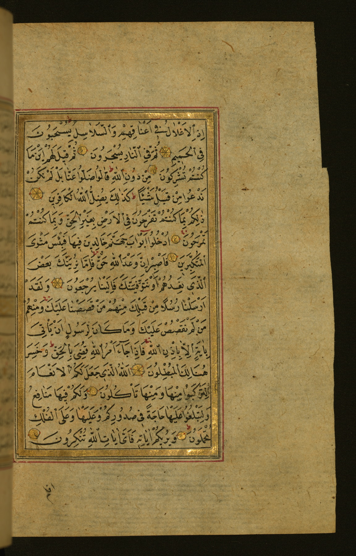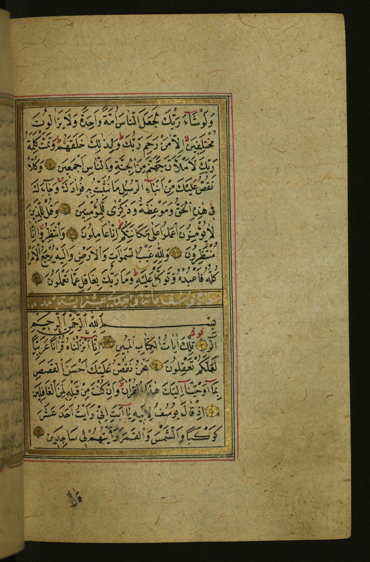 This small, illuminated single-volume copy of the Qurʾan was produced in Ottoman Turkey in 1282 AH / 1865-6 CE by Muḥammad ibn Muṣṭafá Izmīrī, a pupil of al-Rudūsī. The colophon in ijāzah script indicates that the present codex is the twenty-first copy executed by him (fol. 304b). The manuscript opens with an illuminated double-page incipit with the verses of chapters 1 (Sūrat al-fātiḥah) and 2 (Sūrat al-baqarah) (fols. 1b-2a). The text is written in naskh script in black ink with reading marks in red. Verses are separated by illuminated discs with colored dots and chapter headings are in riqāʿ script in white ink. Polychrome medallions in the margins indicate textual divisions and prostration. The binding of black leather is contemporary with the manuscript and decorated with a tooled and gold-painted geometric design enclosed by gold frames on the upper and lower boards.
