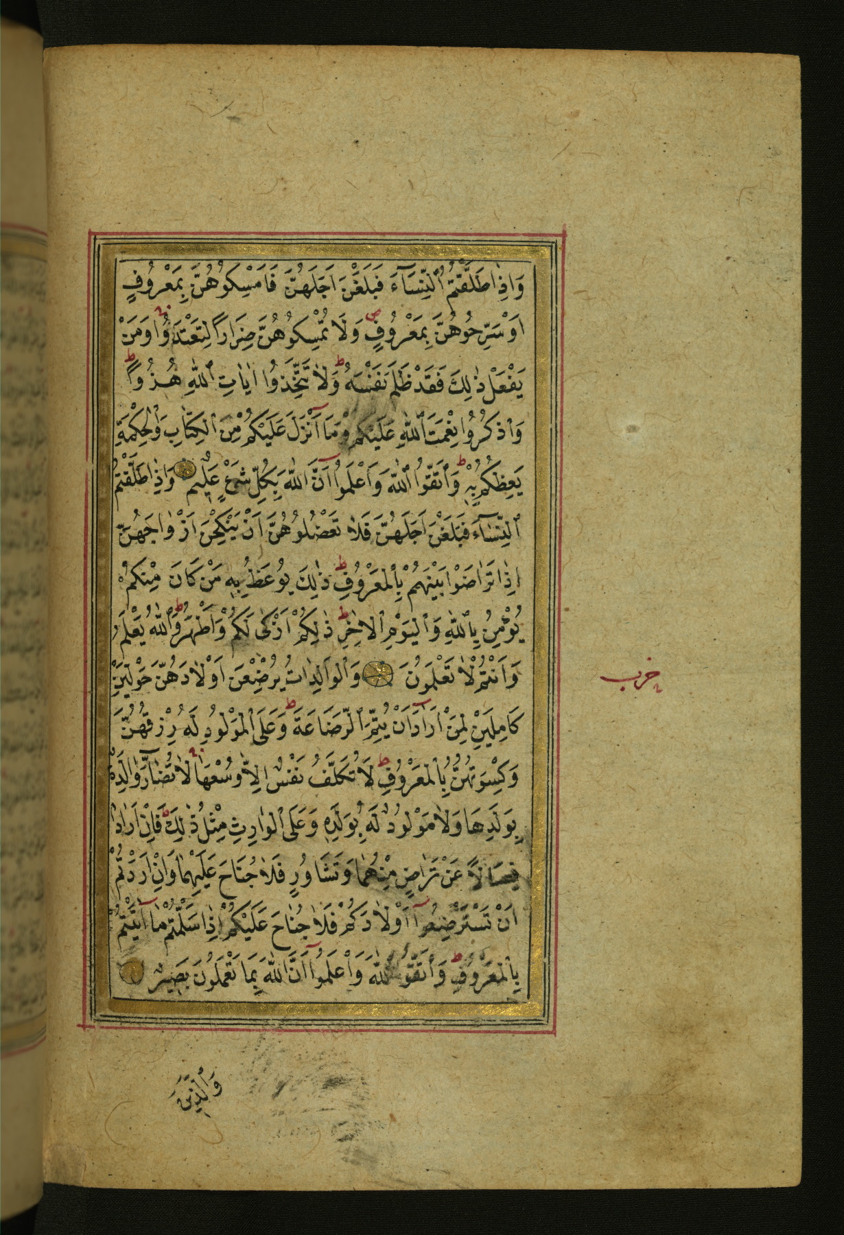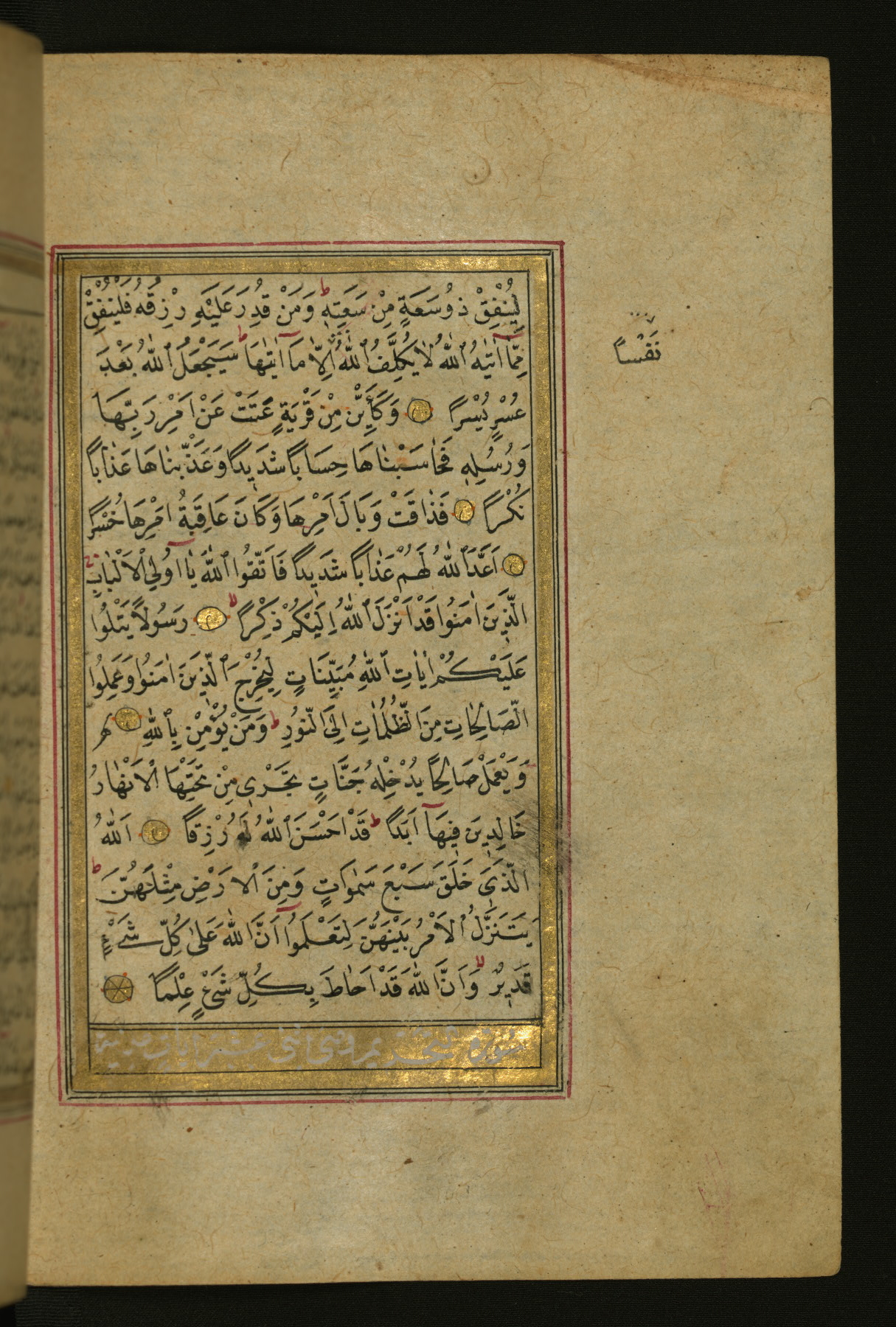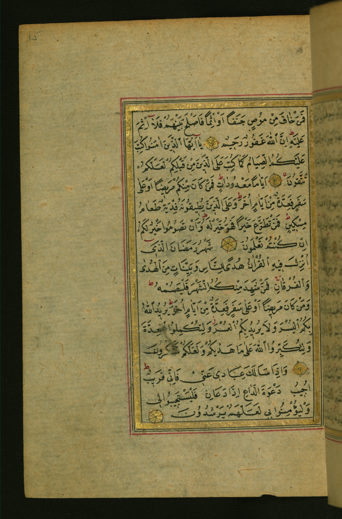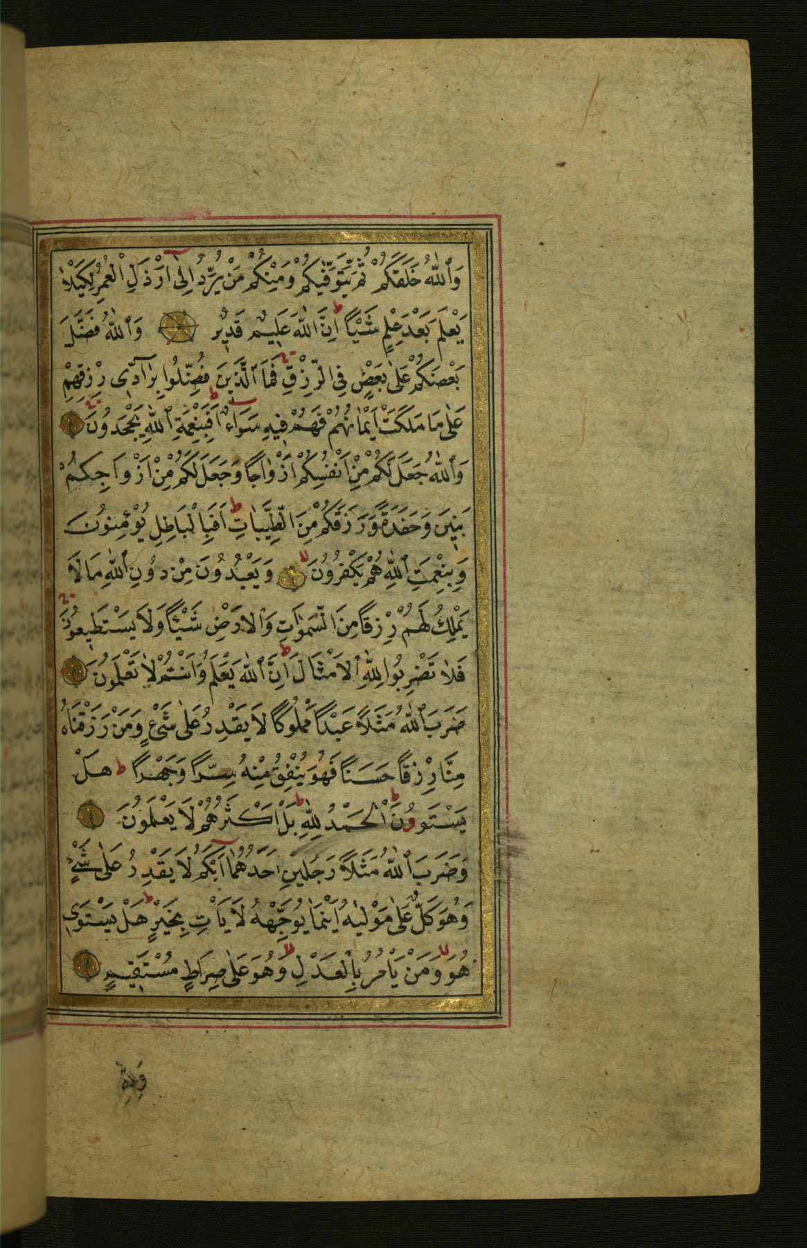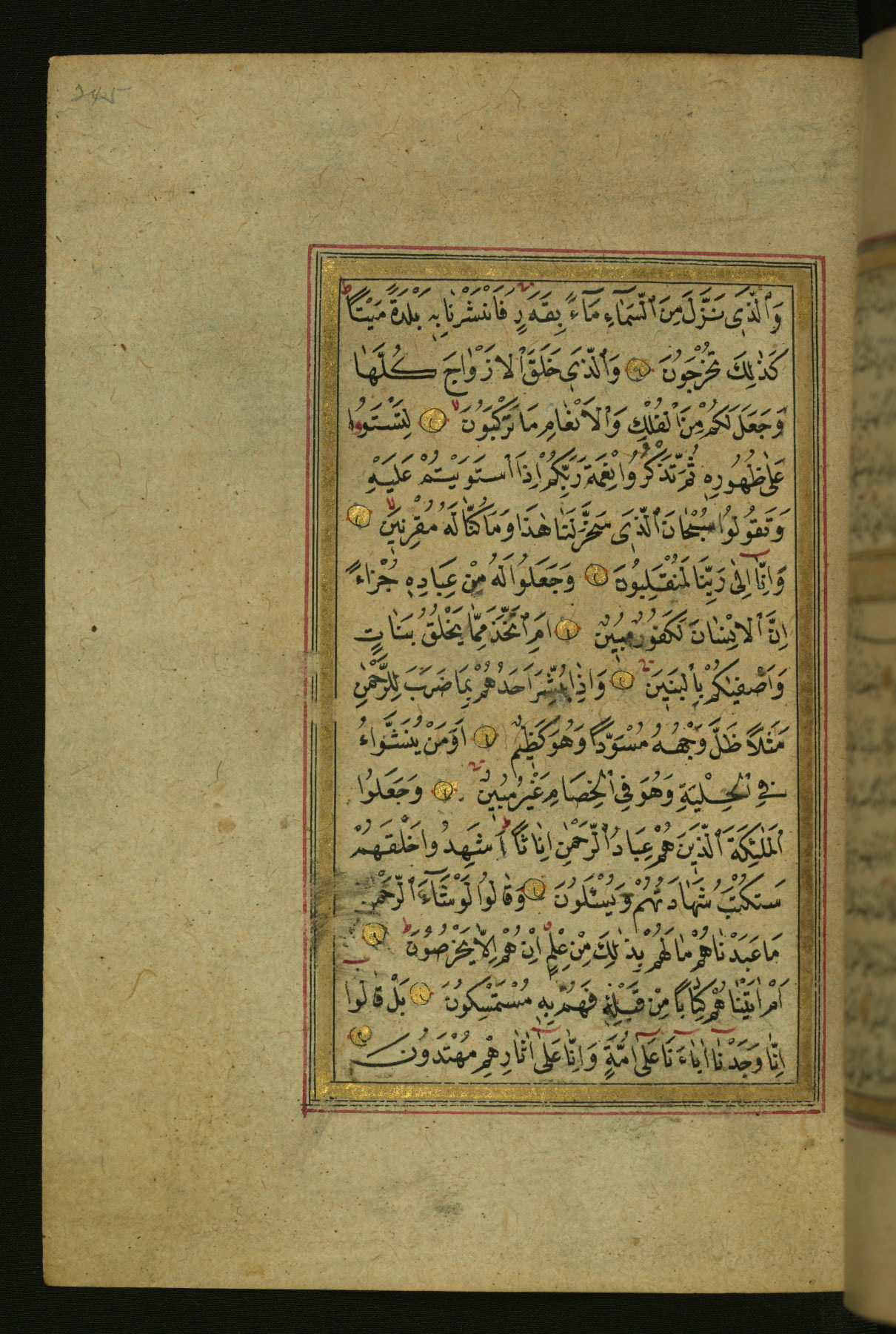 This small, illuminated single-volume copy of the Qurʾan was produced in Ottoman Turkey in 1282 AH / 1865-6 CE by Muḥammad ibn Muṣṭafá Izmīrī, a pupil of al-Rudūsī. The colophon in ijāzah script indicates that the present codex is the twenty-first copy executed by him (fol. 304b). The manuscript opens with an illuminated double-page incipit with the verses of chapters 1 (Sūrat al-fātiḥah) and 2 (Sūrat al-baqarah) (fols. 1b-2a). The text is written in naskh script in black ink with reading marks in red. Verses are separated by illuminated discs with colored dots and chapter headings are in riqāʿ script in white ink. Polychrome medallions in the margins indicate textual divisions and prostration. The binding of black leather is contemporary with the manuscript and decorated with a tooled and gold-painted geometric design enclosed by gold frames on the upper and lower boards.
