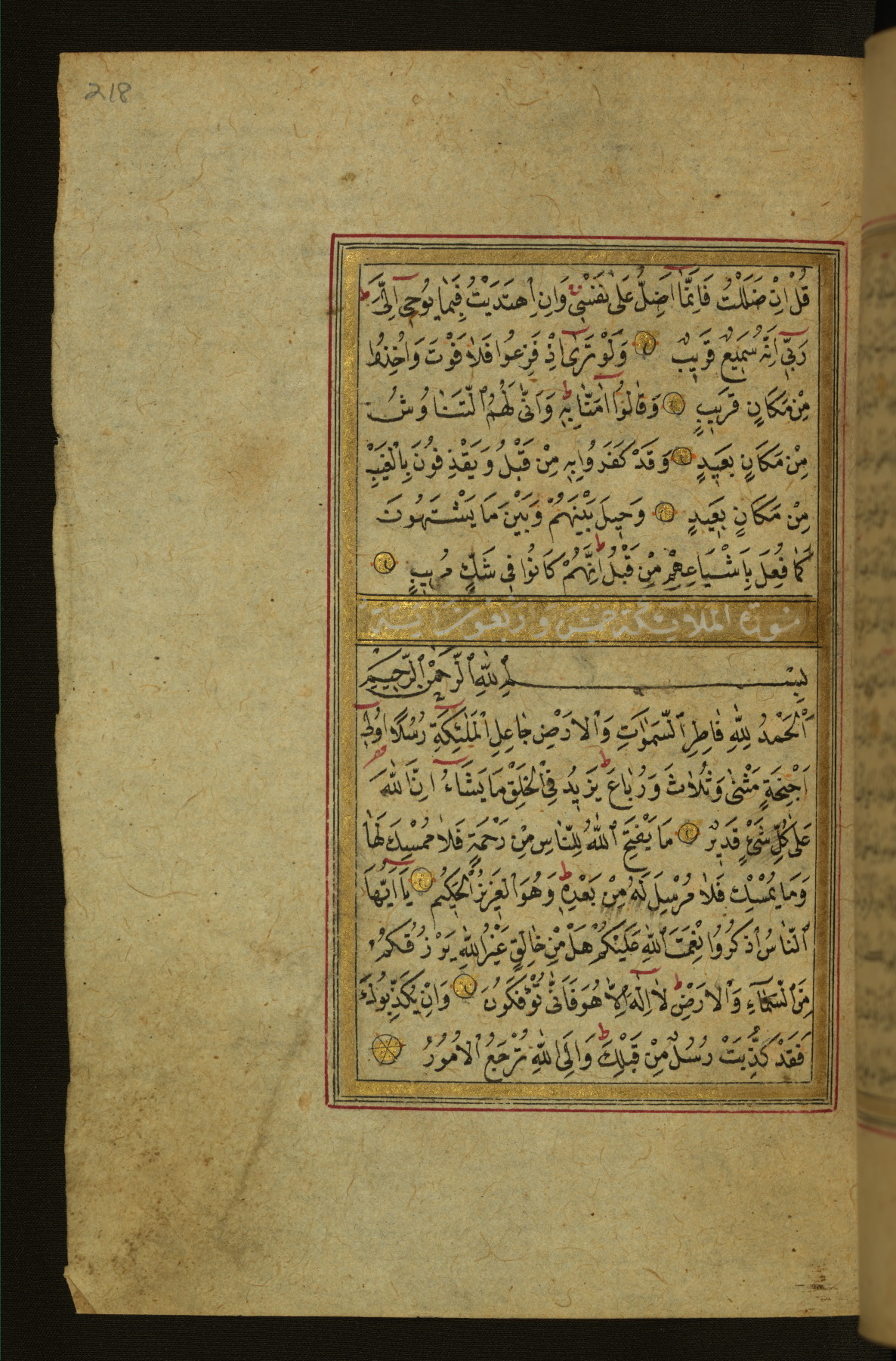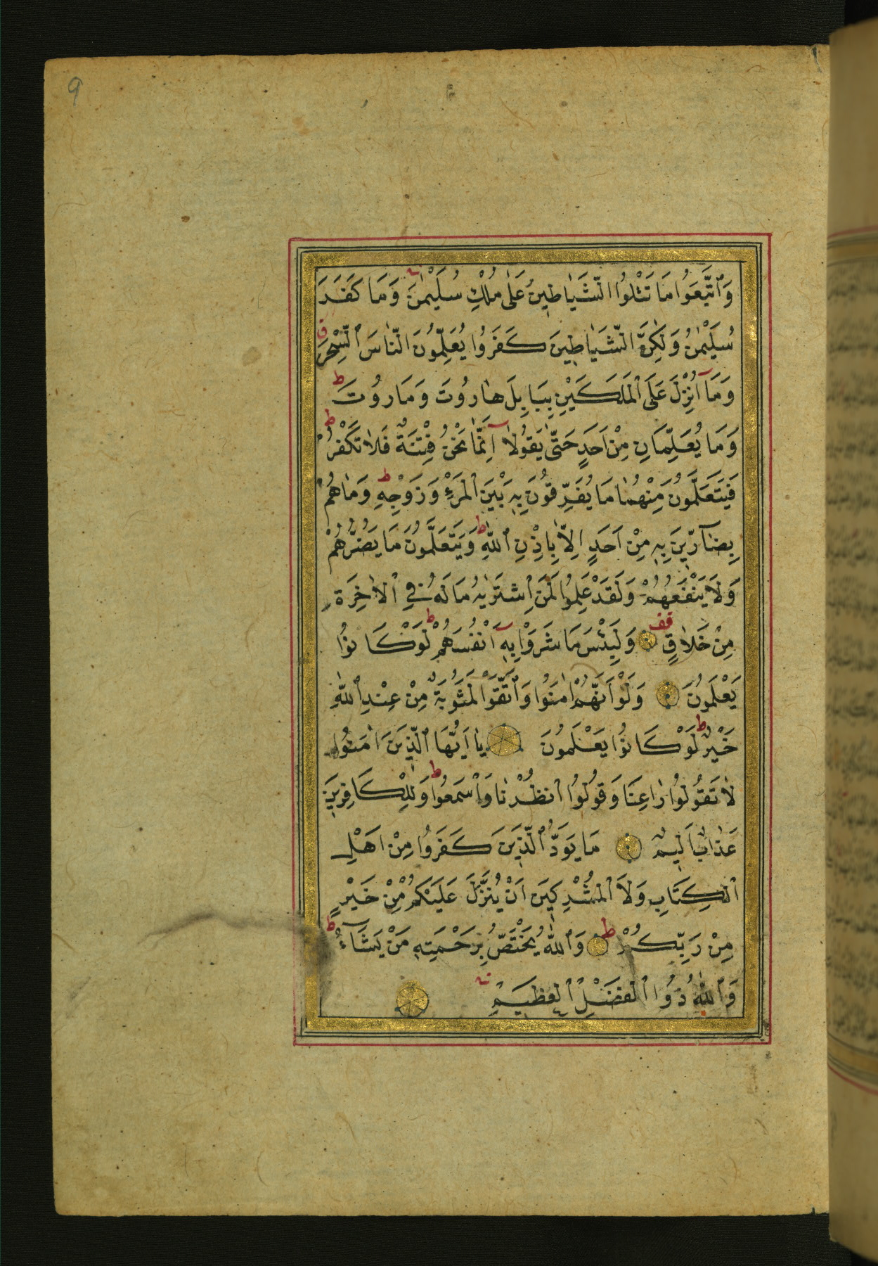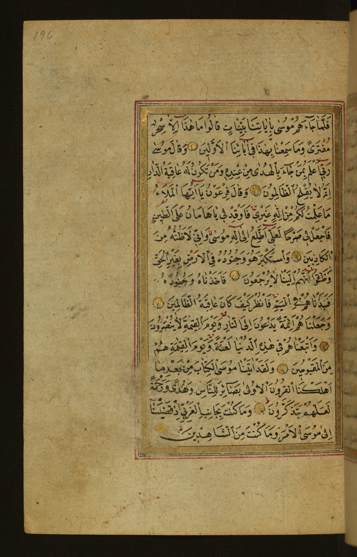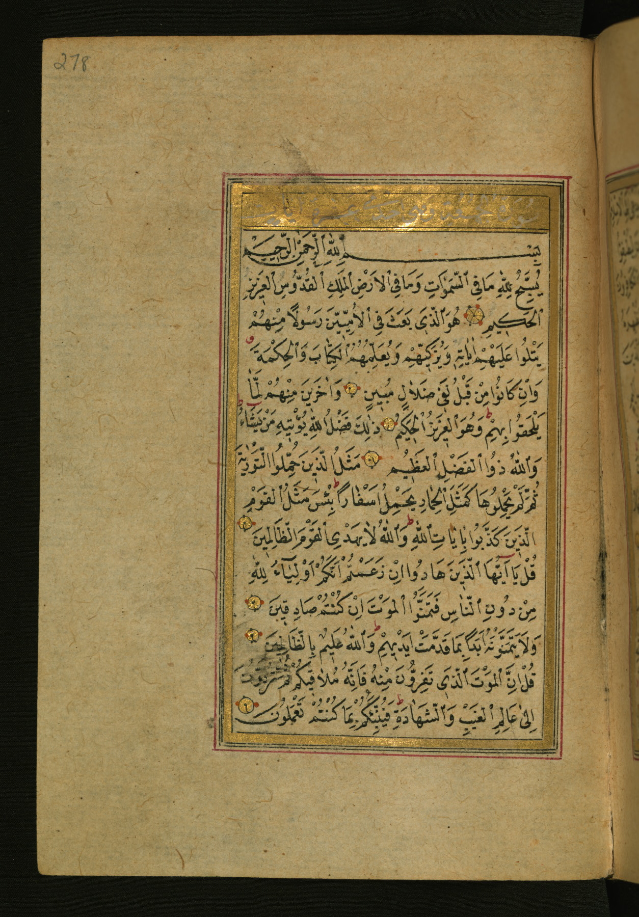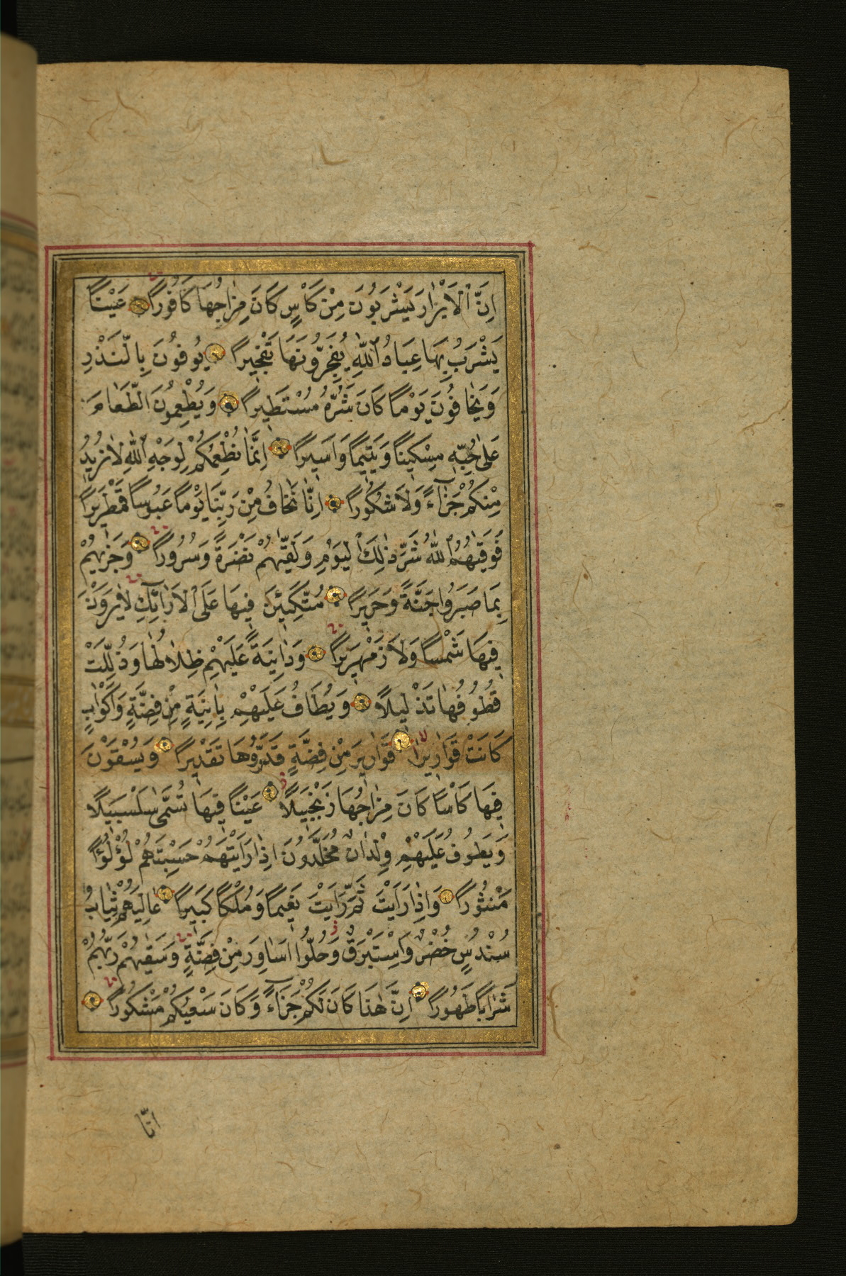 This small, illuminated single-volume copy of the Qurʾan was produced in Ottoman Turkey in 1282 AH / 1865-6 CE by Muḥammad ibn Muṣṭafá Izmīrī, a pupil of al-Rudūsī. The colophon in ijāzah script indicates that the present codex is the twenty-first copy executed by him (fol. 304b). The manuscript opens with an illuminated double-page incipit with the verses of chapters 1 (Sūrat al-fātiḥah) and 2 (Sūrat al-baqarah) (fols. 1b-2a). The text is written in naskh script in black ink with reading marks in red. Verses are separated by illuminated discs with colored dots and chapter headings are in riqāʿ script in white ink. Polychrome medallions in the margins indicate textual divisions and prostration. The binding of black leather is contemporary with the manuscript and decorated with a tooled and gold-painted geometric design enclosed by gold frames on the upper and lower boards.