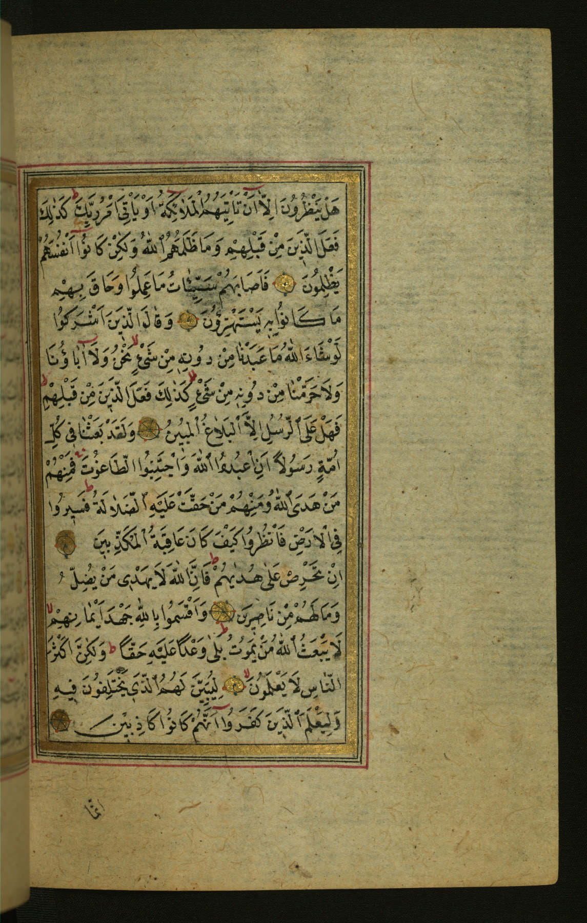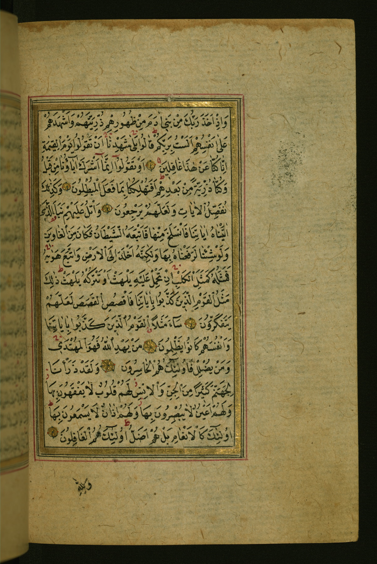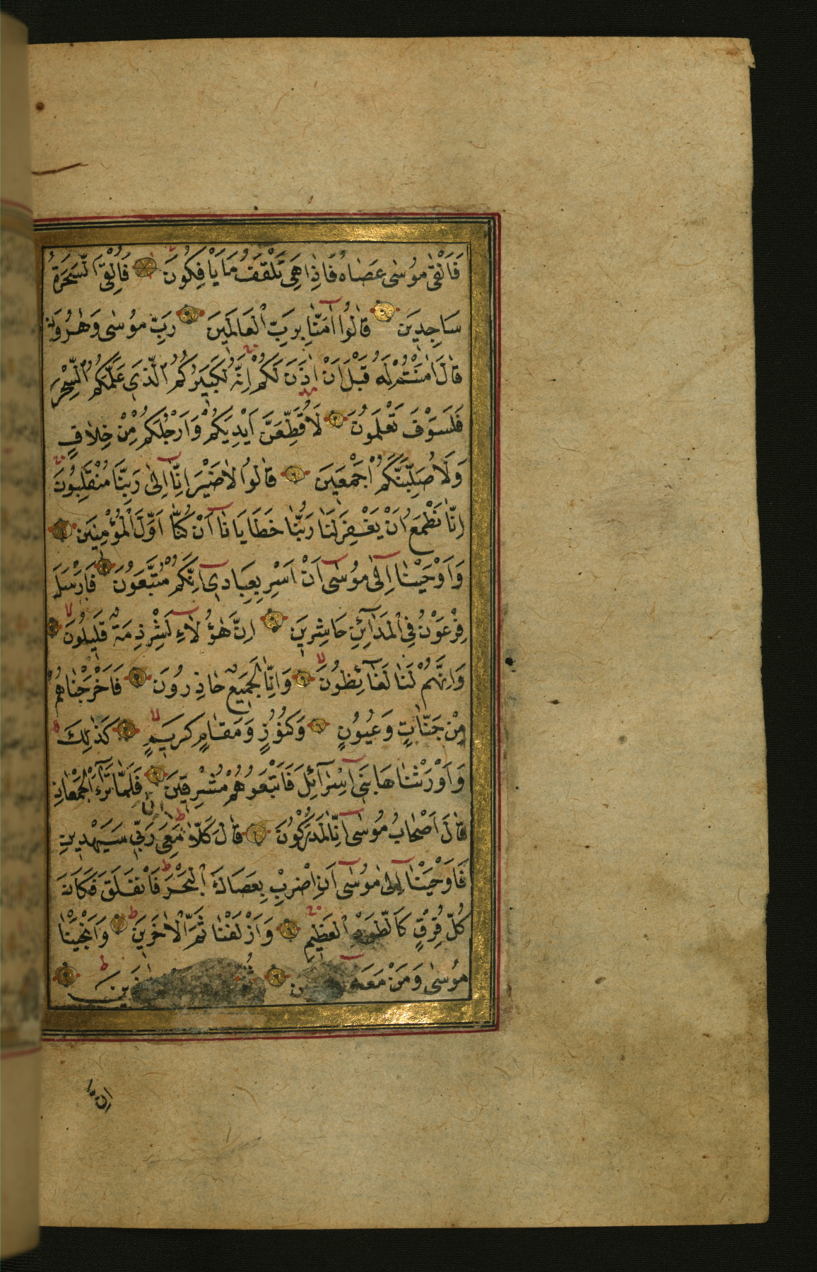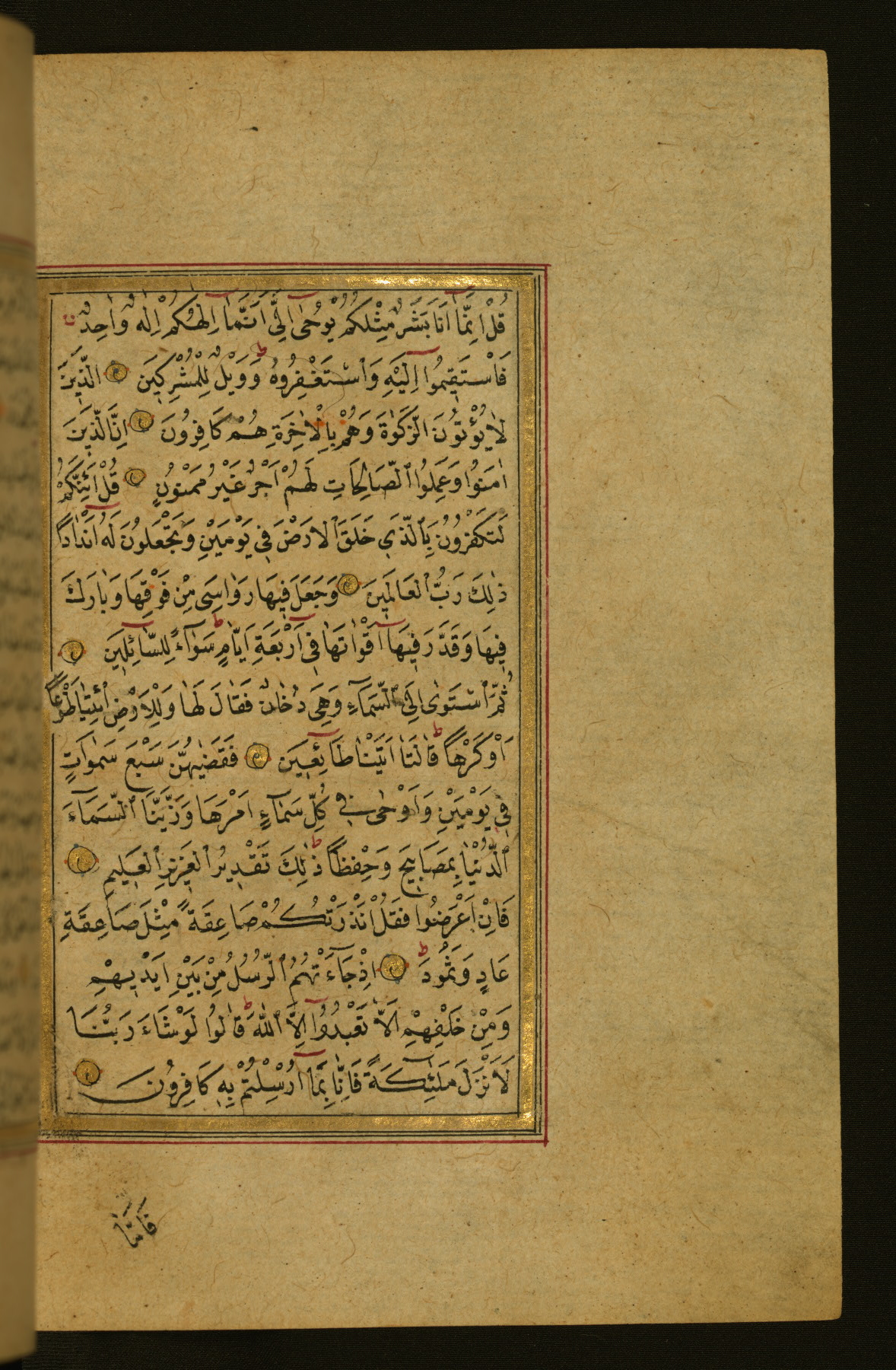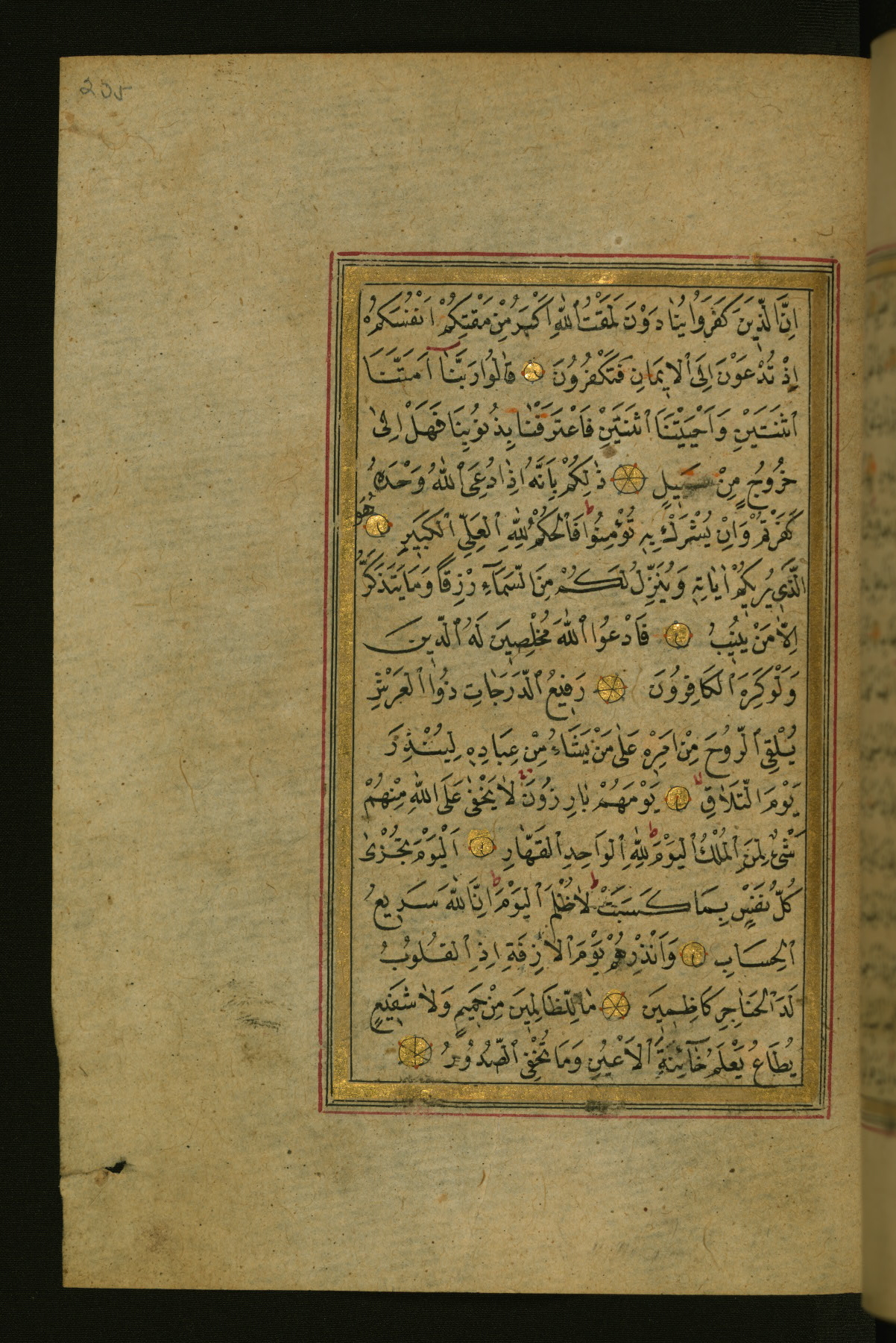 This small, illuminated single-volume copy of the Qurʾan was produced in Ottoman Turkey in 1282 AH / 1865-6 CE by Muḥammad ibn Muṣṭafá Izmīrī, a pupil of al-Rudūsī. The colophon in ijāzah script indicates that the present codex is the twenty-first copy executed by him (fol. 304b). The manuscript opens with an illuminated double-page incipit with the verses of chapters 1 (Sūrat al-fātiḥah) and 2 (Sūrat al-baqarah) (fols. 1b-2a). The text is written in naskh script in black ink with reading marks in red. Verses are separated by illuminated discs with colored dots and chapter headings are in riqāʿ script in white ink. Polychrome medallions in the margins indicate textual divisions and prostration. The binding of black leather is contemporary with the manuscript and decorated with a tooled and gold-painted geometric design enclosed by gold frames on the upper and lower boards.