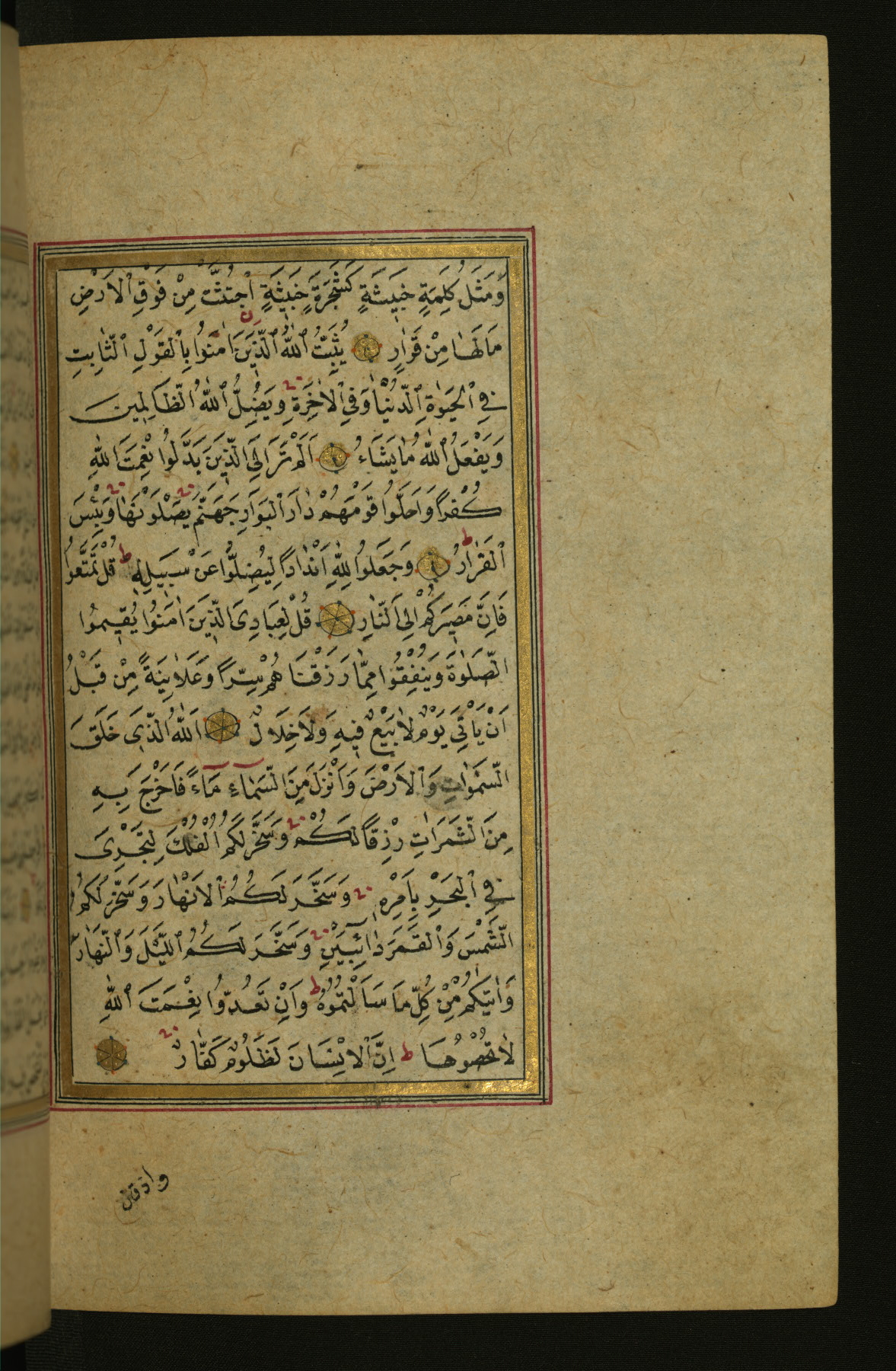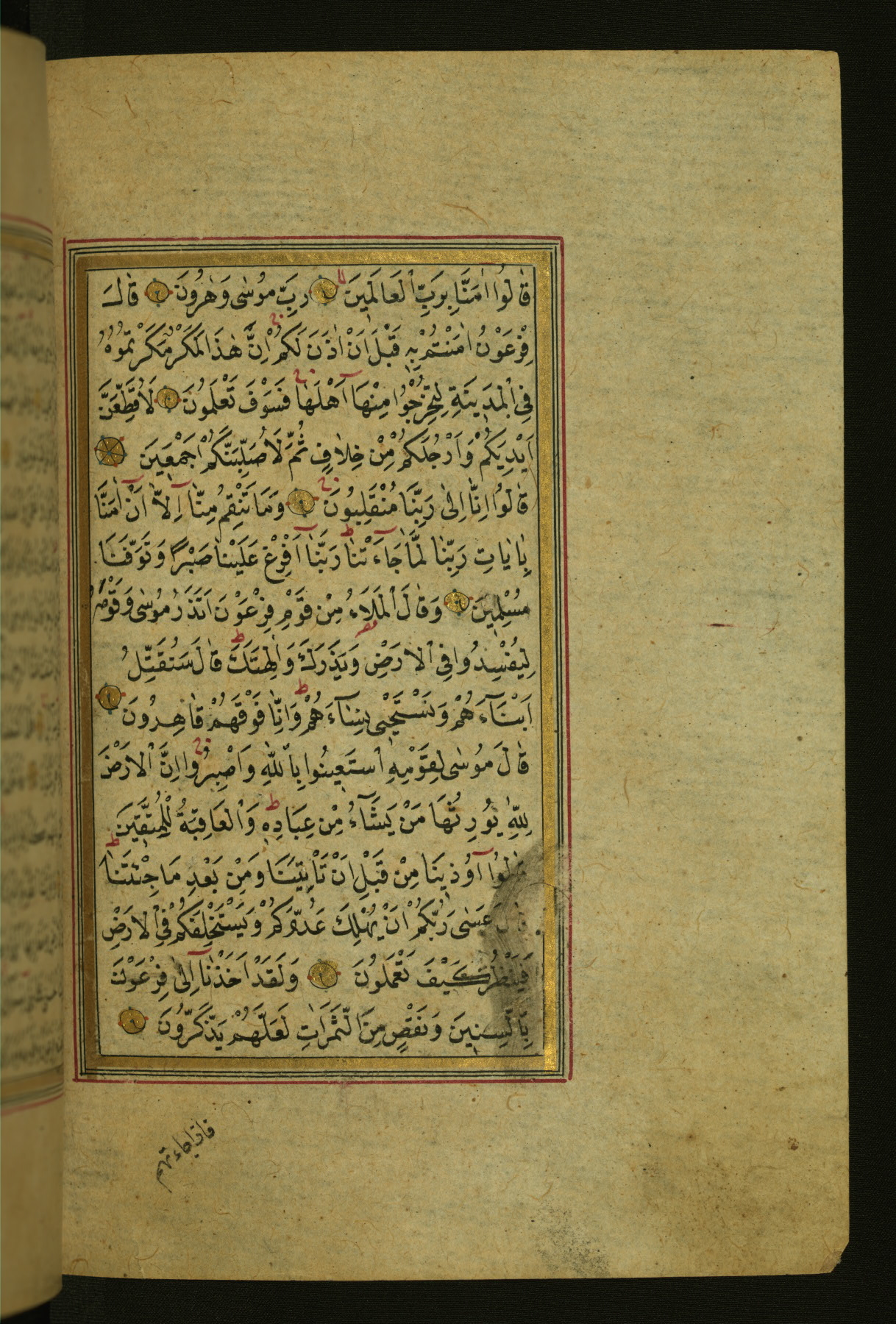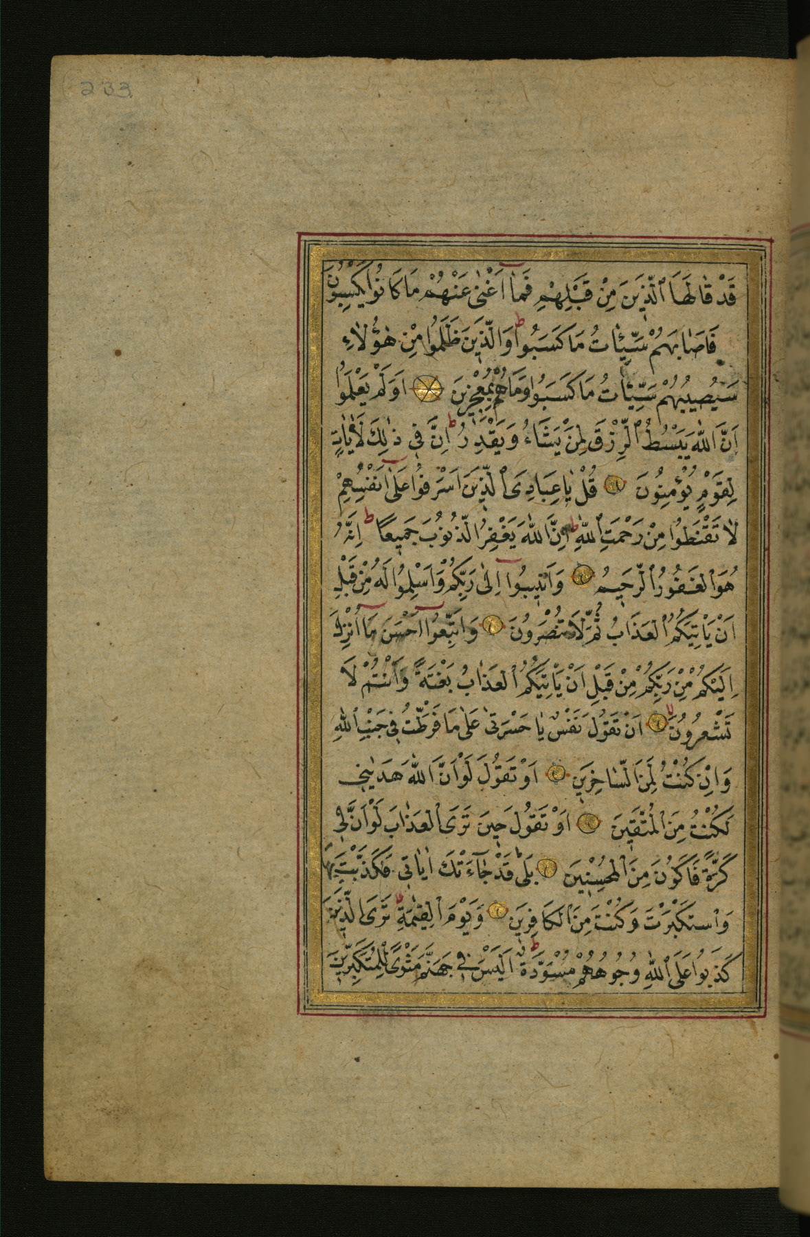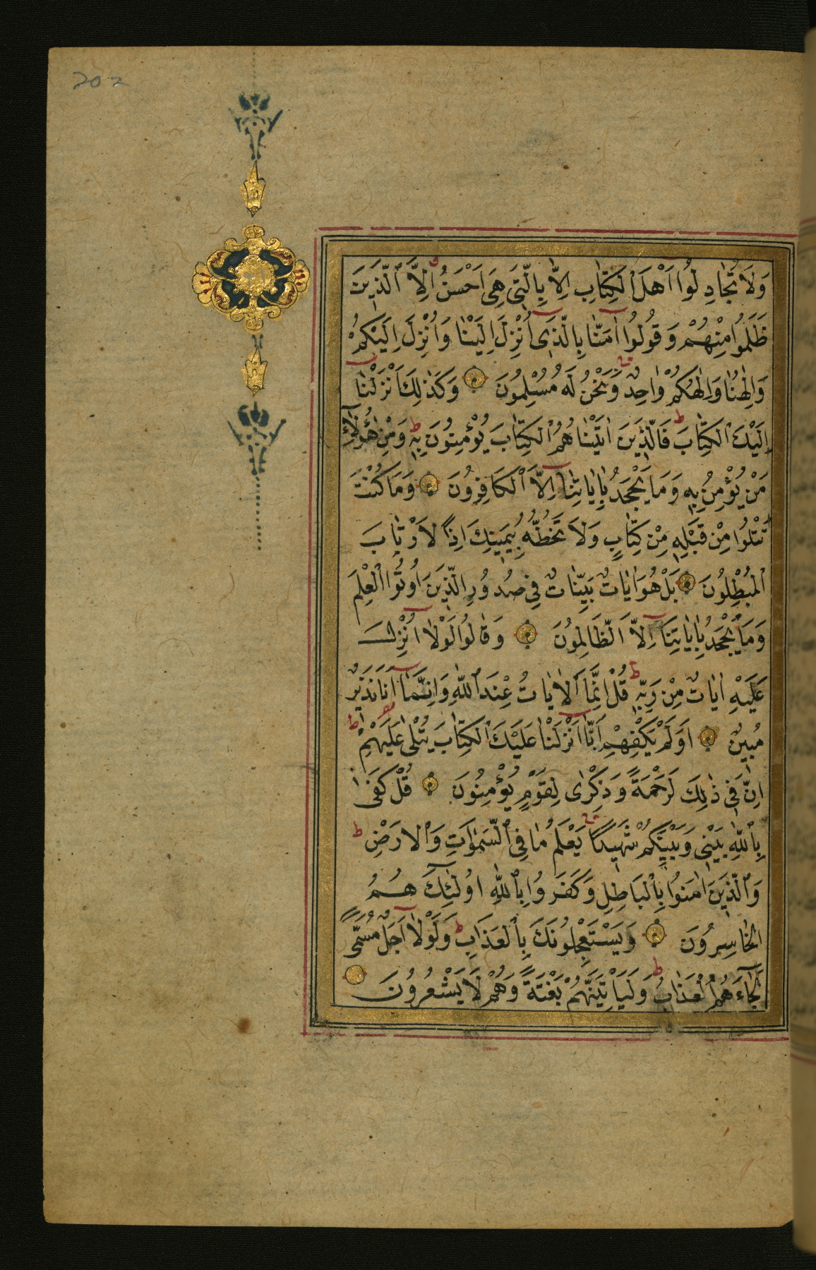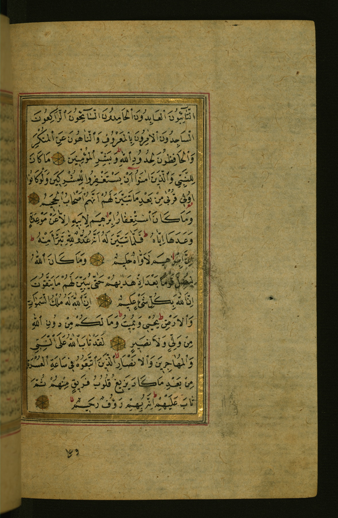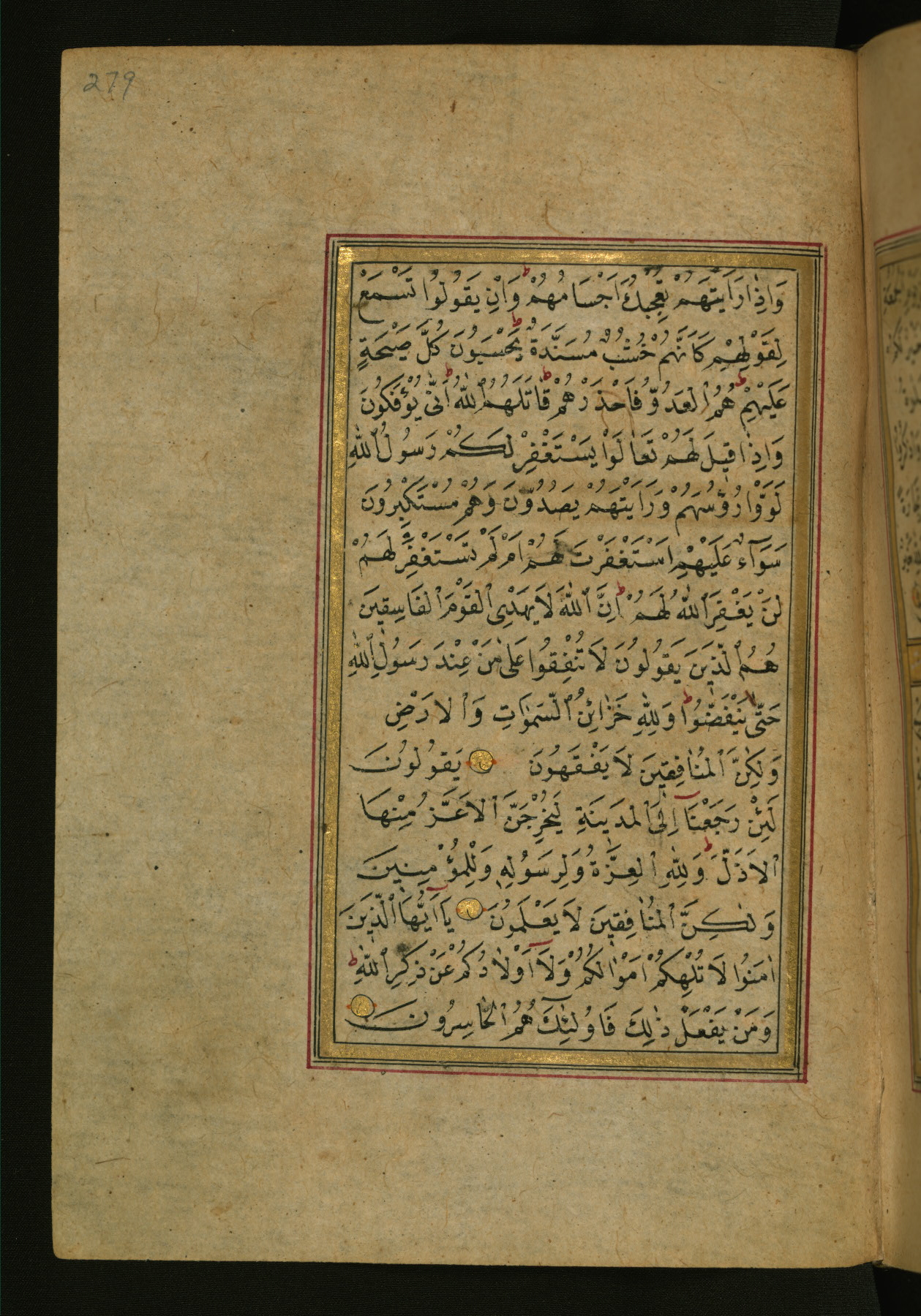 This small, illuminated single-volume copy of the Qurʾan was produced in Ottoman Turkey in 1282 AH / 1865-6 CE by Muḥammad ibn Muṣṭafá Izmīrī, a pupil of al-Rudūsī. The colophon in ijāzah script indicates that the present codex is the twenty-first copy executed by him (fol. 304b). The manuscript opens with an illuminated double-page incipit with the verses of chapters 1 (Sūrat al-fātiḥah) and 2 (Sūrat al-baqarah) (fols. 1b-2a). The text is written in naskh script in black ink with reading marks in red. Verses are separated by illuminated discs with colored dots and chapter headings are in riqāʿ script in white ink. Polychrome medallions in the margins indicate textual divisions and prostration. The binding of black leather is contemporary with the manuscript and decorated with a tooled and gold-painted geometric design enclosed by gold frames on the upper and lower boards.