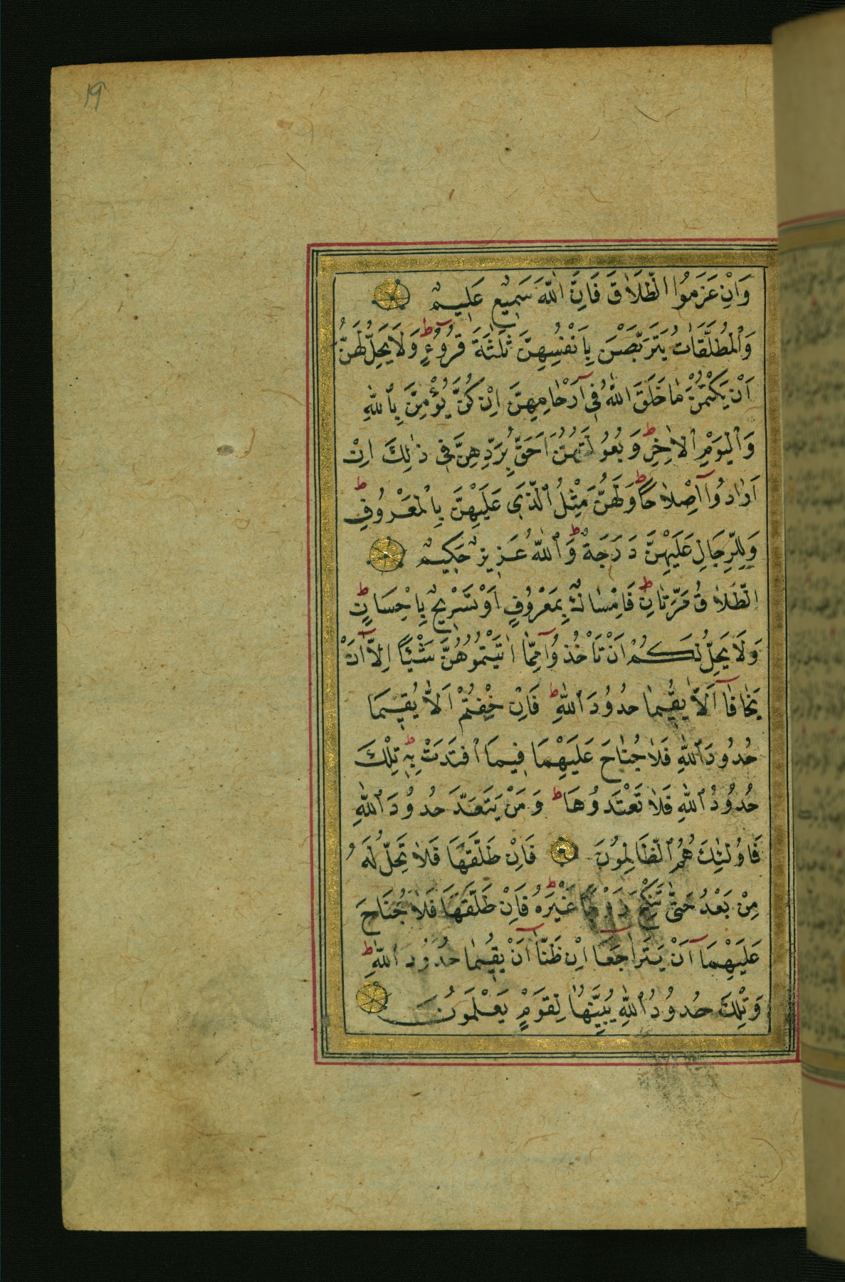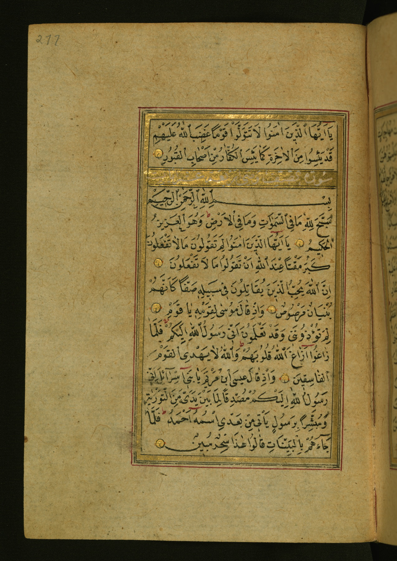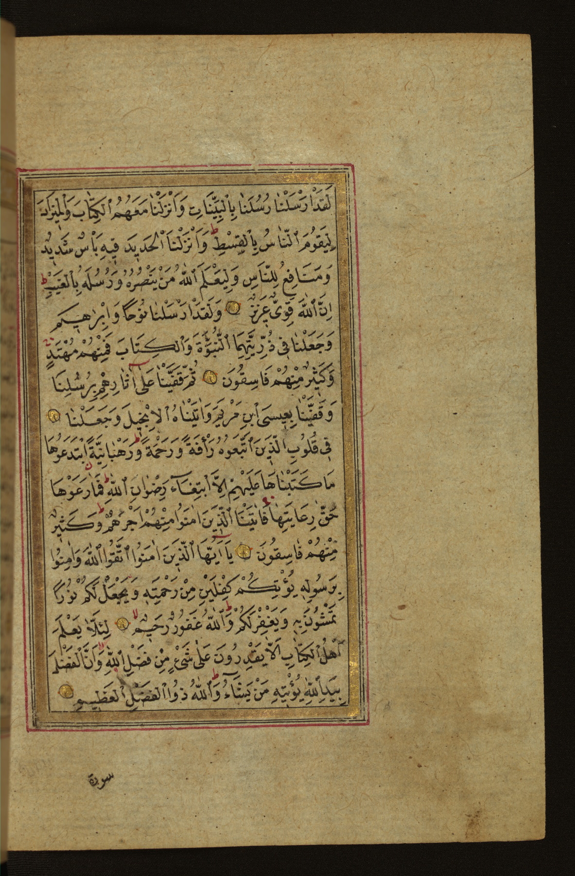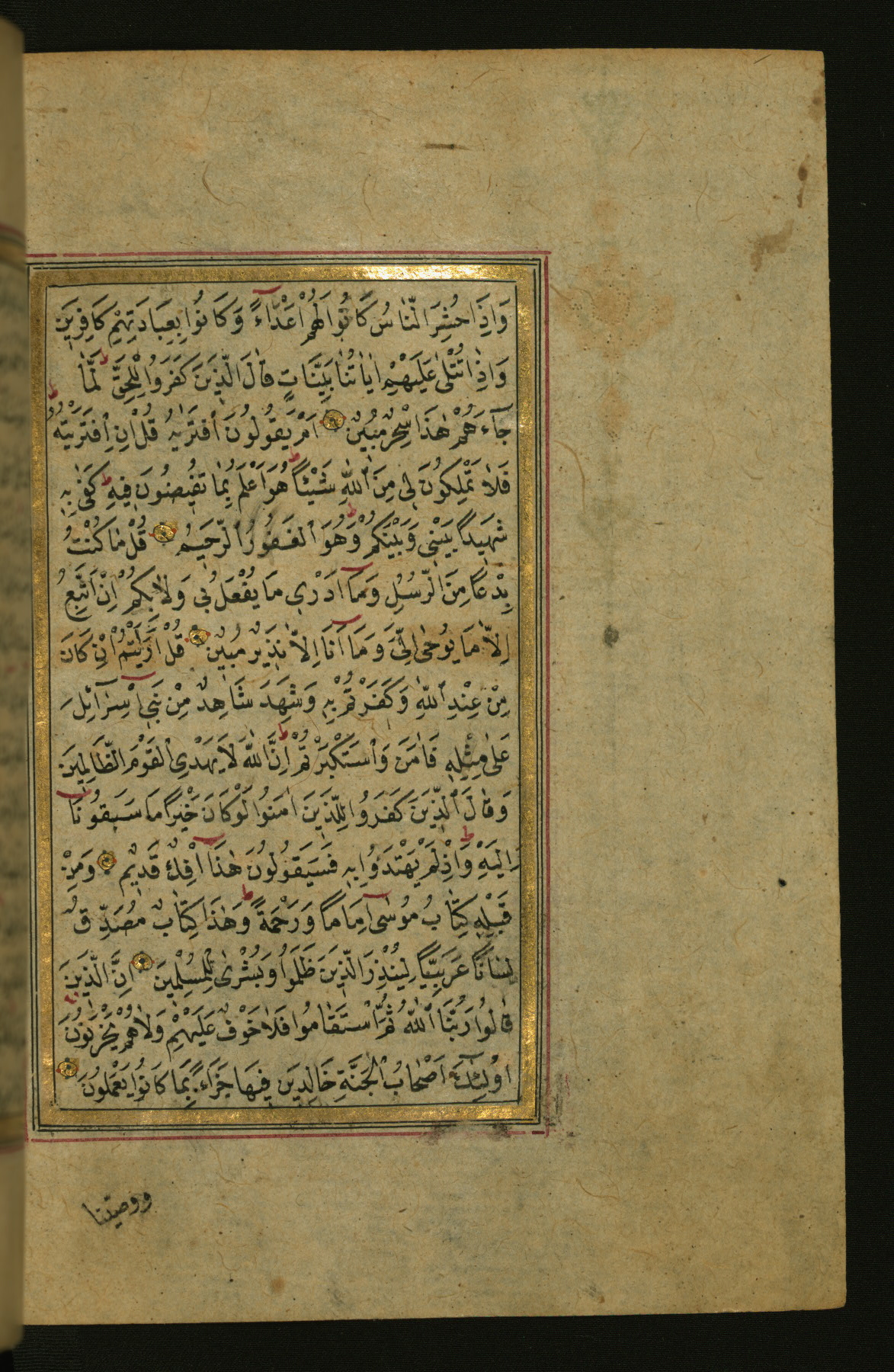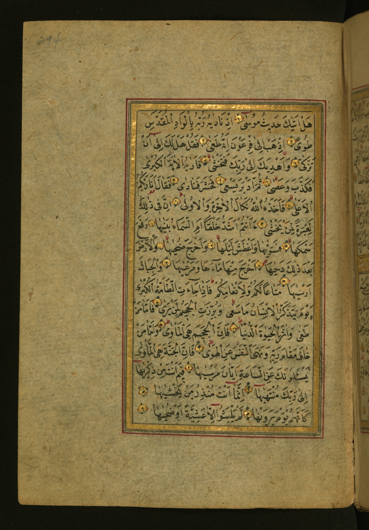 This small, illuminated single-volume copy of the Qurʾan was produced in Ottoman Turkey in 1282 AH / 1865-6 CE by Muḥammad ibn Muṣṭafá Izmīrī, a pupil of al-Rudūsī. The colophon in ijāzah script indicates that the present codex is the twenty-first copy executed by him (fol. 304b). The manuscript opens with an illuminated double-page incipit with the verses of chapters 1 (Sūrat al-fātiḥah) and 2 (Sūrat al-baqarah) (fols. 1b-2a). The text is written in naskh script in black ink with reading marks in red. Verses are separated by illuminated discs with colored dots and chapter headings are in riqāʿ script in white ink. Polychrome medallions in the margins indicate textual divisions and prostration. The binding of black leather is contemporary with the manuscript and decorated with a tooled and gold-painted geometric design enclosed by gold frames on the upper and lower boards.