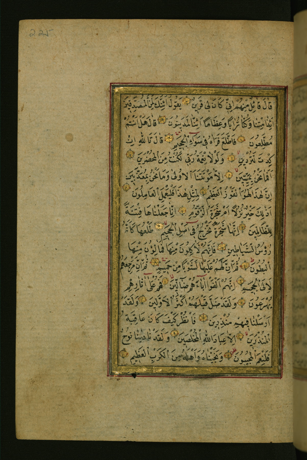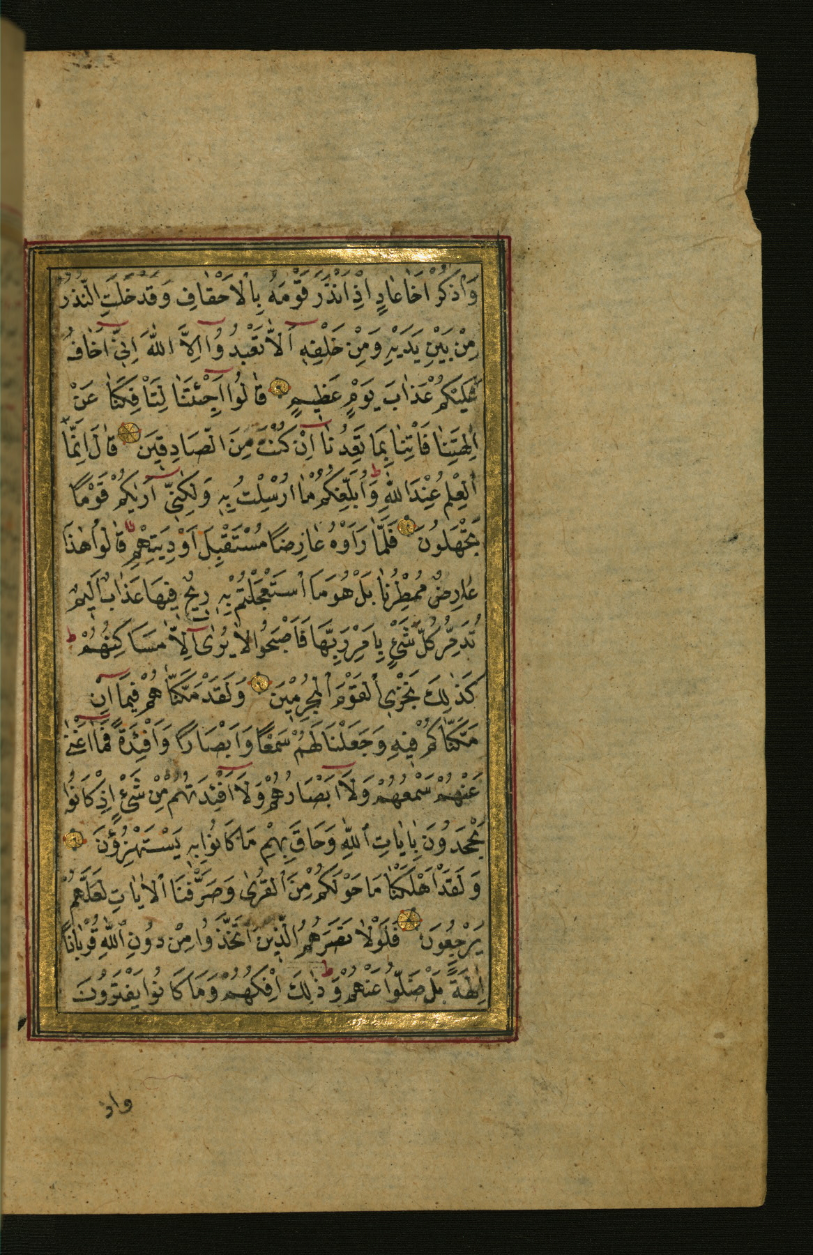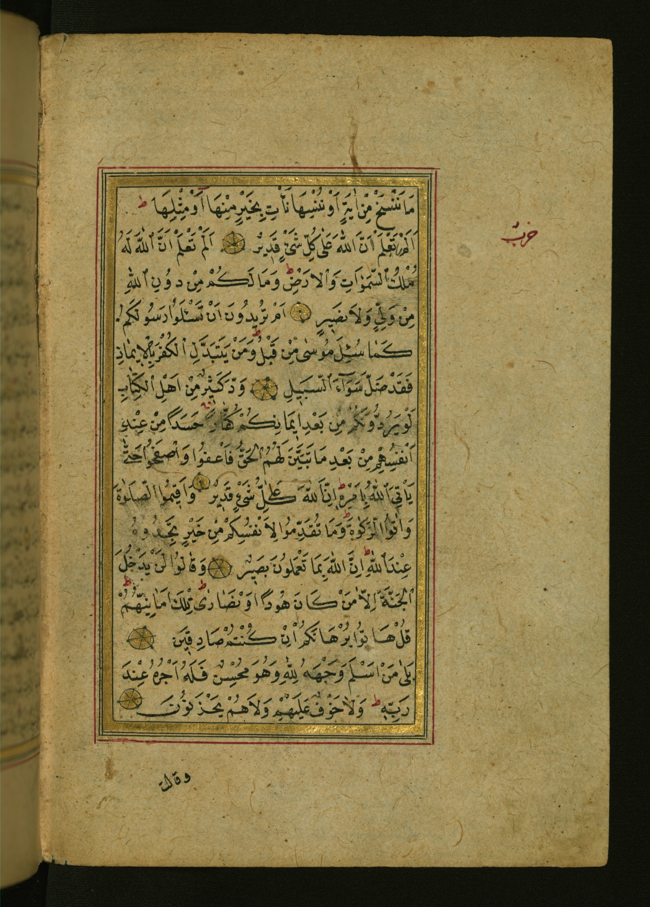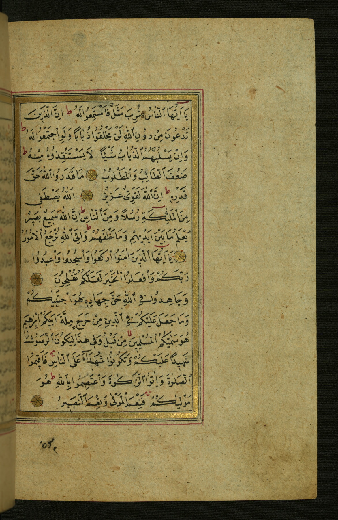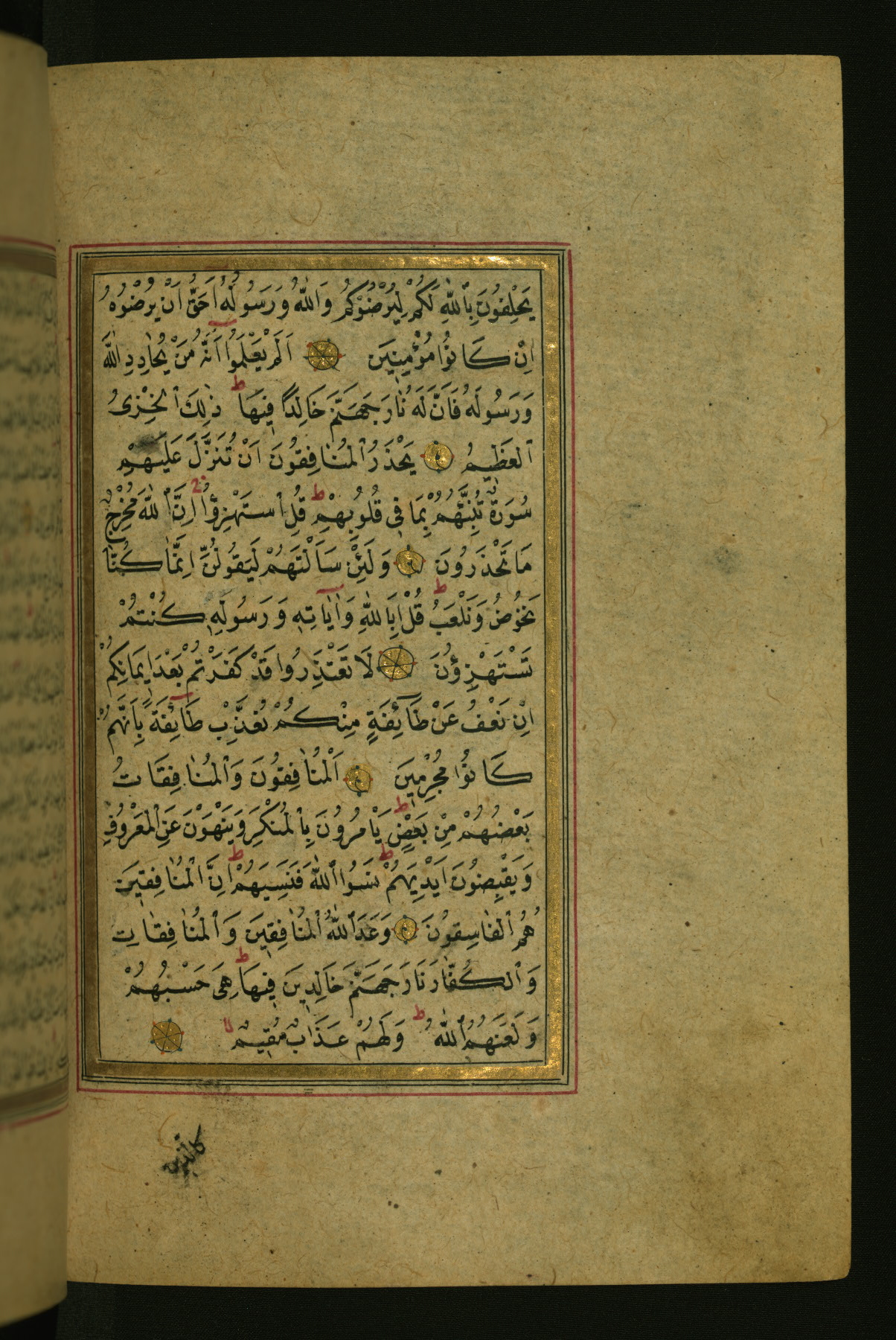 This small, illuminated single-volume copy of the Qurʾan was produced in Ottoman Turkey in 1282 AH / 1865-6 CE by Muḥammad ibn Muṣṭafá Izmīrī, a pupil of al-Rudūsī. The colophon in ijāzah script indicates that the present codex is the twenty-first copy executed by him (fol. 304b). The manuscript opens with an illuminated double-page incipit with the verses of chapters 1 (Sūrat al-fātiḥah) and 2 (Sūrat al-baqarah) (fols. 1b-2a). The text is written in naskh script in black ink with reading marks in red. Verses are separated by illuminated discs with colored dots and chapter headings are in riqāʿ script in white ink. Polychrome medallions in the margins indicate textual divisions and prostration. The binding of black leather is contemporary with the manuscript and decorated with a tooled and gold-painted geometric design enclosed by gold frames on the upper and lower boards.