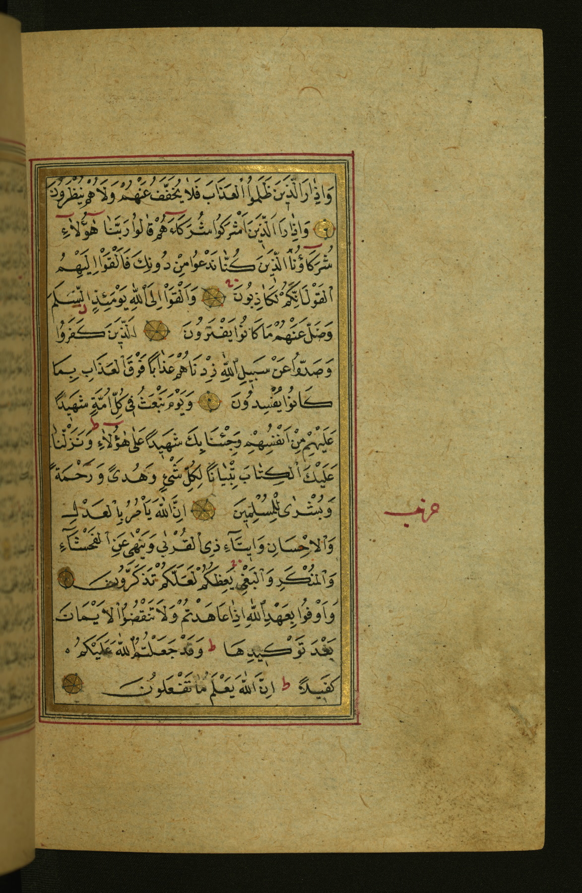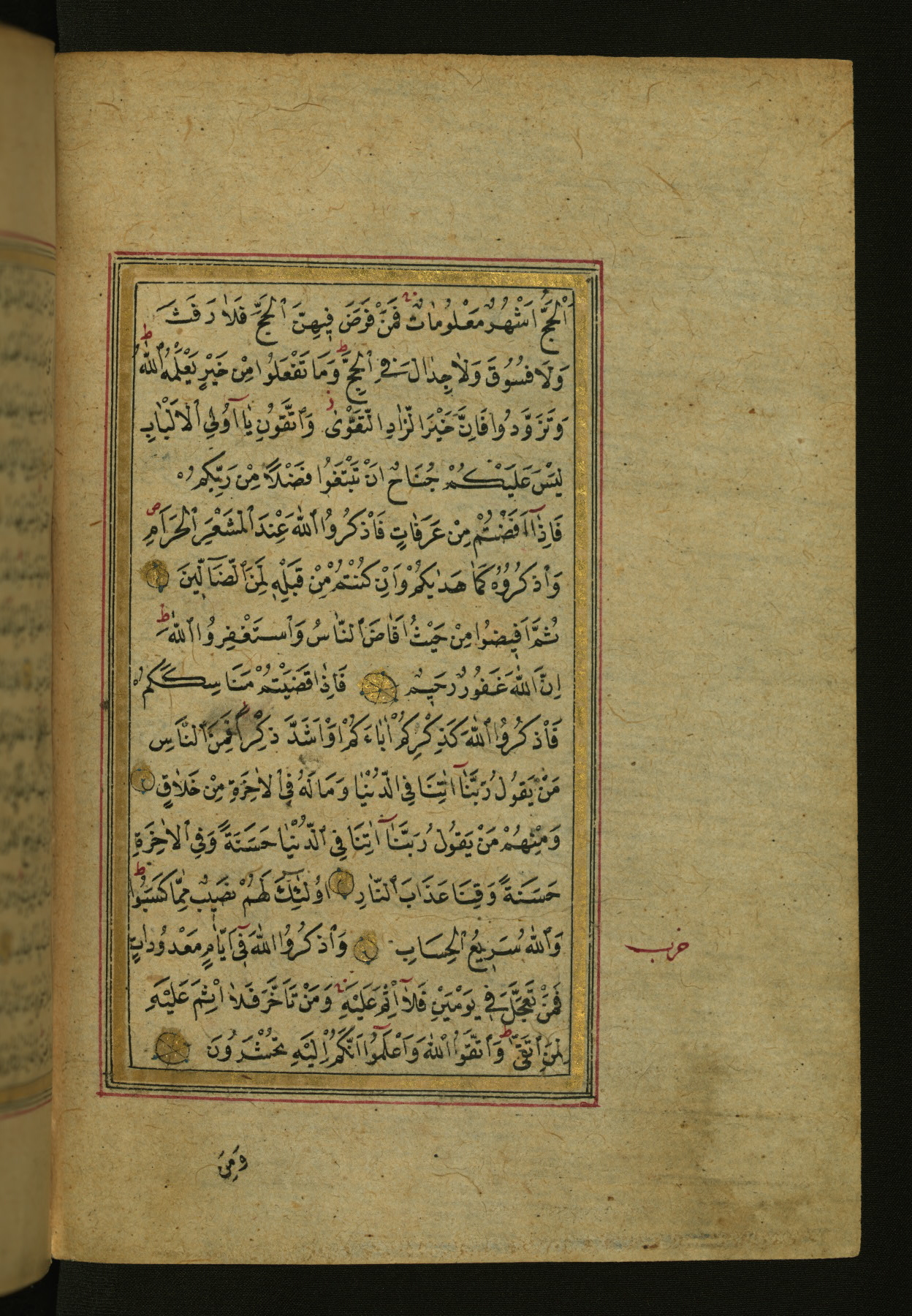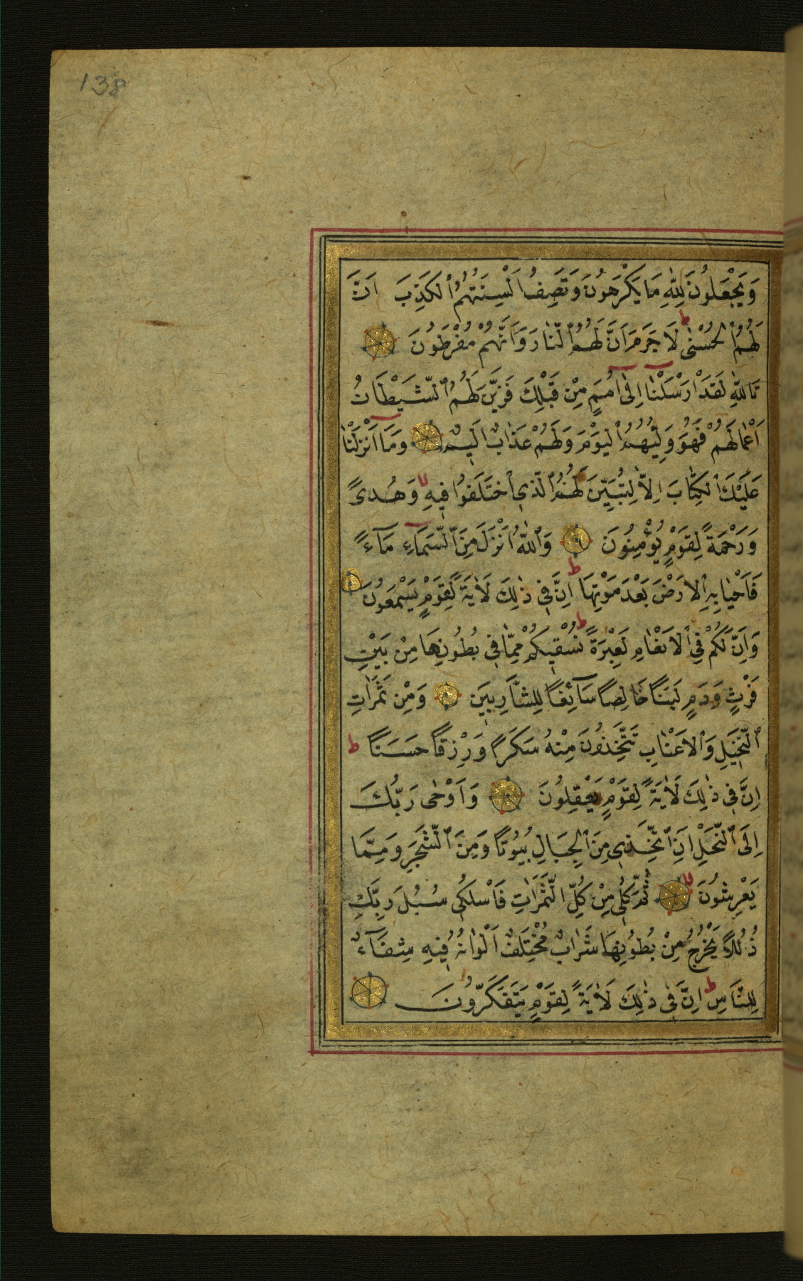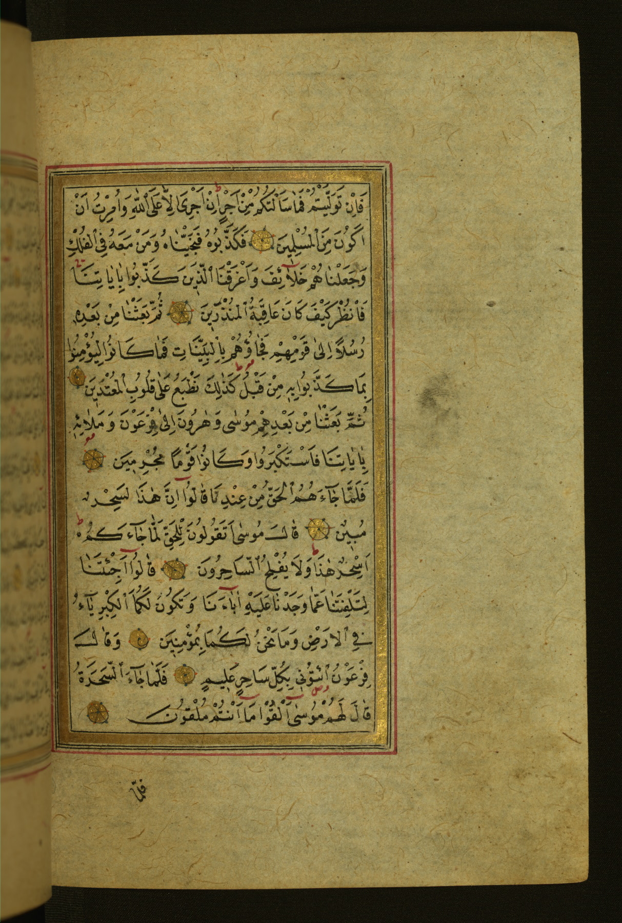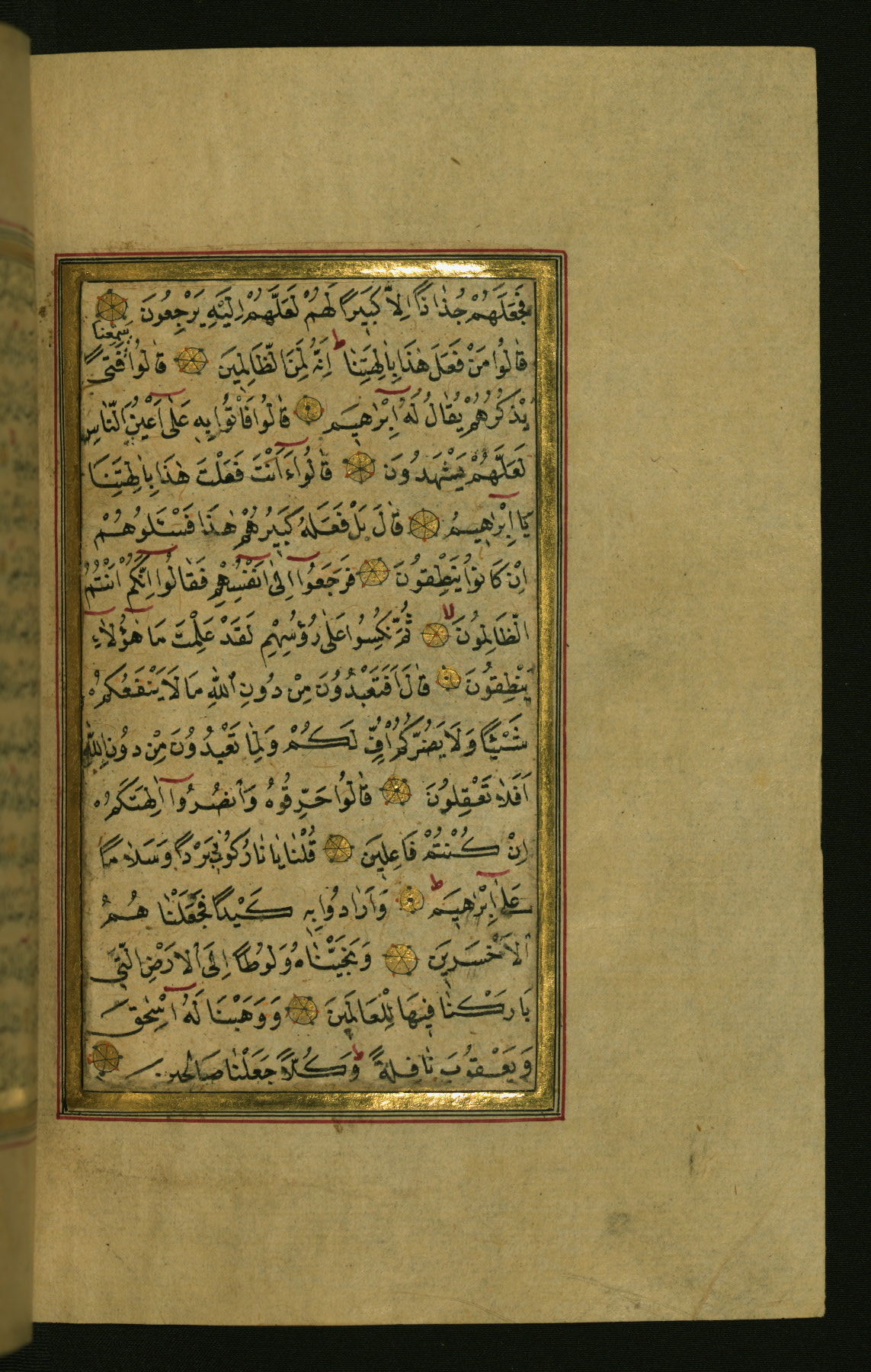 This small, illuminated single-volume copy of the Qurʾan was produced in Ottoman Turkey in 1282 AH / 1865-6 CE by Muḥammad ibn Muṣṭafá Izmīrī, a pupil of al-Rudūsī. The colophon in ijāzah script indicates that the present codex is the twenty-first copy executed by him (fol. 304b). The manuscript opens with an illuminated double-page incipit with the verses of chapters 1 (Sūrat al-fātiḥah) and 2 (Sūrat al-baqarah) (fols. 1b-2a). The text is written in naskh script in black ink with reading marks in red. Verses are separated by illuminated discs with colored dots and chapter headings are in riqāʿ script in white ink. Polychrome medallions in the margins indicate textual divisions and prostration. The binding of black leather is contemporary with the manuscript and decorated with a tooled and gold-painted geometric design enclosed by gold frames on the upper and lower boards.