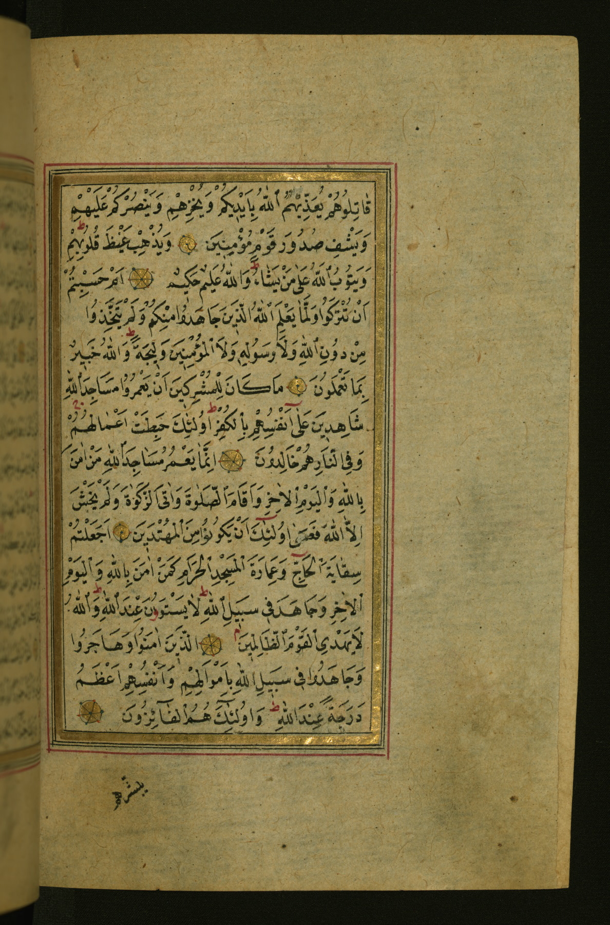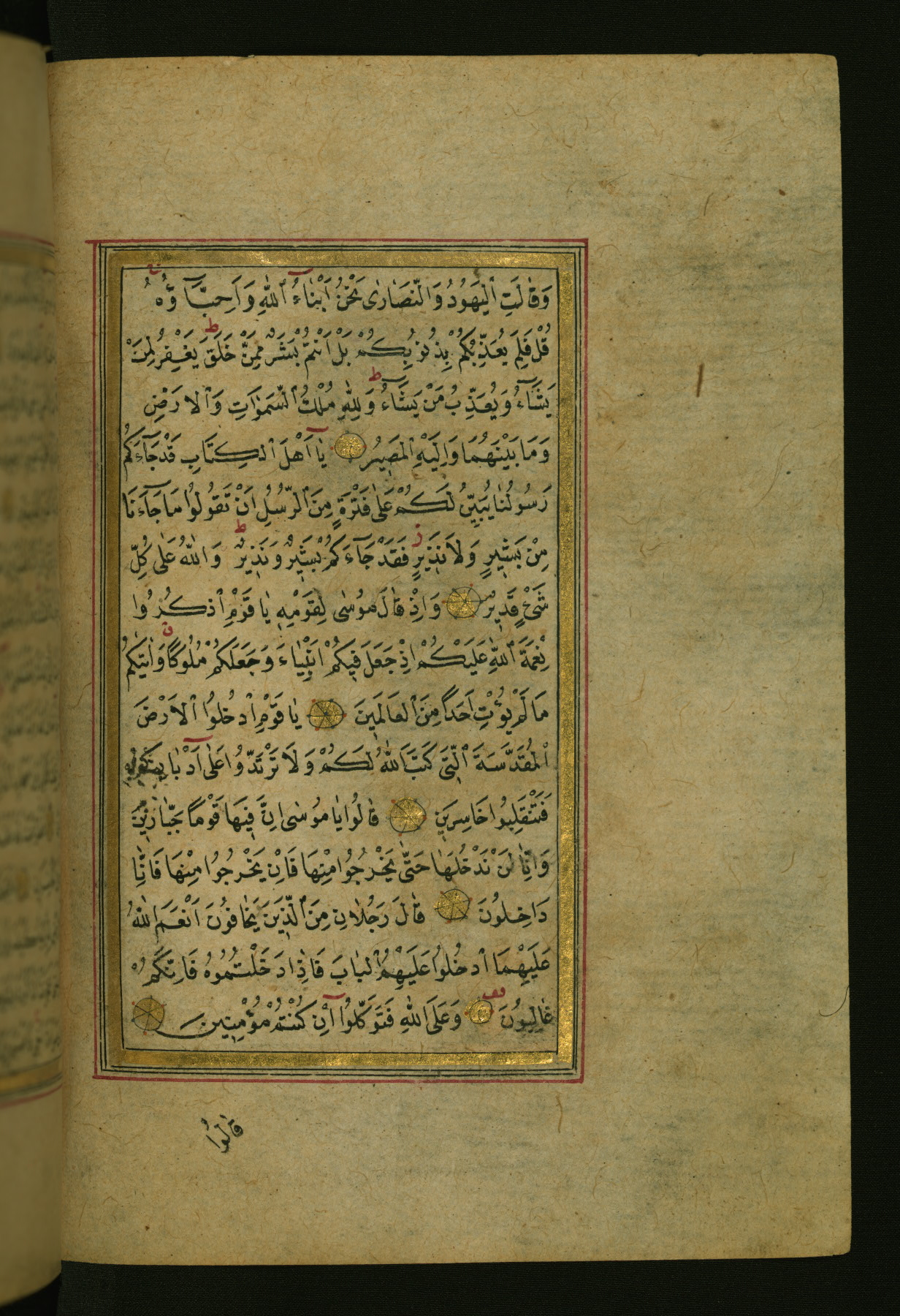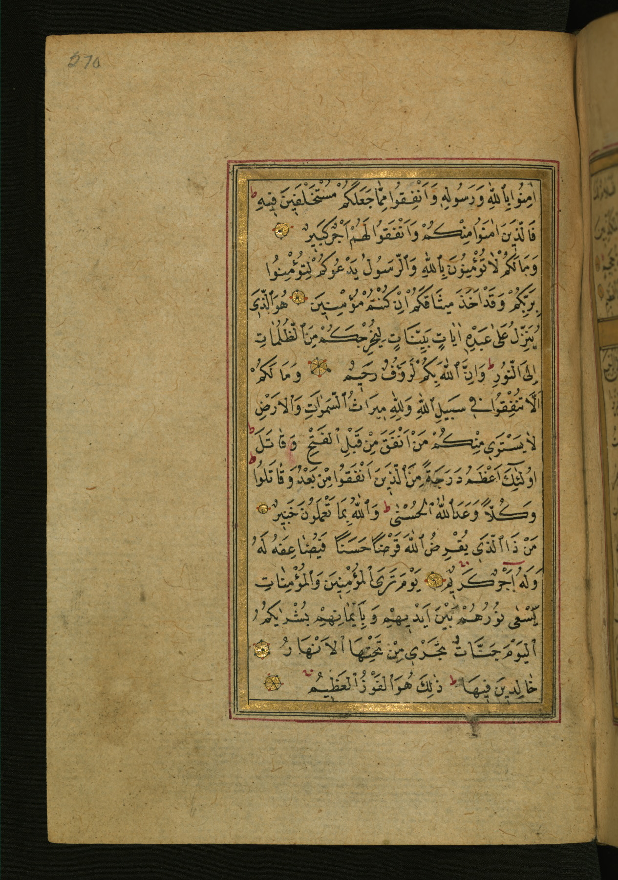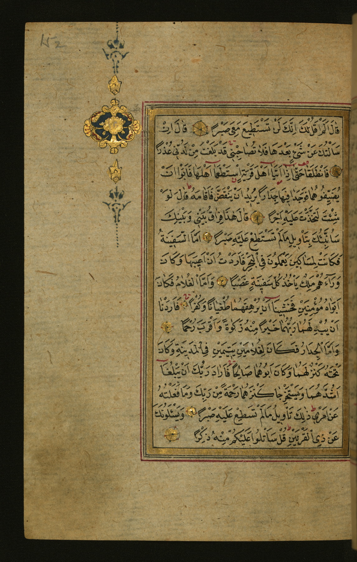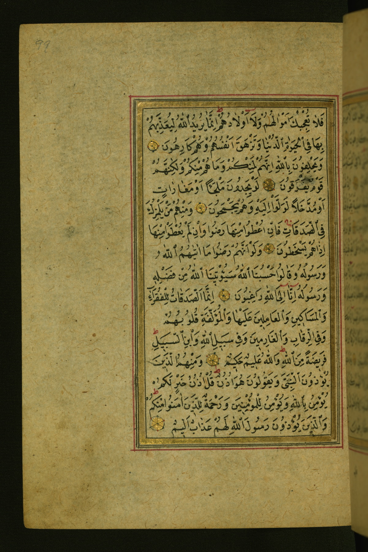 This small, illuminated single-volume copy of the Qurʾan was produced in Ottoman Turkey in 1282 AH / 1865-6 CE by Muḥammad ibn Muṣṭafá Izmīrī, a pupil of al-Rudūsī. The colophon in ijāzah script indicates that the present codex is the twenty-first copy executed by him (fol. 304b). The manuscript opens with an illuminated double-page incipit with the verses of chapters 1 (Sūrat al-fātiḥah) and 2 (Sūrat al-baqarah) (fols. 1b-2a). The text is written in naskh script in black ink with reading marks in red. Verses are separated by illuminated discs with colored dots and chapter headings are in riqāʿ script in white ink. Polychrome medallions in the margins indicate textual divisions and prostration. The binding of black leather is contemporary with the manuscript and decorated with a tooled and gold-painted geometric design enclosed by gold frames on the upper and lower boards.