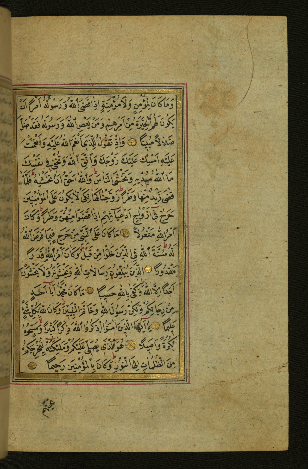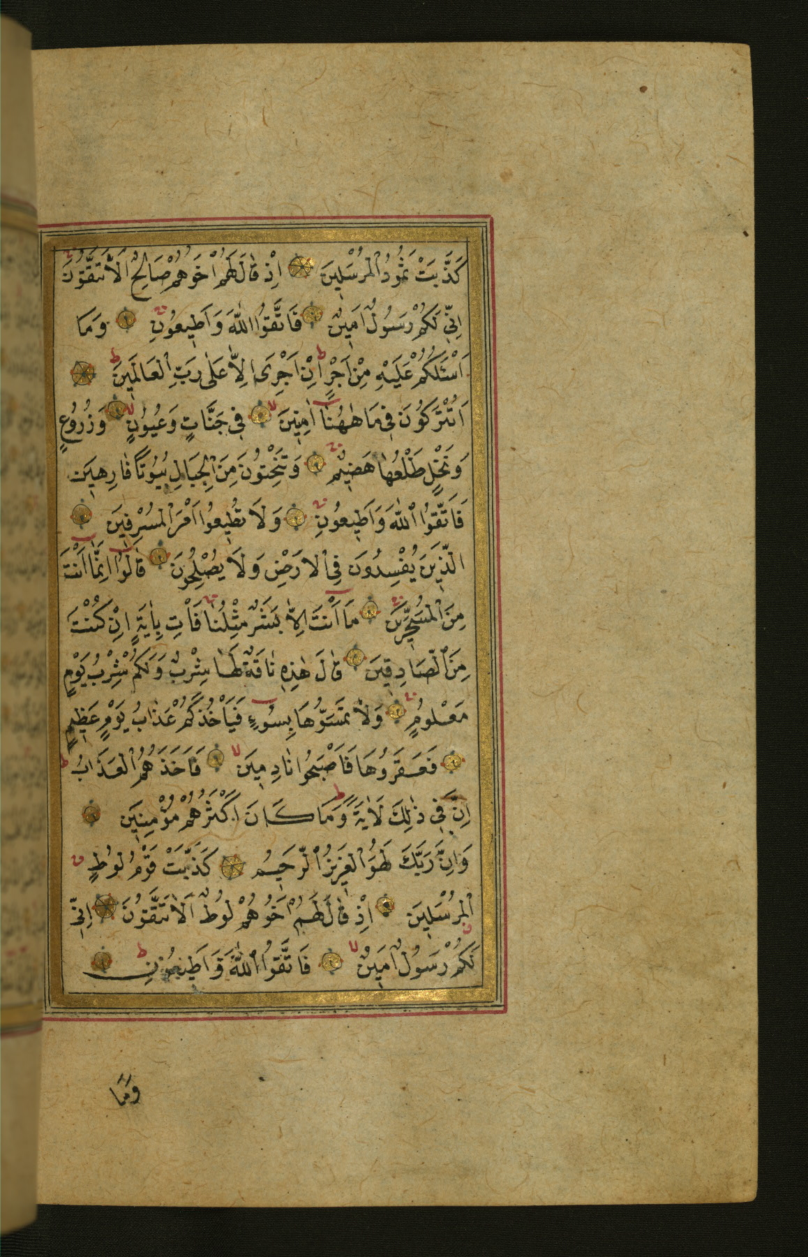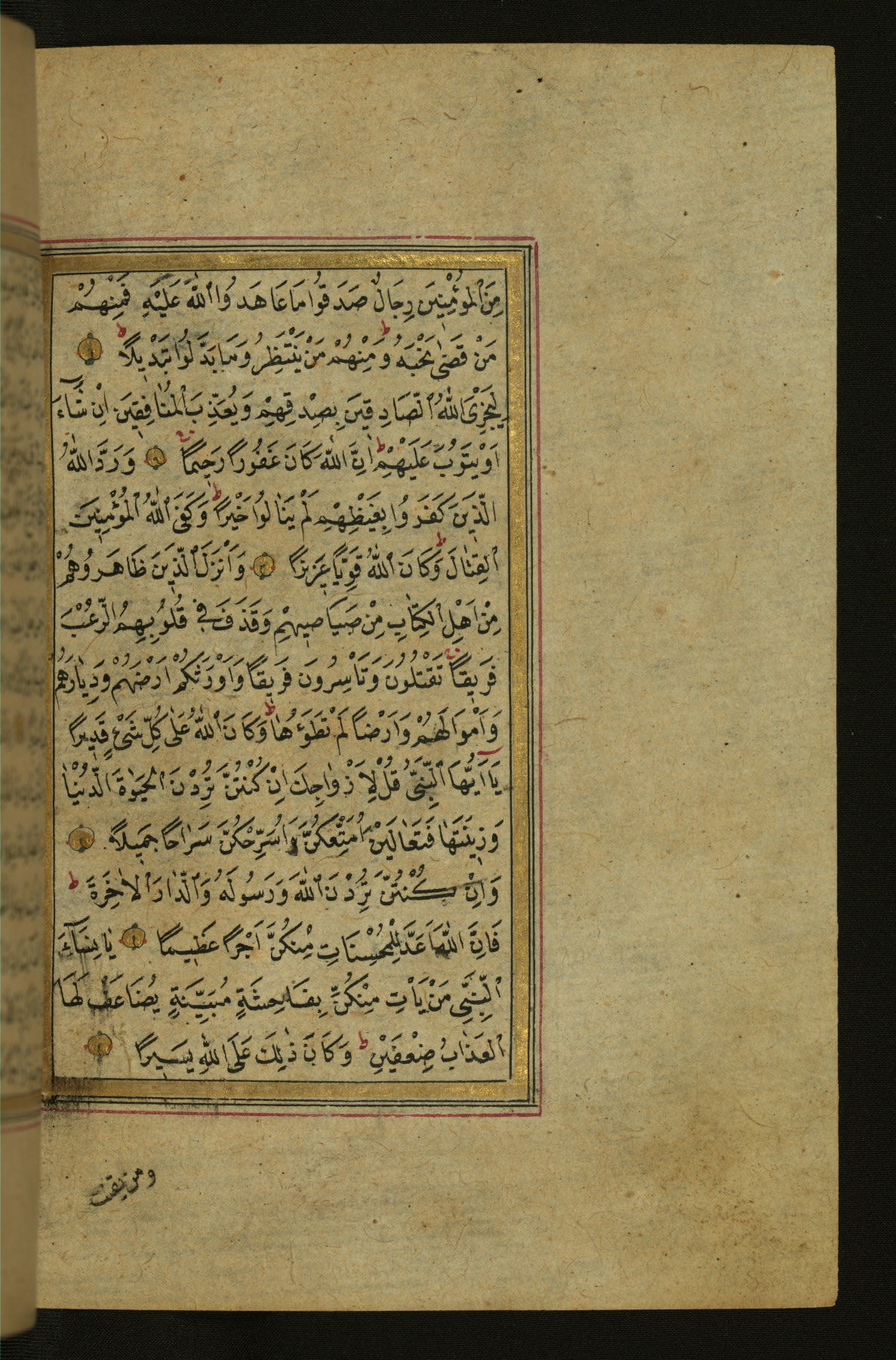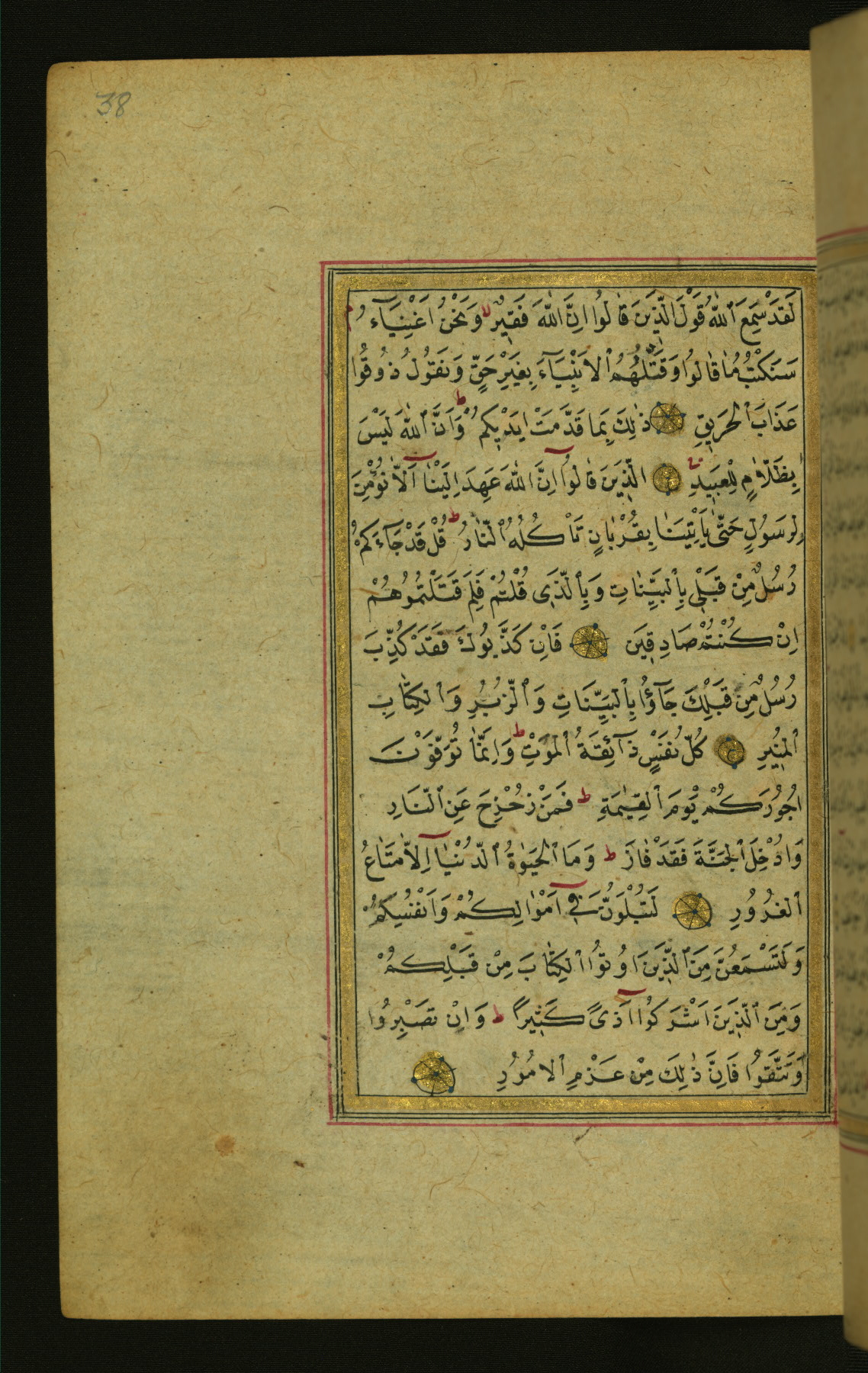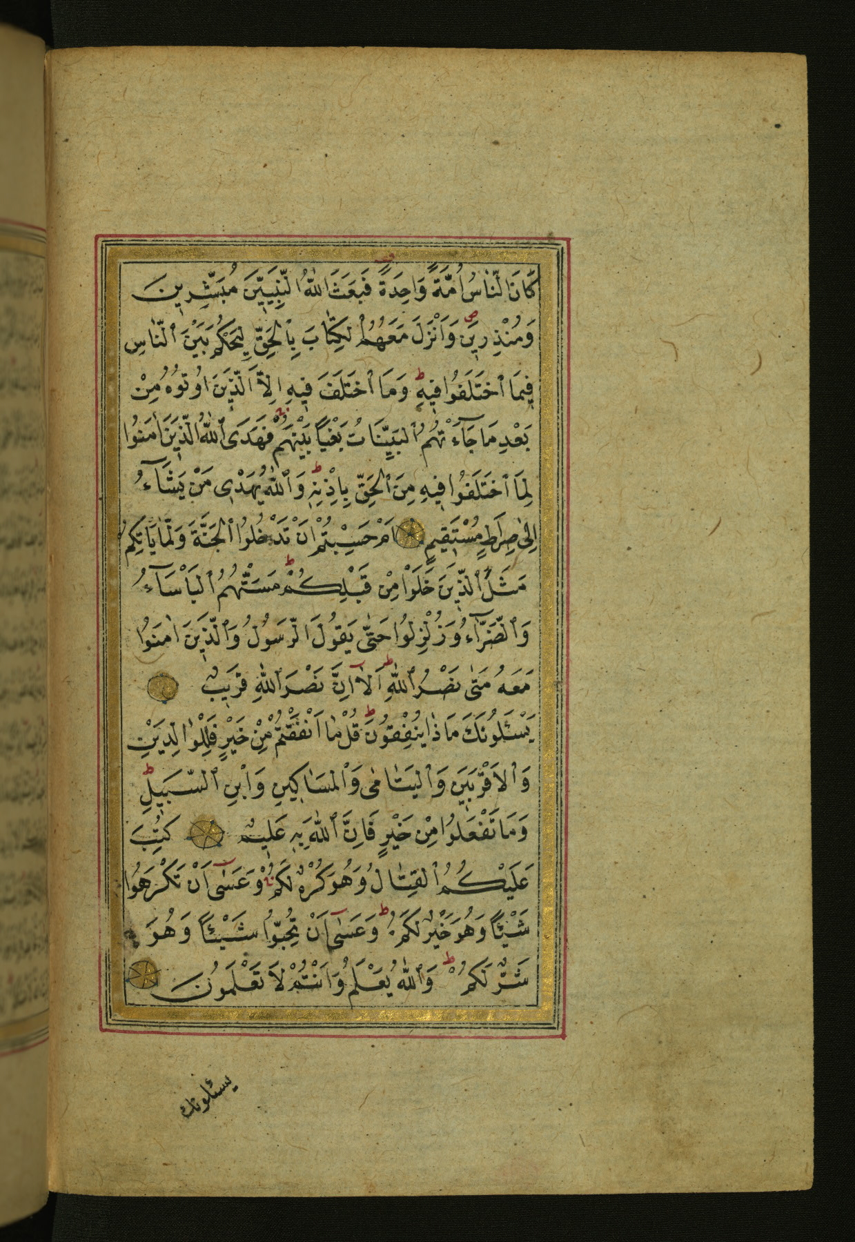 This small, illuminated single-volume copy of the Qurʾan was produced in Ottoman Turkey in 1282 AH / 1865-6 CE by Muḥammad ibn Muṣṭafá Izmīrī, a pupil of al-Rudūsī. The colophon in ijāzah script indicates that the present codex is the twenty-first copy executed by him (fol. 304b). The manuscript opens with an illuminated double-page incipit with the verses of chapters 1 (Sūrat al-fātiḥah) and 2 (Sūrat al-baqarah) (fols. 1b-2a). The text is written in naskh script in black ink with reading marks in red. Verses are separated by illuminated discs with colored dots and chapter headings are in riqāʿ script in white ink. Polychrome medallions in the margins indicate textual divisions and prostration. The binding of black leather is contemporary with the manuscript and decorated with a tooled and gold-painted geometric design enclosed by gold frames on the upper and lower boards.