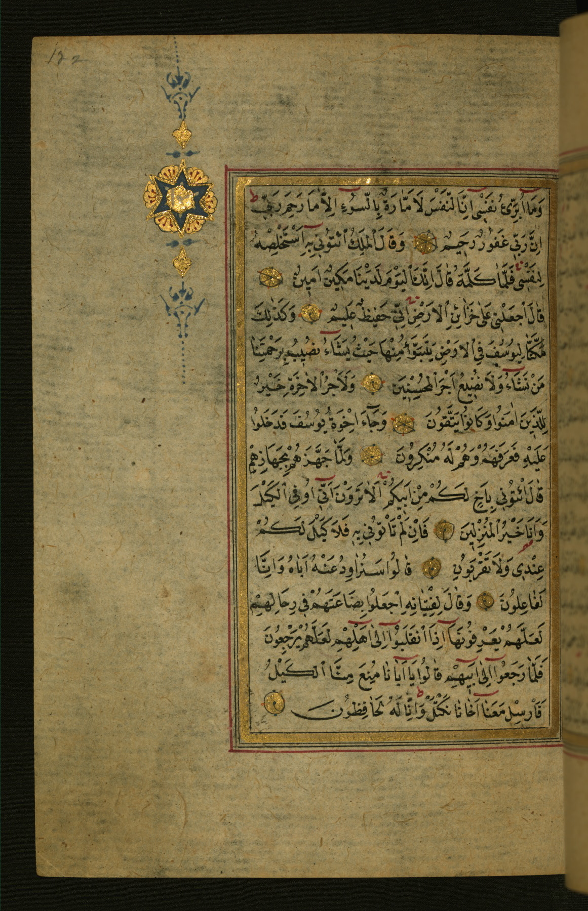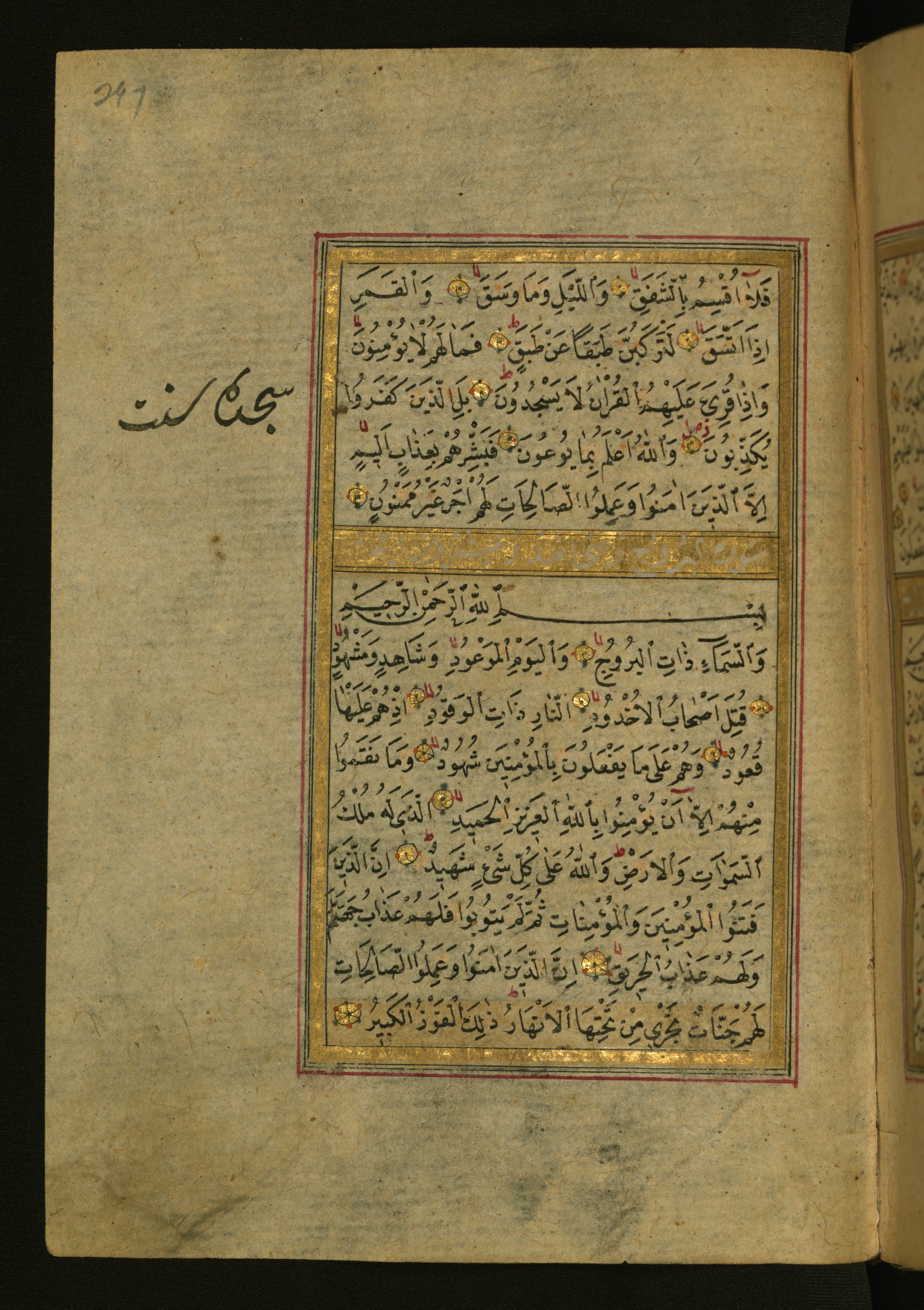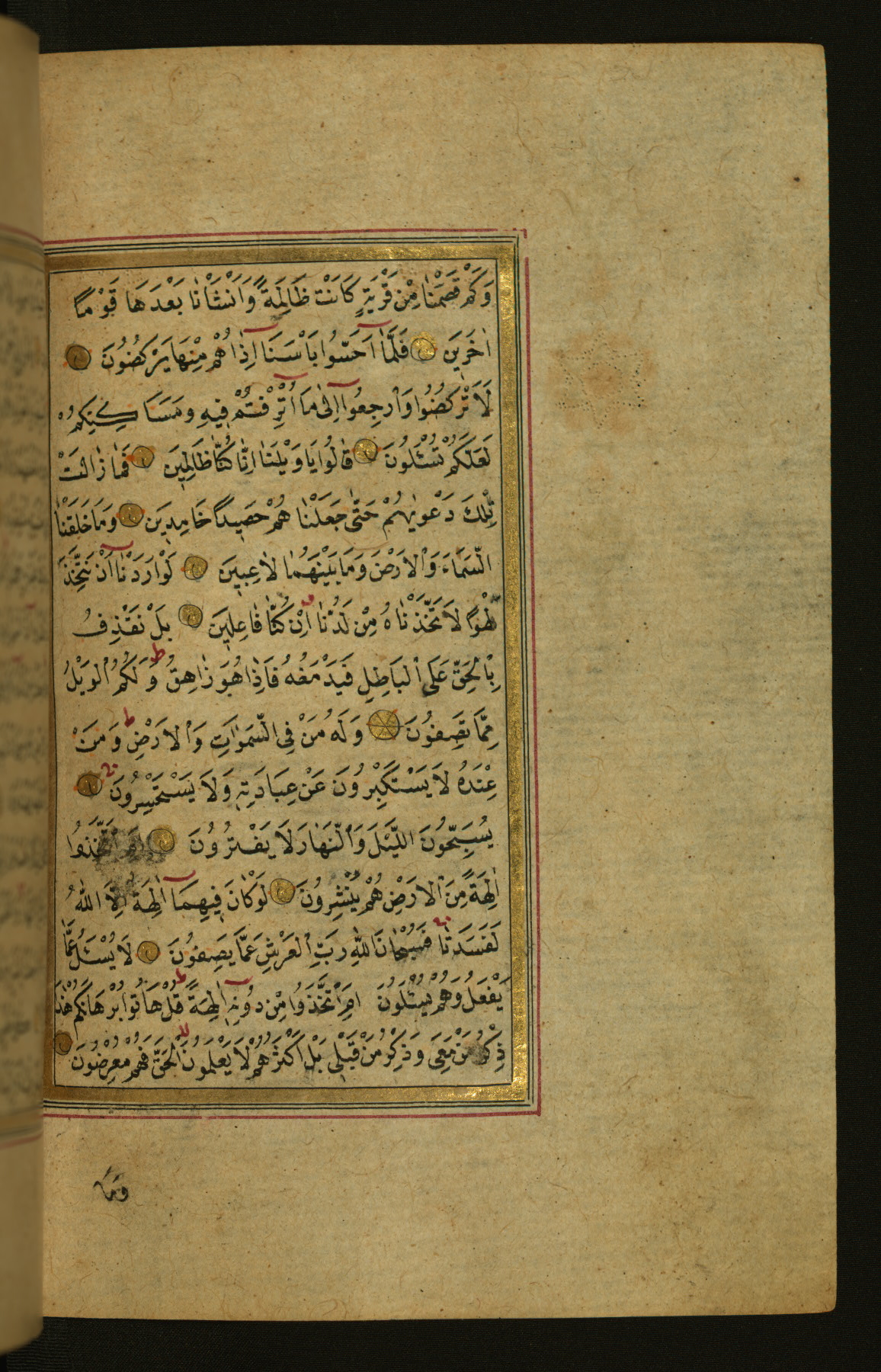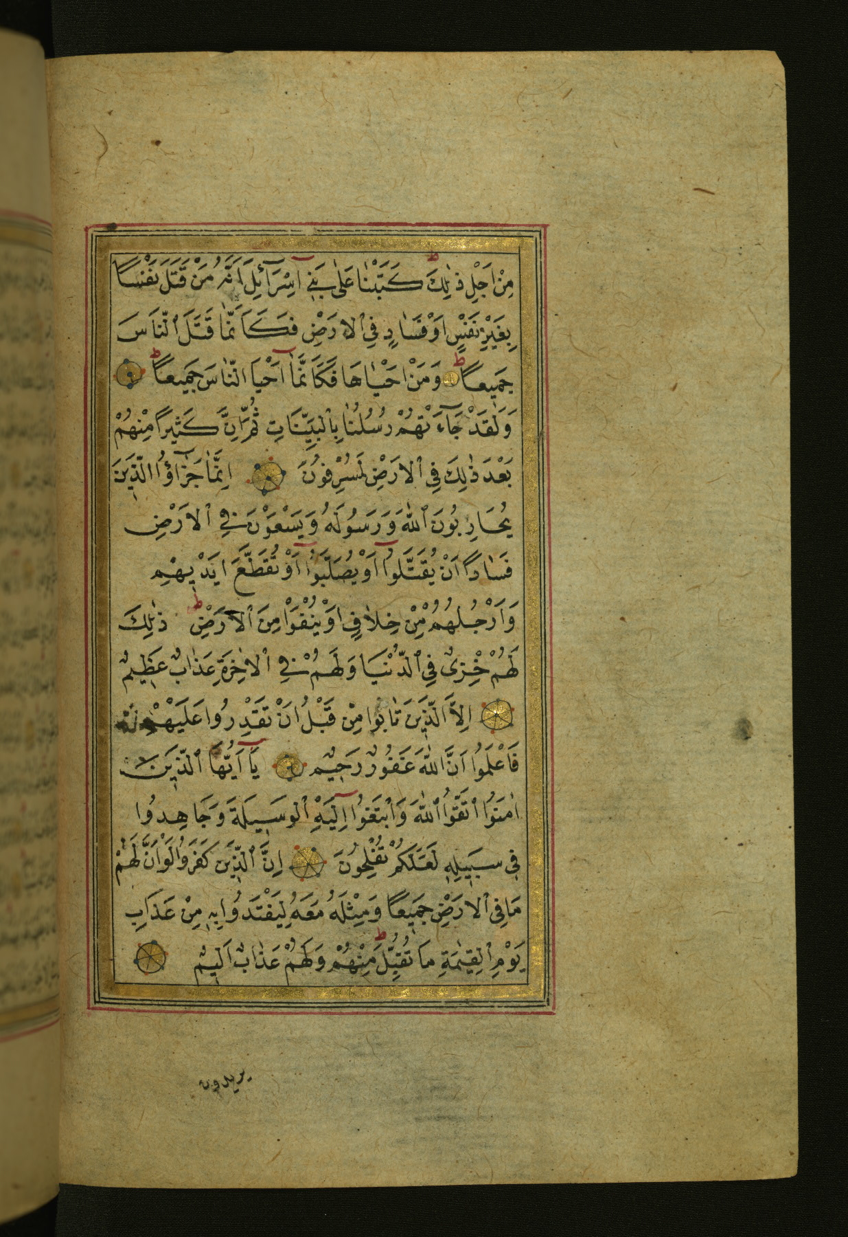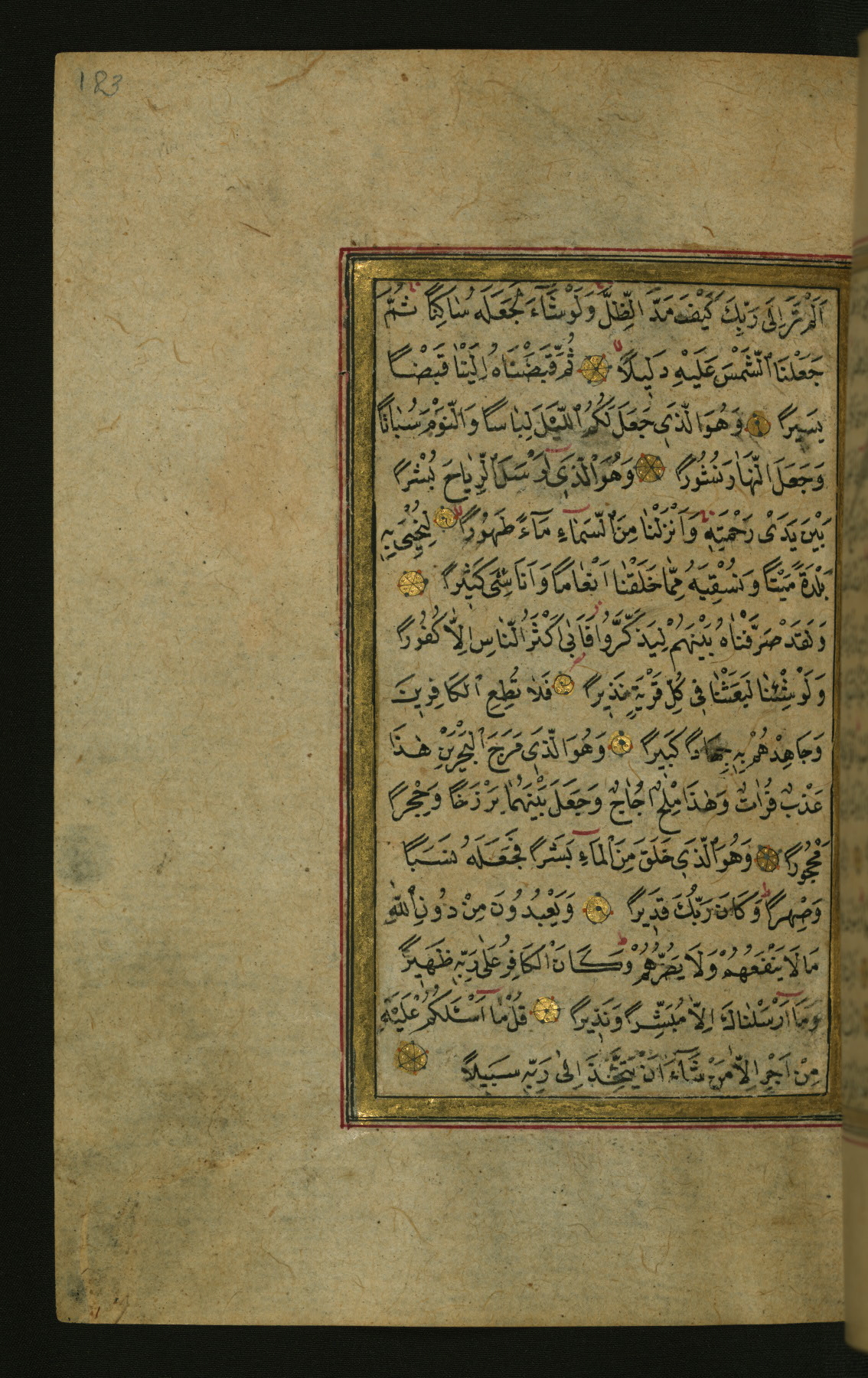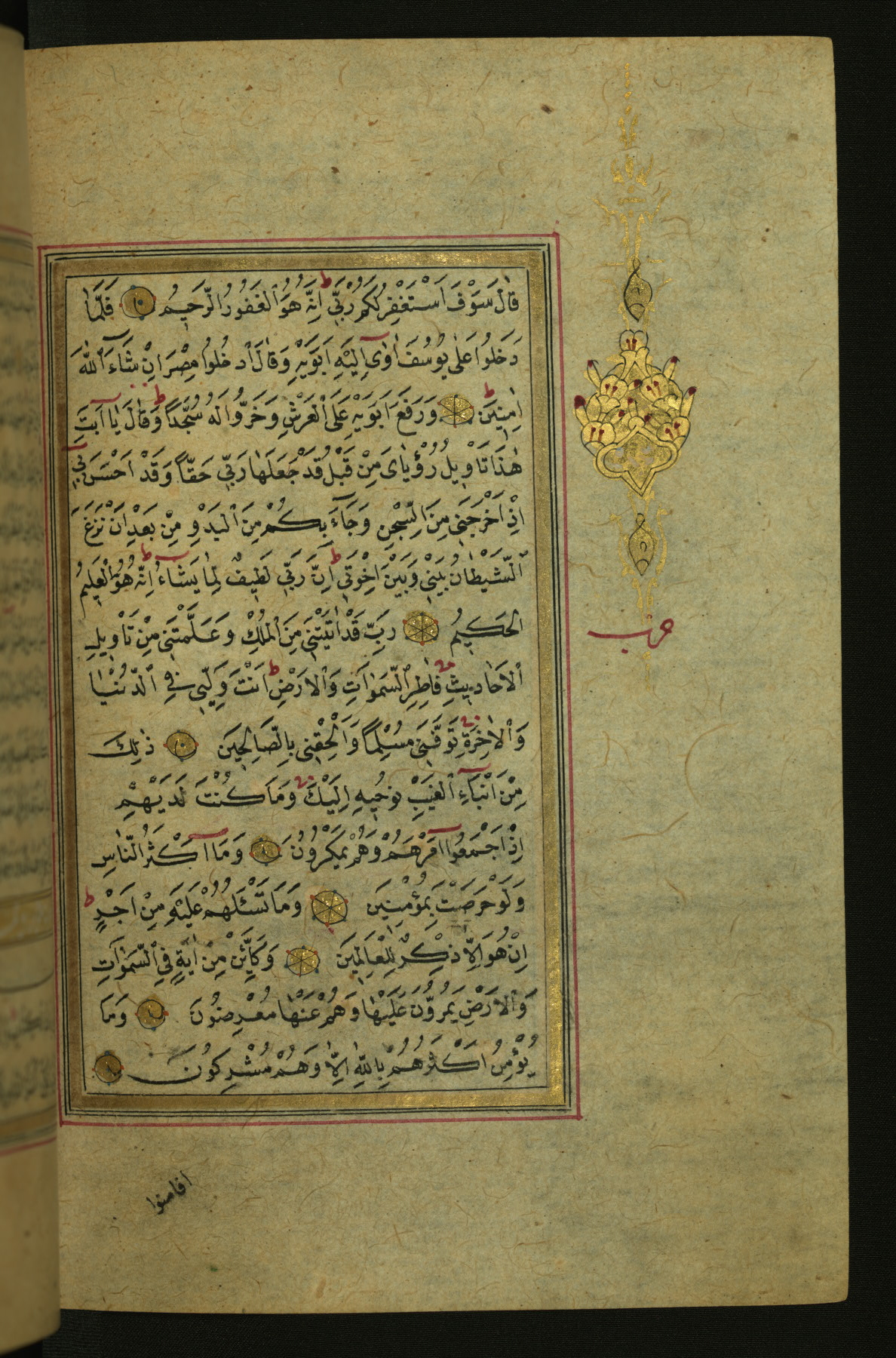 This small, illuminated single-volume copy of the Qurʾan was produced in Ottoman Turkey in 1282 AH / 1865-6 CE by Muḥammad ibn Muṣṭafá Izmīrī, a pupil of al-Rudūsī. The colophon in ijāzah script indicates that the present codex is the twenty-first copy executed by him (fol. 304b). The manuscript opens with an illuminated double-page incipit with the verses of chapters 1 (Sūrat al-fātiḥah) and 2 (Sūrat al-baqarah) (fols. 1b-2a). The text is written in naskh script in black ink with reading marks in red. Verses are separated by illuminated discs with colored dots and chapter headings are in riqāʿ script in white ink. Polychrome medallions in the margins indicate textual divisions and prostration. The binding of black leather is contemporary with the manuscript and decorated with a tooled and gold-painted geometric design enclosed by gold frames on the upper and lower boards.