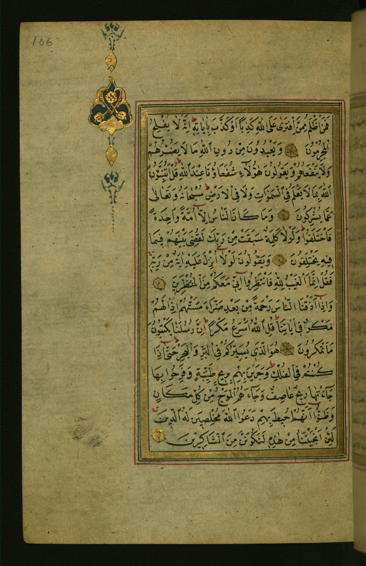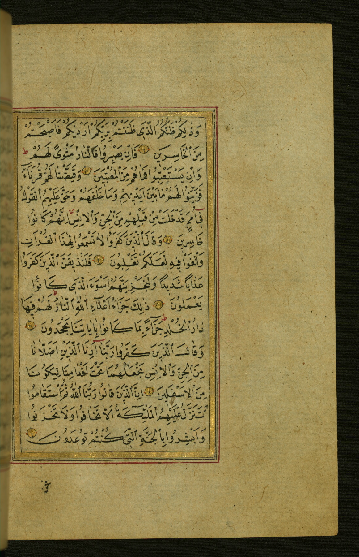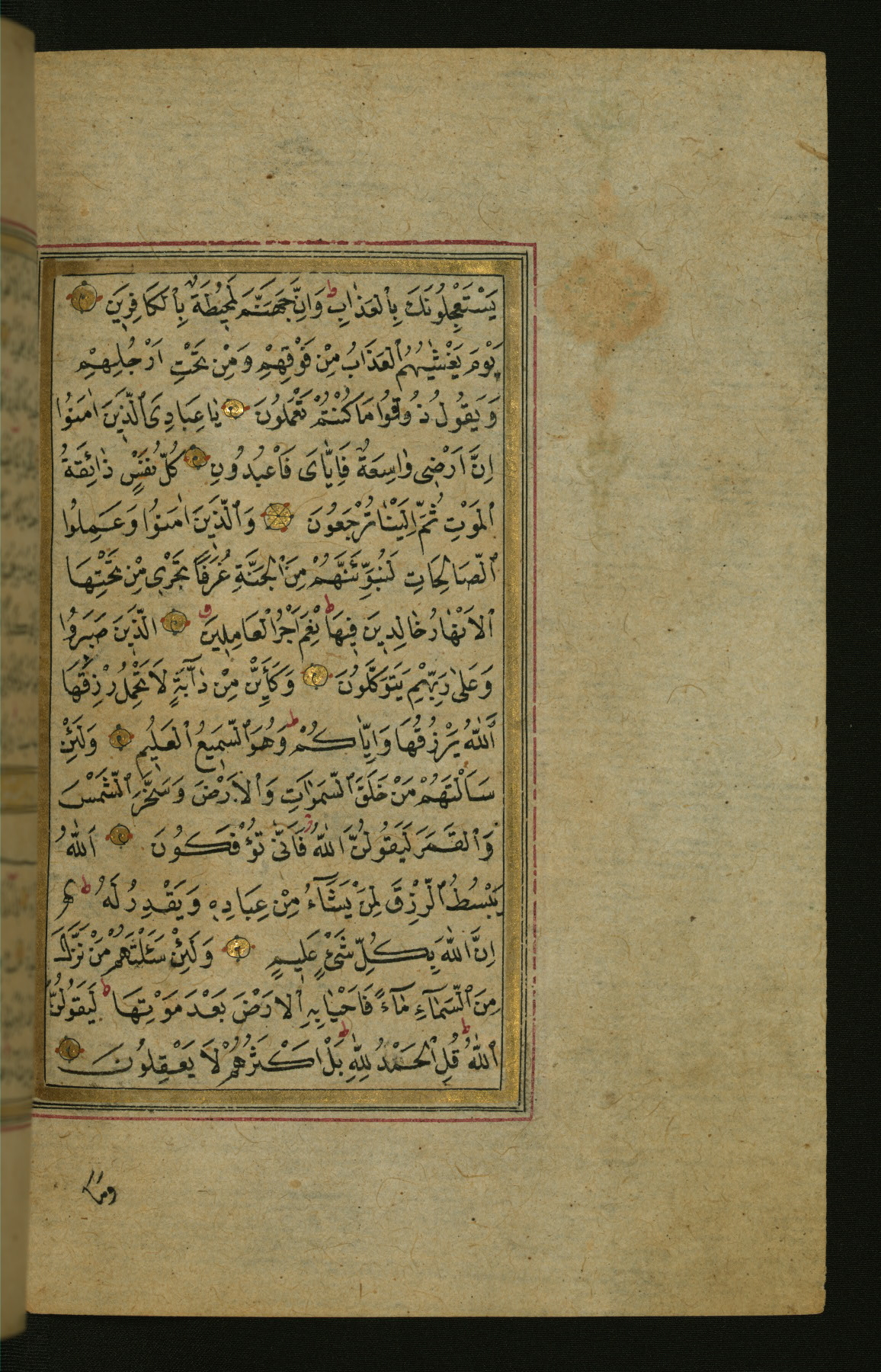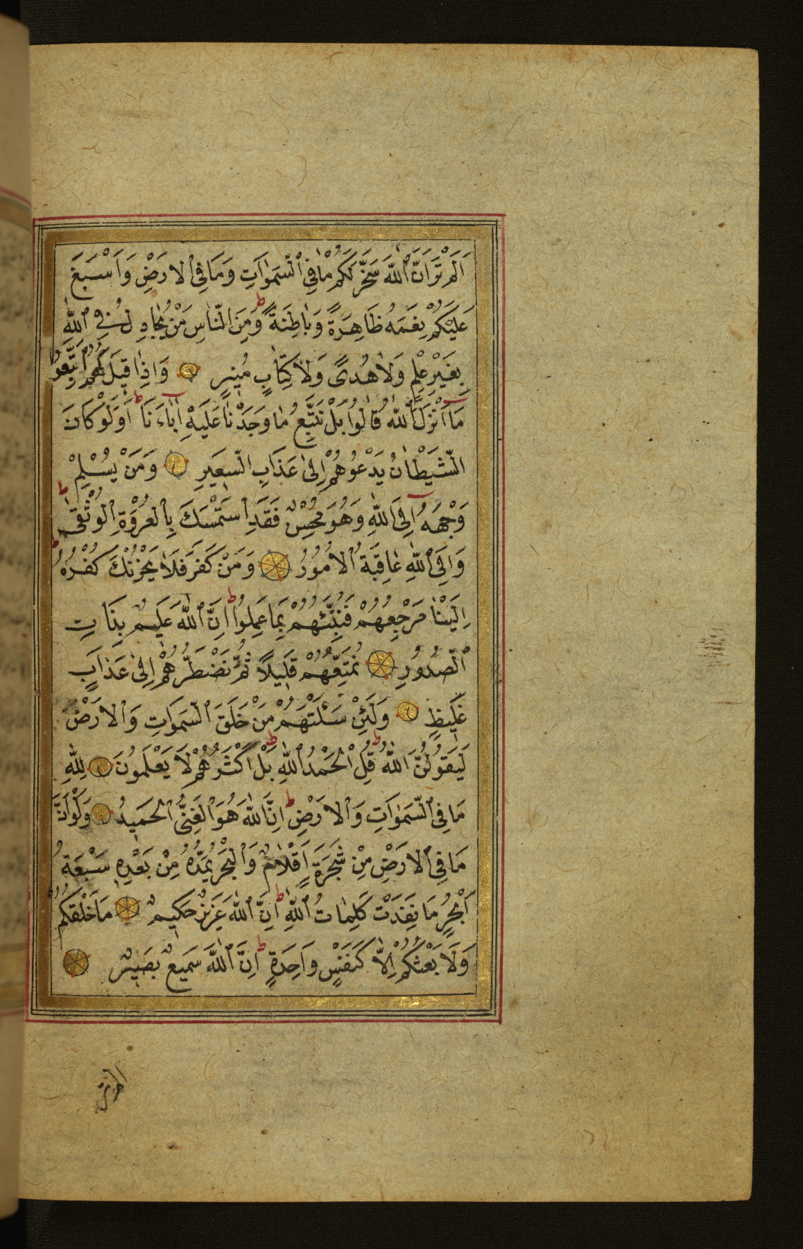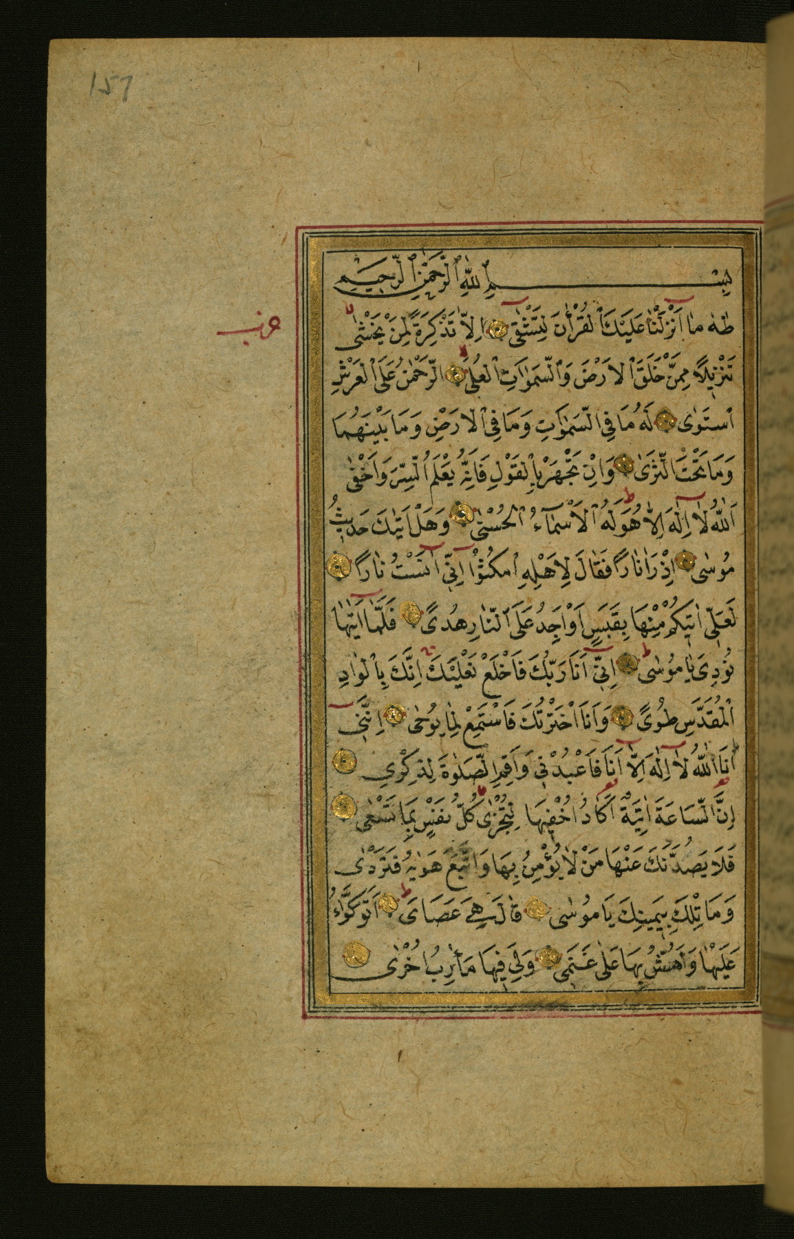 This small, illuminated single-volume copy of the Qurʾan was produced in Ottoman Turkey in 1282 AH / 1865-6 CE by Muḥammad ibn Muṣṭafá Izmīrī, a pupil of al-Rudūsī. The colophon in ijāzah script indicates that the present codex is the twenty-first copy executed by him (fol. 304b). The manuscript opens with an illuminated double-page incipit with the verses of chapters 1 (Sūrat al-fātiḥah) and 2 (Sūrat al-baqarah) (fols. 1b-2a). The text is written in naskh script in black ink with reading marks in red. Verses are separated by illuminated discs with colored dots and chapter headings are in riqāʿ script in white ink. Polychrome medallions in the margins indicate textual divisions and prostration. The binding of black leather is contemporary with the manuscript and decorated with a tooled and gold-painted geometric design enclosed by gold frames on the upper and lower boards.