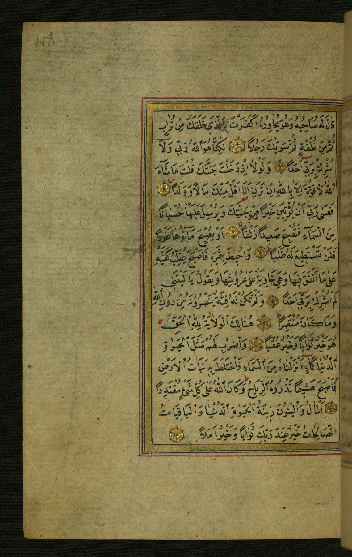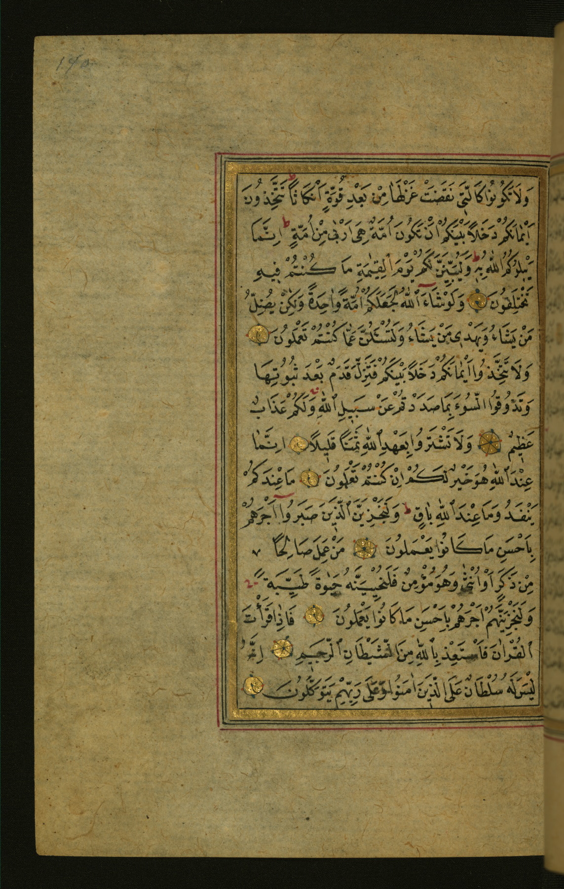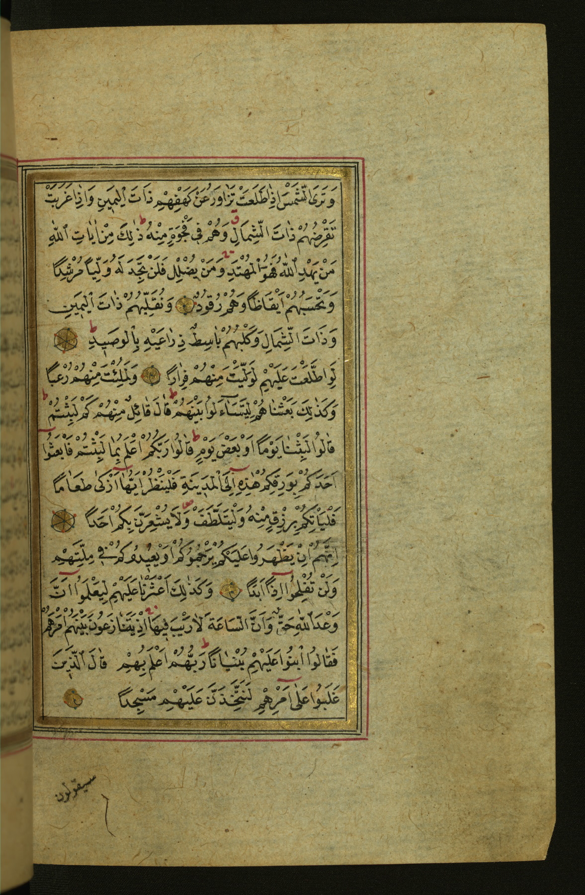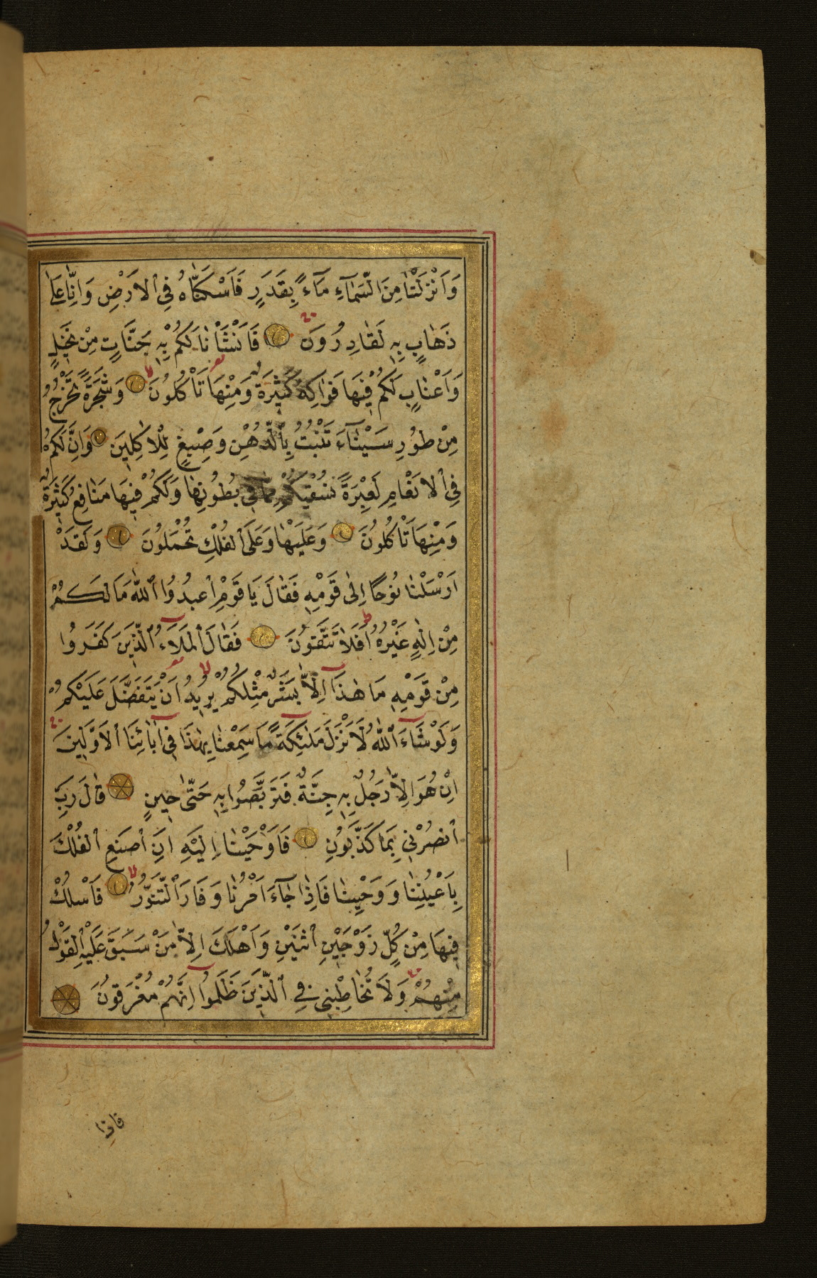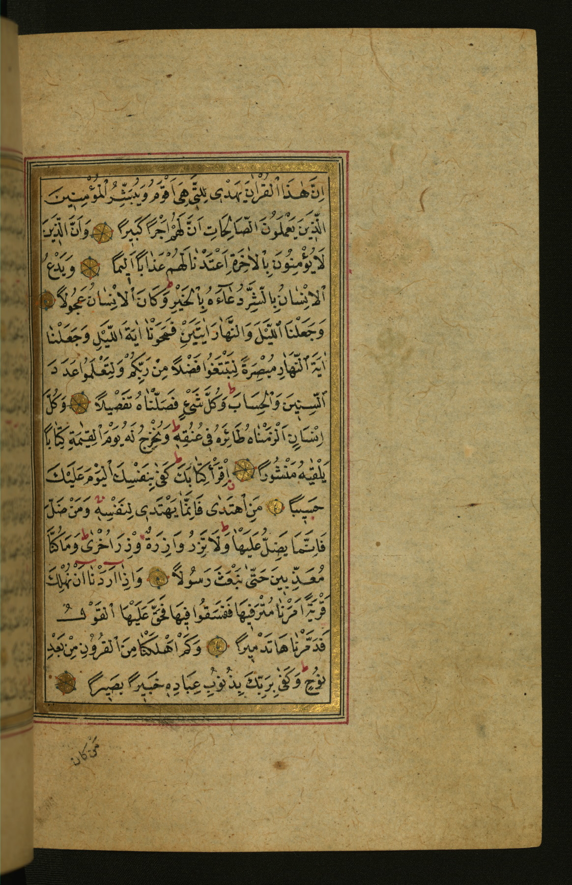 This small, illuminated single-volume copy of the Qurʾan was produced in Ottoman Turkey in 1282 AH / 1865-6 CE by Muḥammad ibn Muṣṭafá Izmīrī, a pupil of al-Rudūsī. The colophon in ijāzah script indicates that the present codex is the twenty-first copy executed by him (fol. 304b). The manuscript opens with an illuminated double-page incipit with the verses of chapters 1 (Sūrat al-fātiḥah) and 2 (Sūrat al-baqarah) (fols. 1b-2a). The text is written in naskh script in black ink with reading marks in red. Verses are separated by illuminated discs with colored dots and chapter headings are in riqāʿ script in white ink. Polychrome medallions in the margins indicate textual divisions and prostration. The binding of black leather is contemporary with the manuscript and decorated with a tooled and gold-painted geometric design enclosed by gold frames on the upper and lower boards.
