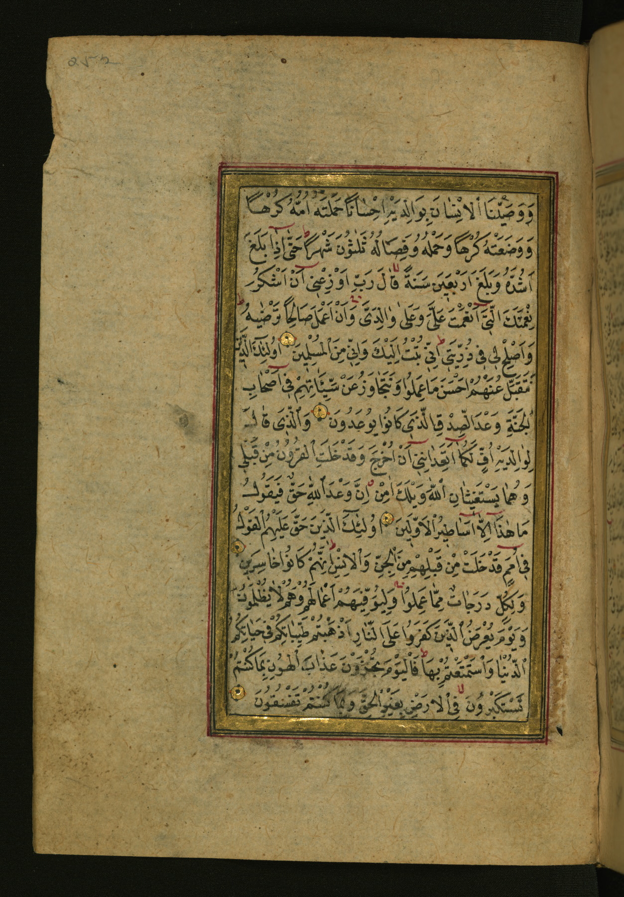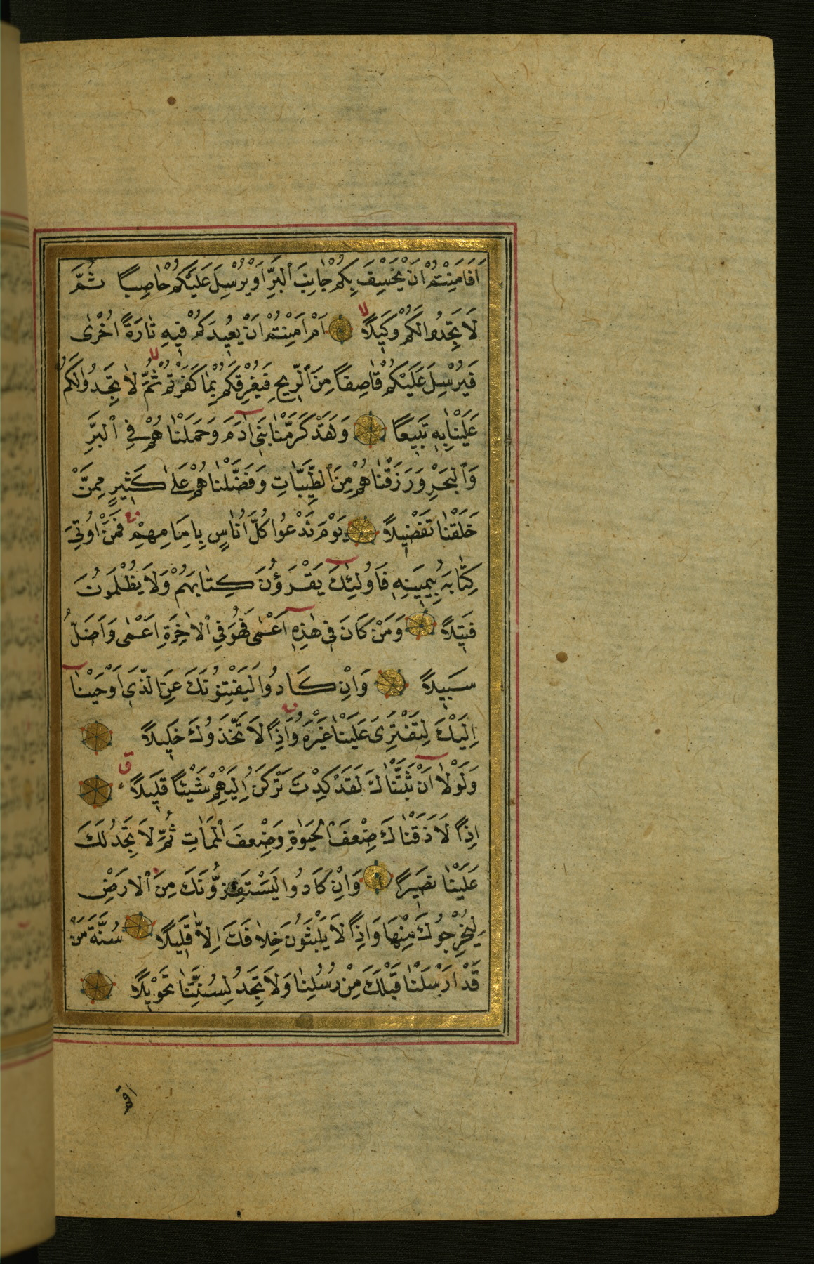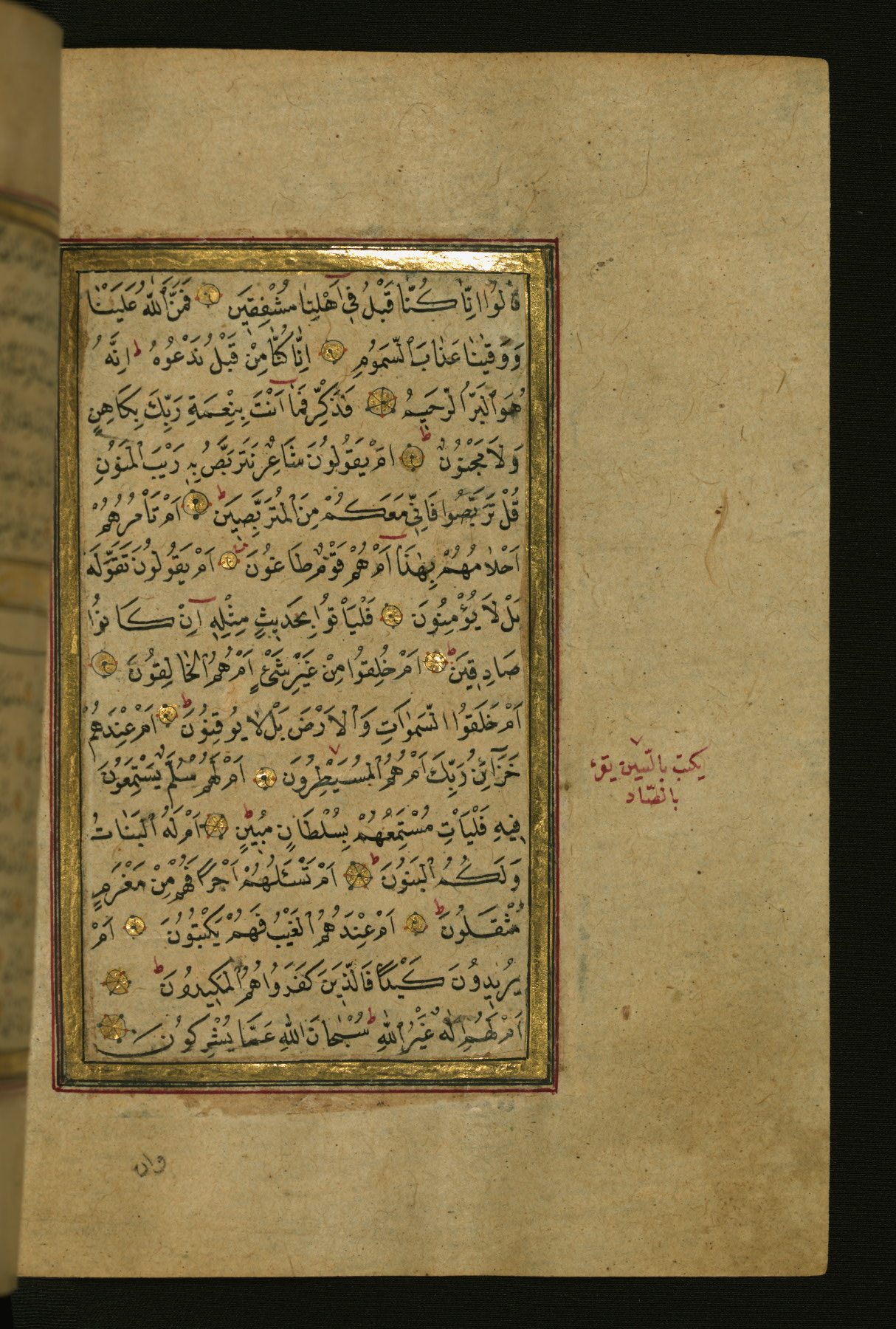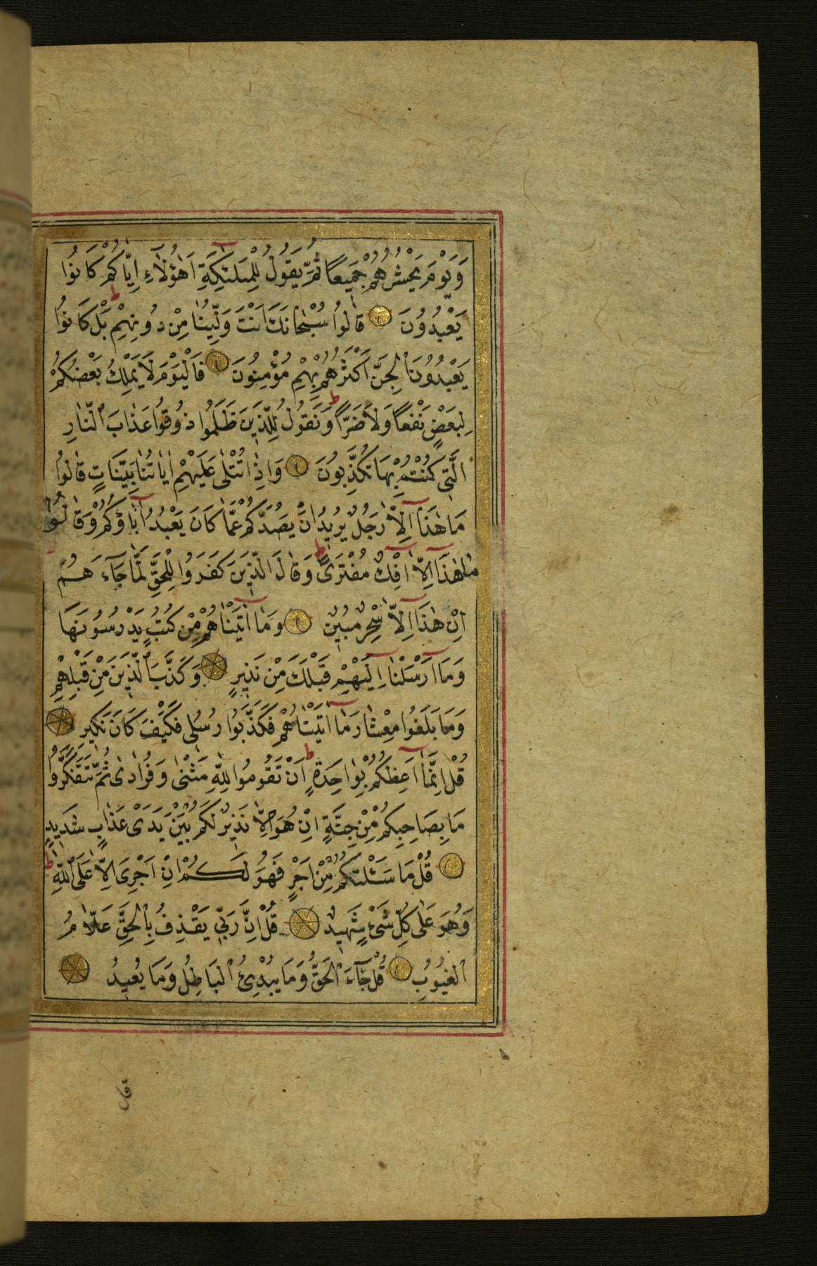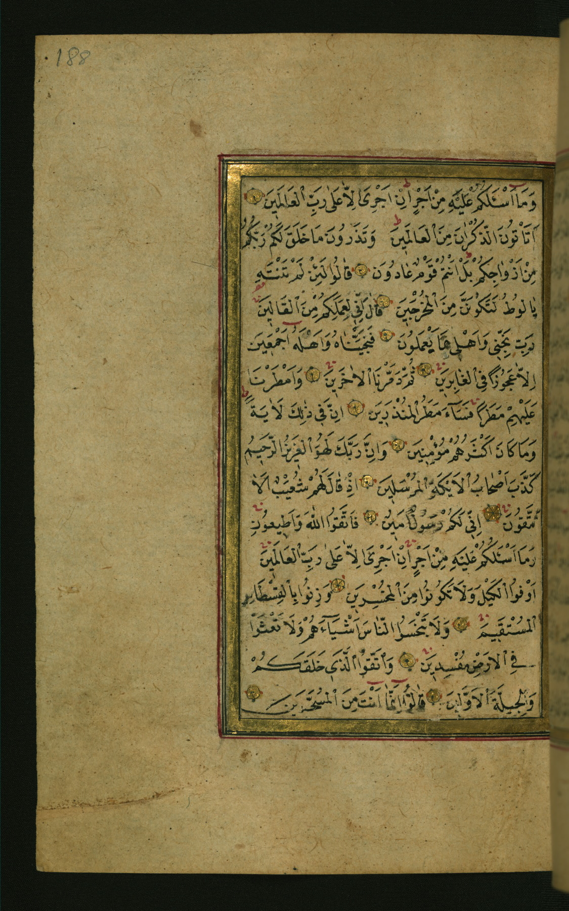 This small, illuminated single-volume copy of the Qurʾan was produced in Ottoman Turkey in 1282 AH / 1865-6 CE by Muḥammad ibn Muṣṭafá Izmīrī, a pupil of al-Rudūsī. The colophon in ijāzah script indicates that the present codex is the twenty-first copy executed by him (fol. 304b). The manuscript opens with an illuminated double-page incipit with the verses of chapters 1 (Sūrat al-fātiḥah) and 2 (Sūrat al-baqarah) (fols. 1b-2a). The text is written in naskh script in black ink with reading marks in red. Verses are separated by illuminated discs with colored dots and chapter headings are in riqāʿ script in white ink. Polychrome medallions in the margins indicate textual divisions and prostration. The binding of black leather is contemporary with the manuscript and decorated with a tooled and gold-painted geometric design enclosed by gold frames on the upper and lower boards.