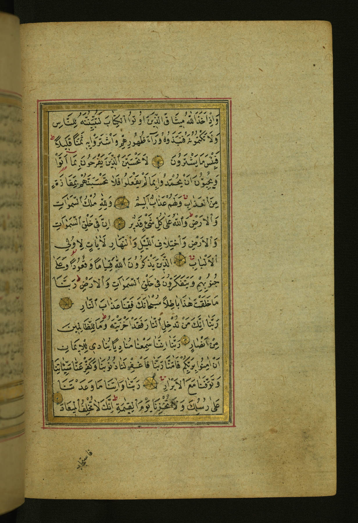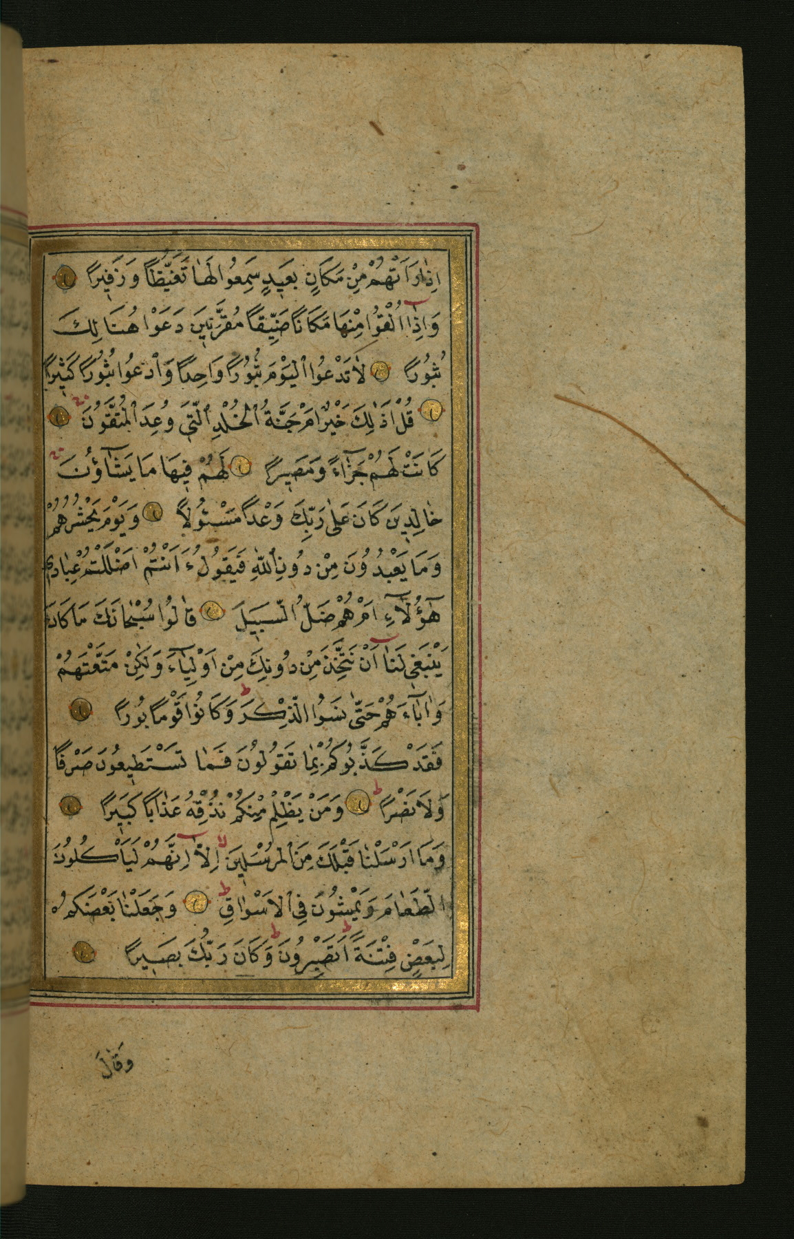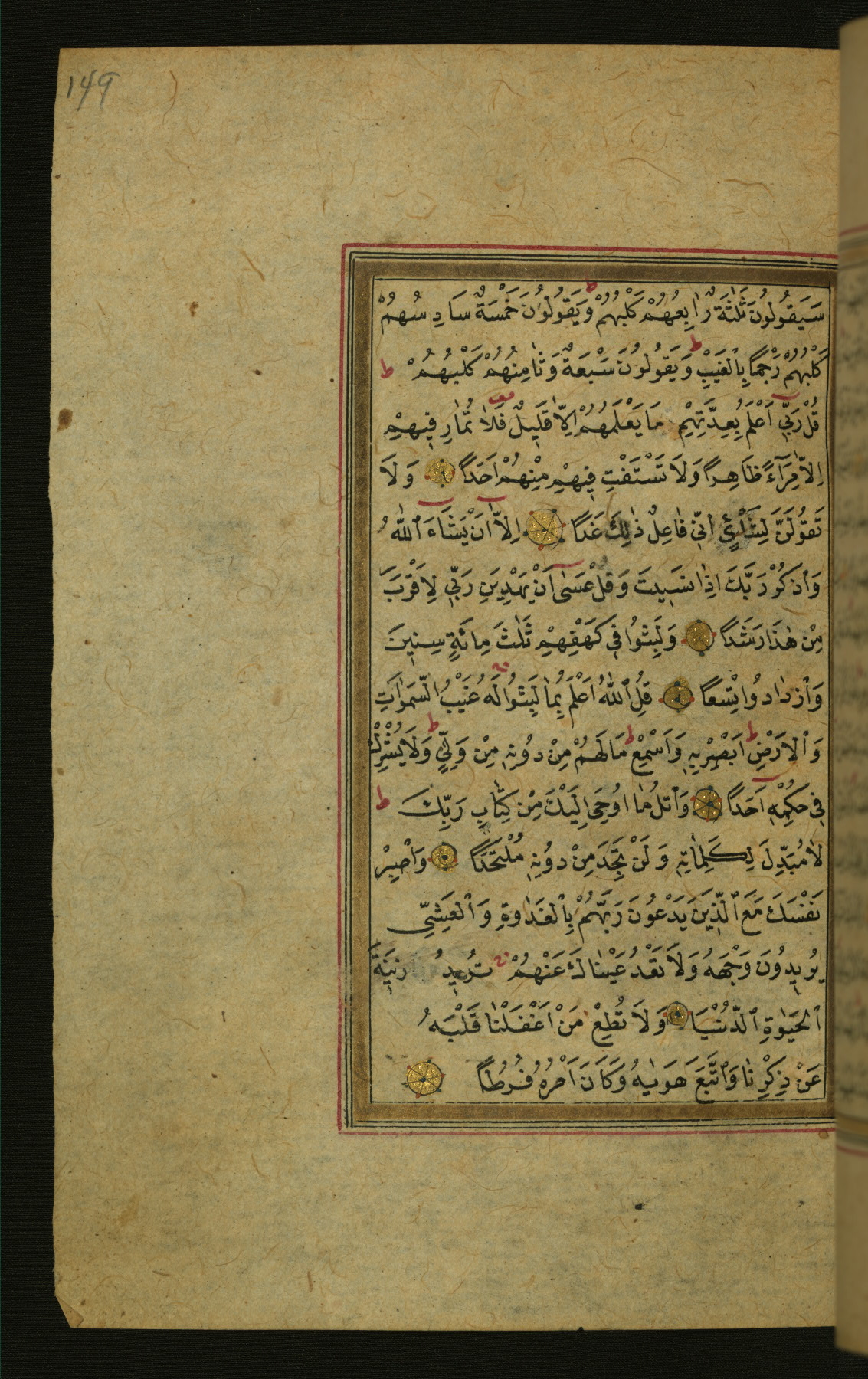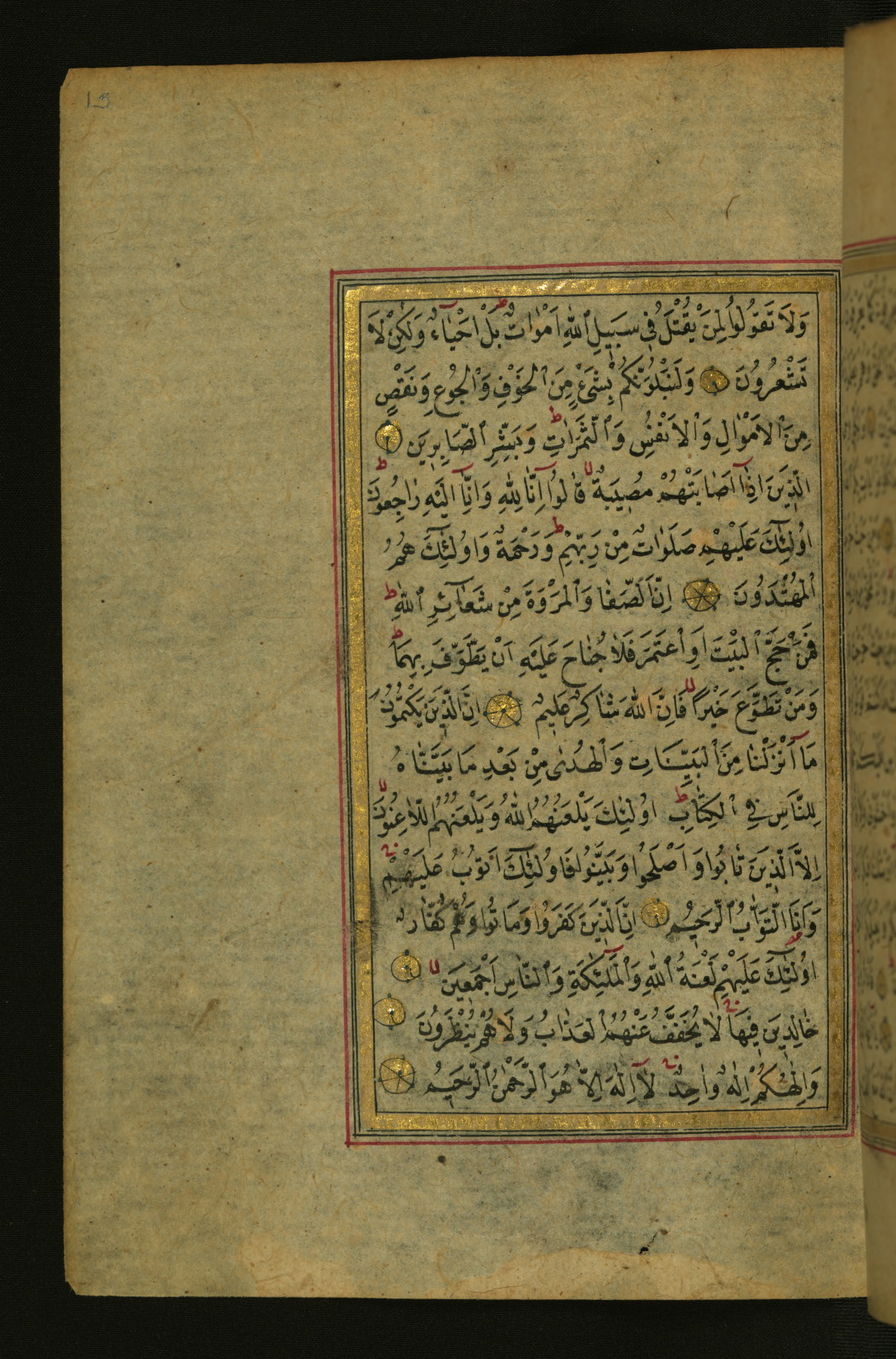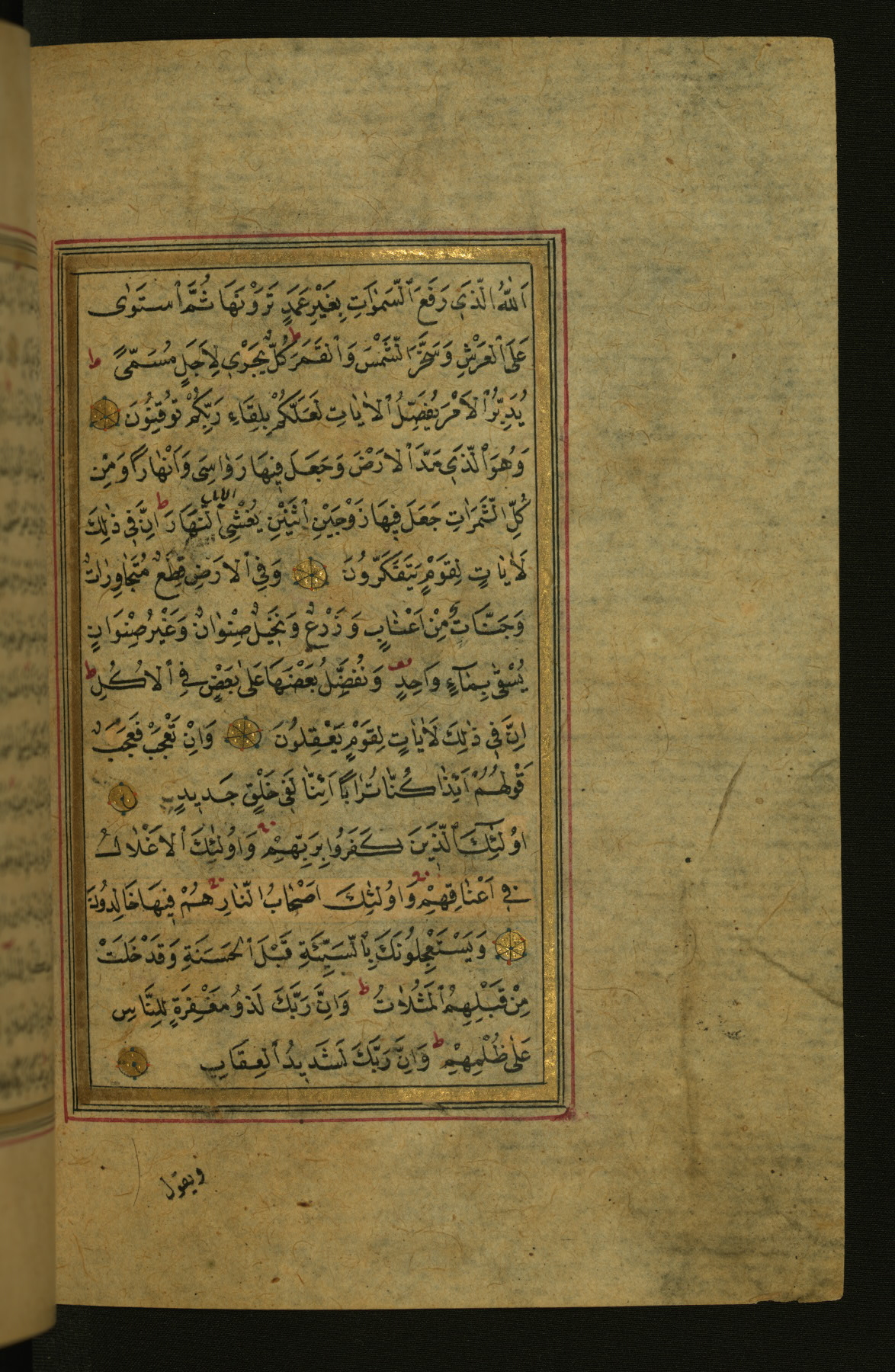 This small, illuminated single-volume copy of the Qurʾan was produced in Ottoman Turkey in 1282 AH / 1865-6 CE by Muḥammad ibn Muṣṭafá Izmīrī, a pupil of al-Rudūsī. The colophon in ijāzah script indicates that the present codex is the twenty-first copy executed by him (fol. 304b). The manuscript opens with an illuminated double-page incipit with the verses of chapters 1 (Sūrat al-fātiḥah) and 2 (Sūrat al-baqarah) (fols. 1b-2a). The text is written in naskh script in black ink with reading marks in red. Verses are separated by illuminated discs with colored dots and chapter headings are in riqāʿ script in white ink. Polychrome medallions in the margins indicate textual divisions and prostration. The binding of black leather is contemporary with the manuscript and decorated with a tooled and gold-painted geometric design enclosed by gold frames on the upper and lower boards.