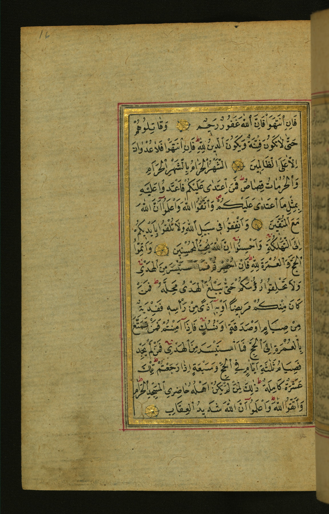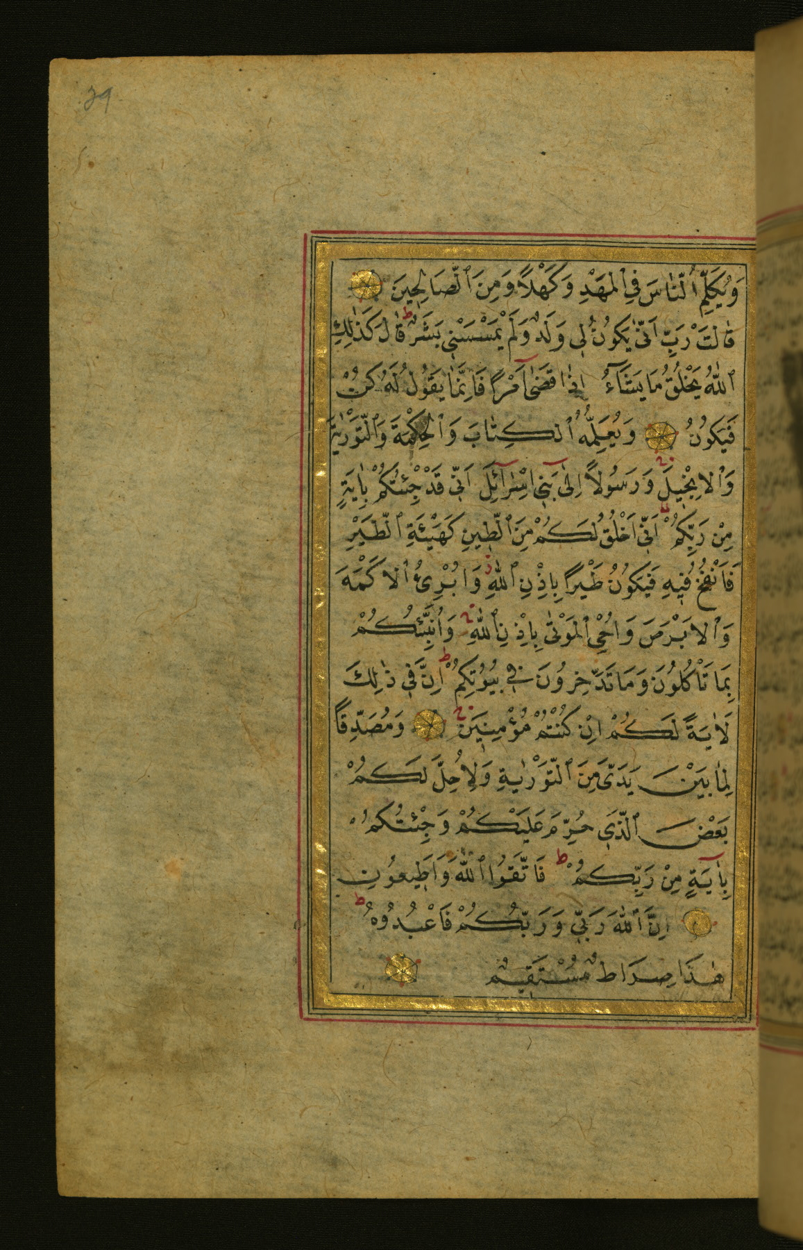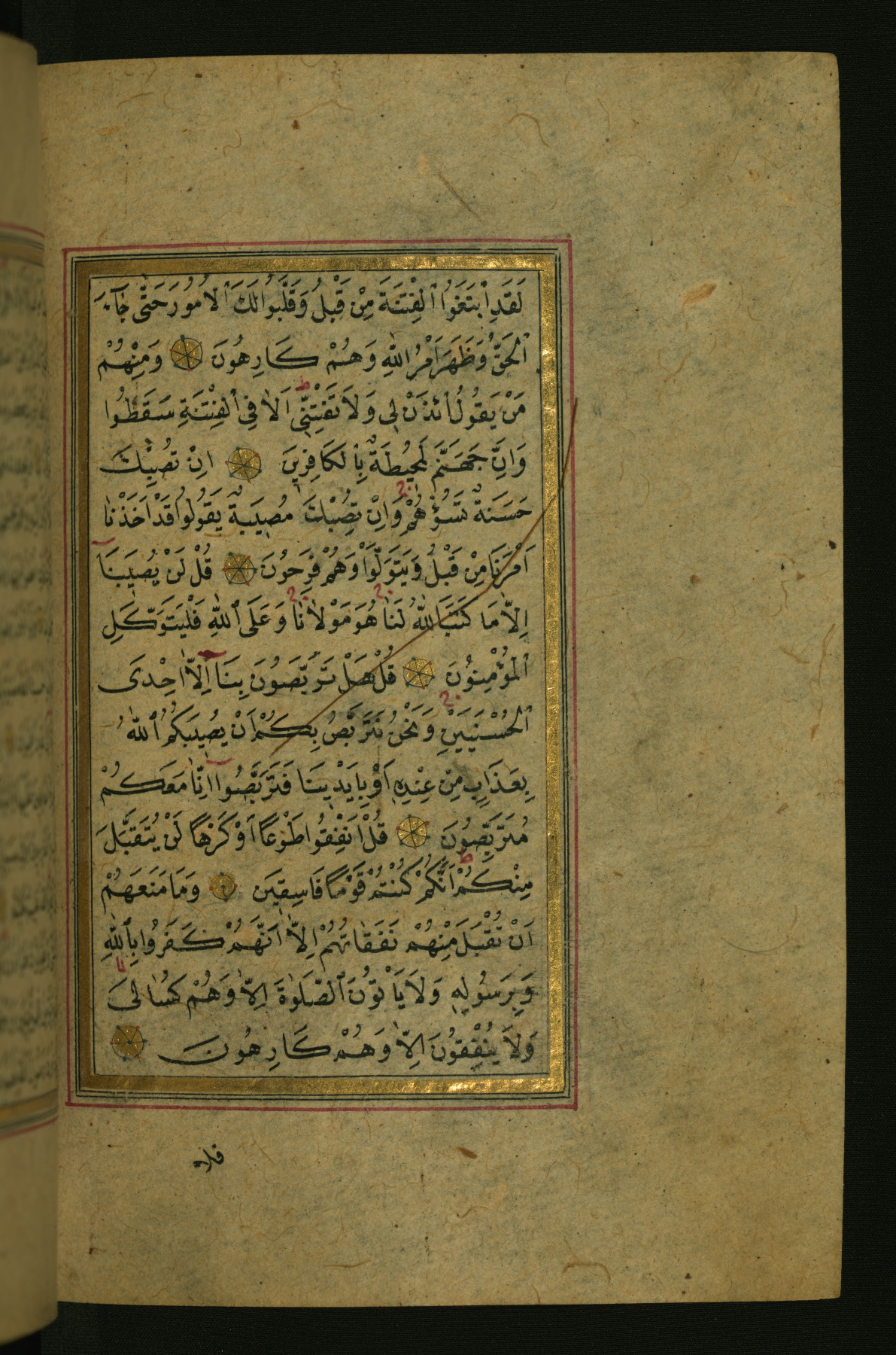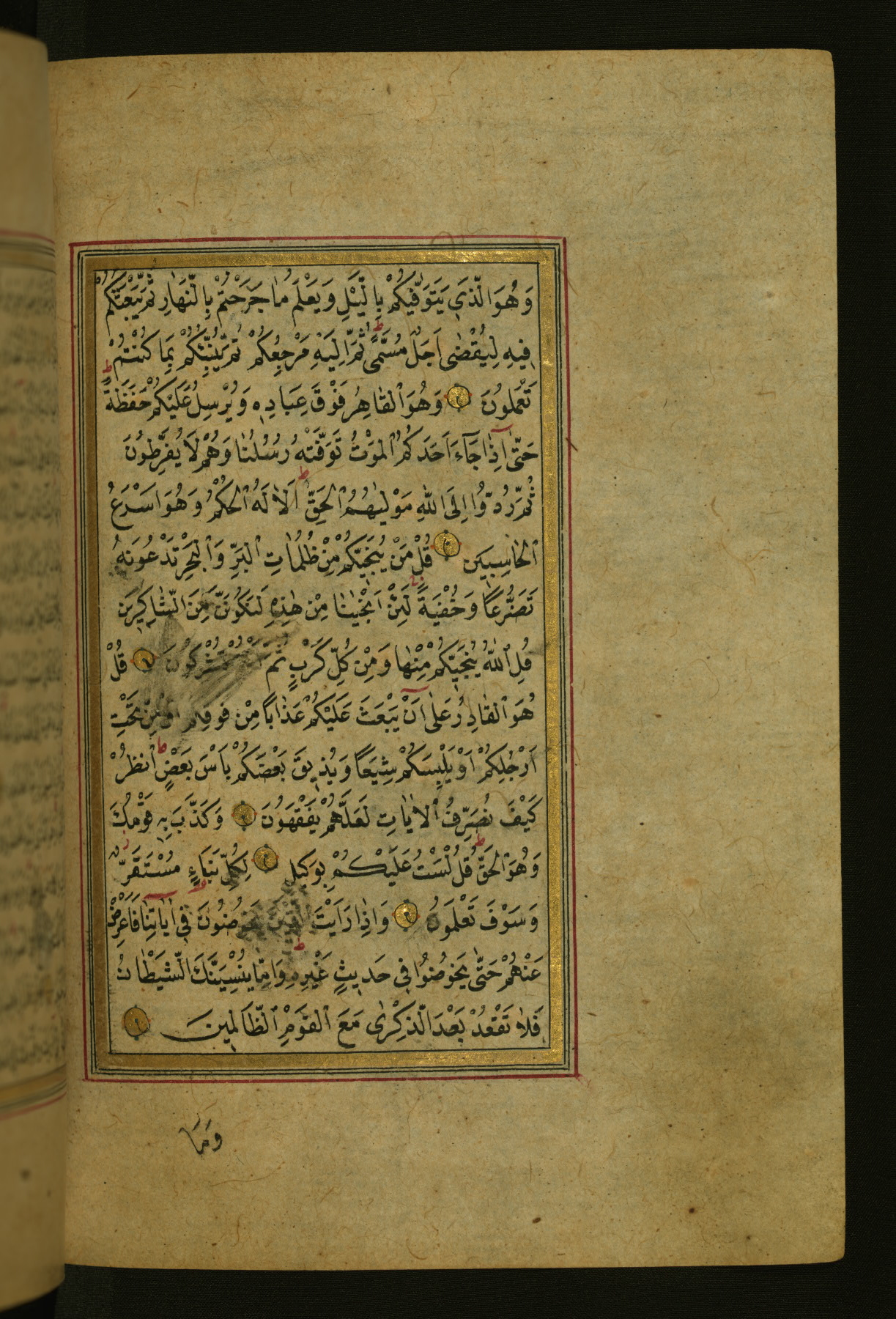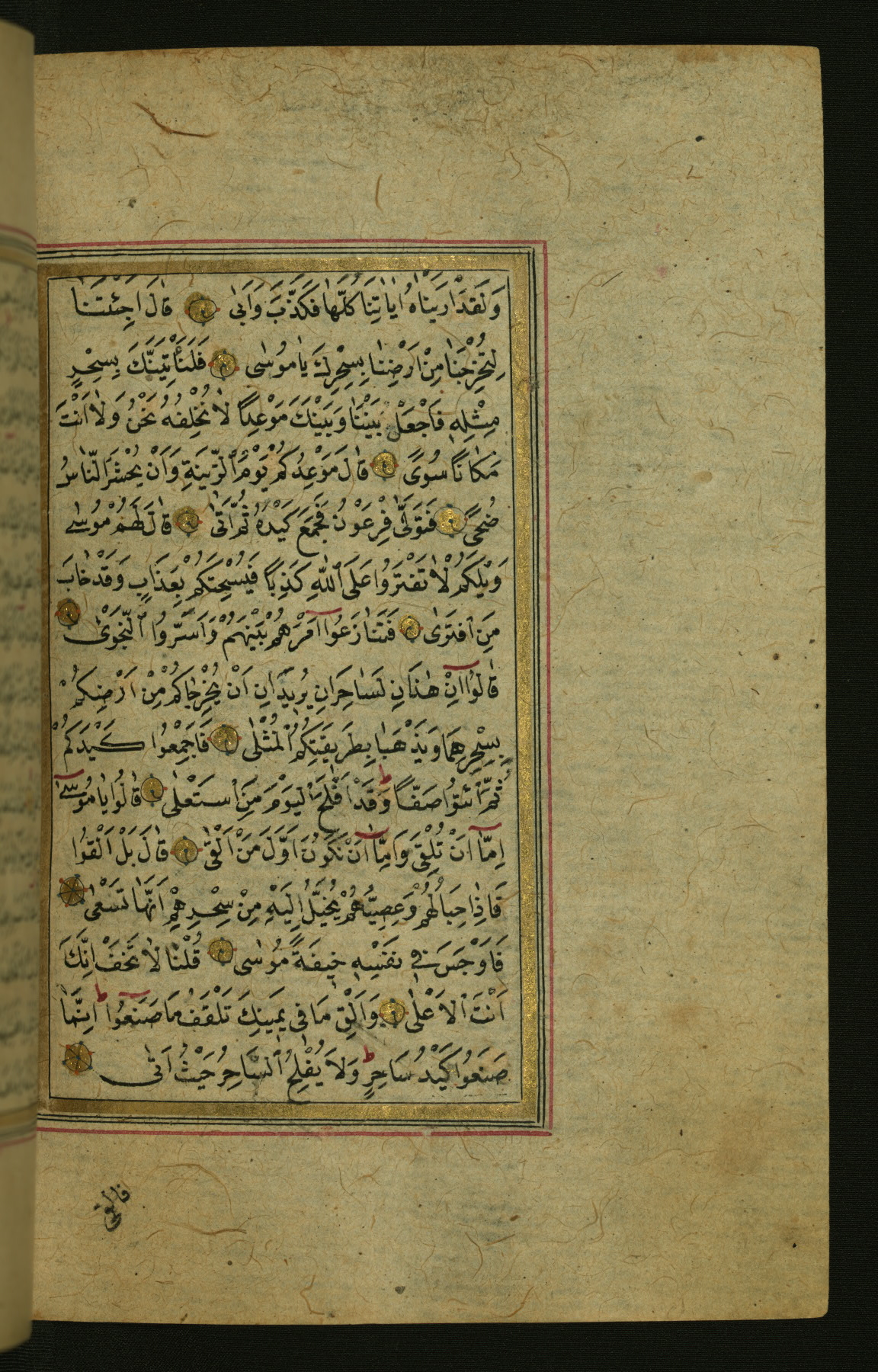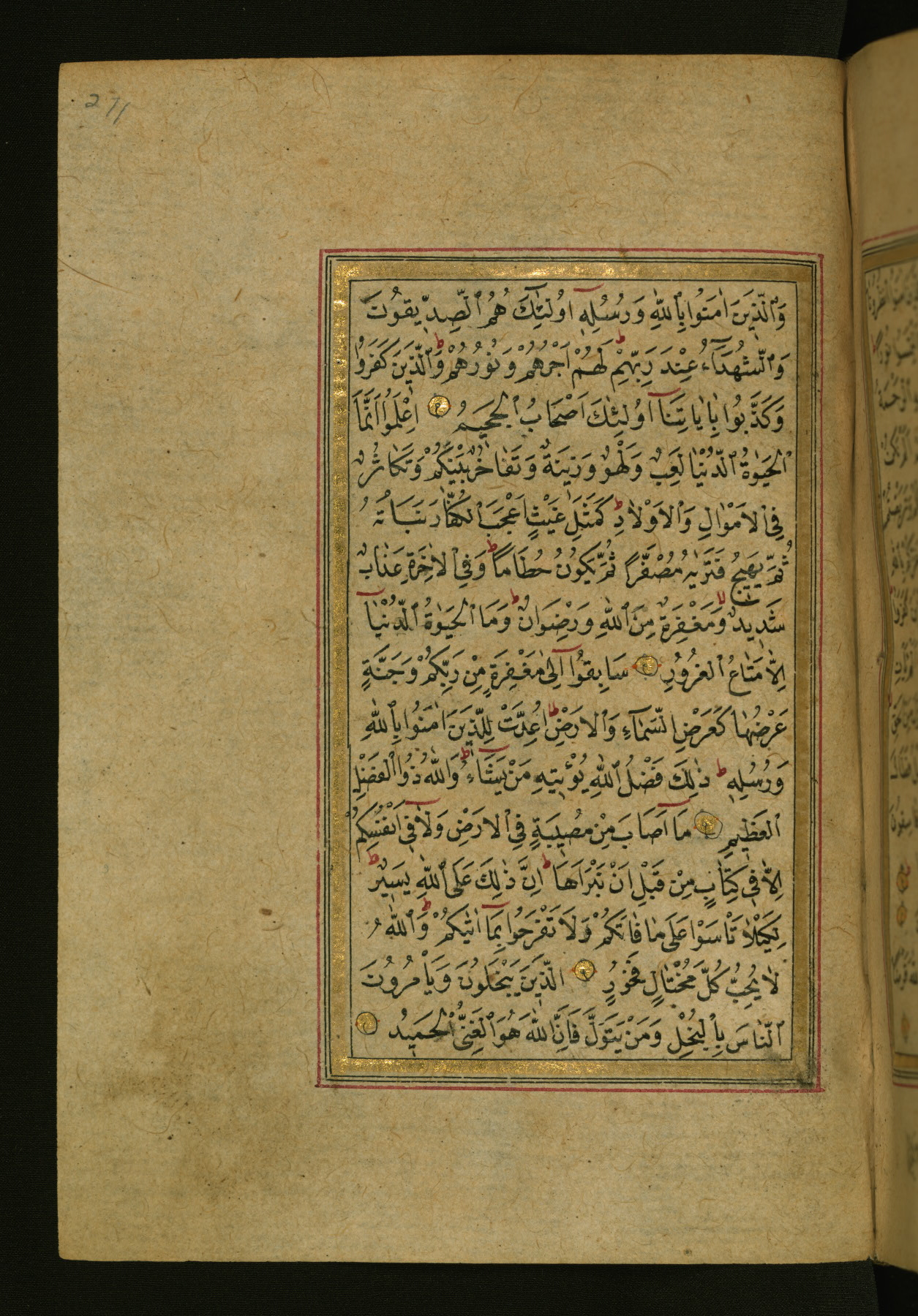 This small, illuminated single-volume copy of the Qurʾan was produced in Ottoman Turkey in 1282 AH / 1865-6 CE by Muḥammad ibn Muṣṭafá Izmīrī, a pupil of al-Rudūsī. The colophon in ijāzah script indicates that the present codex is the twenty-first copy executed by him (fol. 304b). The manuscript opens with an illuminated double-page incipit with the verses of chapters 1 (Sūrat al-fātiḥah) and 2 (Sūrat al-baqarah) (fols. 1b-2a). The text is written in naskh script in black ink with reading marks in red. Verses are separated by illuminated discs with colored dots and chapter headings are in riqāʿ script in white ink. Polychrome medallions in the margins indicate textual divisions and prostration. The binding of black leather is contemporary with the manuscript and decorated with a tooled and gold-painted geometric design enclosed by gold frames on the upper and lower boards.
