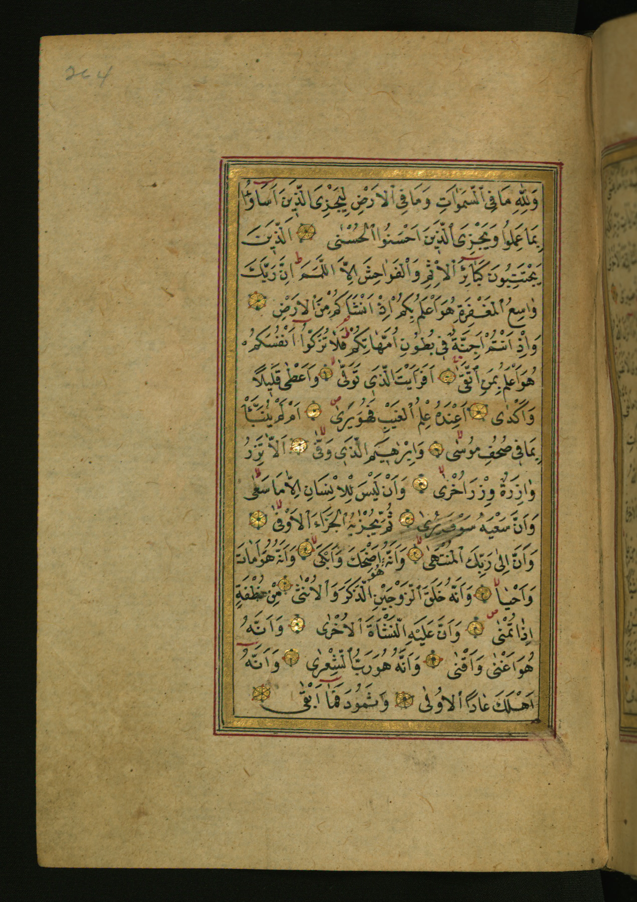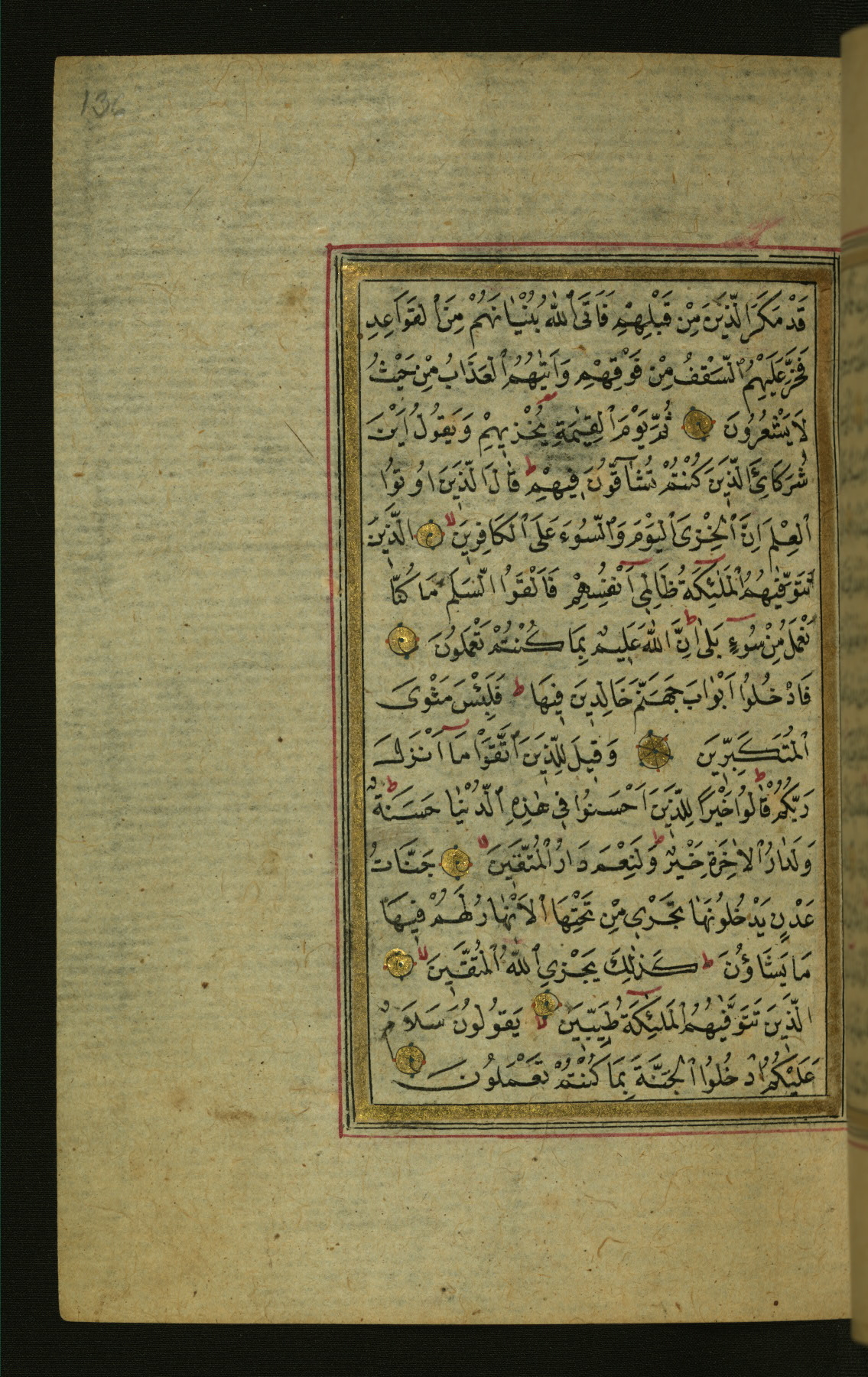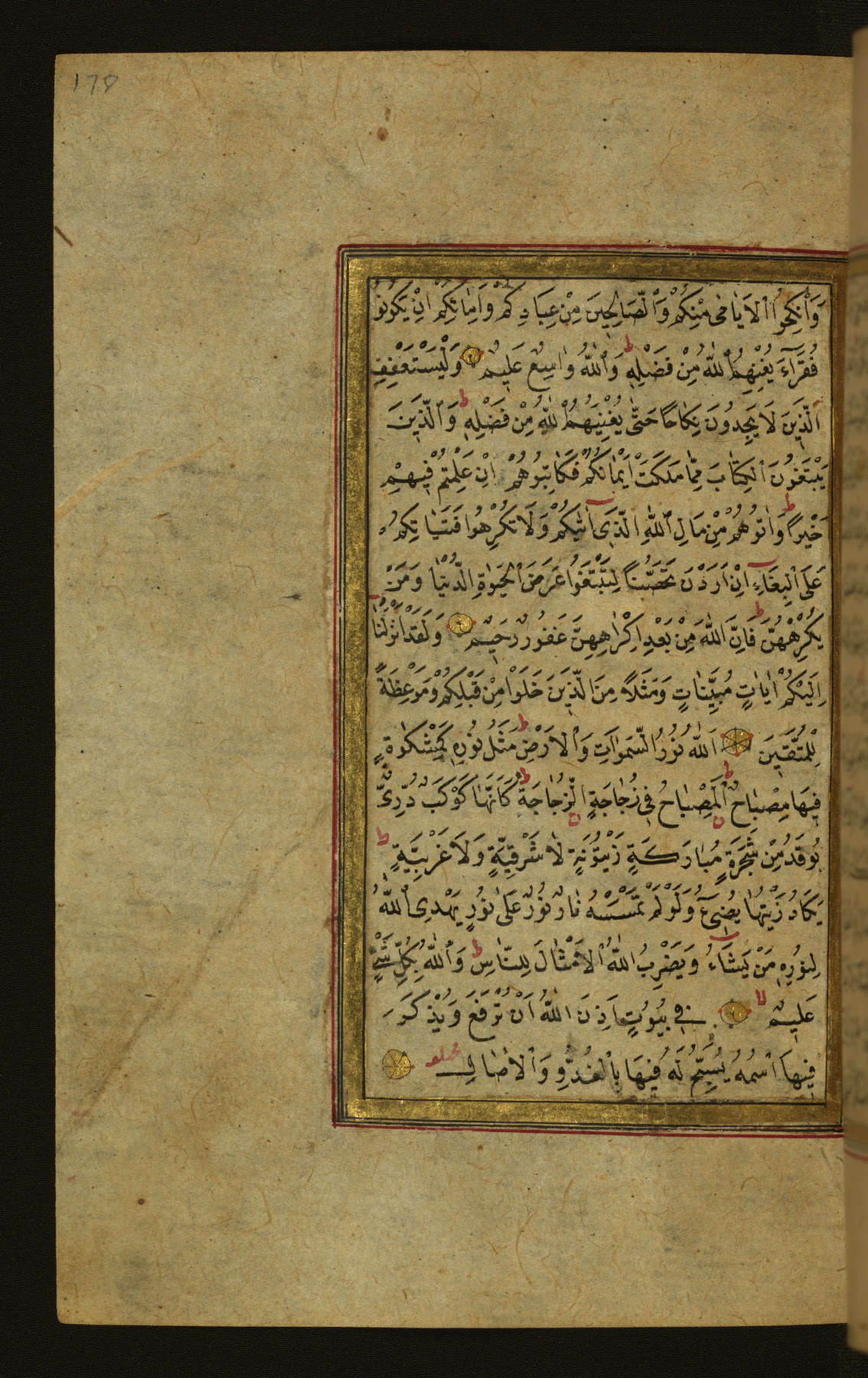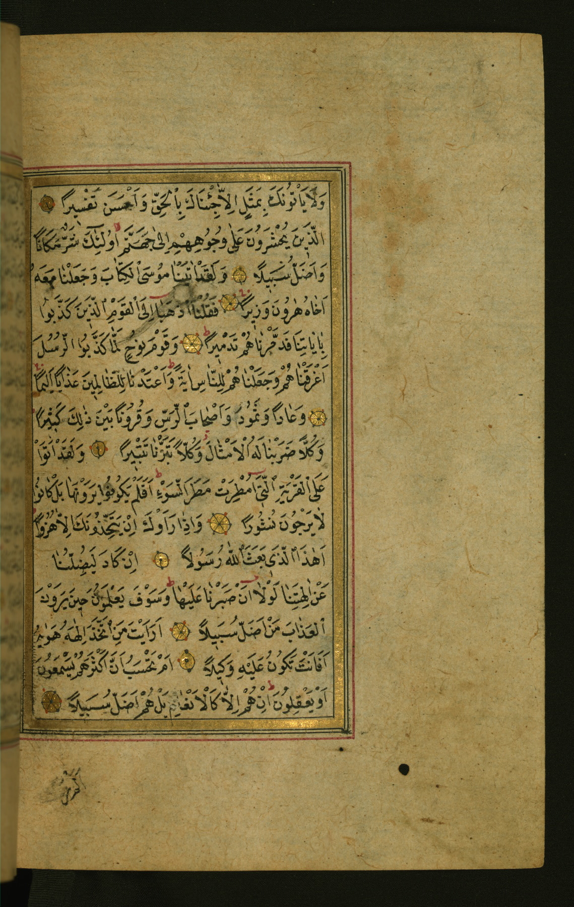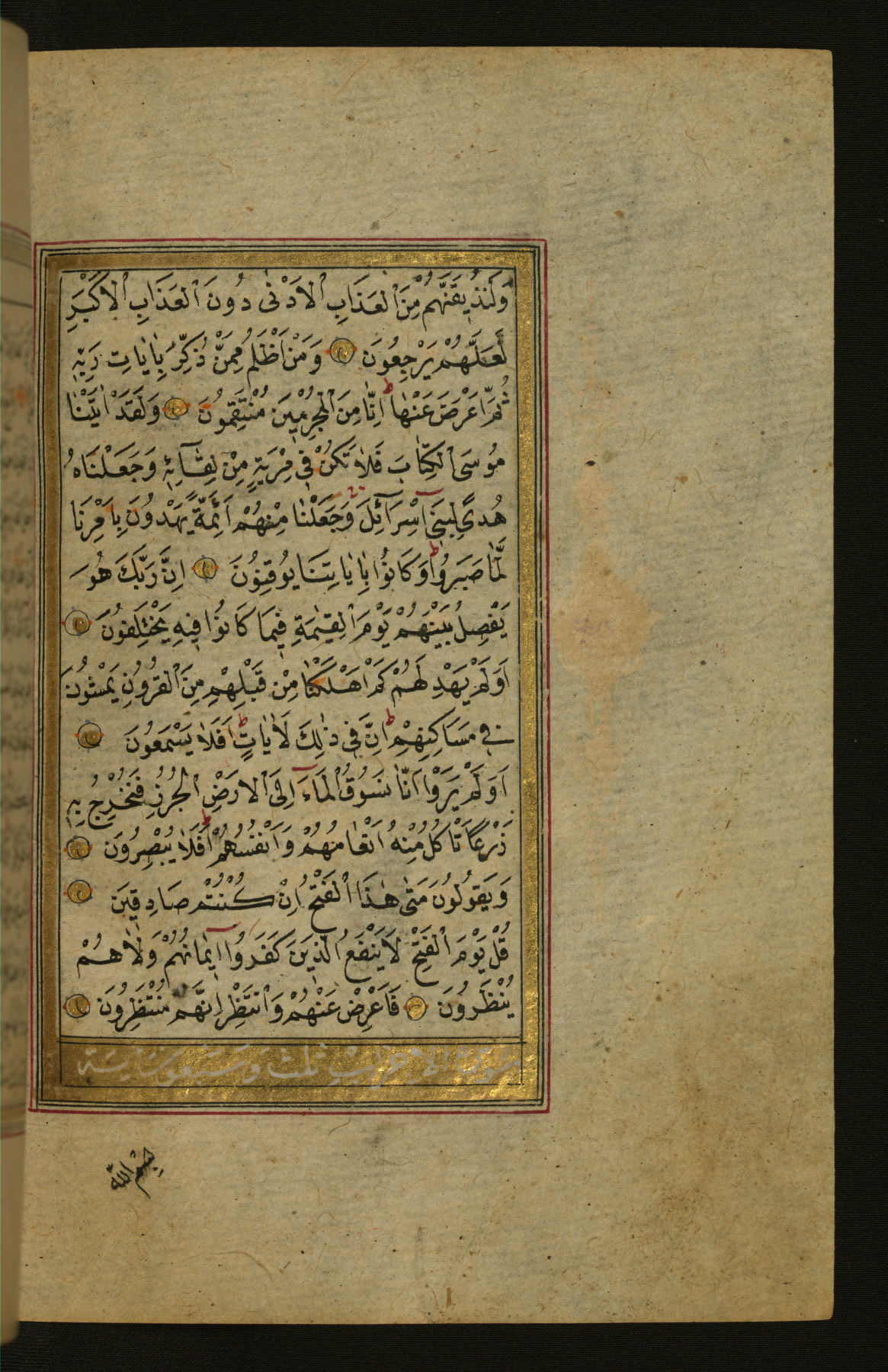 This small, illuminated single-volume copy of the Qurʾan was produced in Ottoman Turkey in 1282 AH / 1865-6 CE by Muḥammad ibn Muṣṭafá Izmīrī, a pupil of al-Rudūsī. The colophon in ijāzah script indicates that the present codex is the twenty-first copy executed by him (fol. 304b). The manuscript opens with an illuminated double-page incipit with the verses of chapters 1 (Sūrat al-fātiḥah) and 2 (Sūrat al-baqarah) (fols. 1b-2a). The text is written in naskh script in black ink with reading marks in red. Verses are separated by illuminated discs with colored dots and chapter headings are in riqāʿ script in white ink. Polychrome medallions in the margins indicate textual divisions and prostration. The binding of black leather is contemporary with the manuscript and decorated with a tooled and gold-painted geometric design enclosed by gold frames on the upper and lower boards.