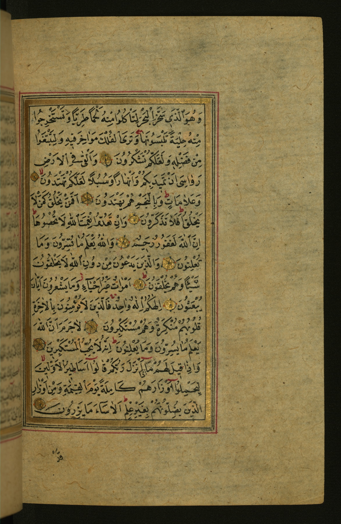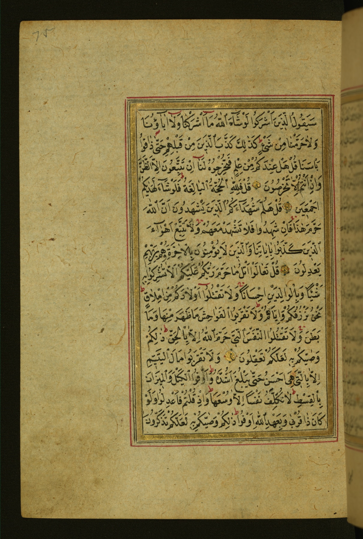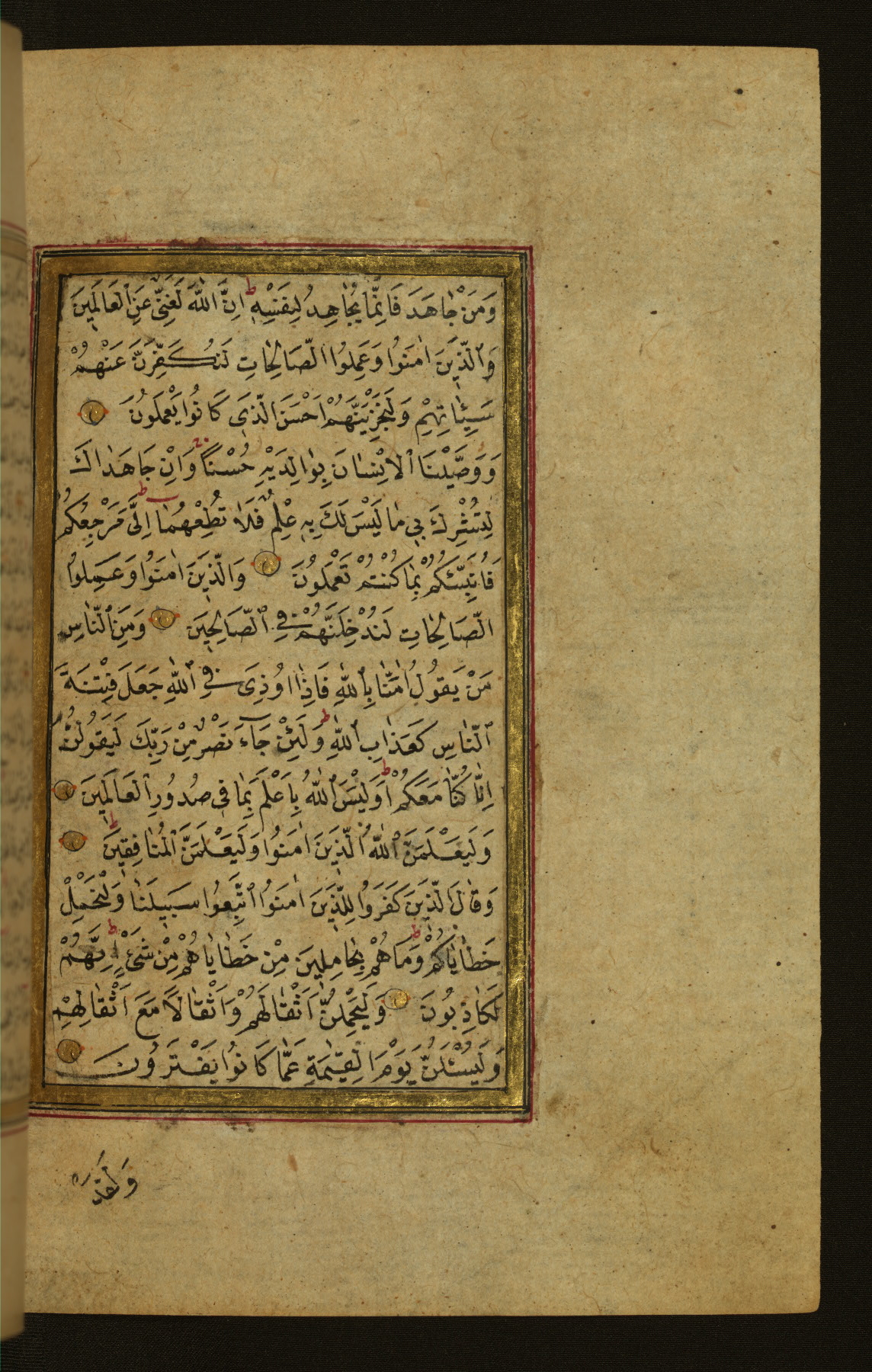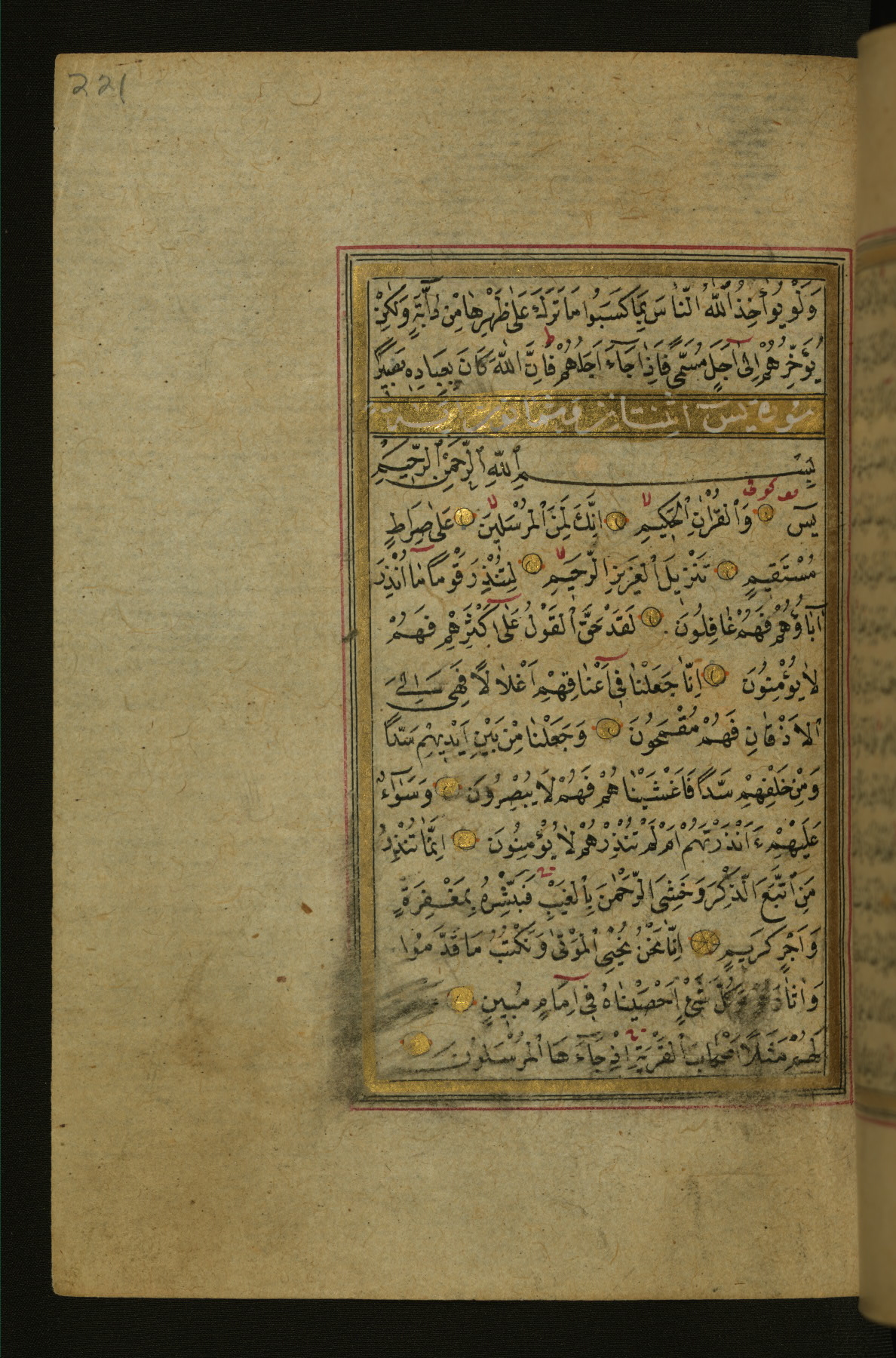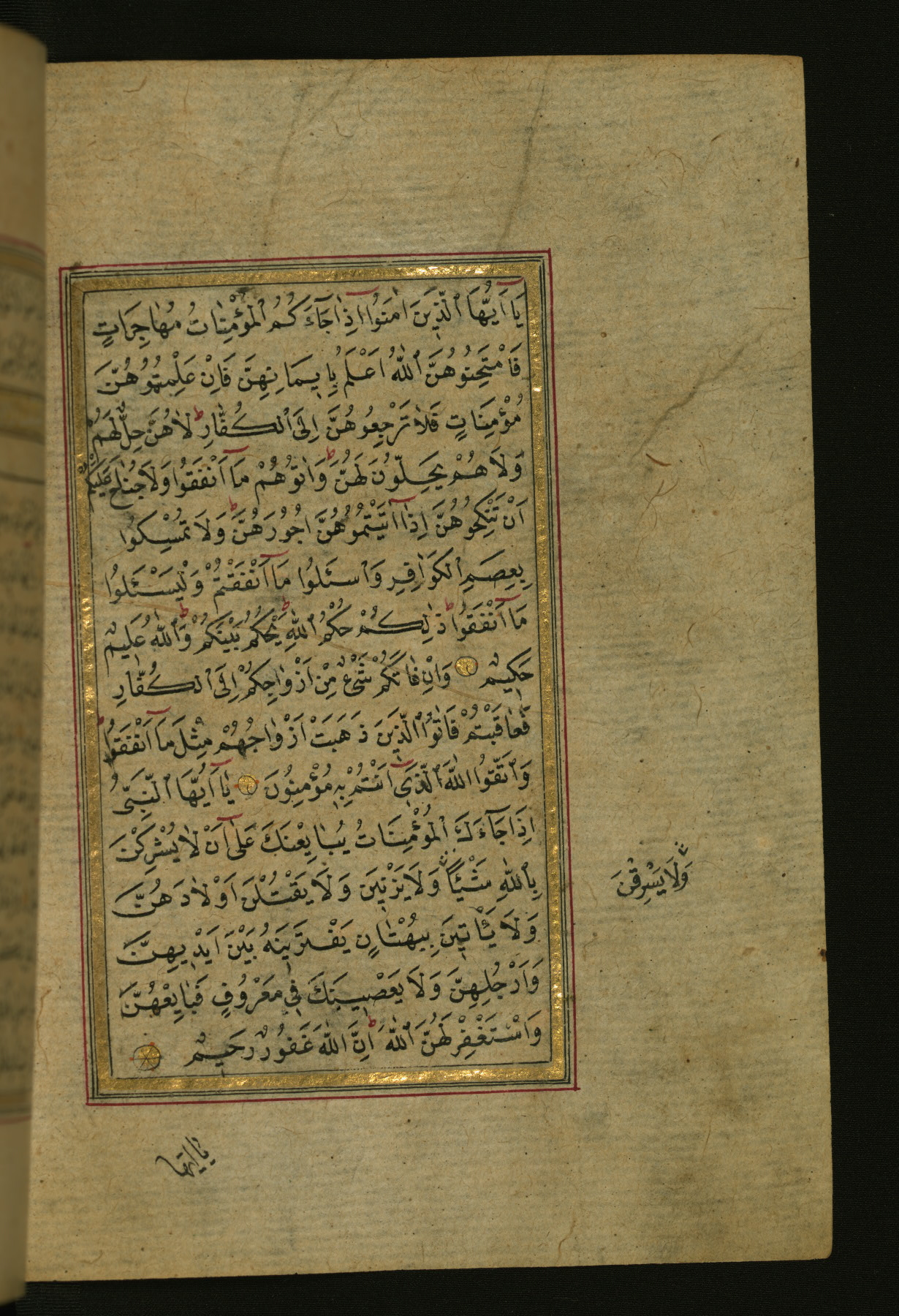 This small, illuminated single-volume copy of the Qurʾan was produced in Ottoman Turkey in 1282 AH / 1865-6 CE by Muḥammad ibn Muṣṭafá Izmīrī, a pupil of al-Rudūsī. The colophon in ijāzah script indicates that the present codex is the twenty-first copy executed by him (fol. 304b). The manuscript opens with an illuminated double-page incipit with the verses of chapters 1 (Sūrat al-fātiḥah) and 2 (Sūrat al-baqarah) (fols. 1b-2a). The text is written in naskh script in black ink with reading marks in red. Verses are separated by illuminated discs with colored dots and chapter headings are in riqāʿ script in white ink. Polychrome medallions in the margins indicate textual divisions and prostration. The binding of black leather is contemporary with the manuscript and decorated with a tooled and gold-painted geometric design enclosed by gold frames on the upper and lower boards.