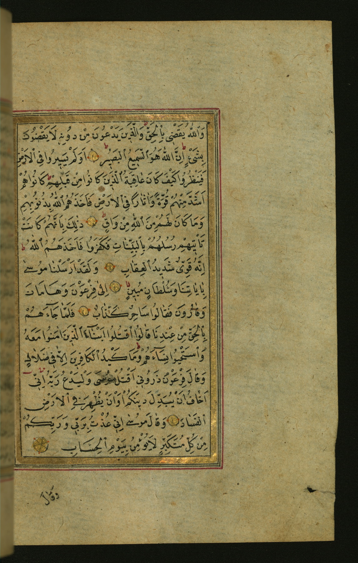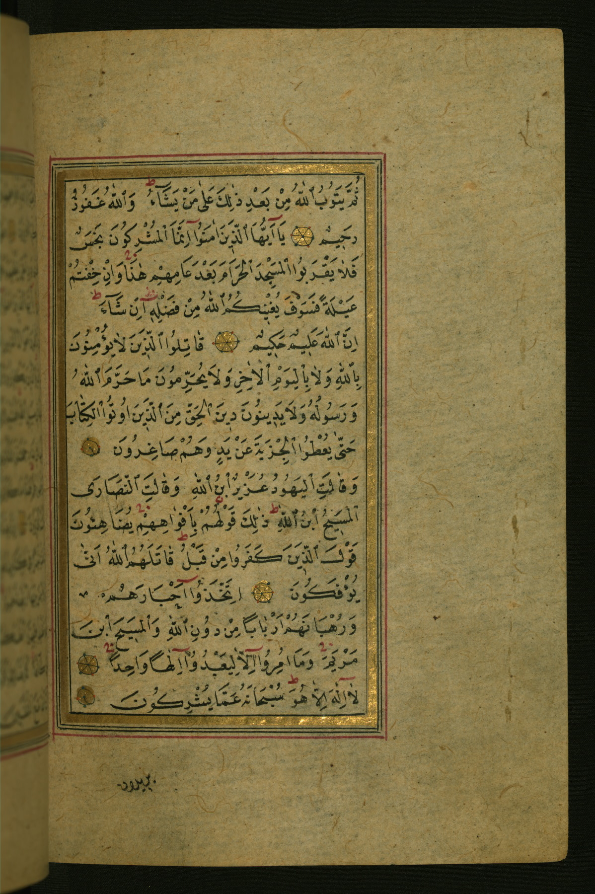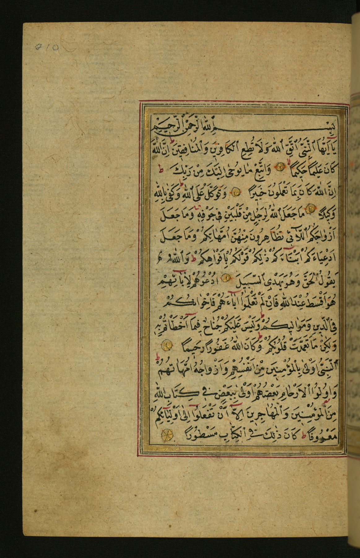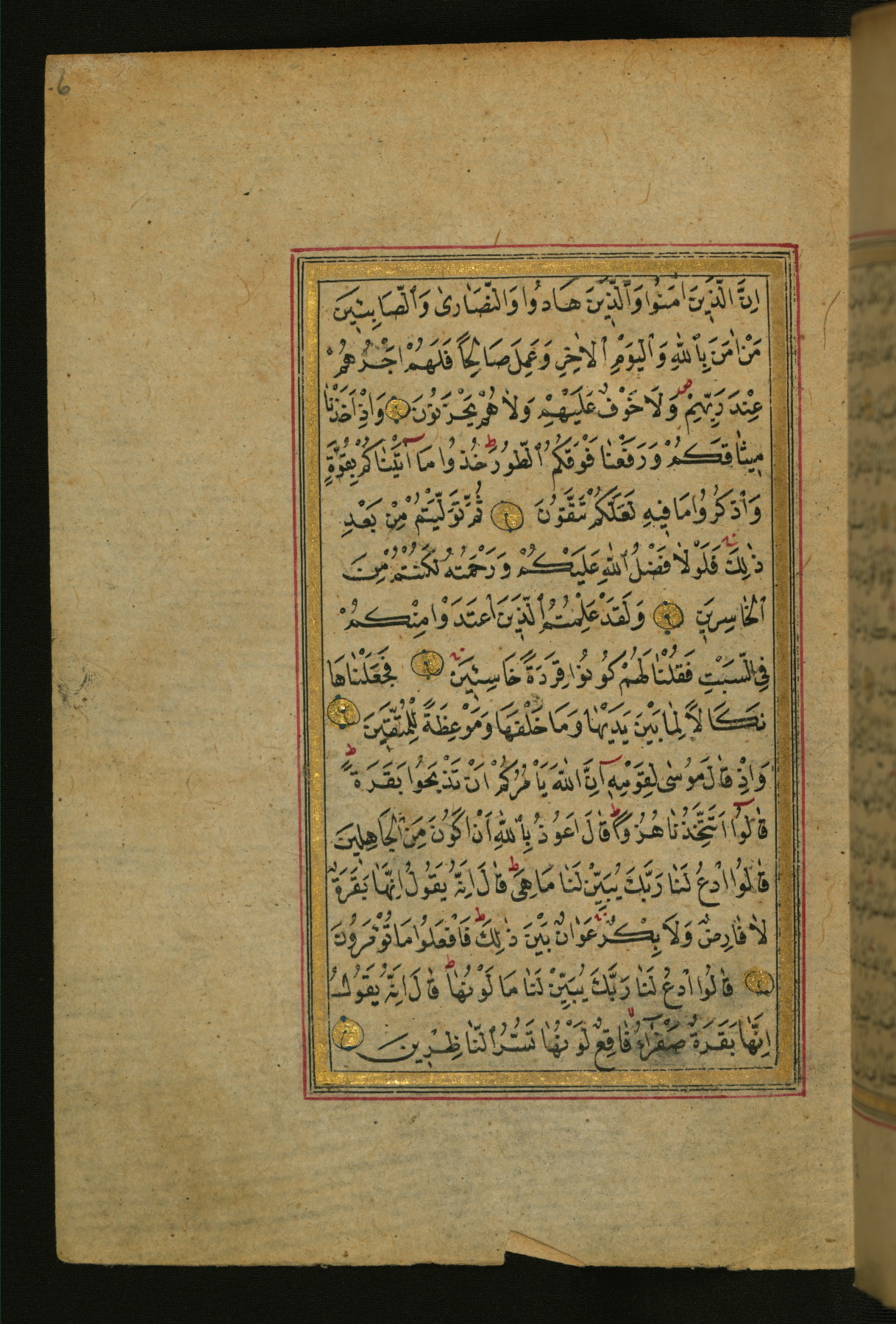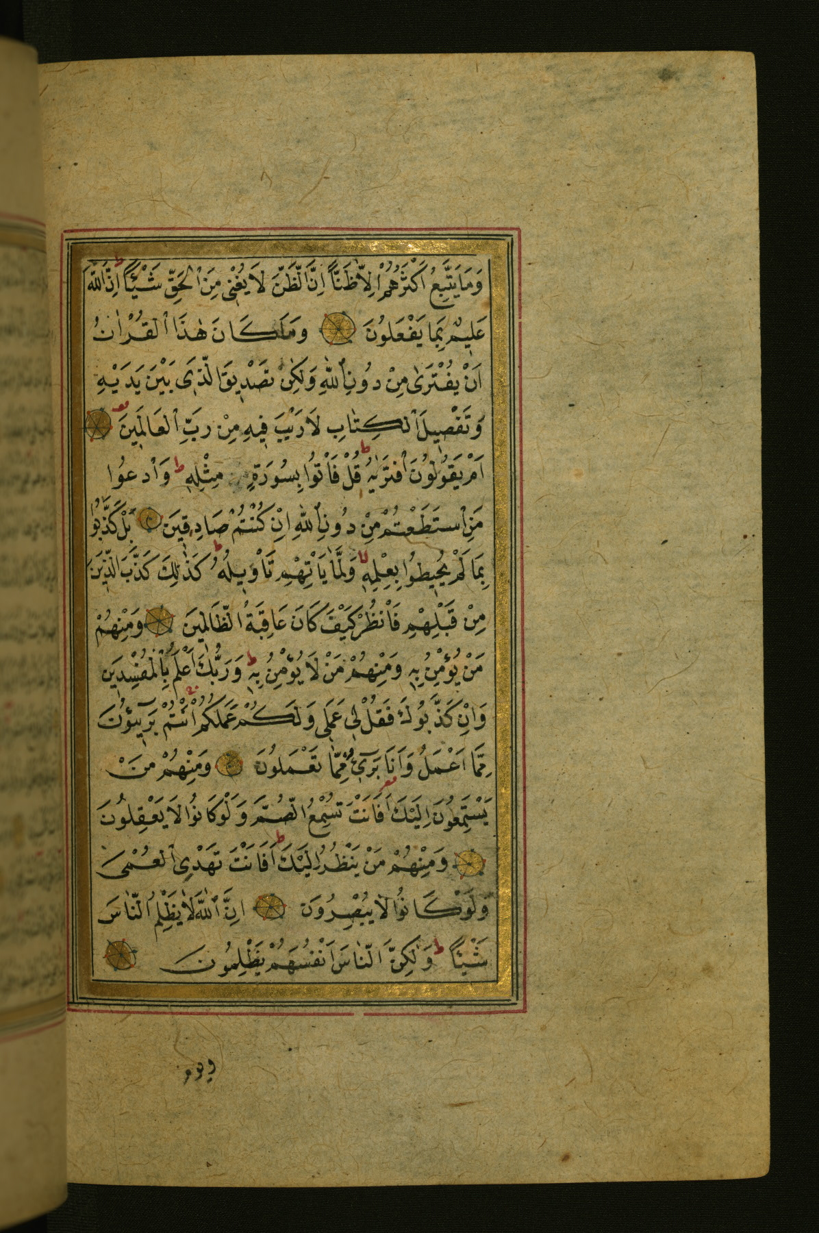 This small, illuminated single-volume copy of the Qurʾan was produced in Ottoman Turkey in 1282 AH / 1865-6 CE by Muḥammad ibn Muṣṭafá Izmīrī, a pupil of al-Rudūsī. The colophon in ijāzah script indicates that the present codex is the twenty-first copy executed by him (fol. 304b). The manuscript opens with an illuminated double-page incipit with the verses of chapters 1 (Sūrat al-fātiḥah) and 2 (Sūrat al-baqarah) (fols. 1b-2a). The text is written in naskh script in black ink with reading marks in red. Verses are separated by illuminated discs with colored dots and chapter headings are in riqāʿ script in white ink. Polychrome medallions in the margins indicate textual divisions and prostration. The binding of black leather is contemporary with the manuscript and decorated with a tooled and gold-painted geometric design enclosed by gold frames on the upper and lower boards.