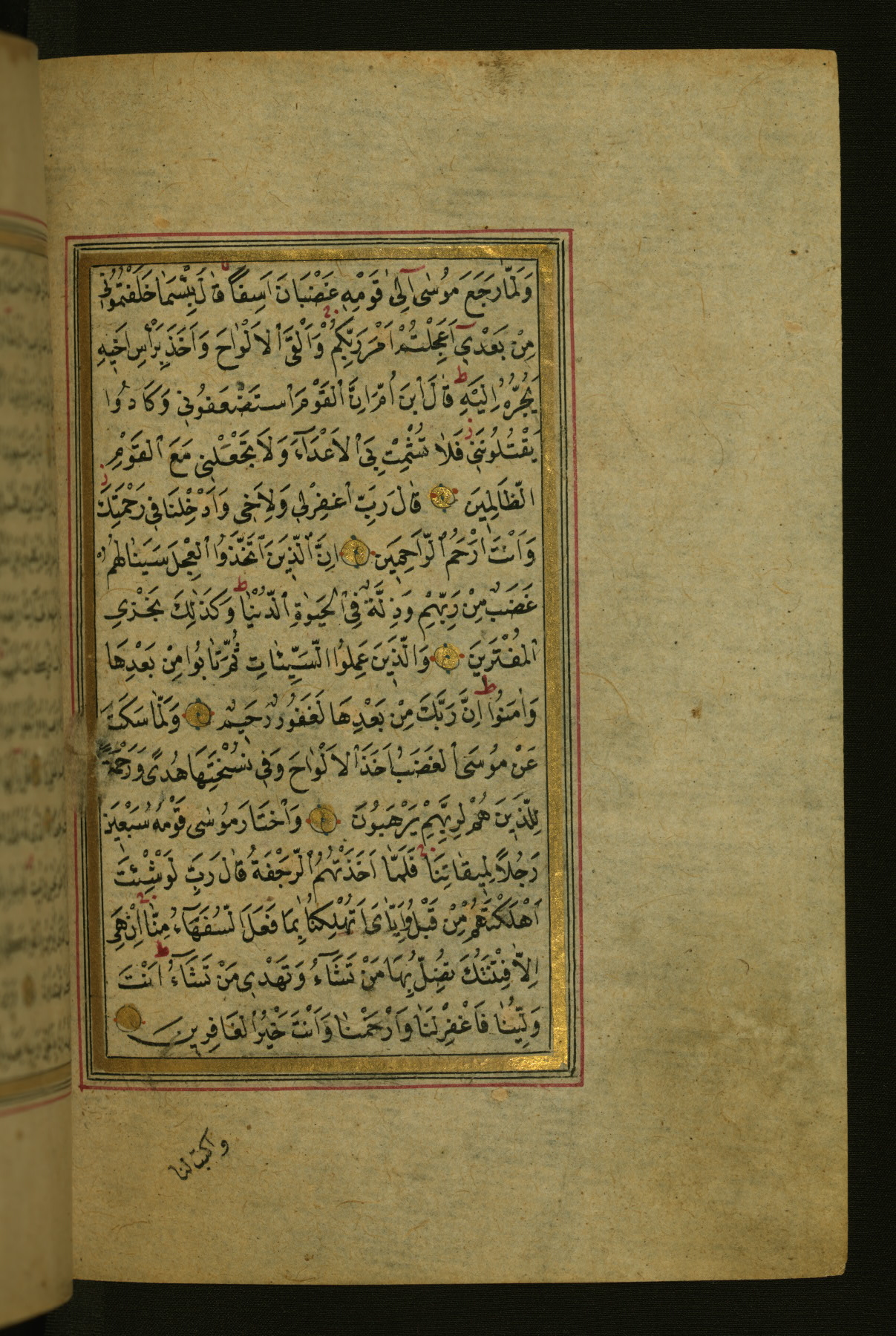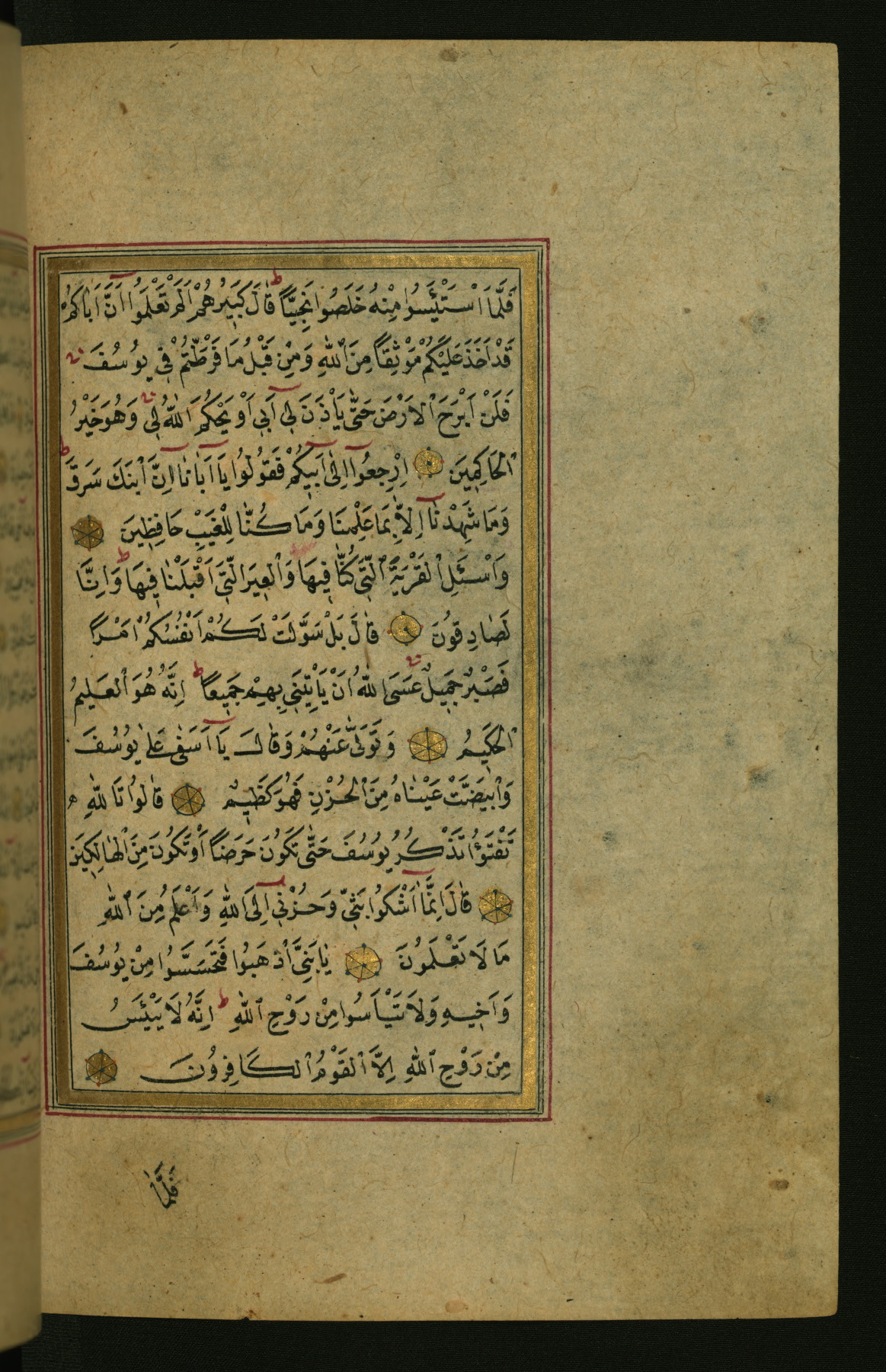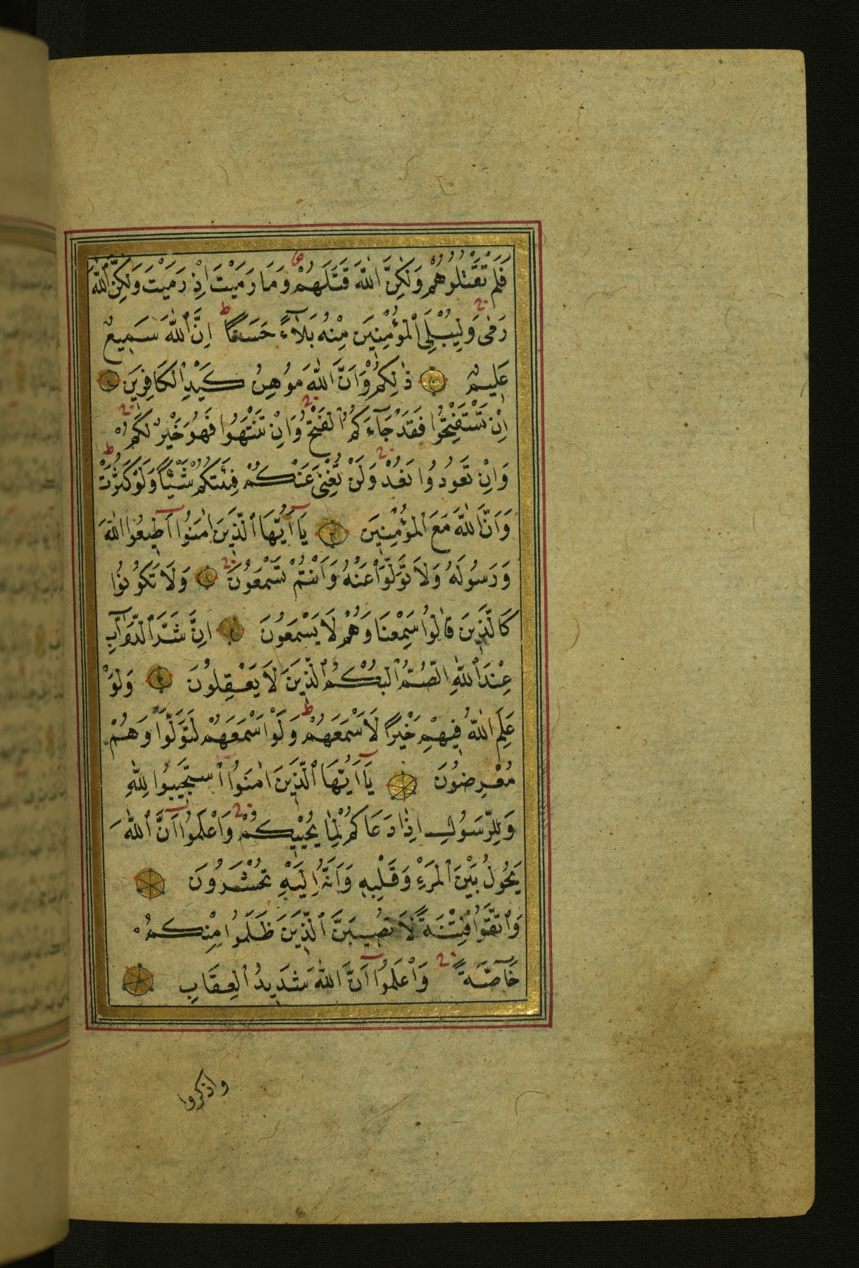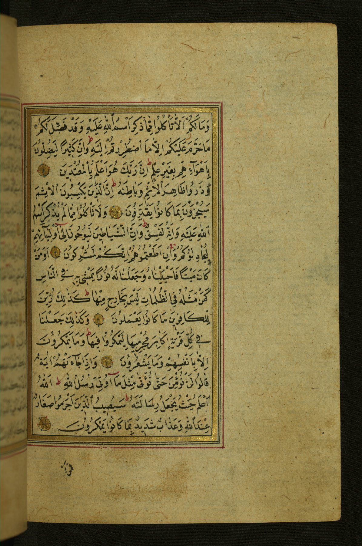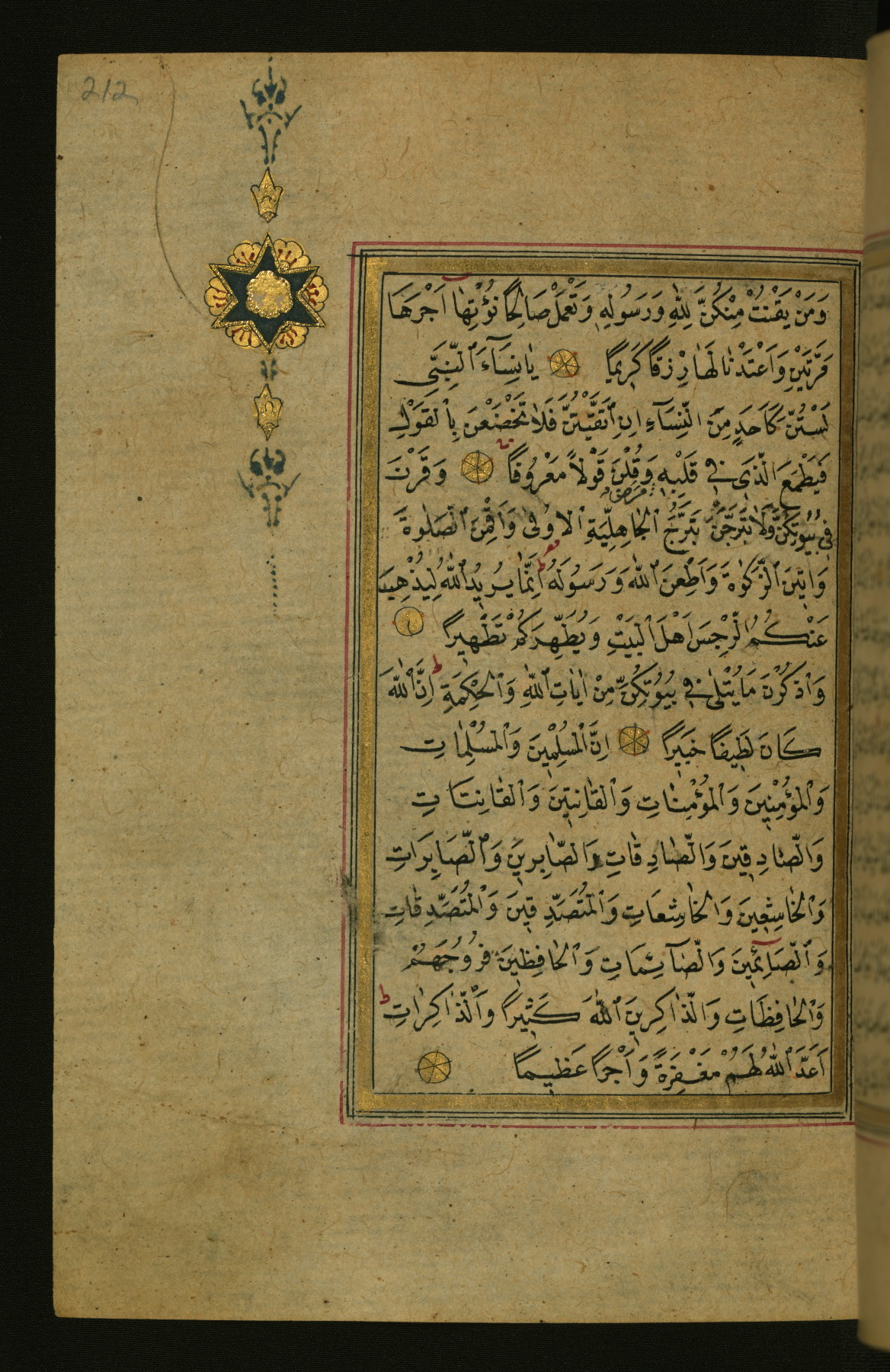 This small, illuminated single-volume copy of the Qurʾan was produced in Ottoman Turkey in 1282 AH / 1865-6 CE by Muḥammad ibn Muṣṭafá Izmīrī, a pupil of al-Rudūsī. The colophon in ijāzah script indicates that the present codex is the twenty-first copy executed by him (fol. 304b). The manuscript opens with an illuminated double-page incipit with the verses of chapters 1 (Sūrat al-fātiḥah) and 2 (Sūrat al-baqarah) (fols. 1b-2a). The text is written in naskh script in black ink with reading marks in red. Verses are separated by illuminated discs with colored dots and chapter headings are in riqāʿ script in white ink. Polychrome medallions in the margins indicate textual divisions and prostration. The binding of black leather is contemporary with the manuscript and decorated with a tooled and gold-painted geometric design enclosed by gold frames on the upper and lower boards.