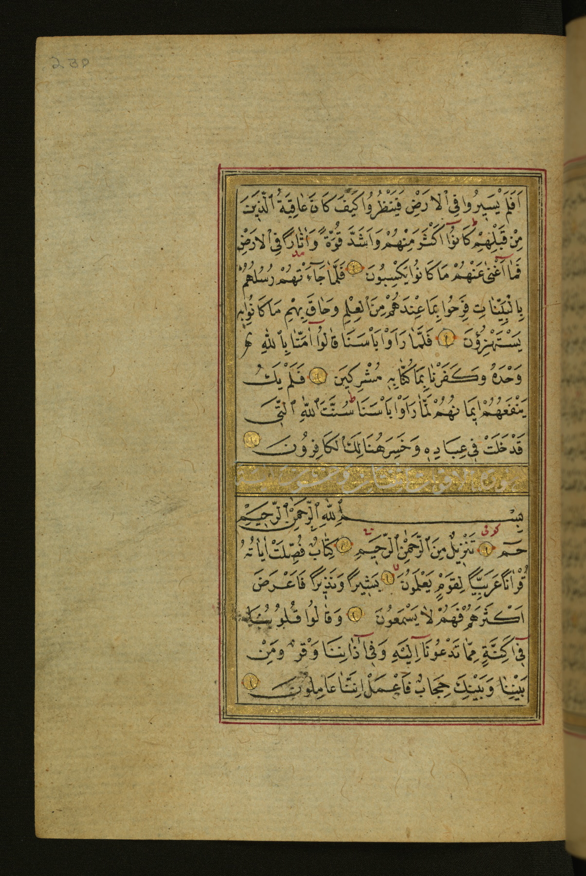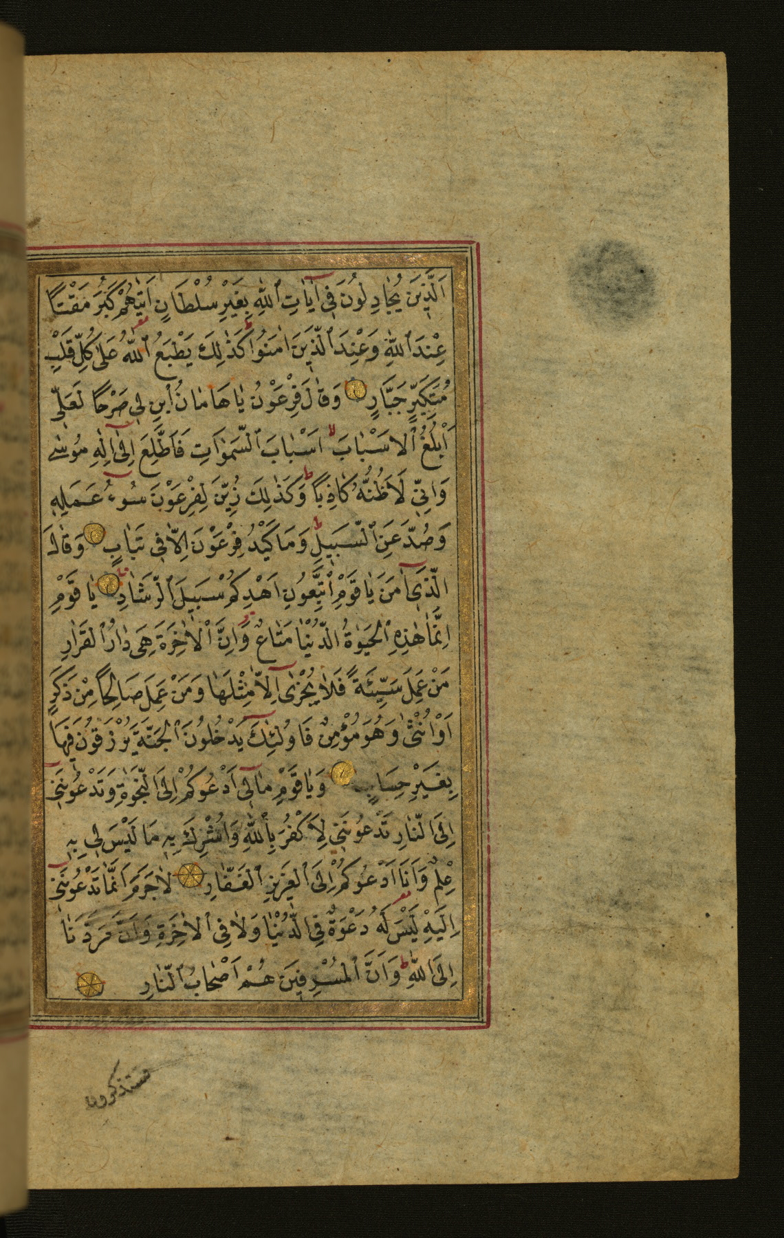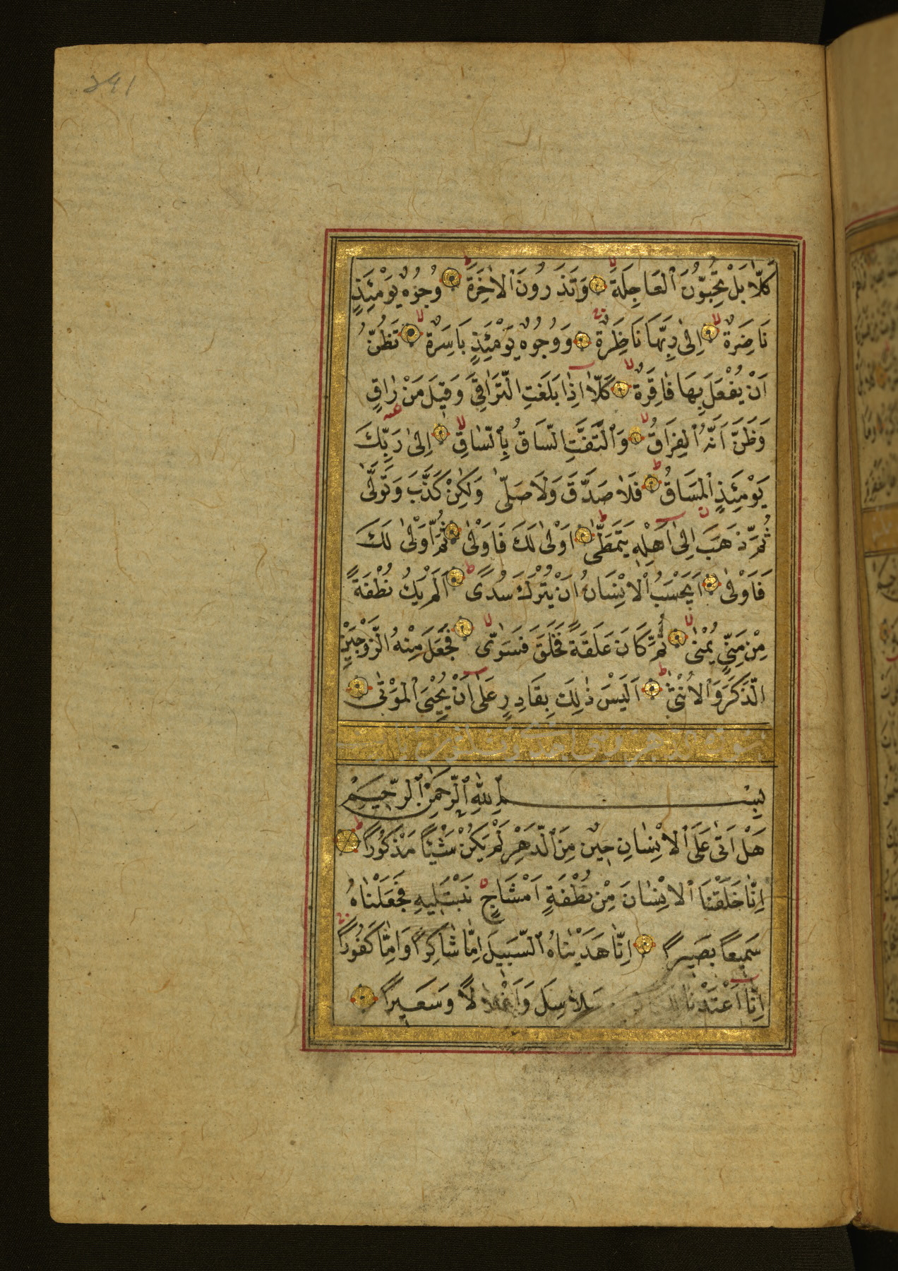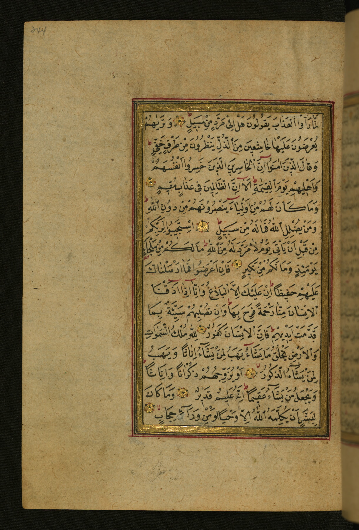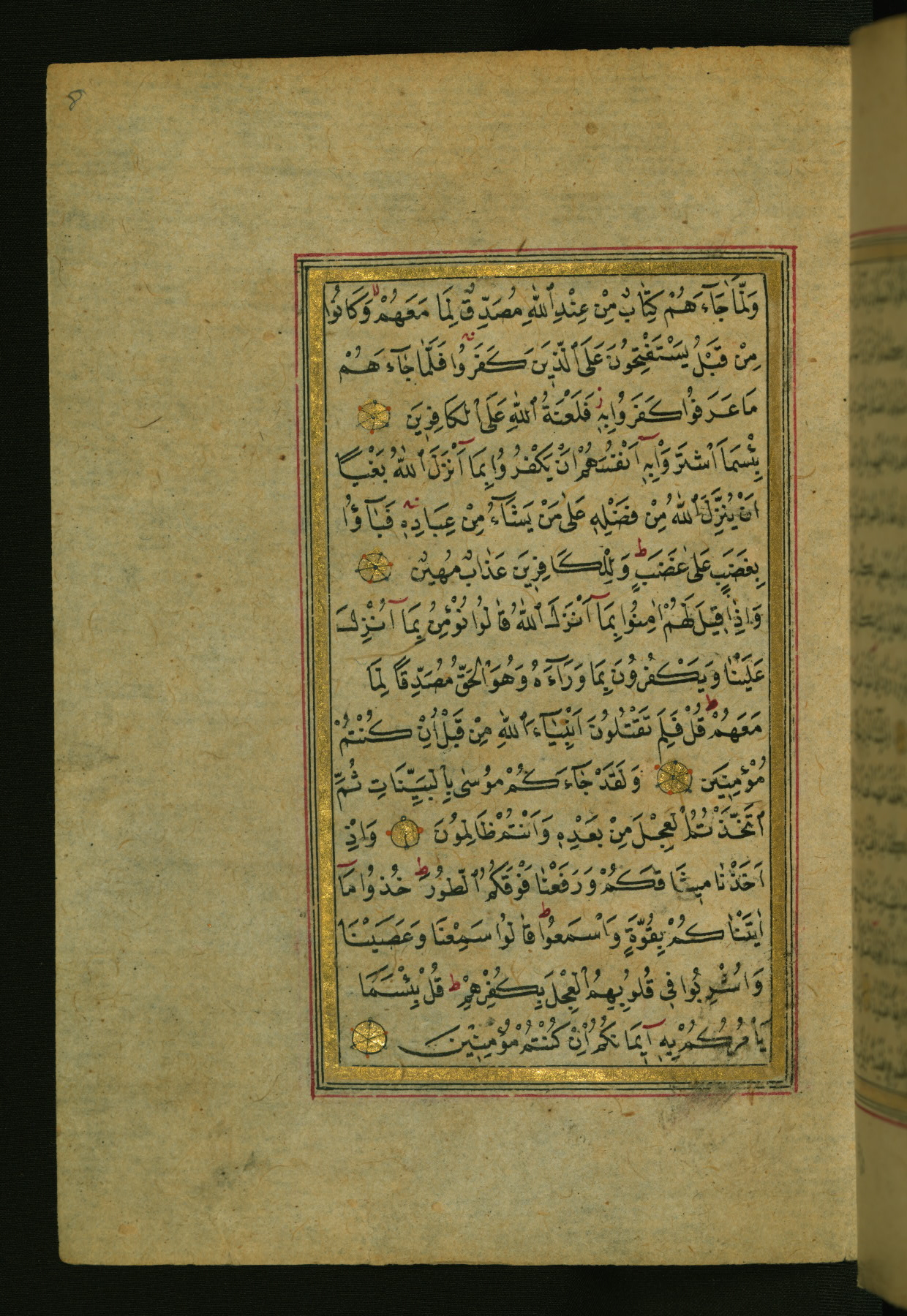 This small, illuminated single-volume copy of the Qurʾan was produced in Ottoman Turkey in 1282 AH / 1865-6 CE by Muḥammad ibn Muṣṭafá Izmīrī, a pupil of al-Rudūsī. The colophon in ijāzah script indicates that the present codex is the twenty-first copy executed by him (fol. 304b). The manuscript opens with an illuminated double-page incipit with the verses of chapters 1 (Sūrat al-fātiḥah) and 2 (Sūrat al-baqarah) (fols. 1b-2a). The text is written in naskh script in black ink with reading marks in red. Verses are separated by illuminated discs with colored dots and chapter headings are in riqāʿ script in white ink. Polychrome medallions in the margins indicate textual divisions and prostration. The binding of black leather is contemporary with the manuscript and decorated with a tooled and gold-painted geometric design enclosed by gold frames on the upper and lower boards.