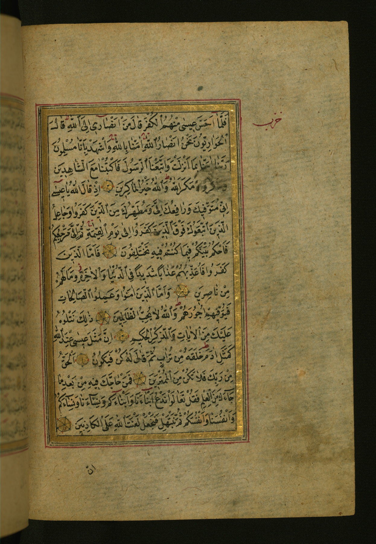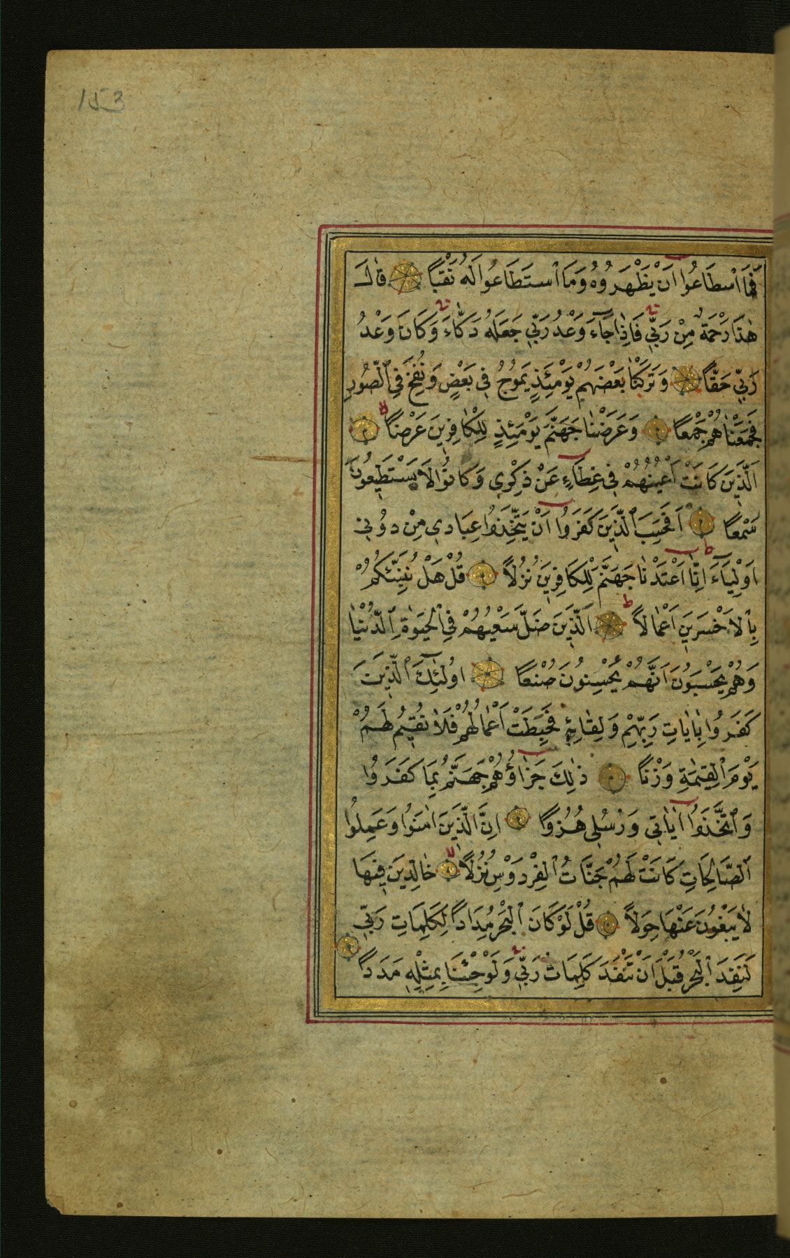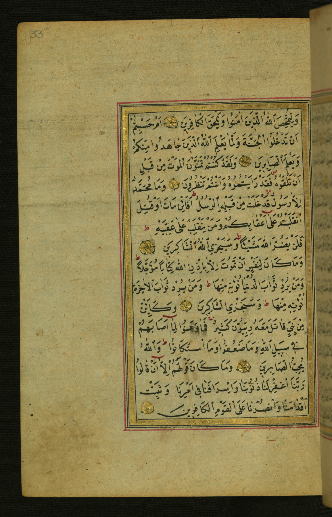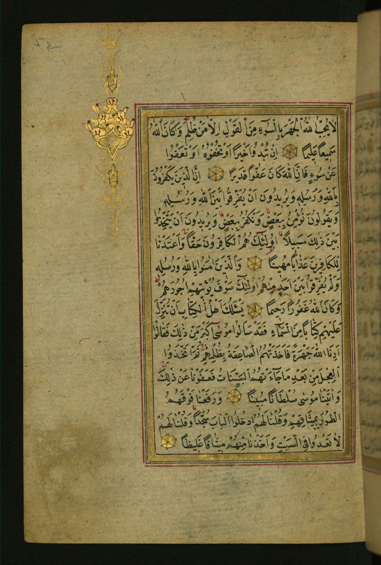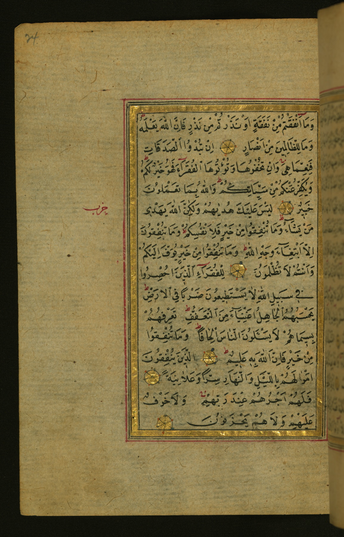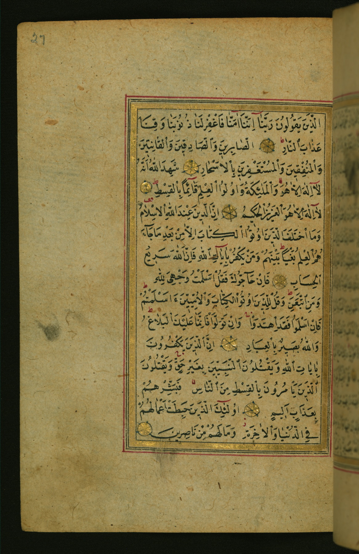 This small, illuminated single-volume copy of the Qurʾan was produced in Ottoman Turkey in 1282 AH / 1865-6 CE by Muḥammad ibn Muṣṭafá Izmīrī, a pupil of al-Rudūsī. The colophon in ijāzah script indicates that the present codex is the twenty-first copy executed by him (fol. 304b). The manuscript opens with an illuminated double-page incipit with the verses of chapters 1 (Sūrat al-fātiḥah) and 2 (Sūrat al-baqarah) (fols. 1b-2a). The text is written in naskh script in black ink with reading marks in red. Verses are separated by illuminated discs with colored dots and chapter headings are in riqāʿ script in white ink. Polychrome medallions in the margins indicate textual divisions and prostration. The binding of black leather is contemporary with the manuscript and decorated with a tooled and gold-painted geometric design enclosed by gold frames on the upper and lower boards.